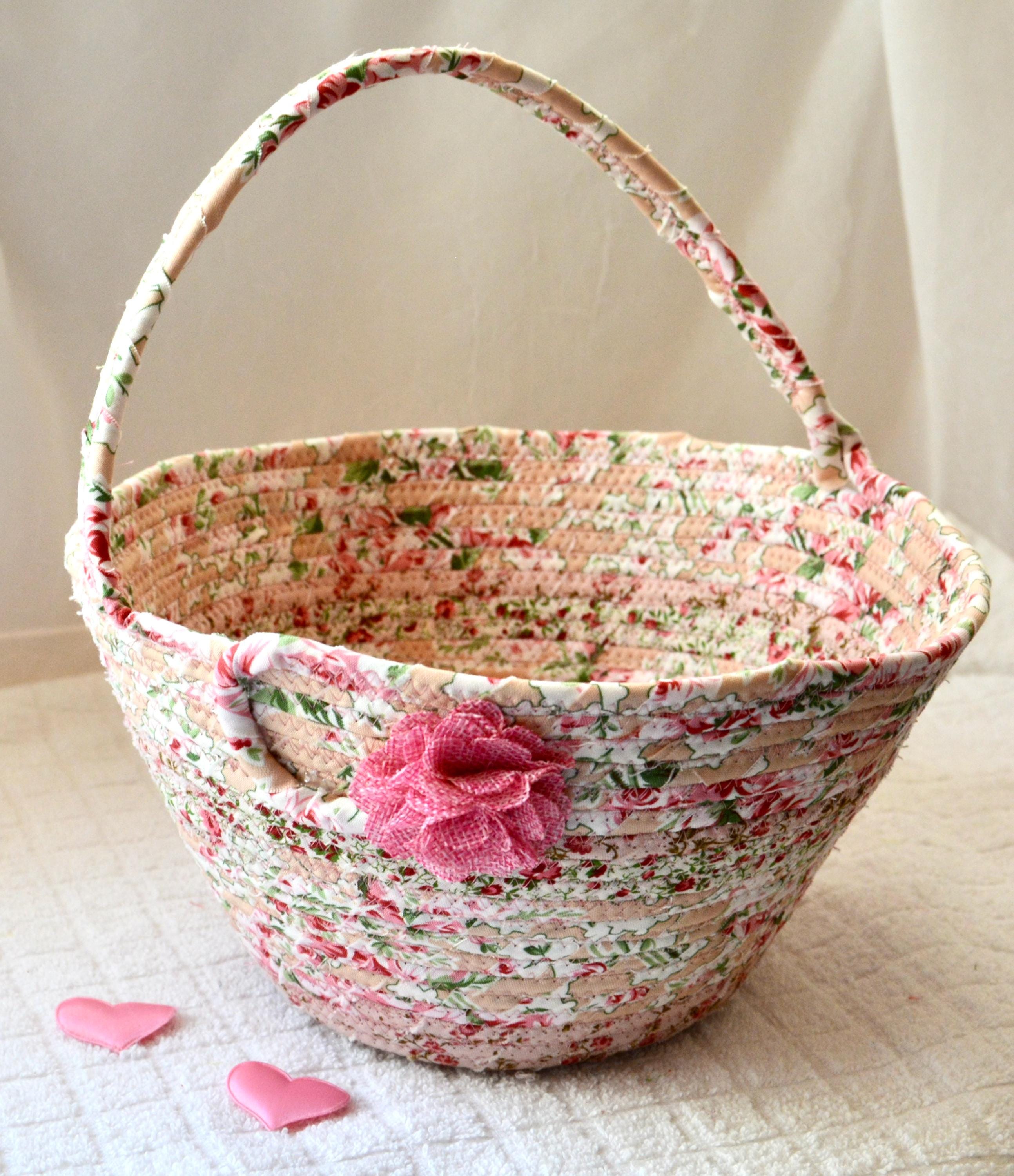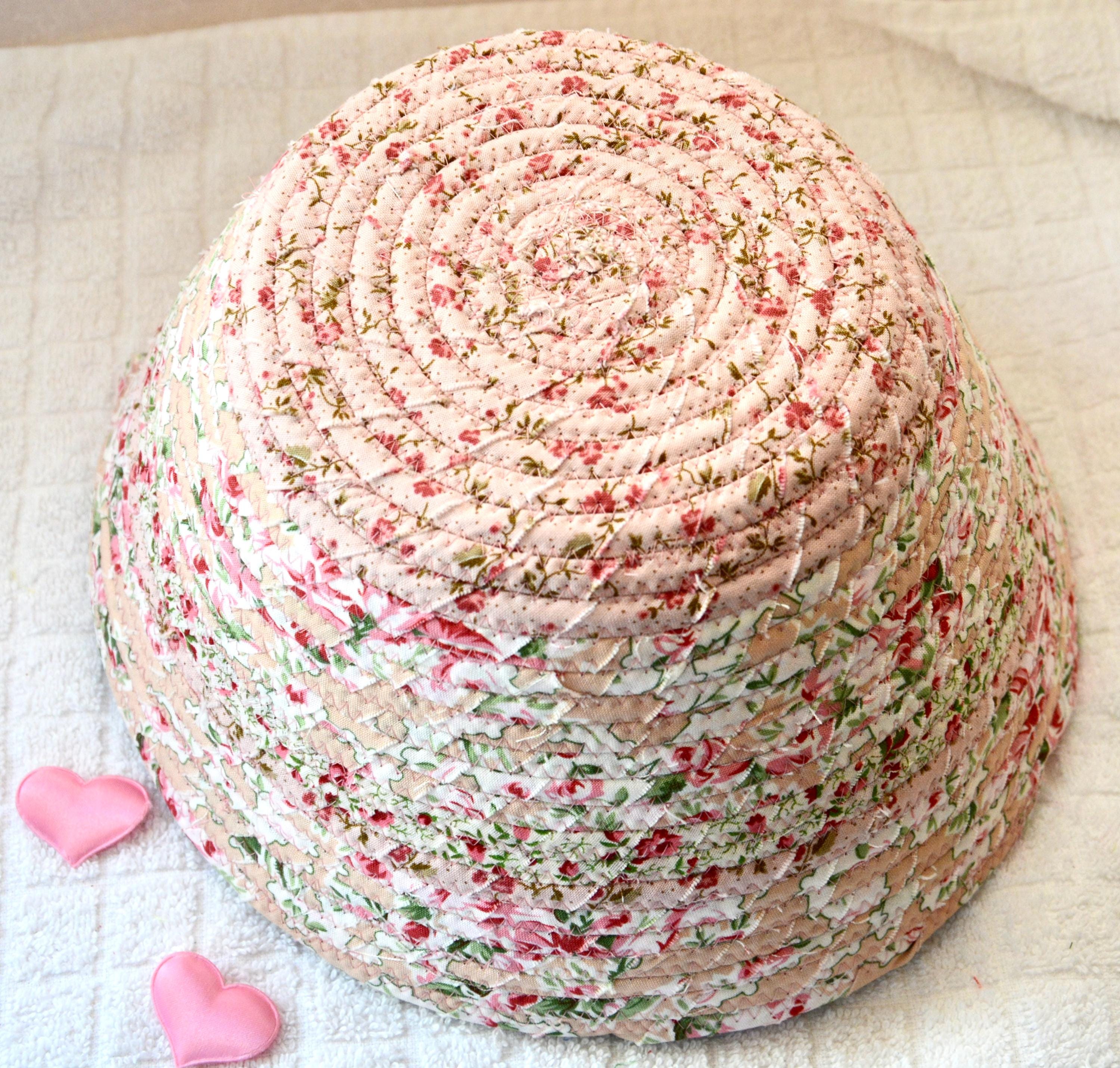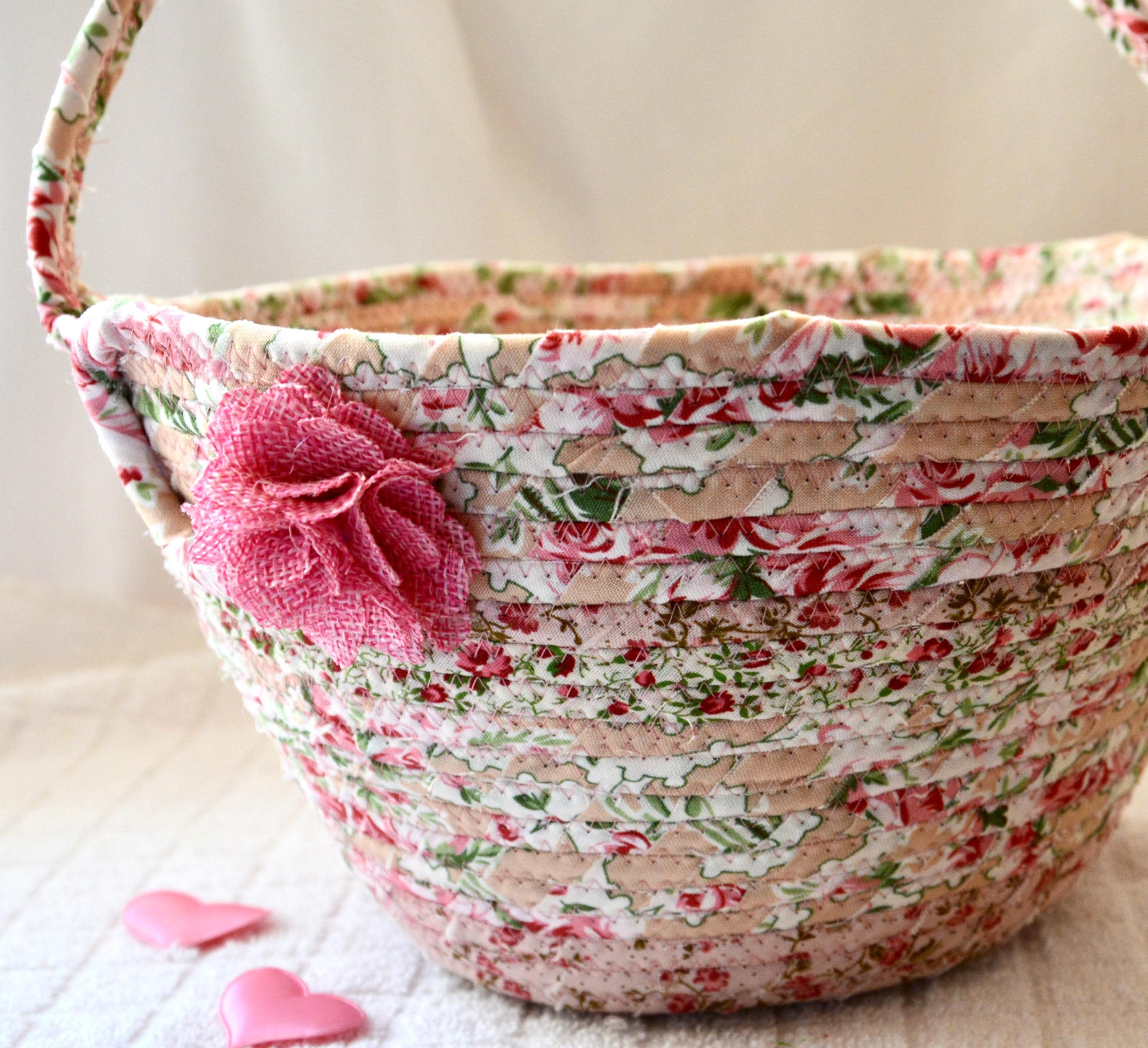 I hand wrapped these lovely floral fabrics around cotton line, which I then hand coiled and machine quilted to make it sturdy. I used the raw edge technique with a little fray, adding a nice shabby chic texture. The pretty flower on the basket is included for a nice accent.