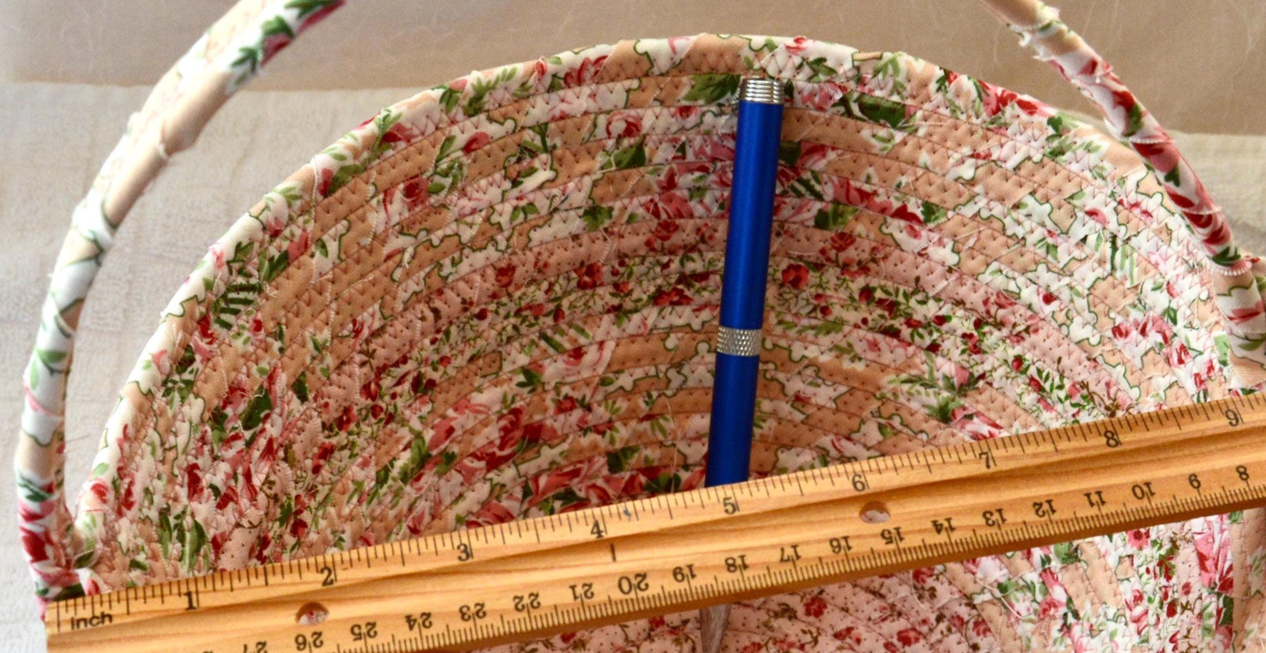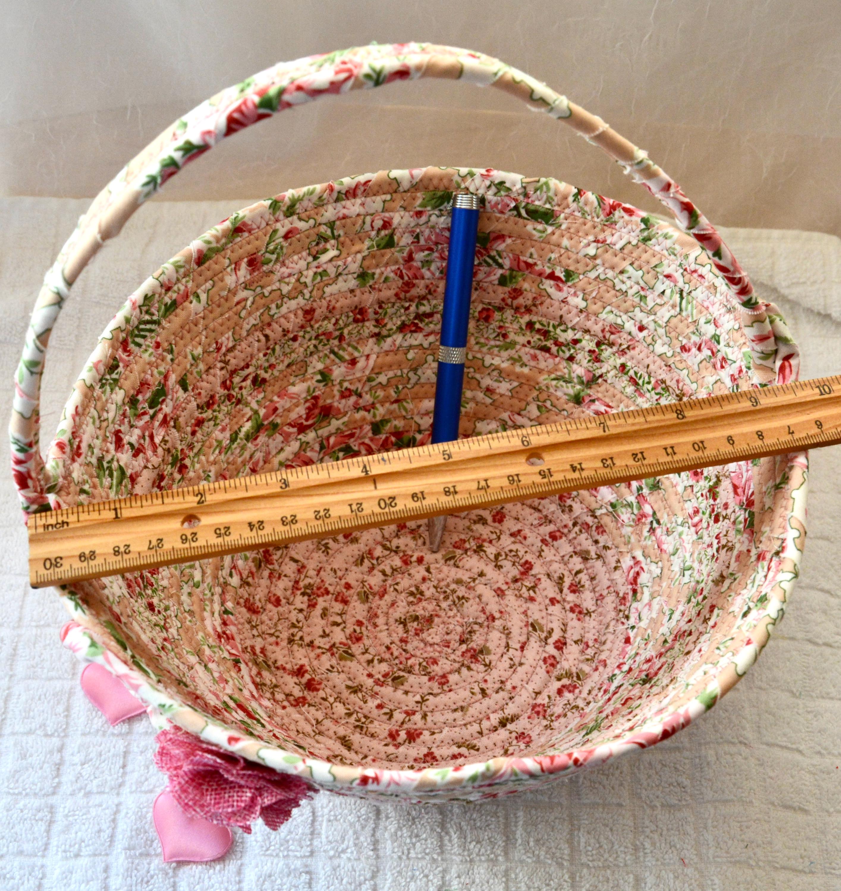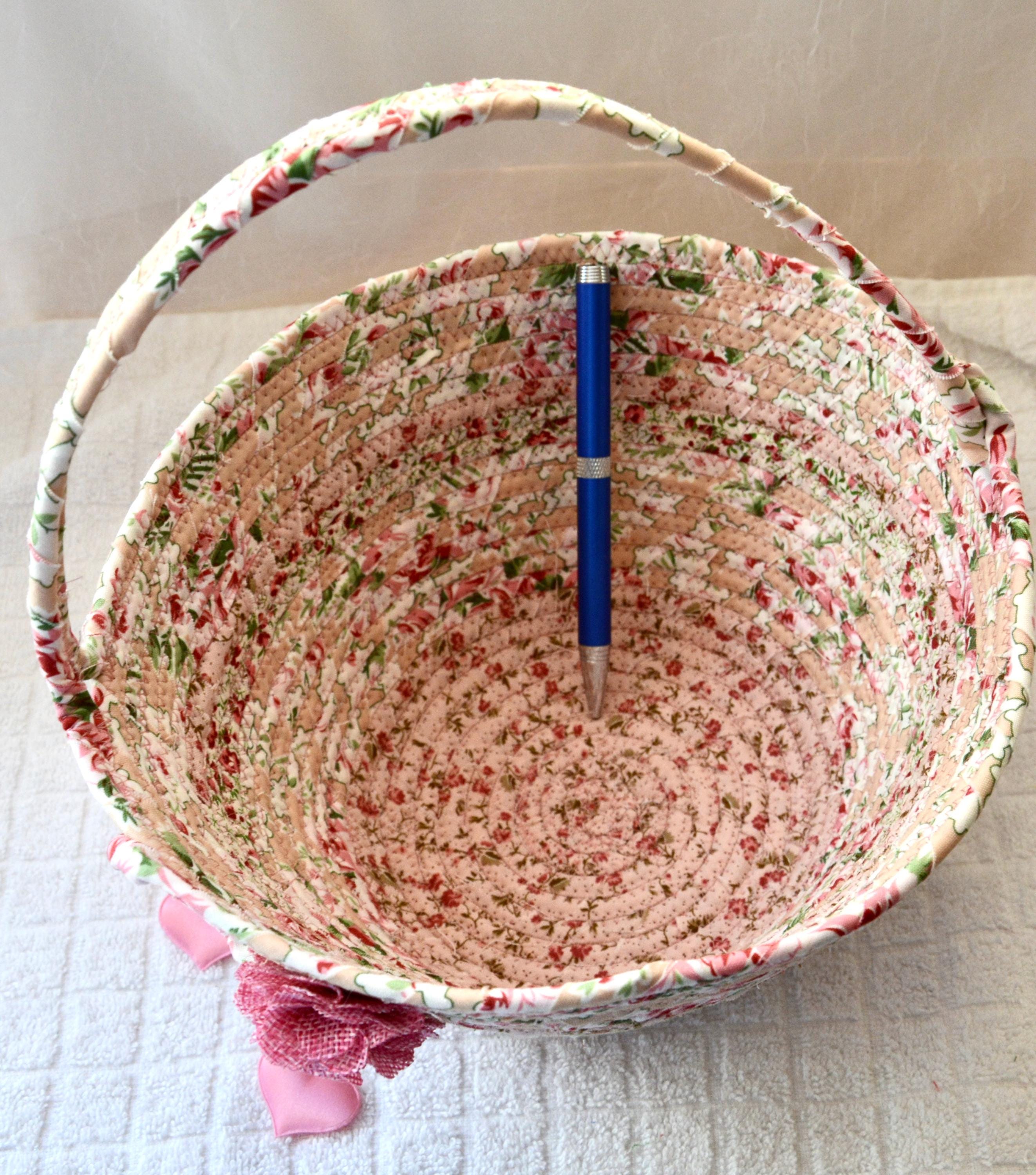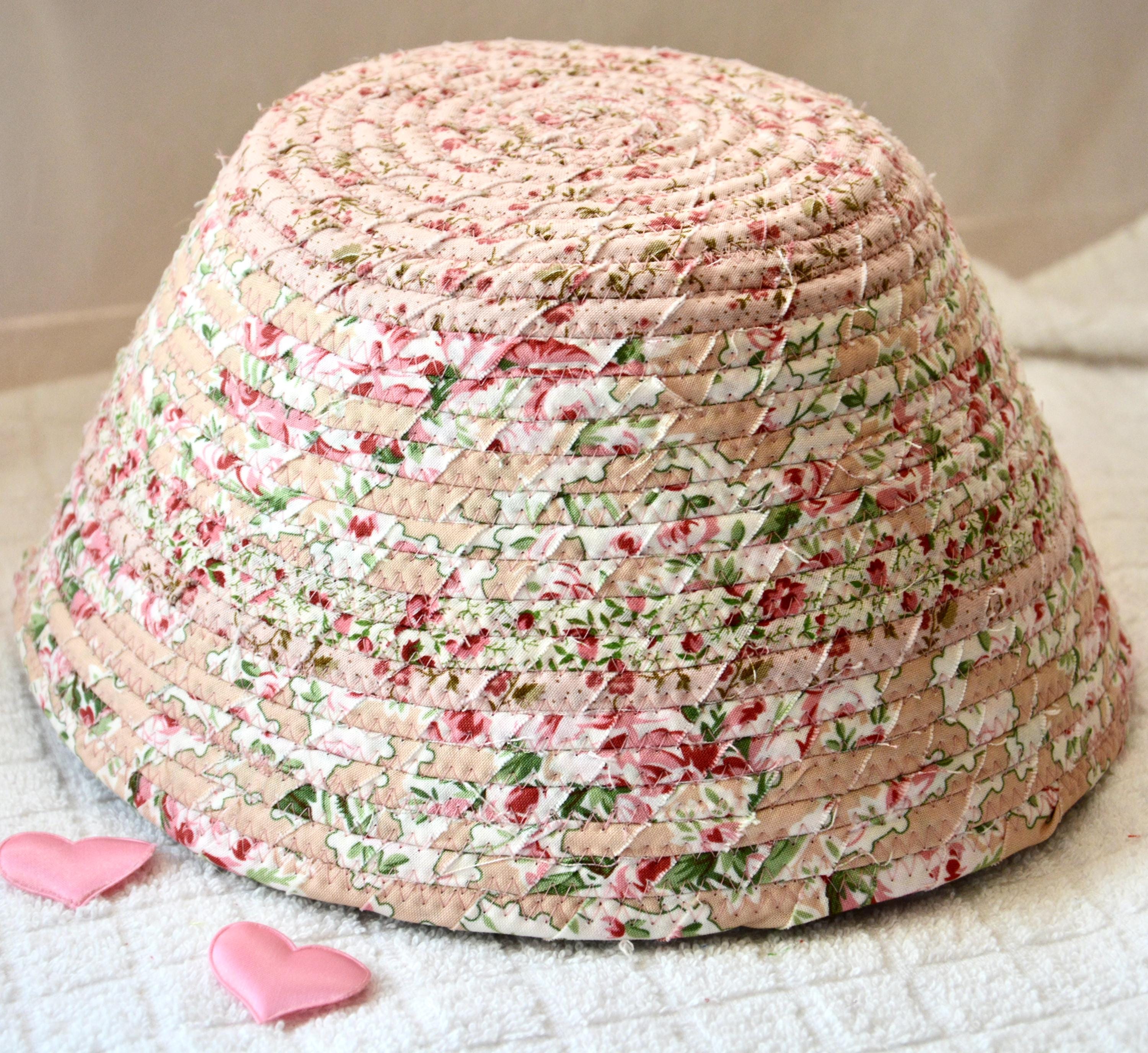 I hand wrapped these lovely floral fabrics around cotton line, which I then hand coiled and machine quilted to make it sturdy. I used the raw edge technique with a little fray, adding a nice shabby chic texture. The pretty flower on the basket is included for a nice accent.