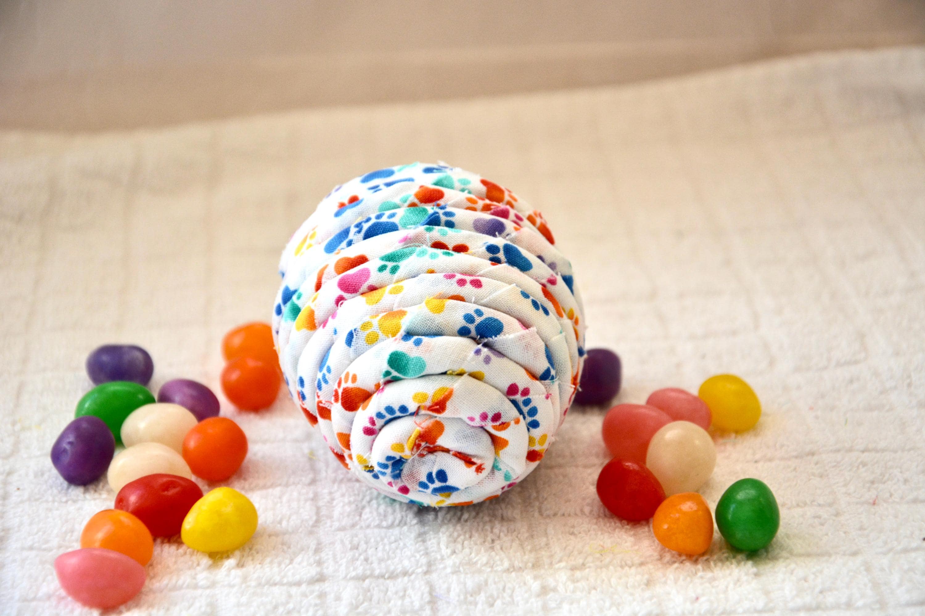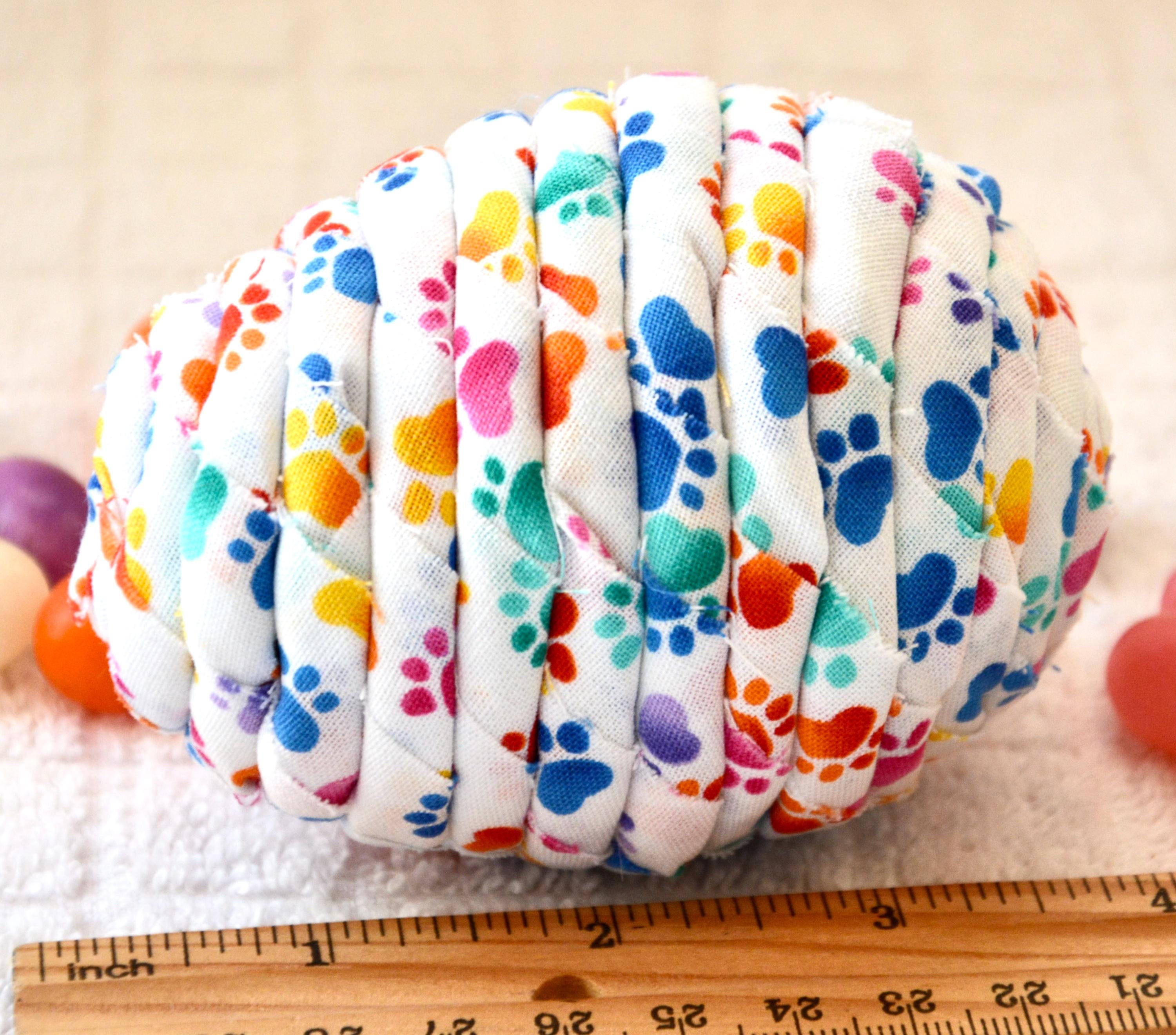 I hand wrapped this cute fabric with paw prints around cotton line which I then hand coiled into an Easter Egg shape. The fabric edge is unfinished for a lovely shabby chic texture.