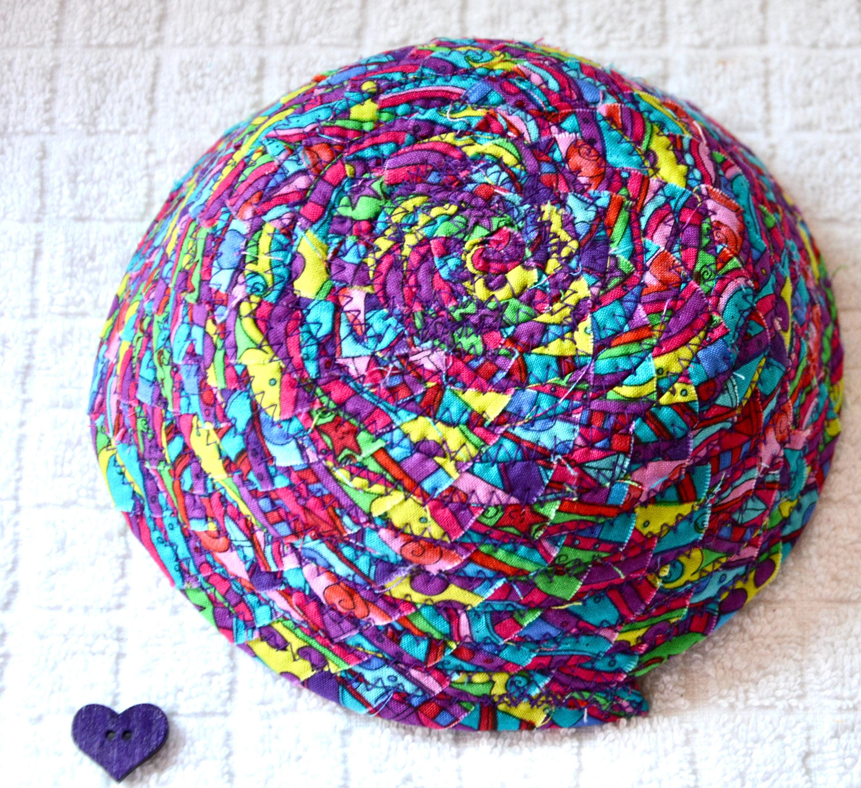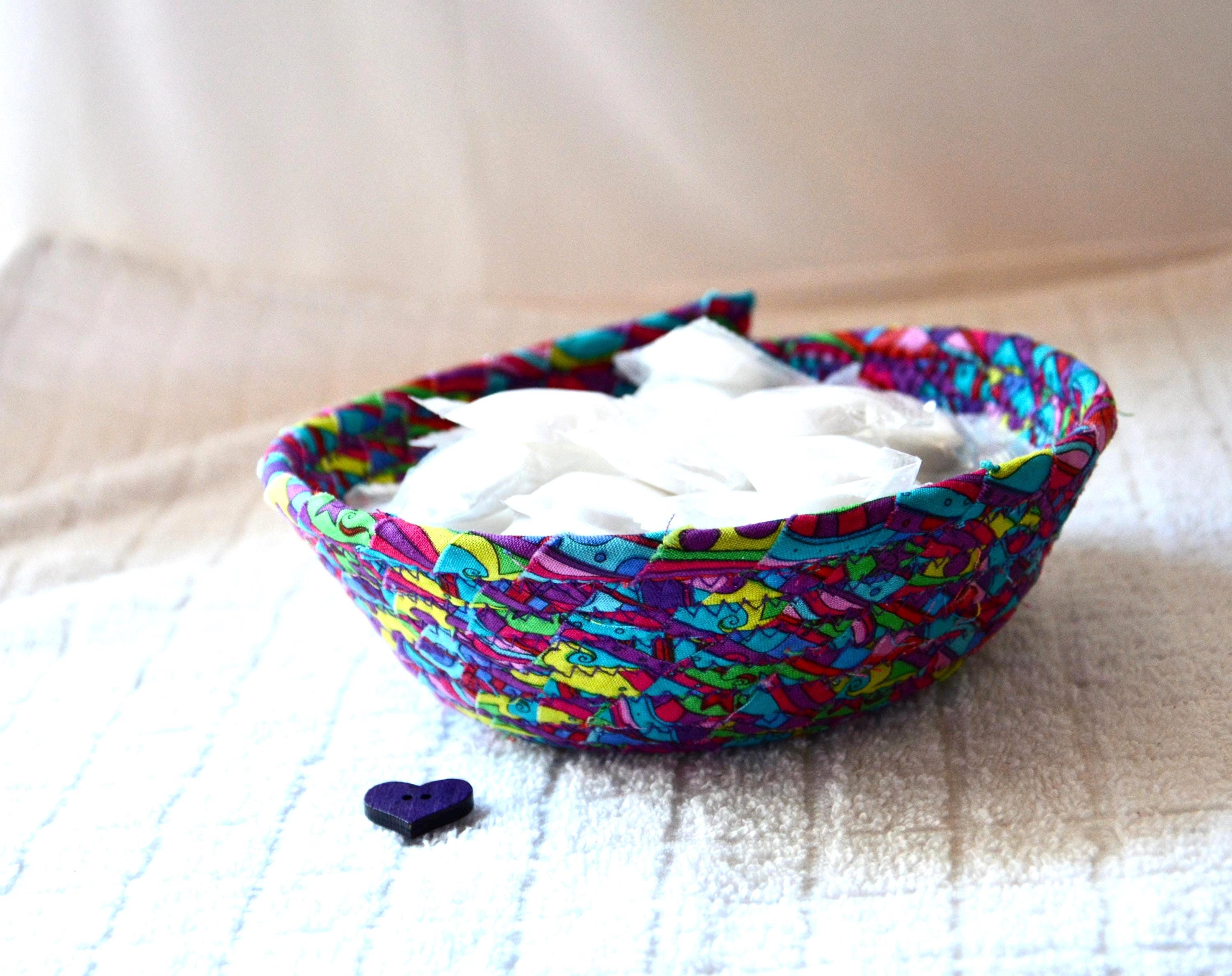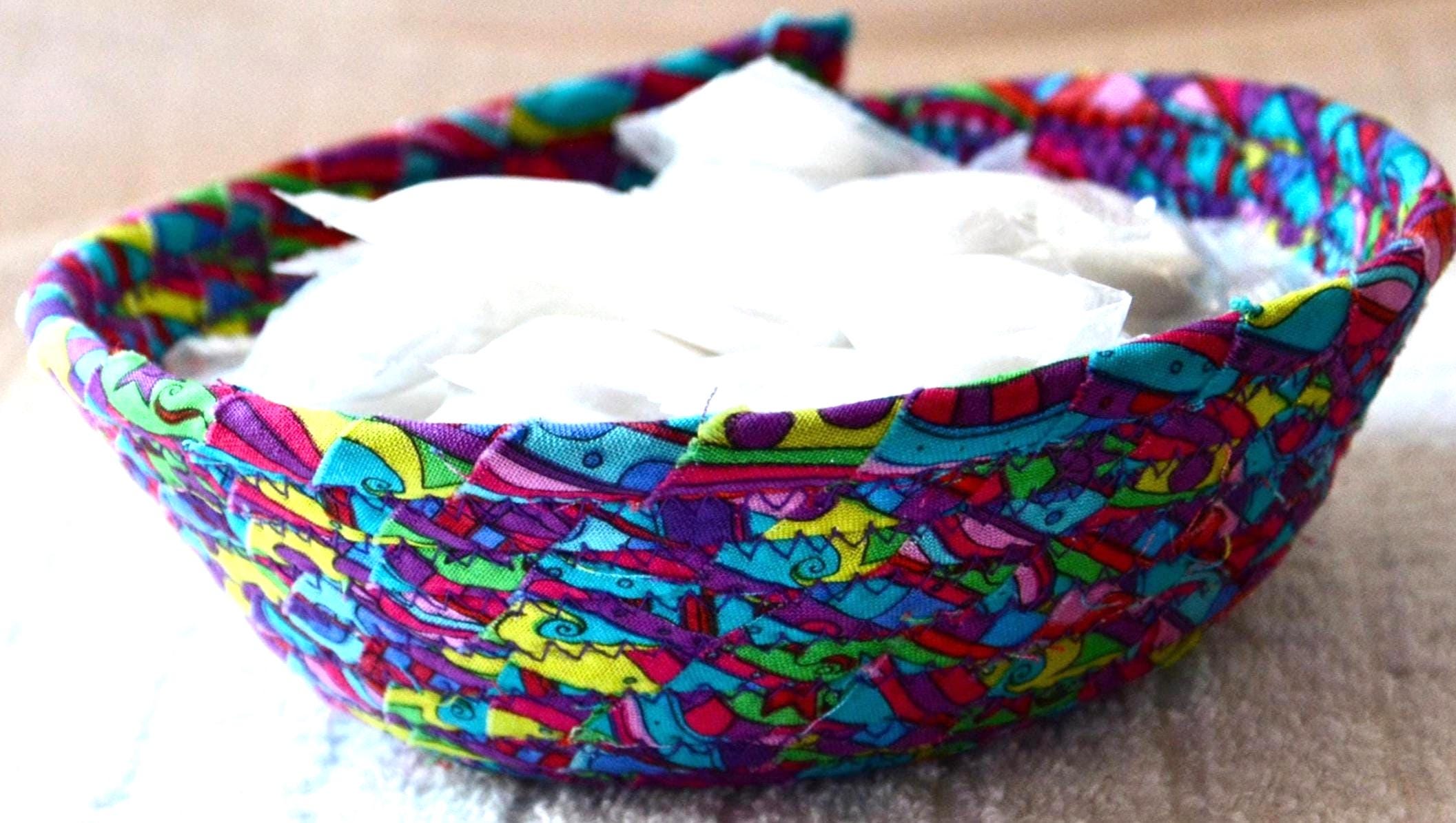 I hand wrapped this lovely fabric around cotton line, which I then hand coiled and machine quilted to make it sturdy. I used the raw edge technique with some fray for a great shabby chic texture. 100% cotton fabric and shows on the inside of the basket too! Color placement will vary.