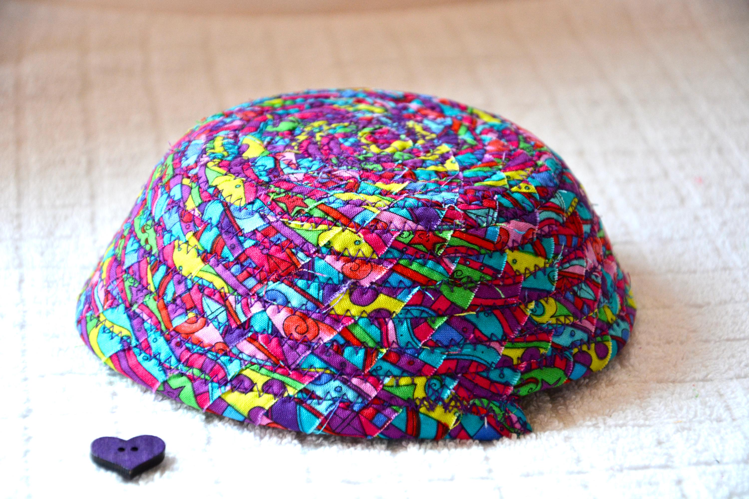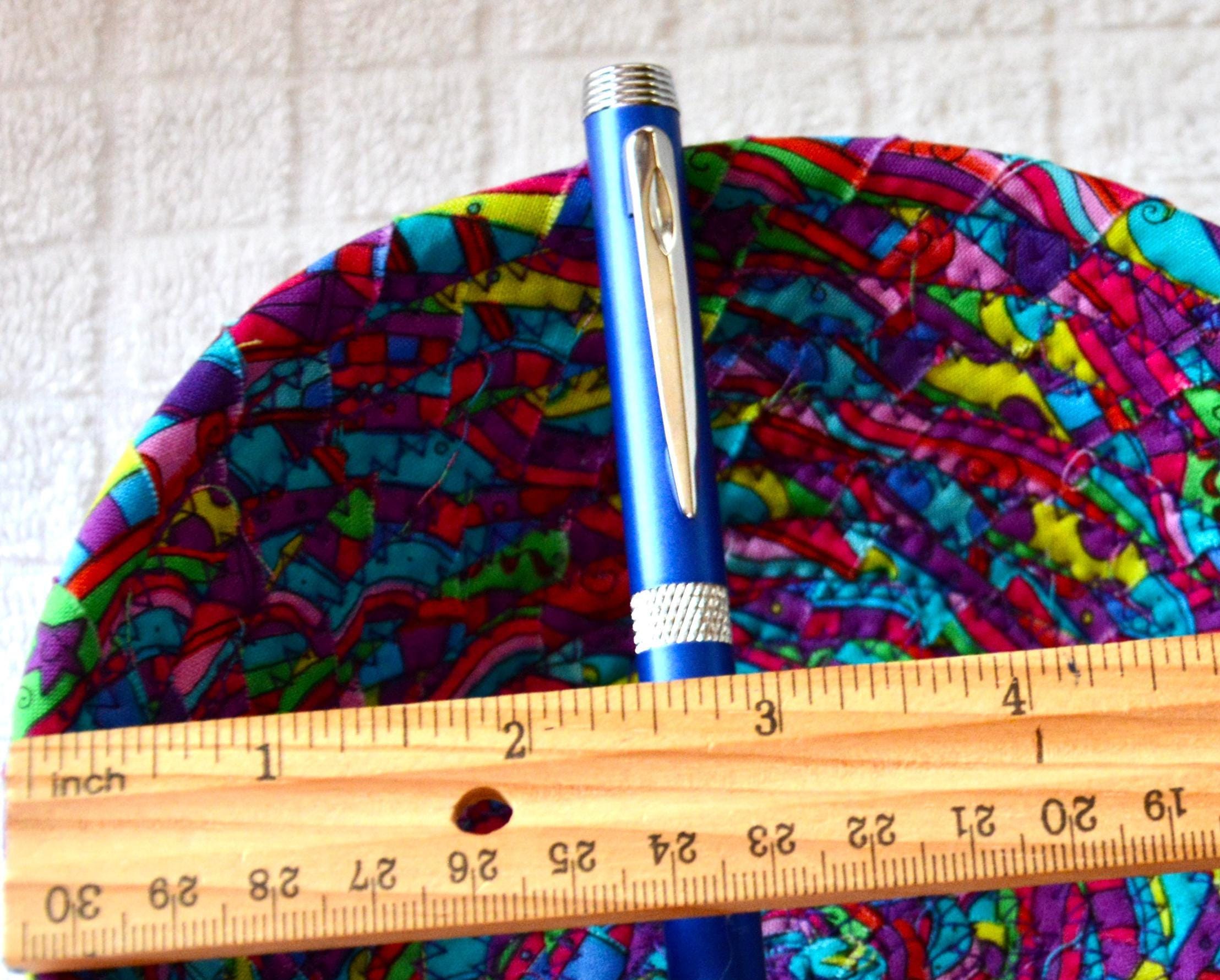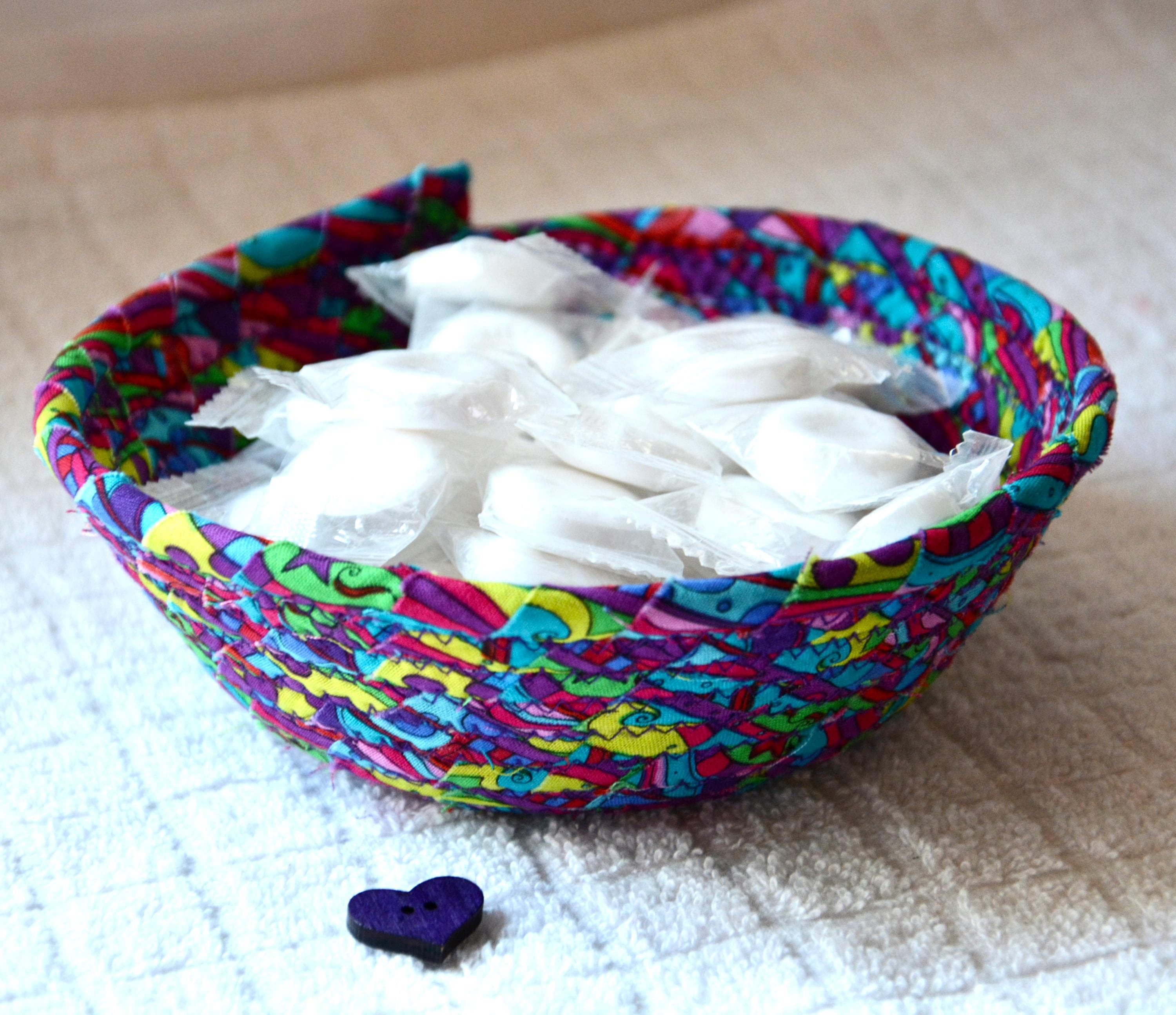 I hand wrapped this lovely fabric around cotton line, which I then hand coiled and machine quilted to make it sturdy. I used the raw edge technique with some fray for a great shabby chic texture. 100% cotton fabric and shows on the inside of the basket too! Color placement will vary.