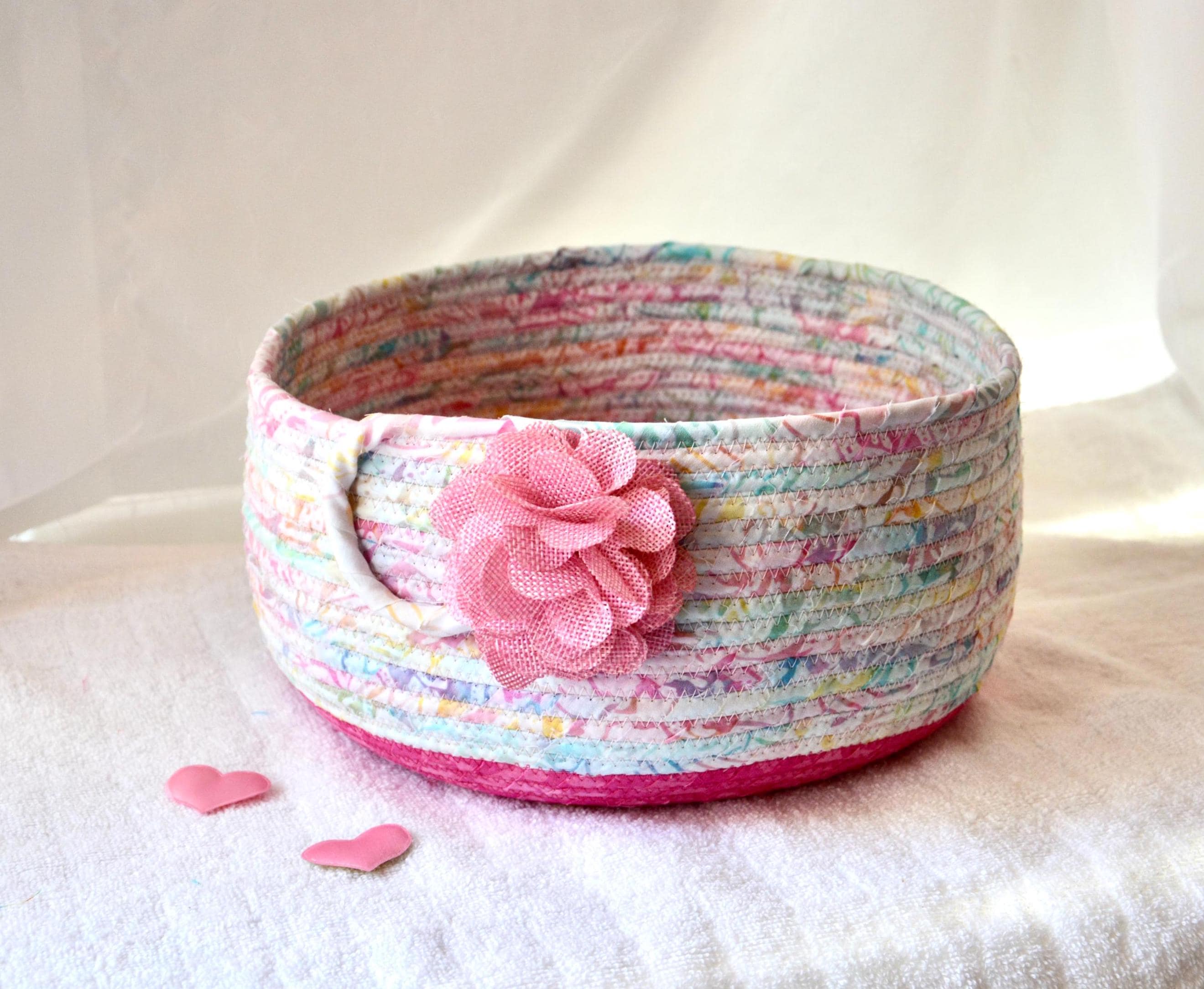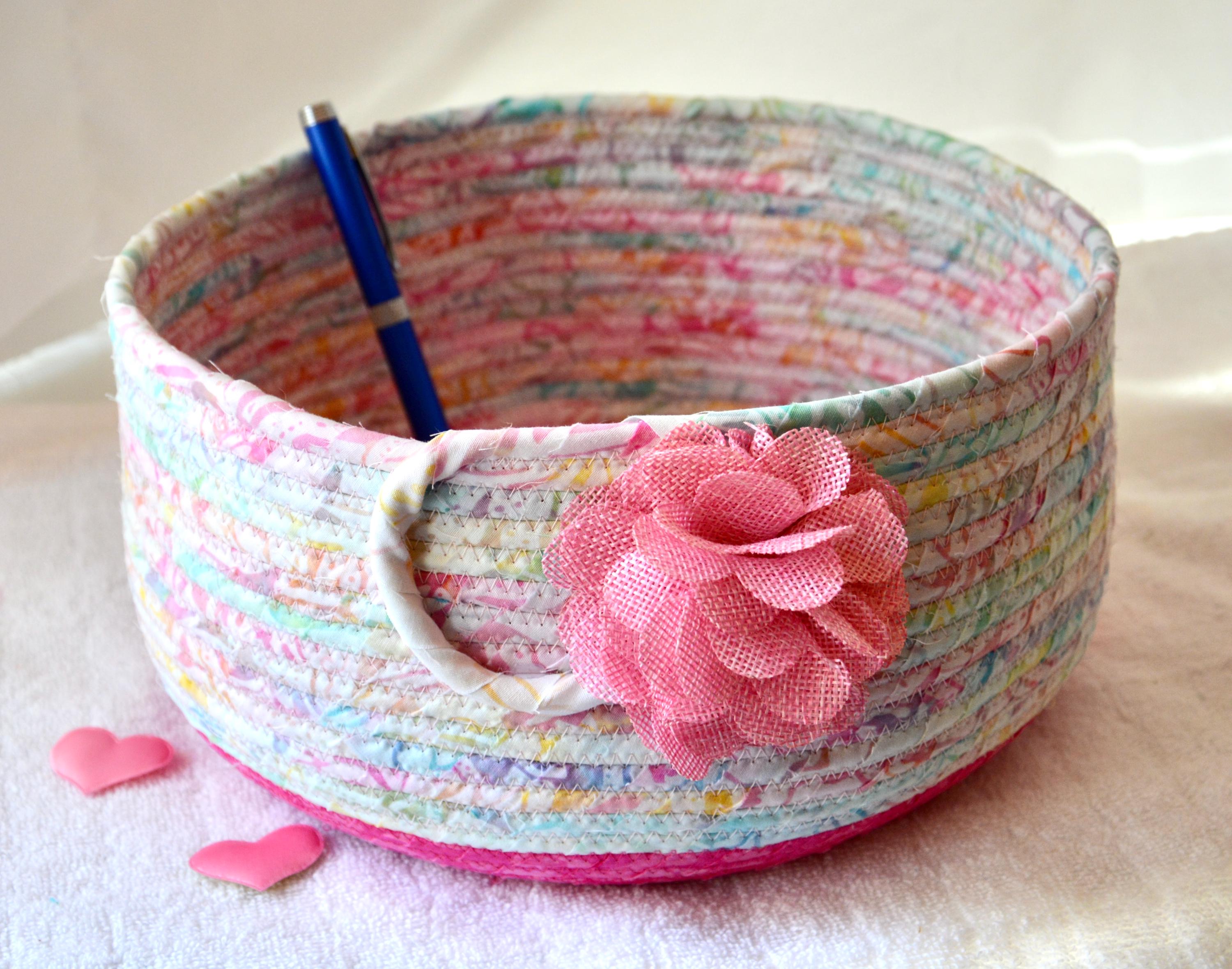 I hand wrapped these lovely high quality batik fabrics around cotton line, which I then hand coiled and machine sewed to make the basket sturdy. I used the raw edge technique with some fray to give it texture. I used 3 different beautiful batik fabrics and all are 100% cotton and show on the inside too! The pretty flower on the basket is included for a nice accent.