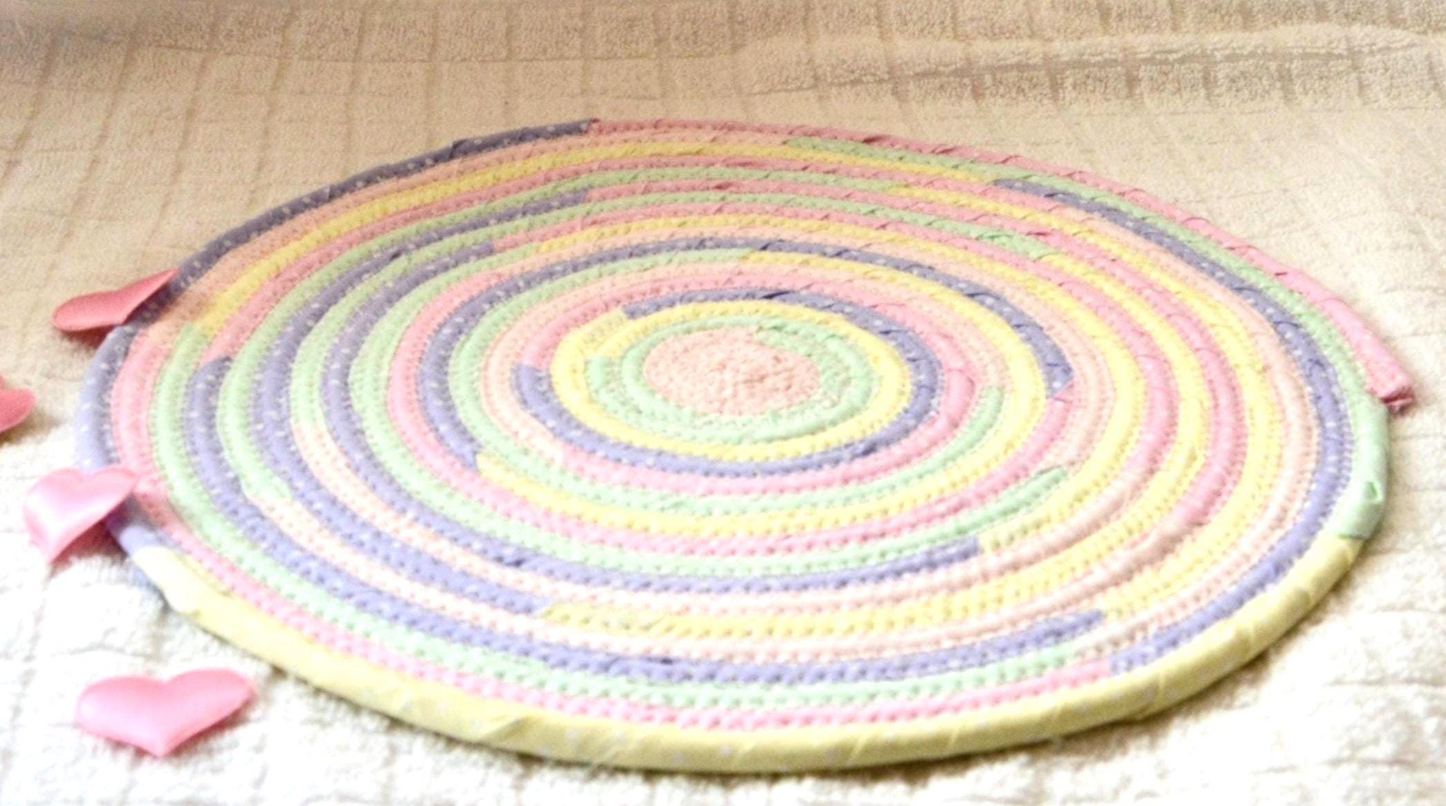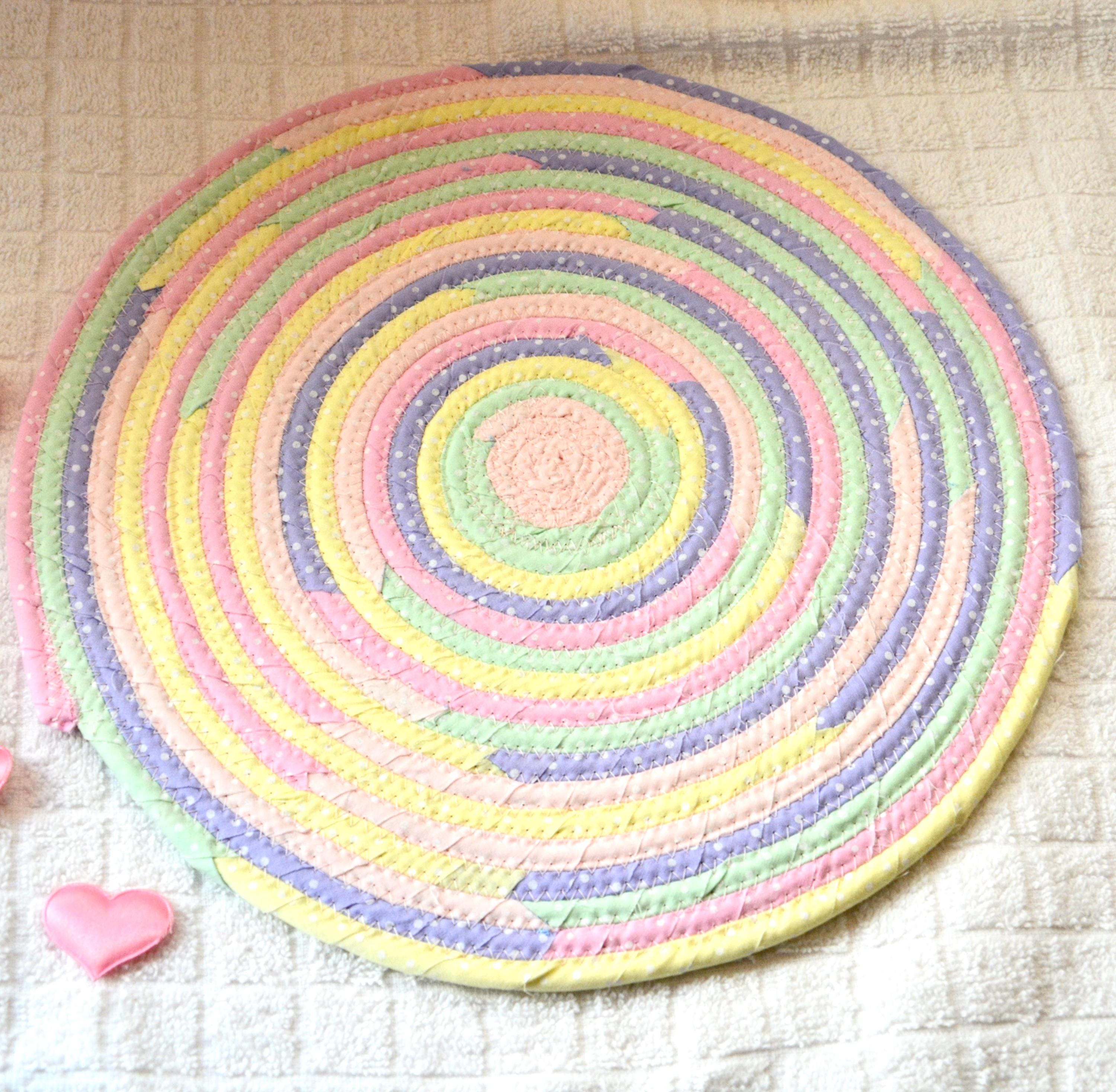 I hand wrapped these pretty fabrics around cotton line, which I then hand coiled and machine quilted to make it sturdy. I used the raw edge technique with some fray adding a nice shabby chic texture. All are 100% cotton fabrics and show on both sides of the trivet too! The pattern created is so unique! OOAK! Color placement will vary.