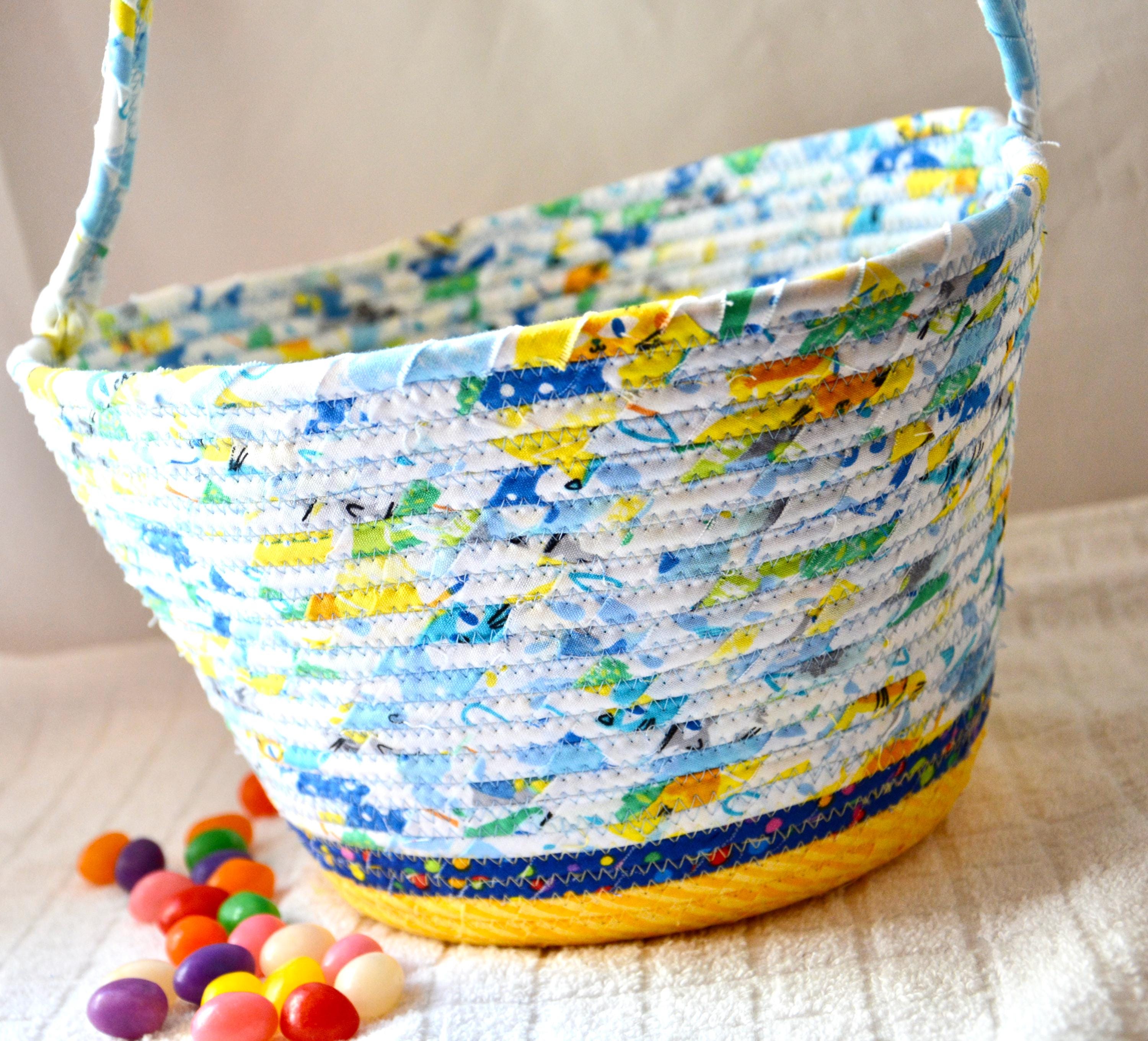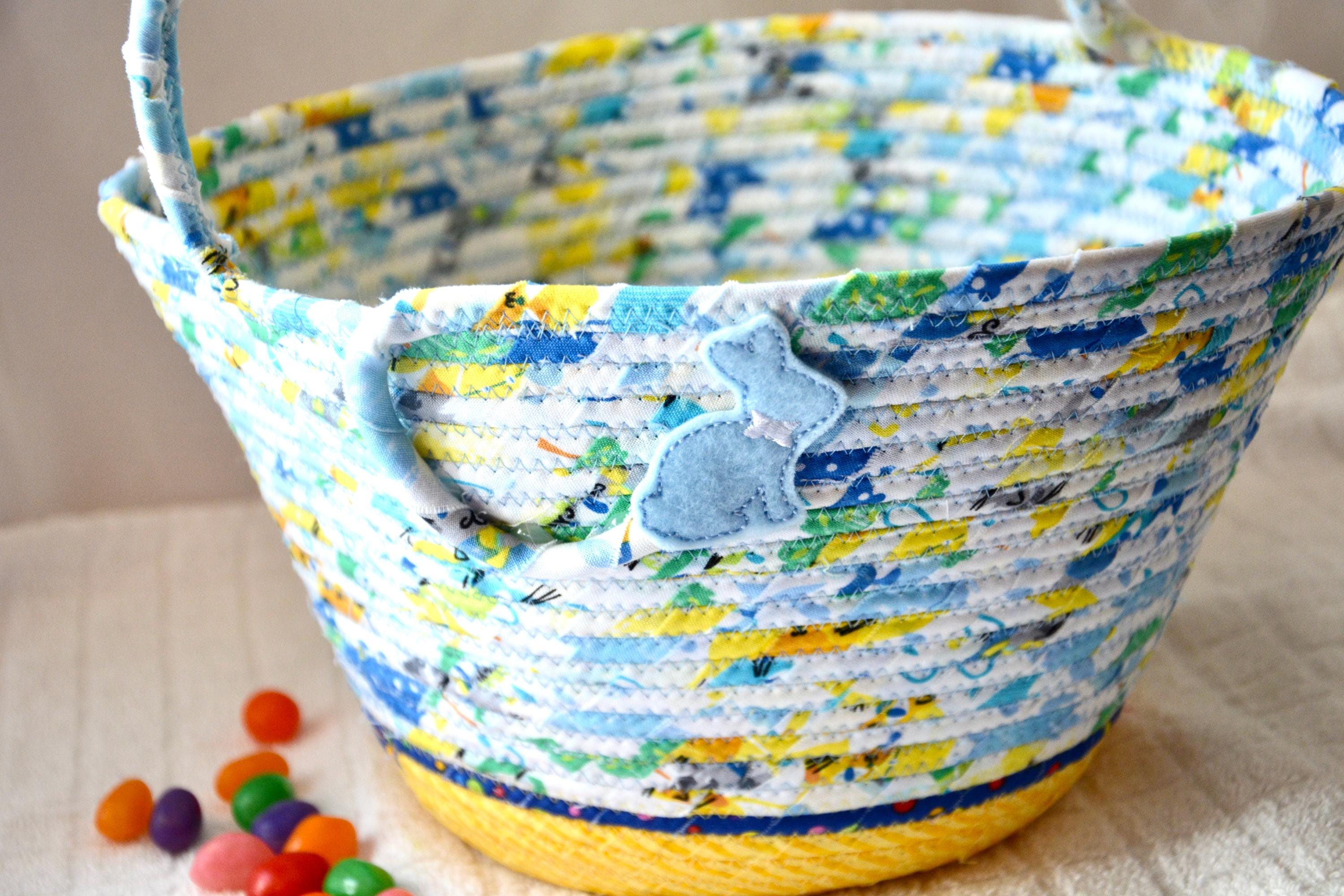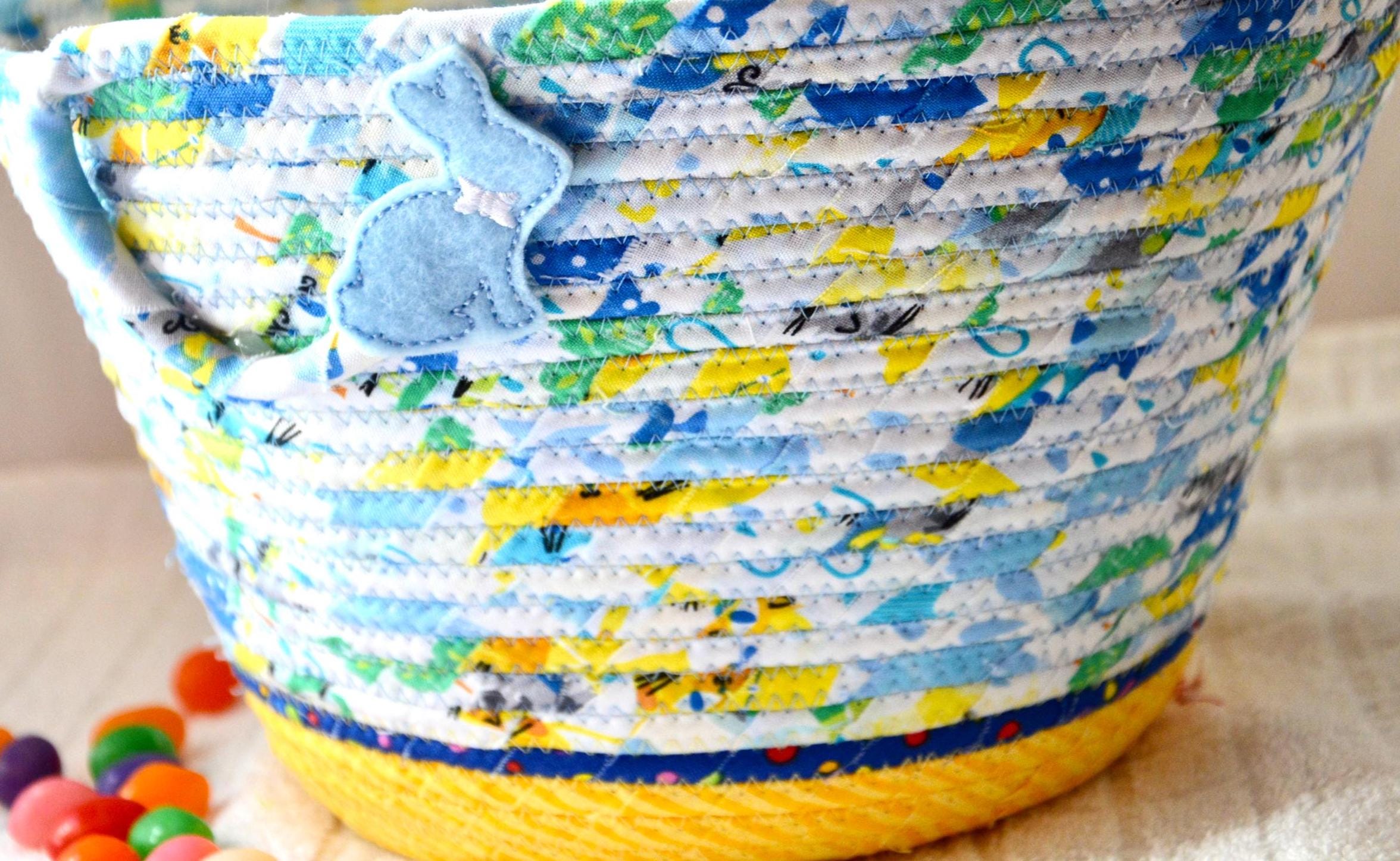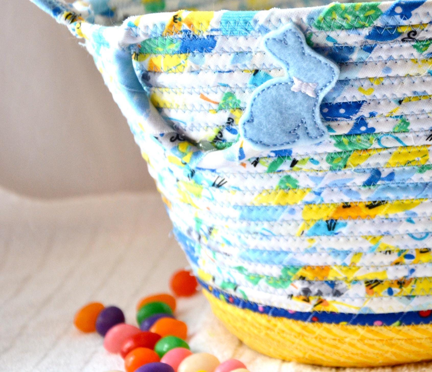 I hand wrapped these fun rainbow and yellow fabrics around cotton line, which I then hand coiled and machine quilted to make it sturdy. I used the raw edge technique with a little fray adding a shabby chic texture. The cute felted bunny on the basket is included for a nice accent. Go Green with this fun keepsake basket! I just love these colorful fabrics, both are 100% cotton and all show on the inside of the basket too!