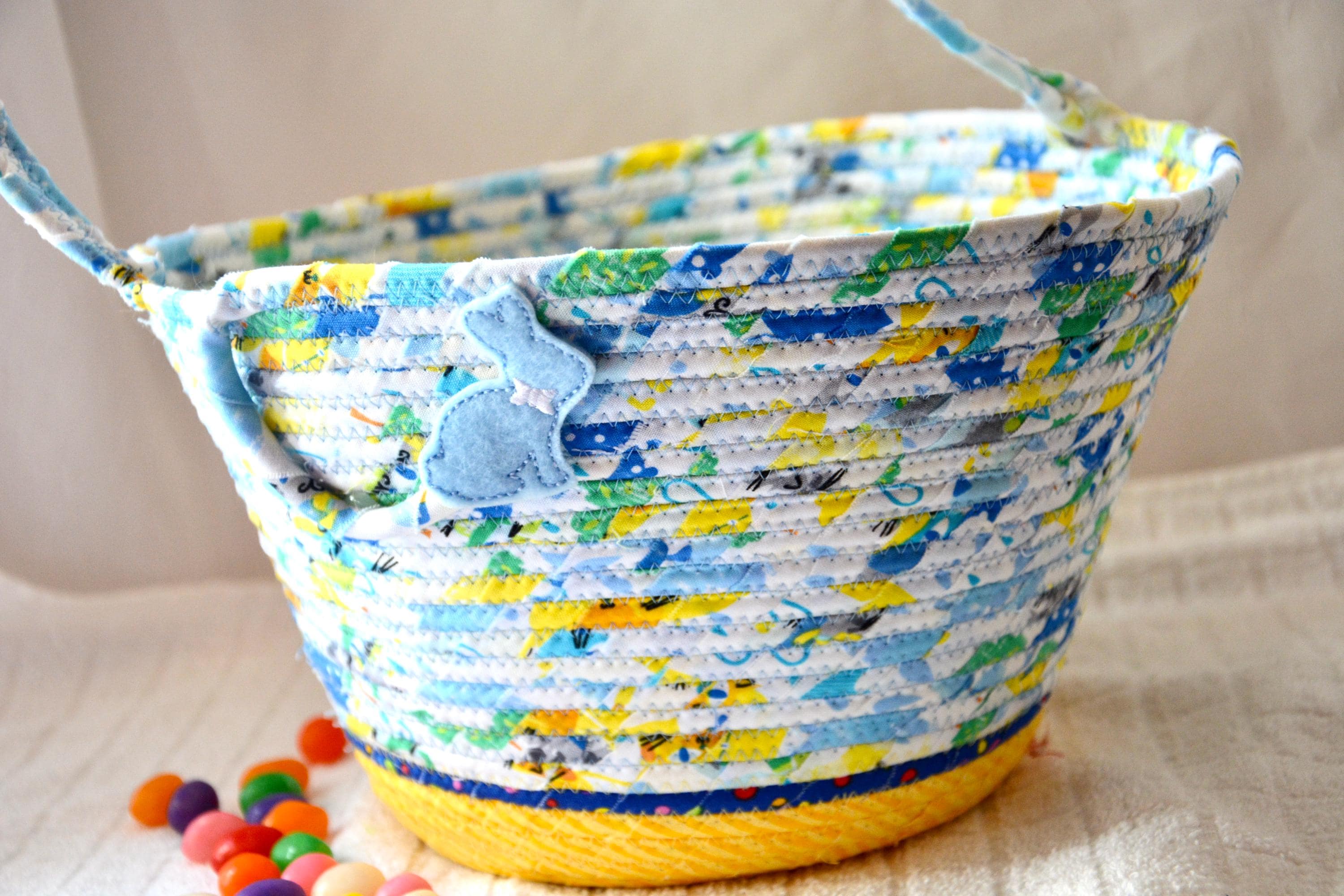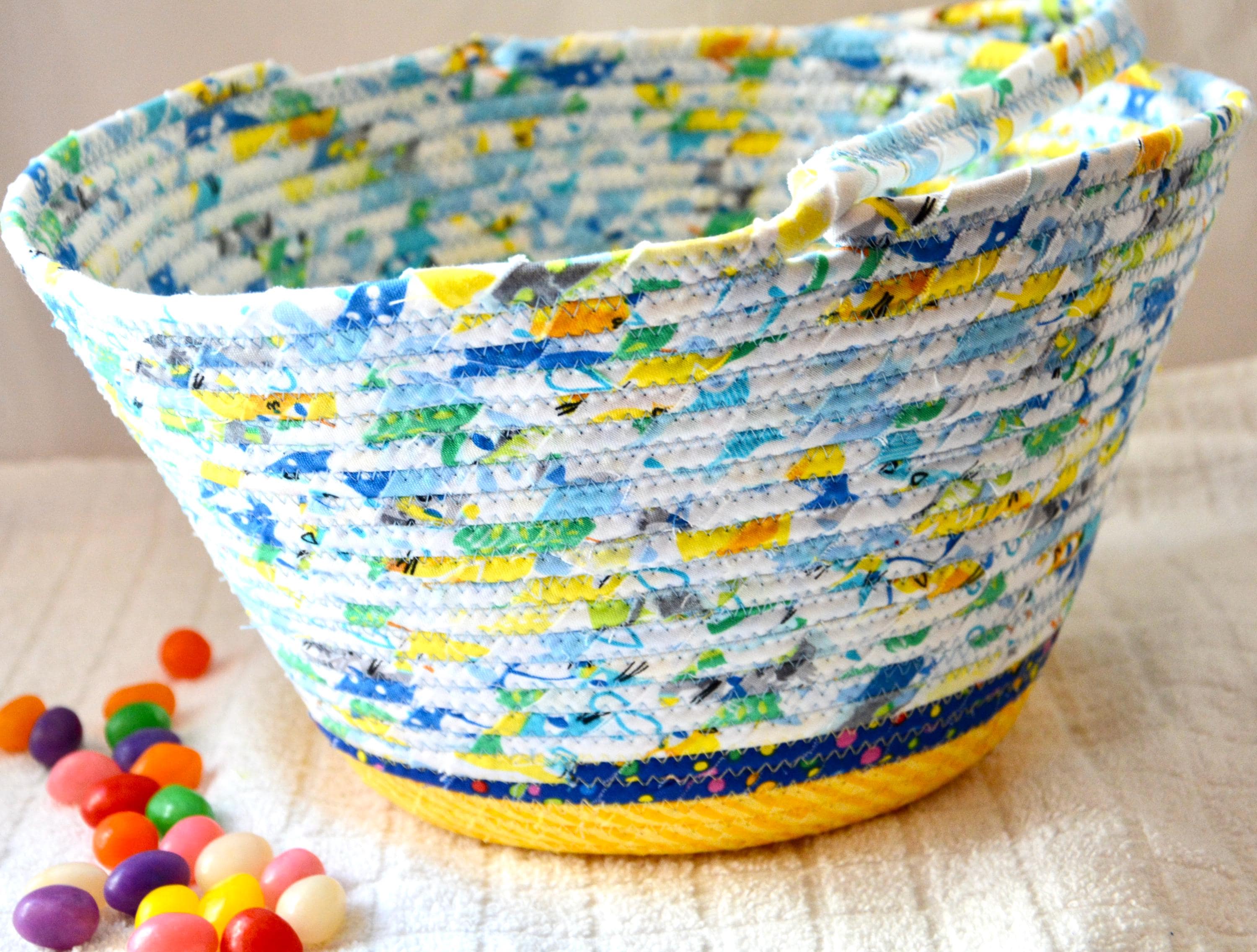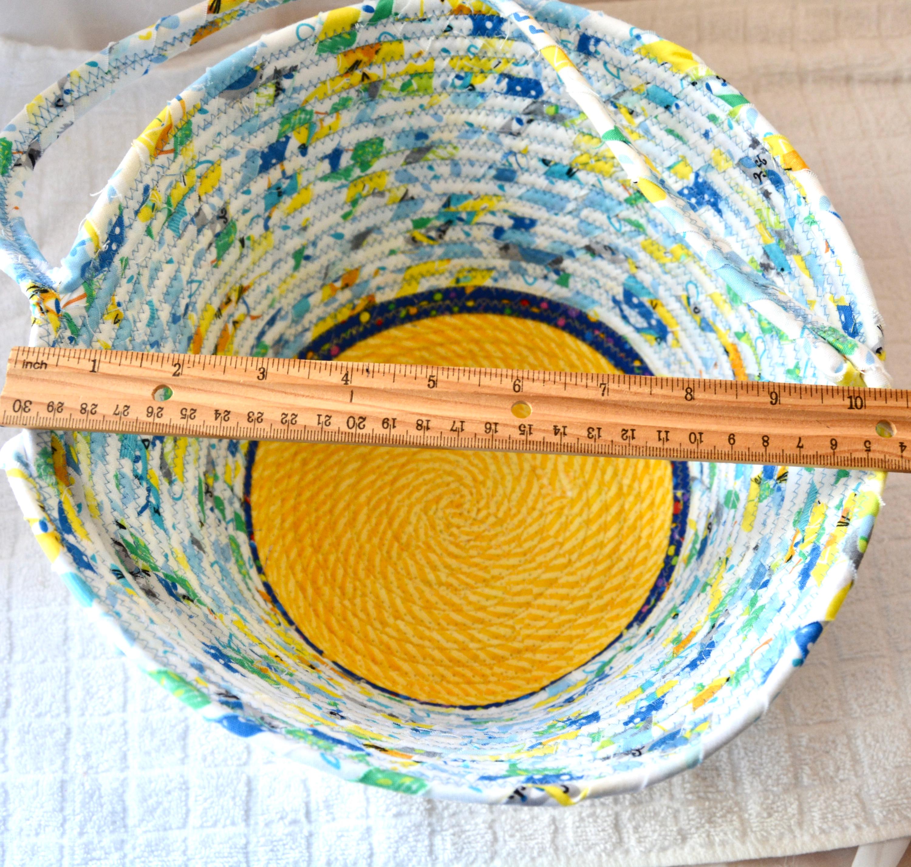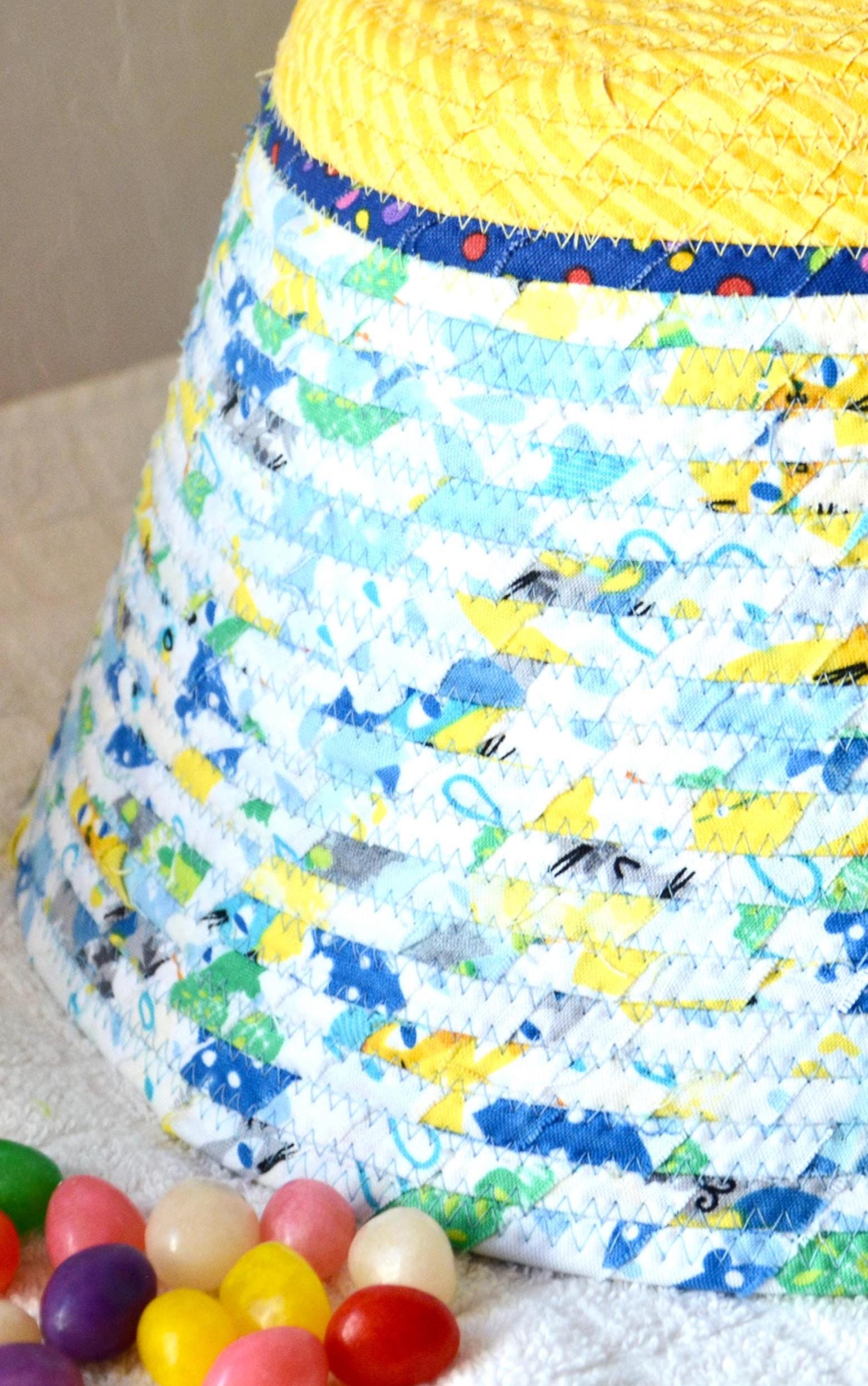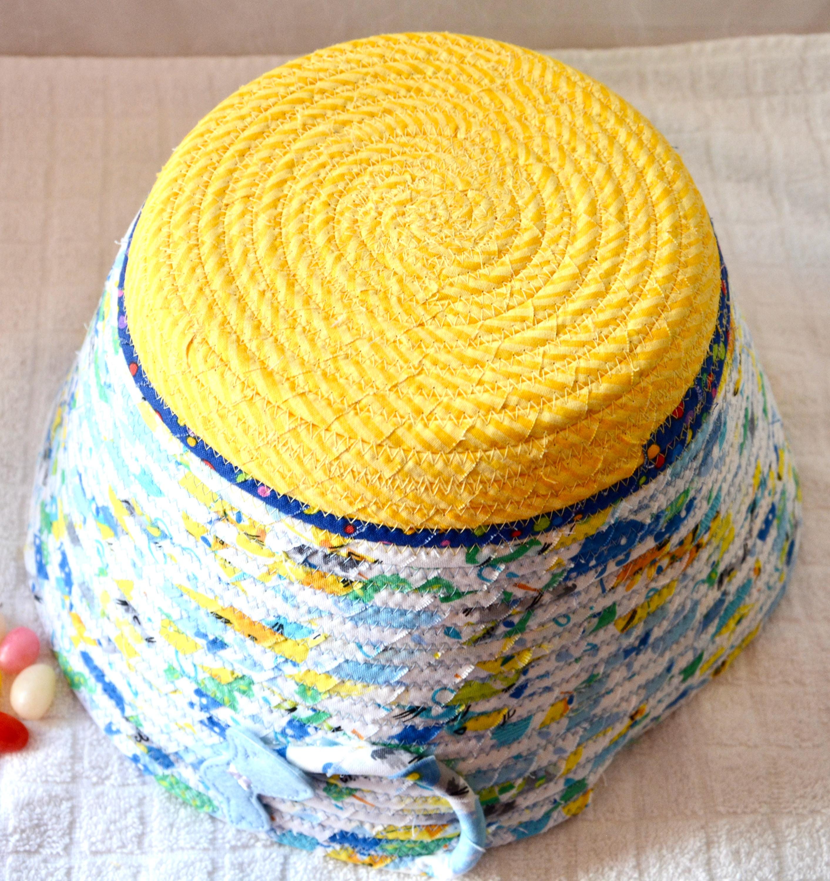 I hand wrapped these fun rainbow and yellow fabrics around cotton line, which I then hand coiled and machine quilted to make it sturdy. I used the raw edge technique with a little fray adding a shabby chic texture. The cute felted bunny on the basket is included for a nice accent. Go Green with this fun keepsake basket! I just love these colorful fabrics, both are 100% cotton and all show on the inside of the basket too!
