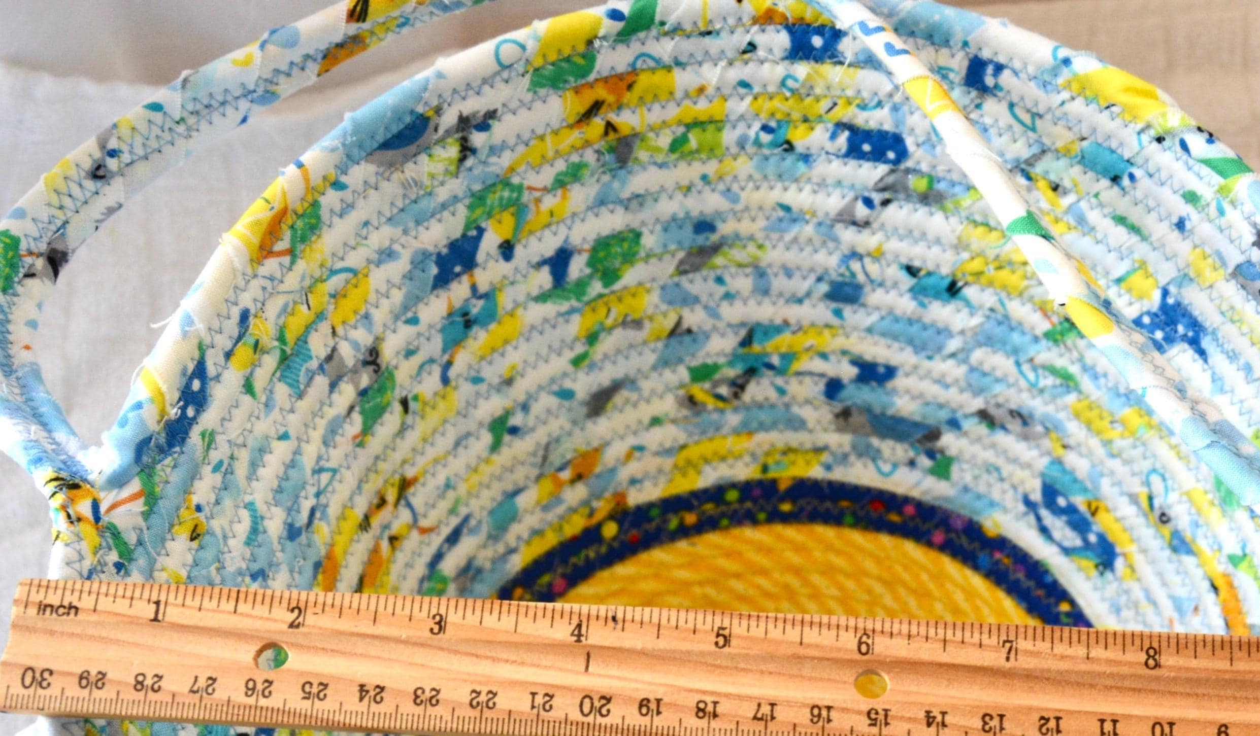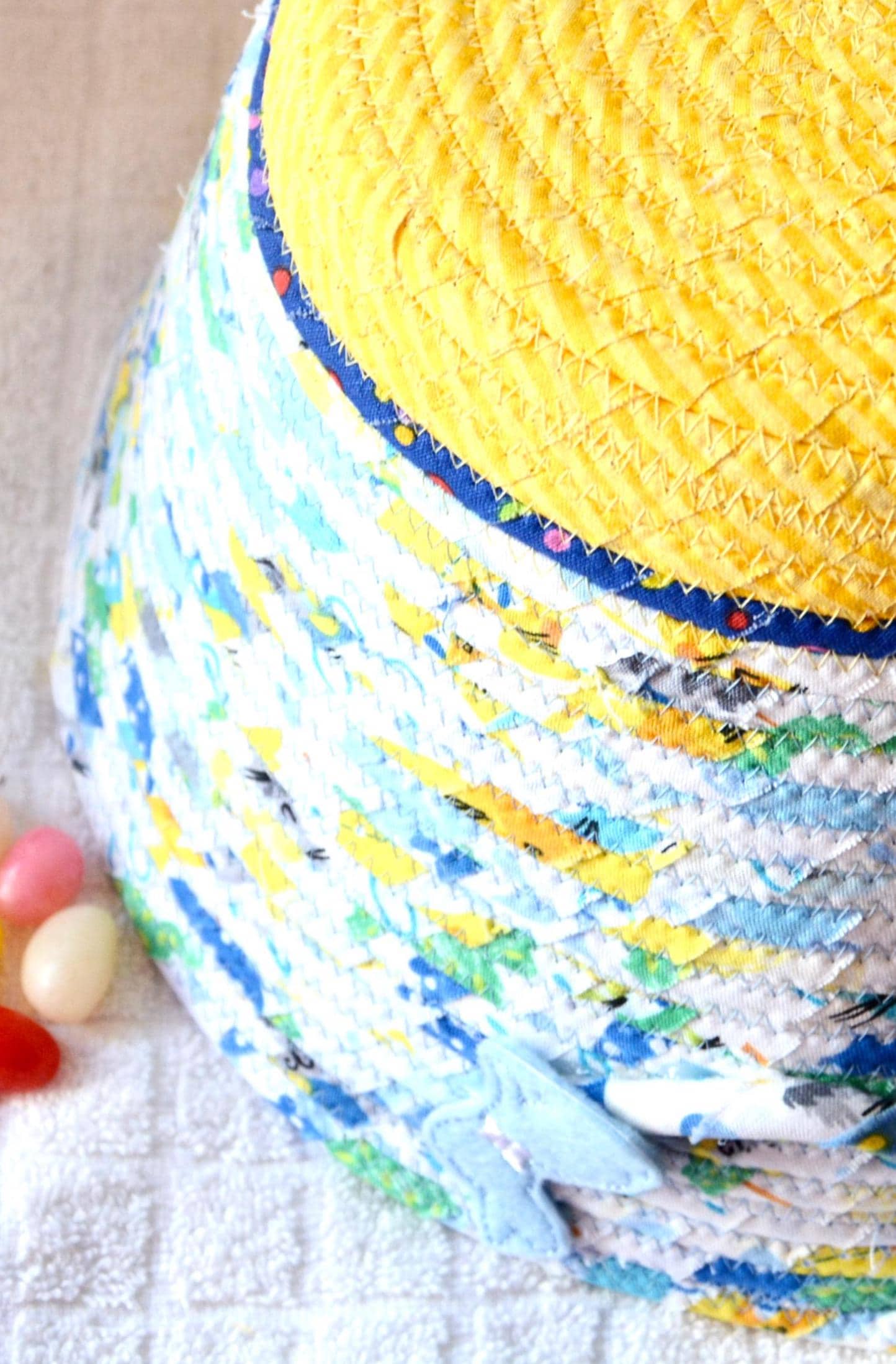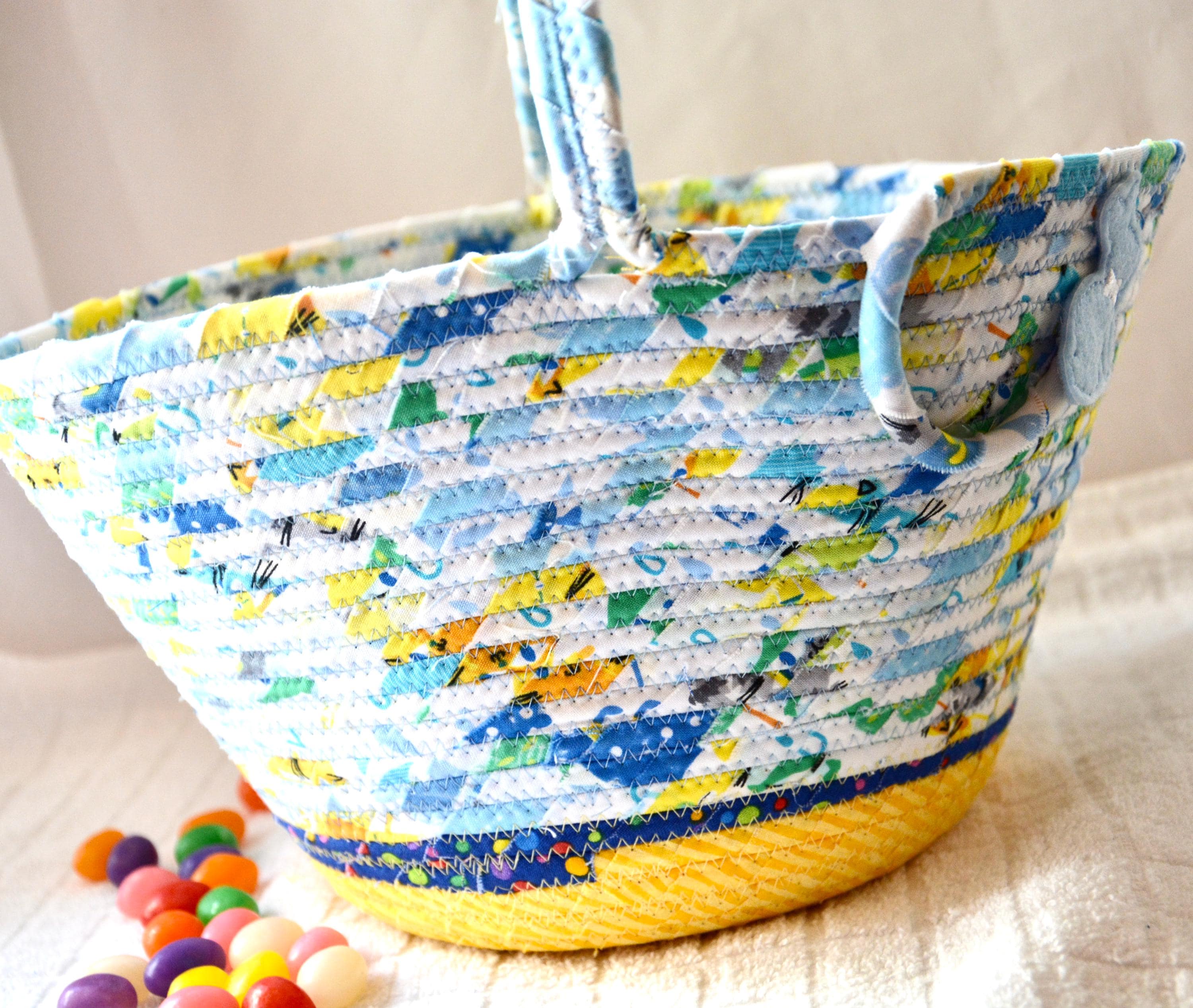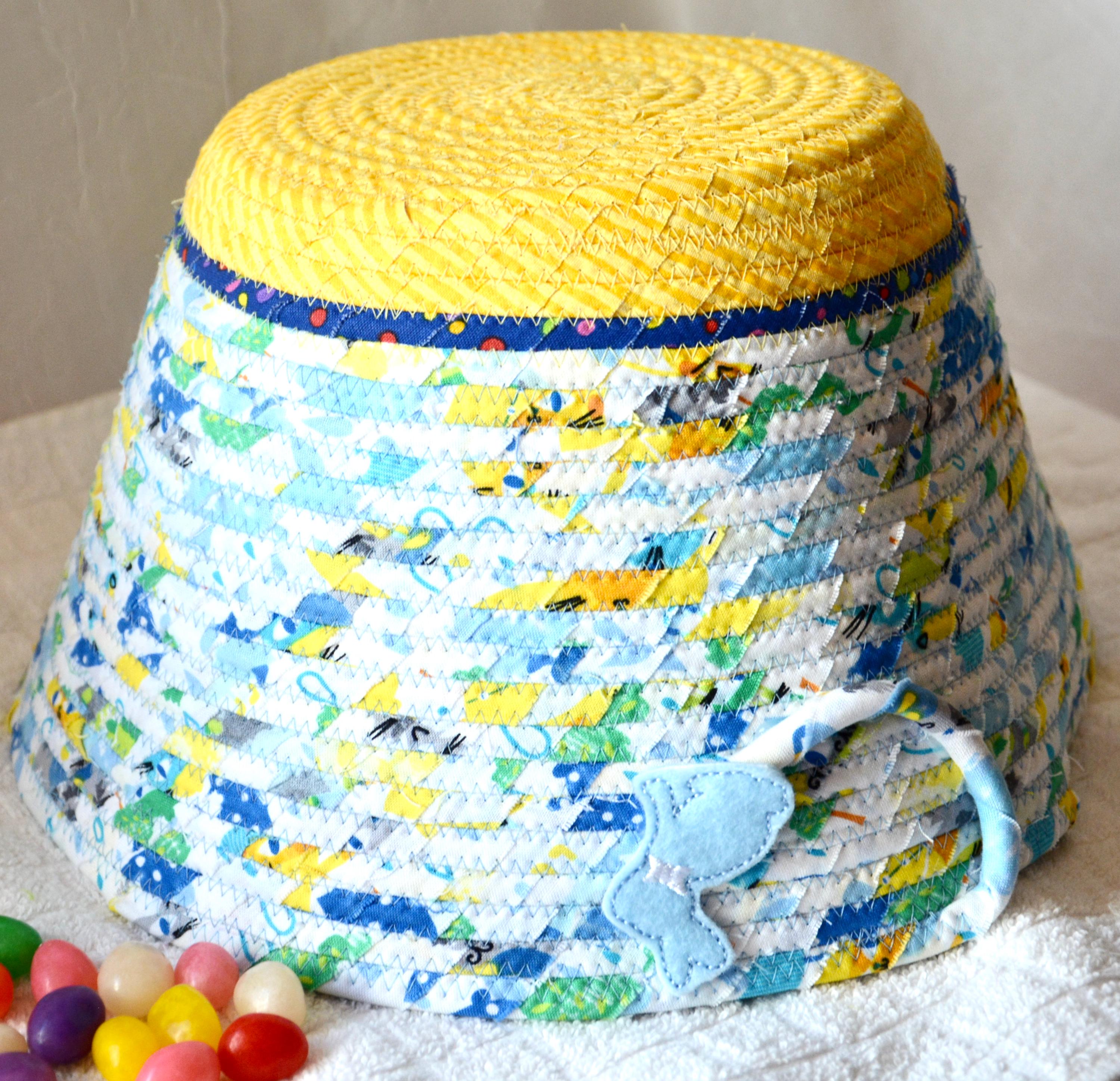 I hand wrapped these fun rainbow and yellow fabrics around cotton line, which I then hand coiled and machine quilted to make it sturdy. I used the raw edge technique with a little fray adding a shabby chic texture. The cute felted bunny on the basket is included for a nice accent. Go Green with this fun keepsake basket! I just love these colorful fabrics, both are 100% cotton and all show on the inside of the basket too!
