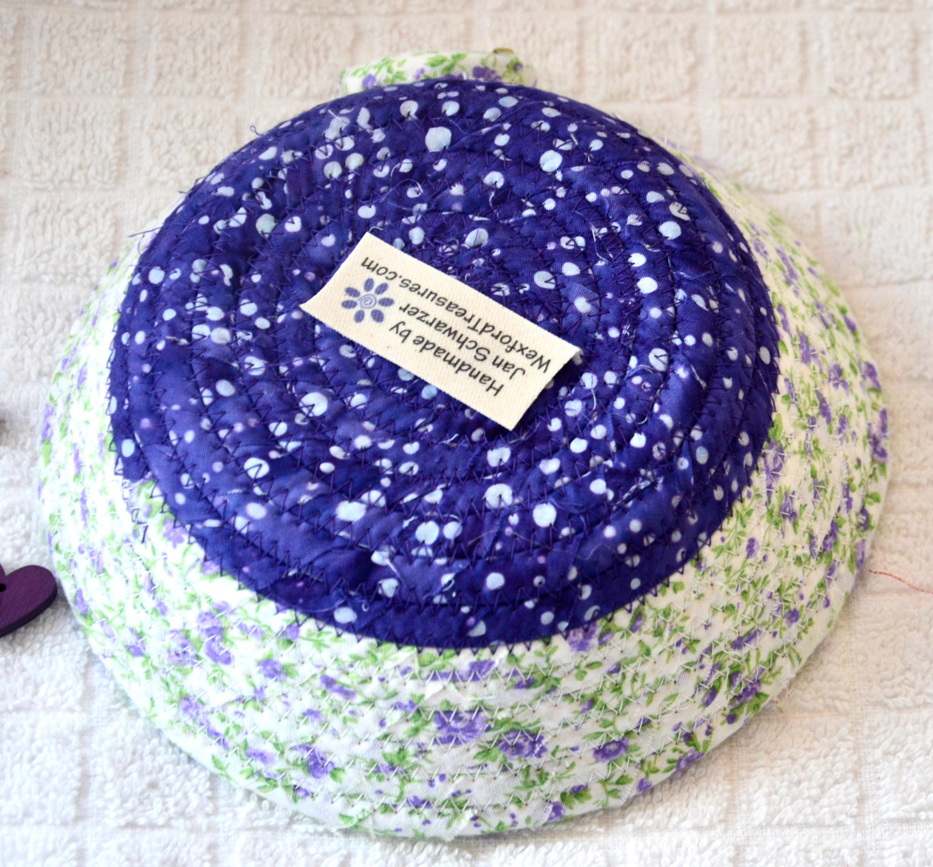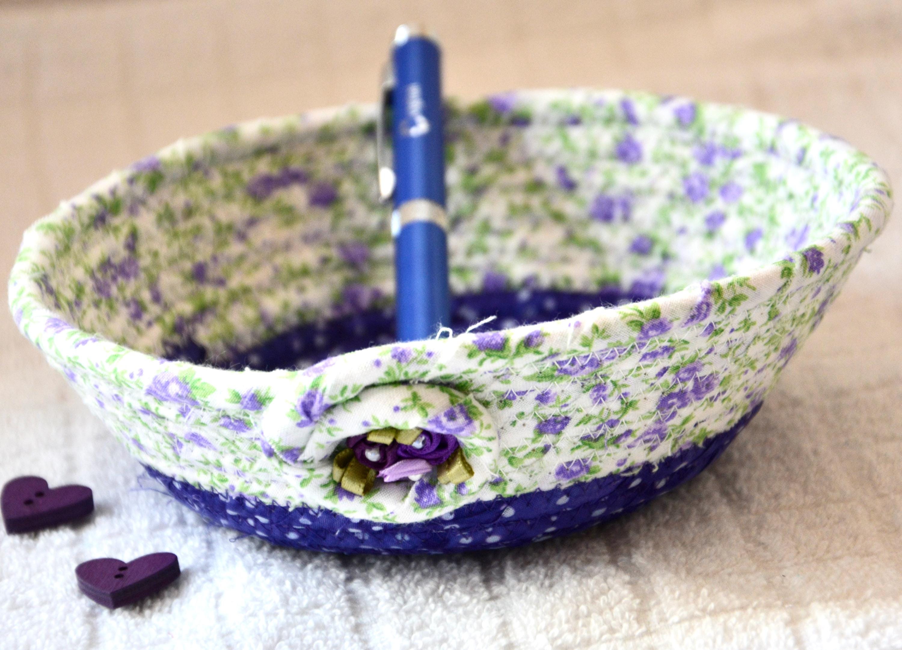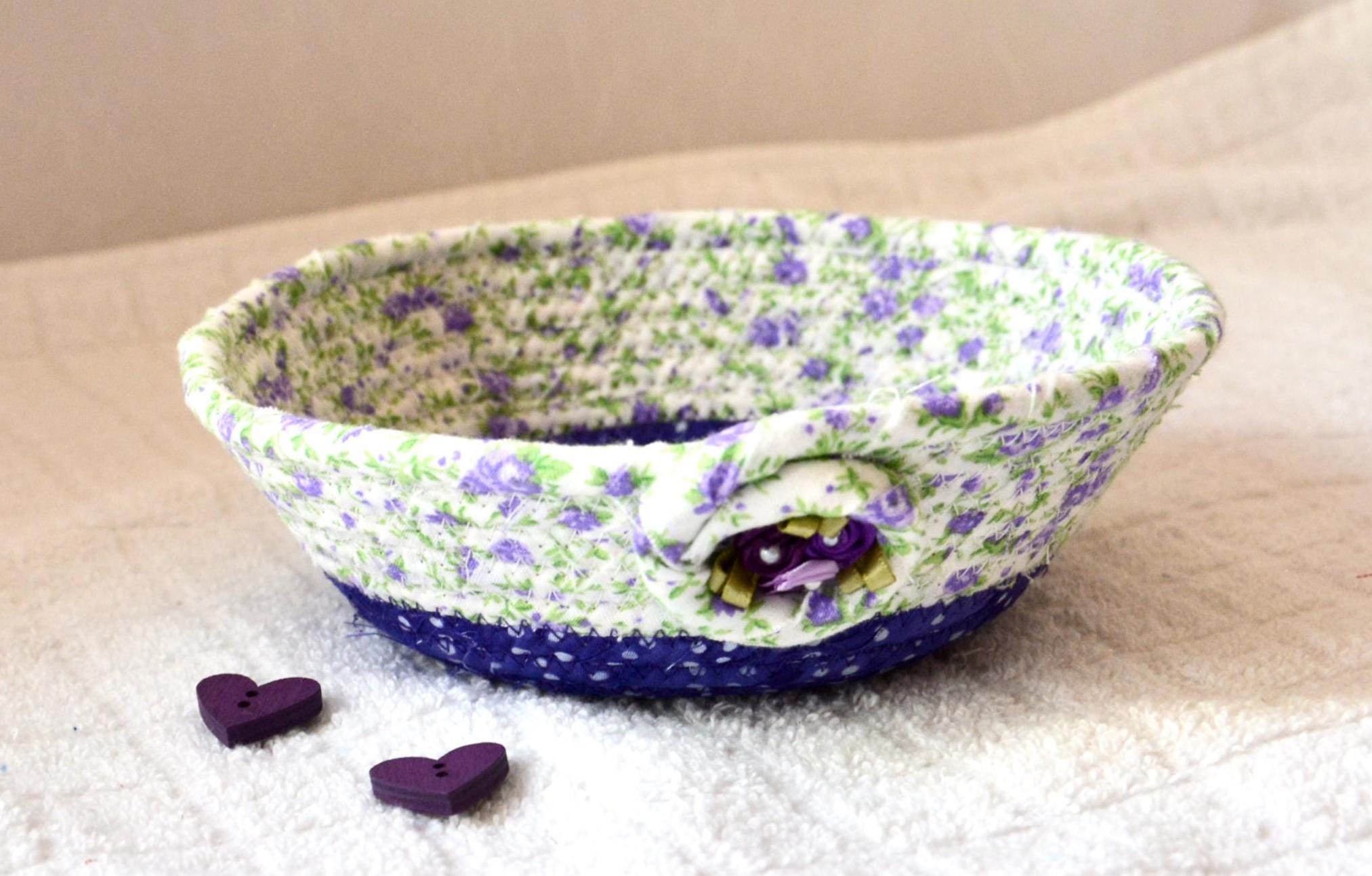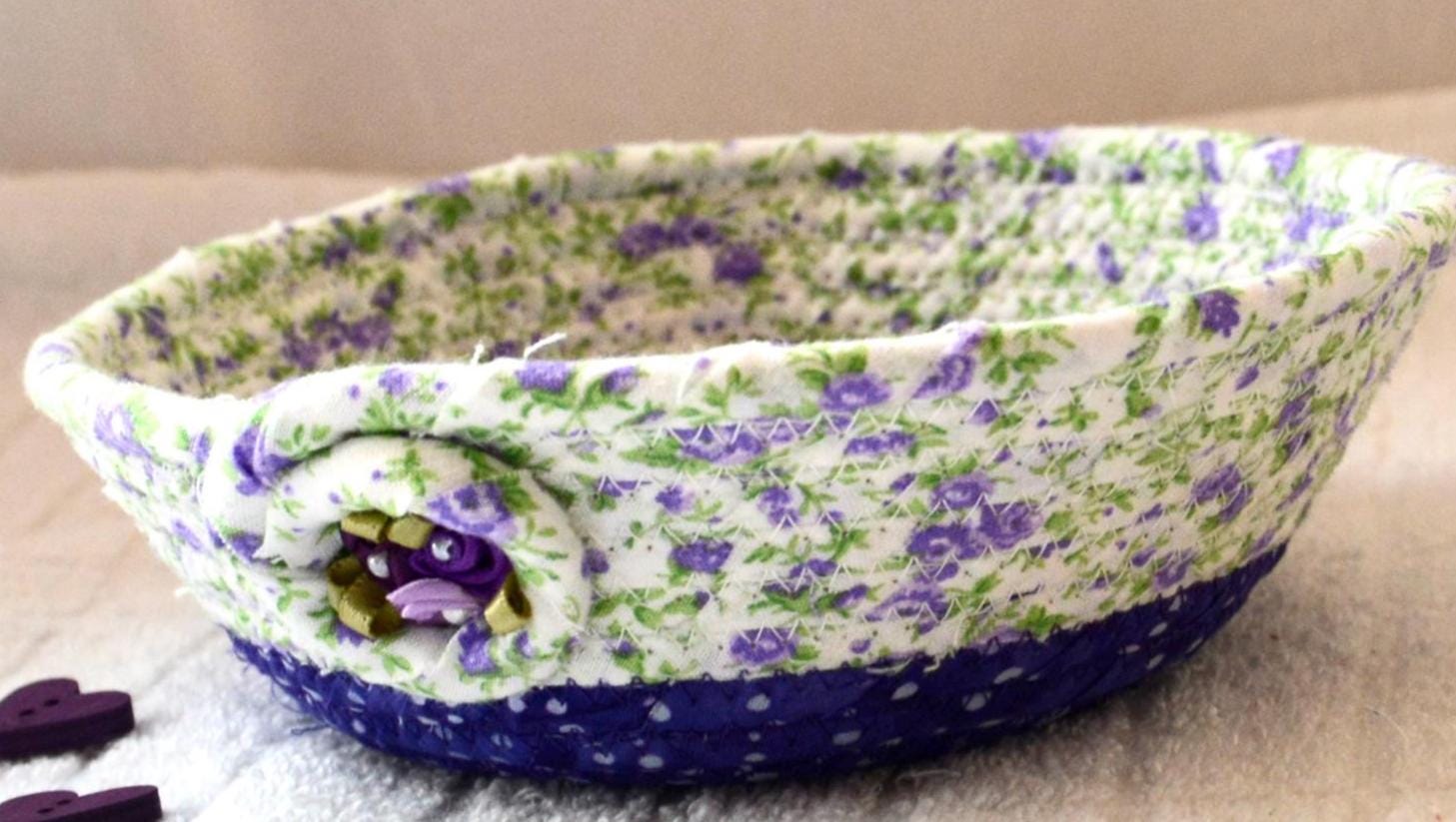 I hand wrapped this lovely purple floral fabric around cotton line, which I then hand coiled and machine quilted to make it sturdy. I used the raw edge technique with a little fray for a great shabby chic texture. I added a lavender floral top fabric for a nice contrast. 100% cotton fabric and shows on the inside of the basket too!