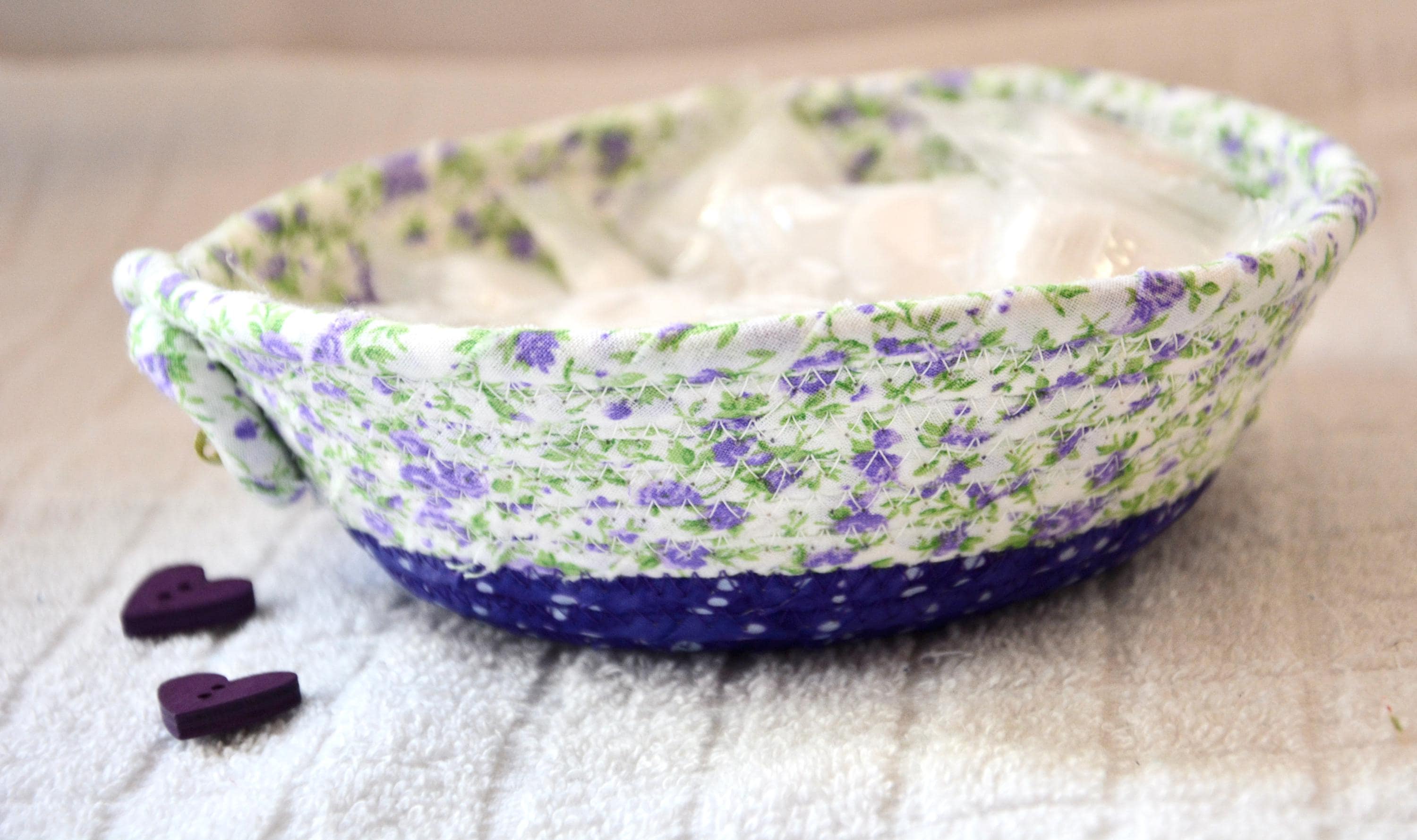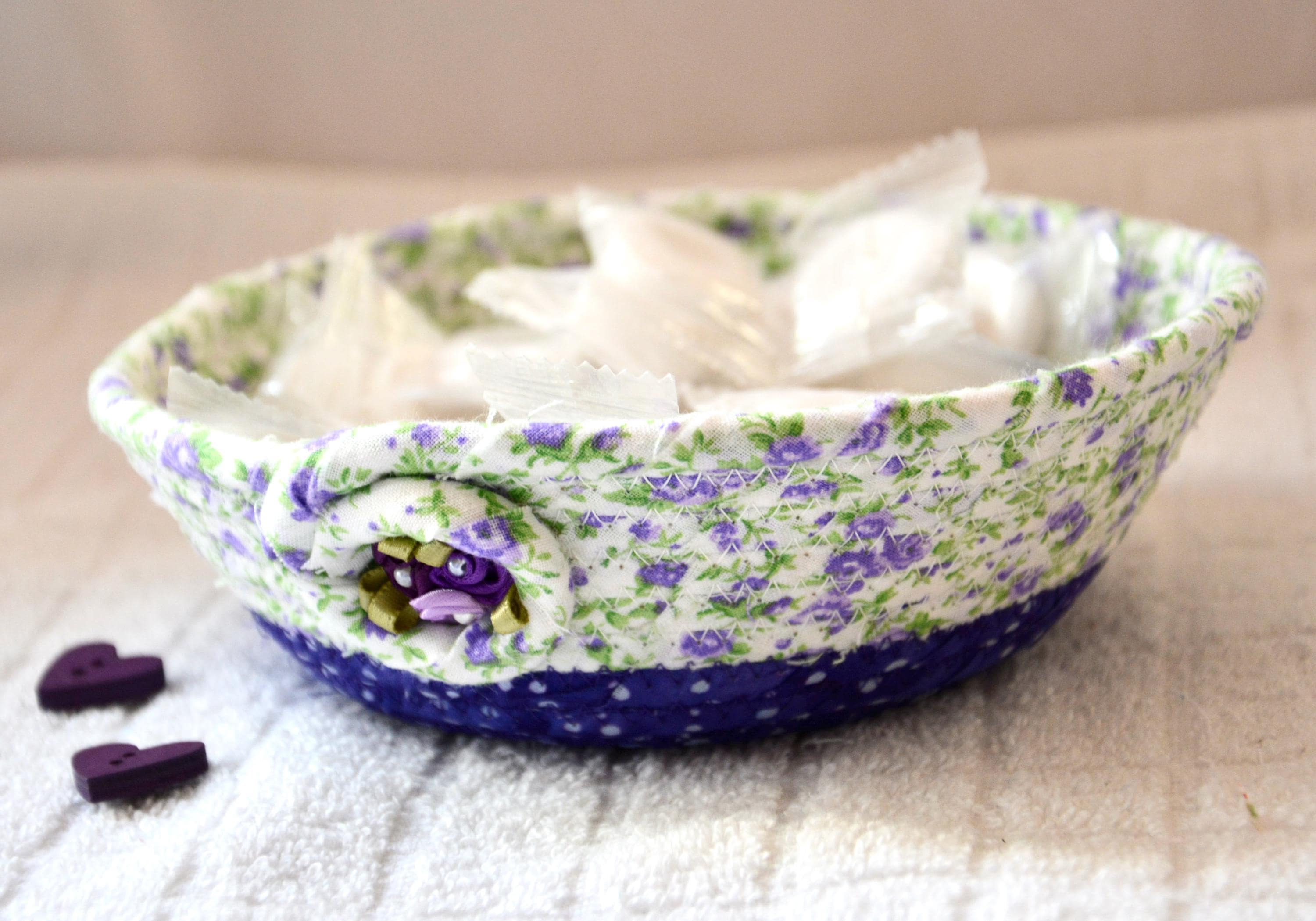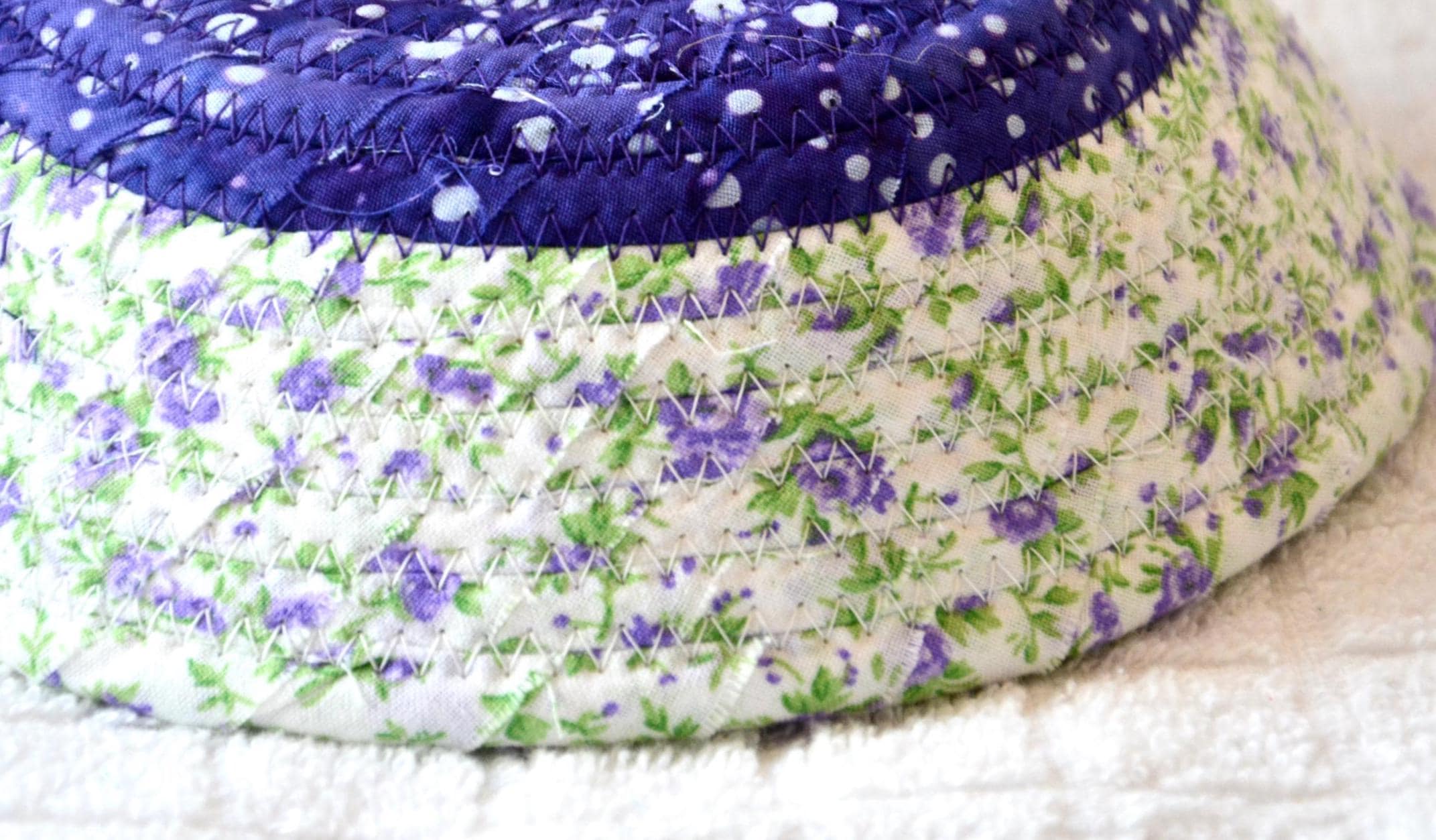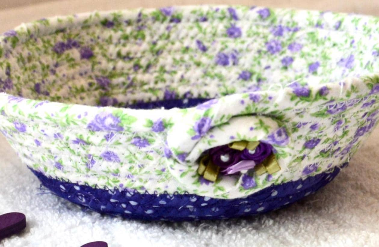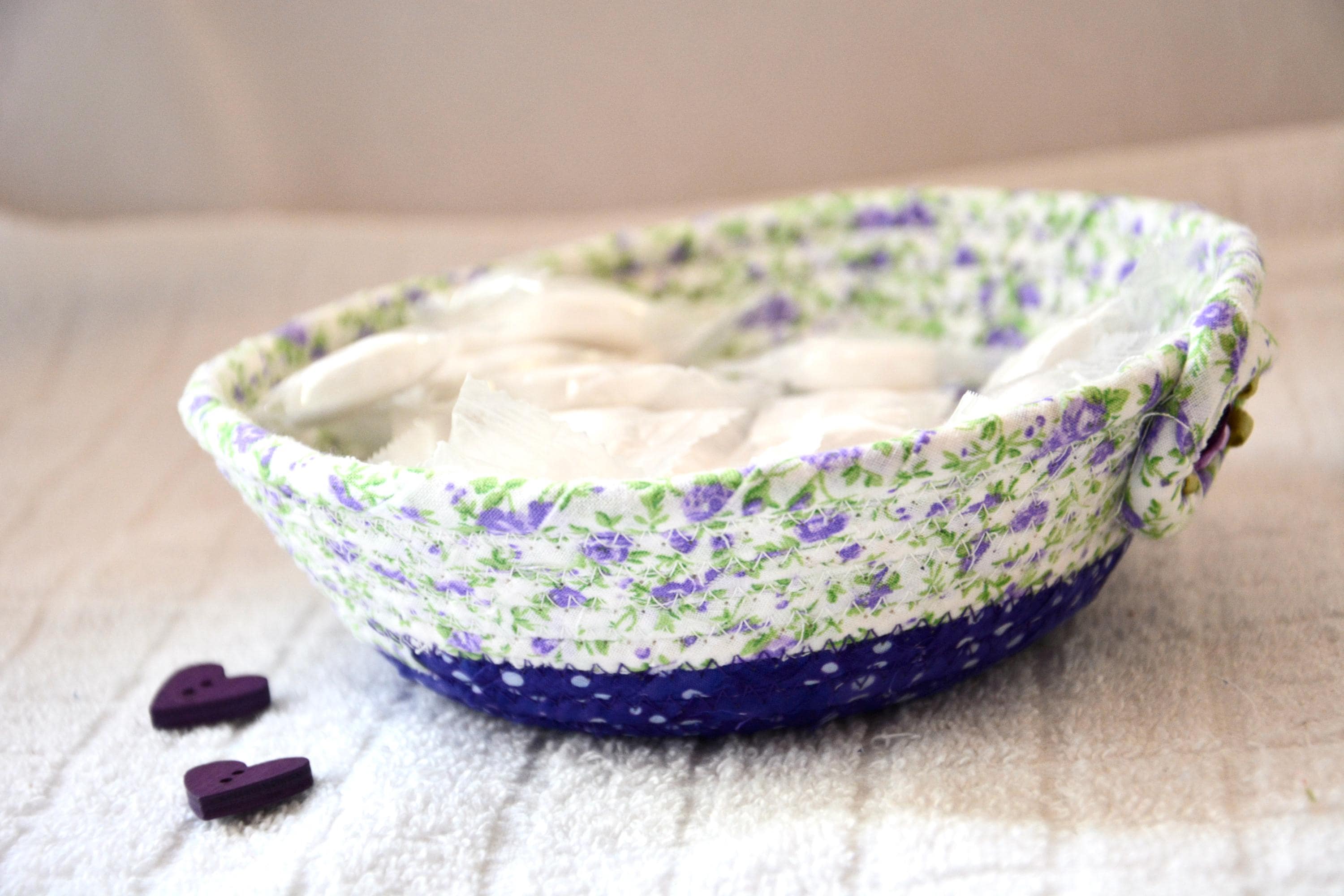 I hand wrapped this lovely purple floral fabric around cotton line, which I then hand coiled and machine quilted to make it sturdy. I used the raw edge technique with a little fray for a great shabby chic texture. I added a lavender floral top fabric for a nice contrast. 100% cotton fabric and shows on the inside of the basket too!