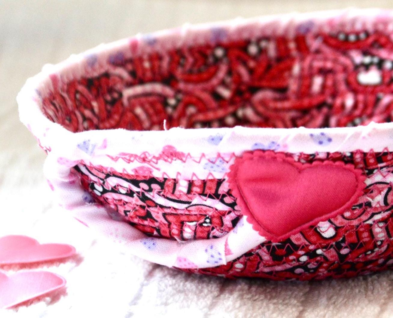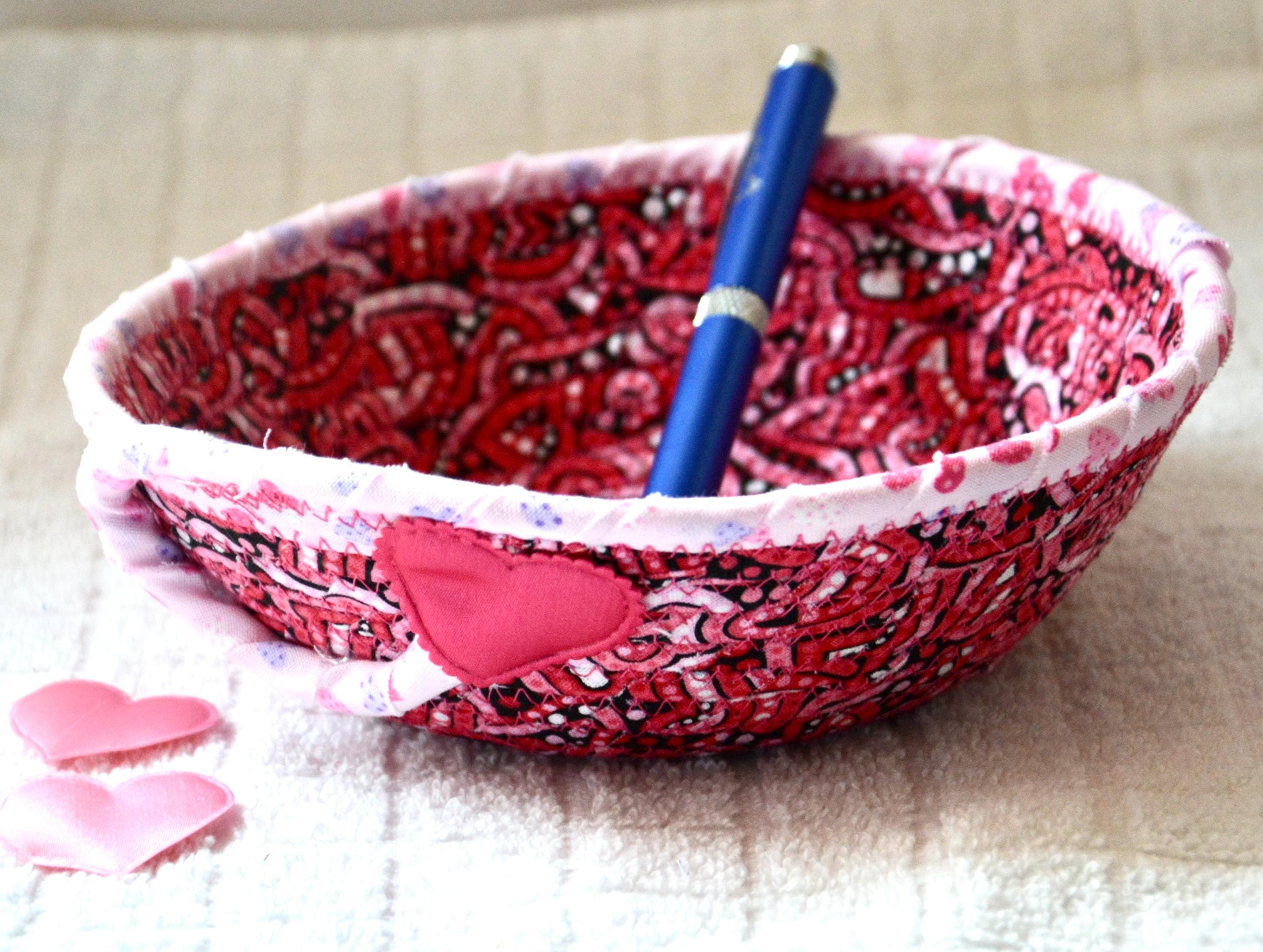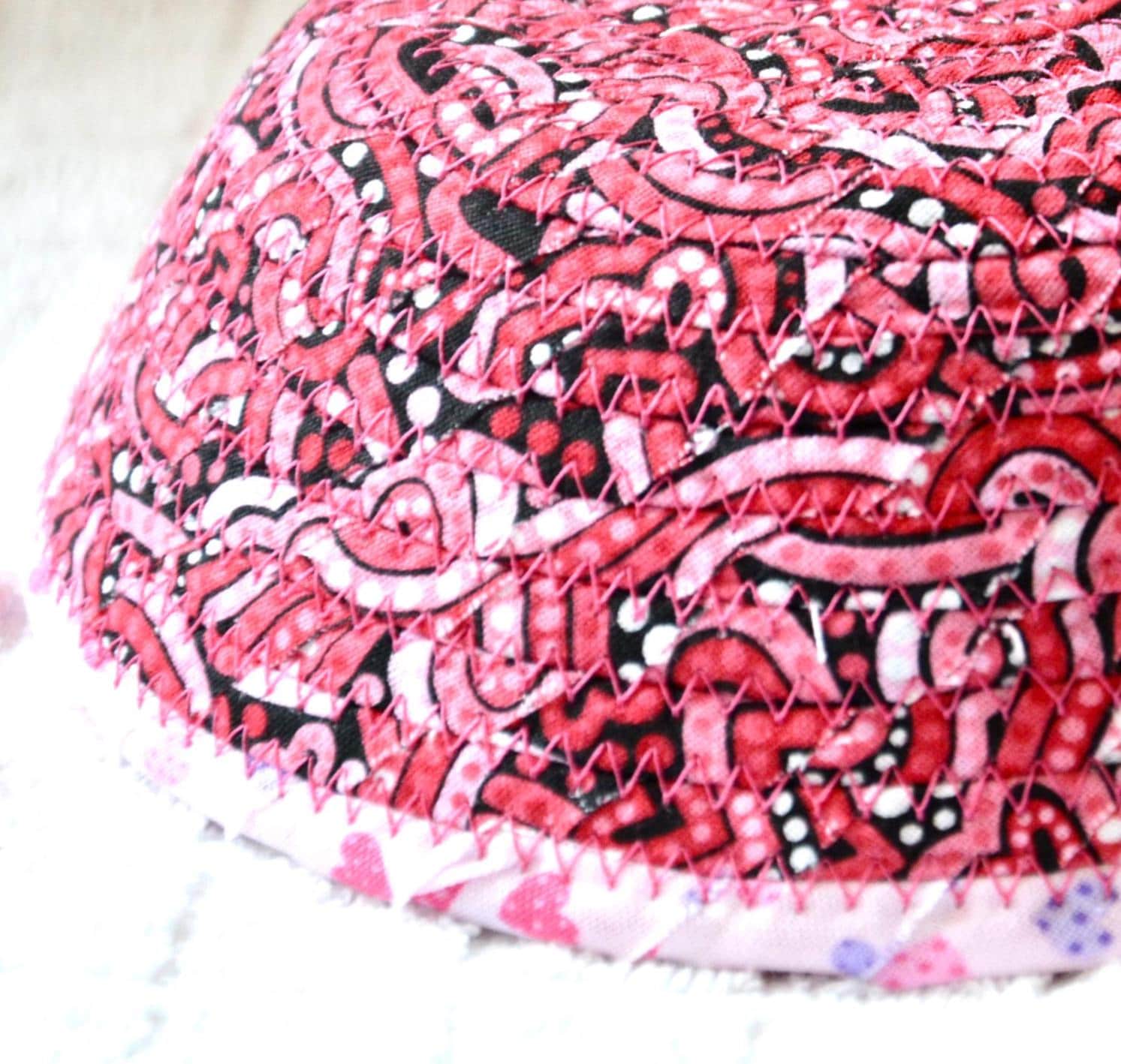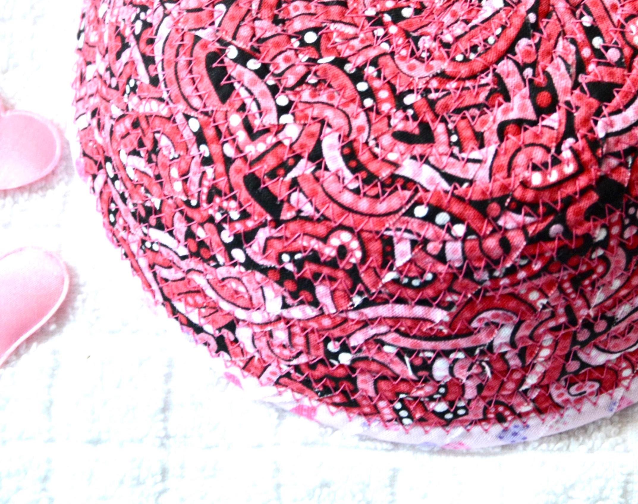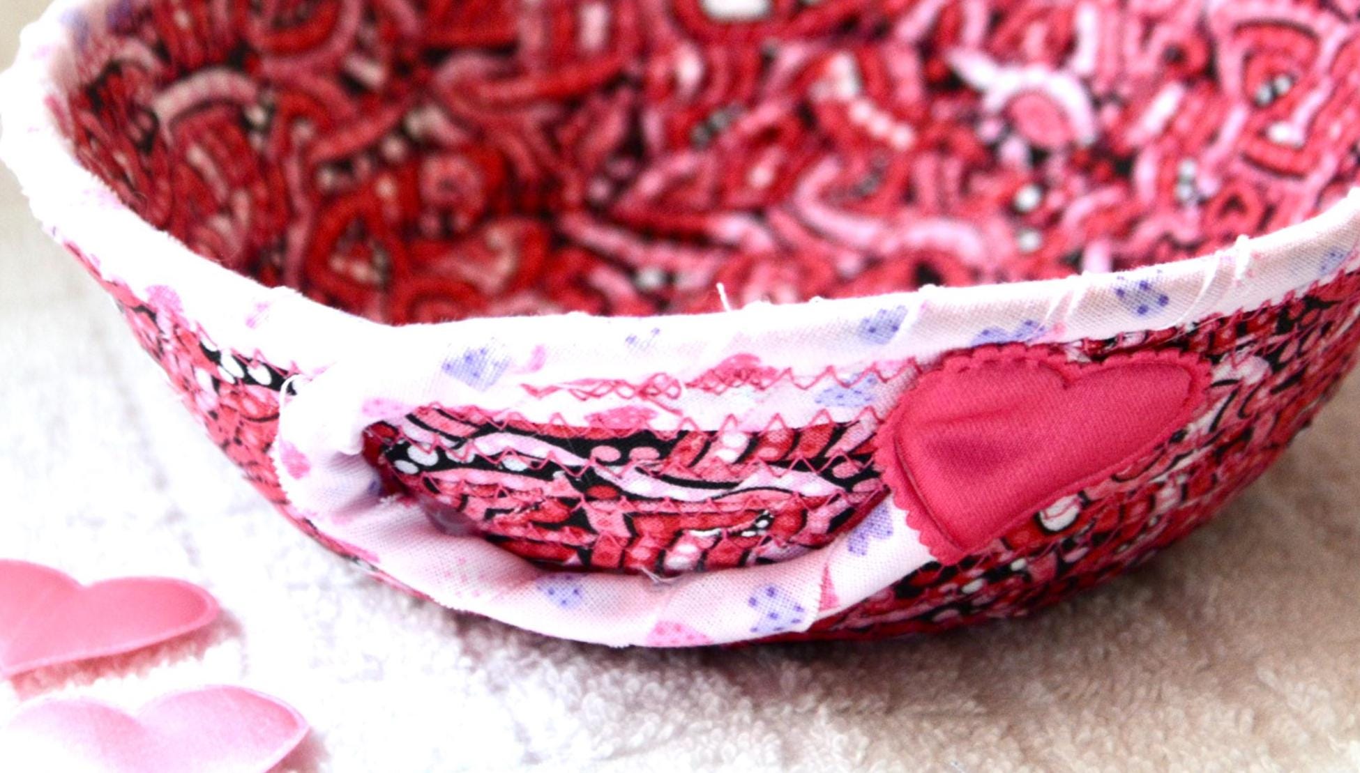 I hand wrapped these wonderful fabrics around cotton line, which I then hand coiled and machine quilted to make the basket sturdy. I used the raw edge technique with some fray to give it a lovely shabby chic texture. The cute heart on the basket is included for a nice accent.