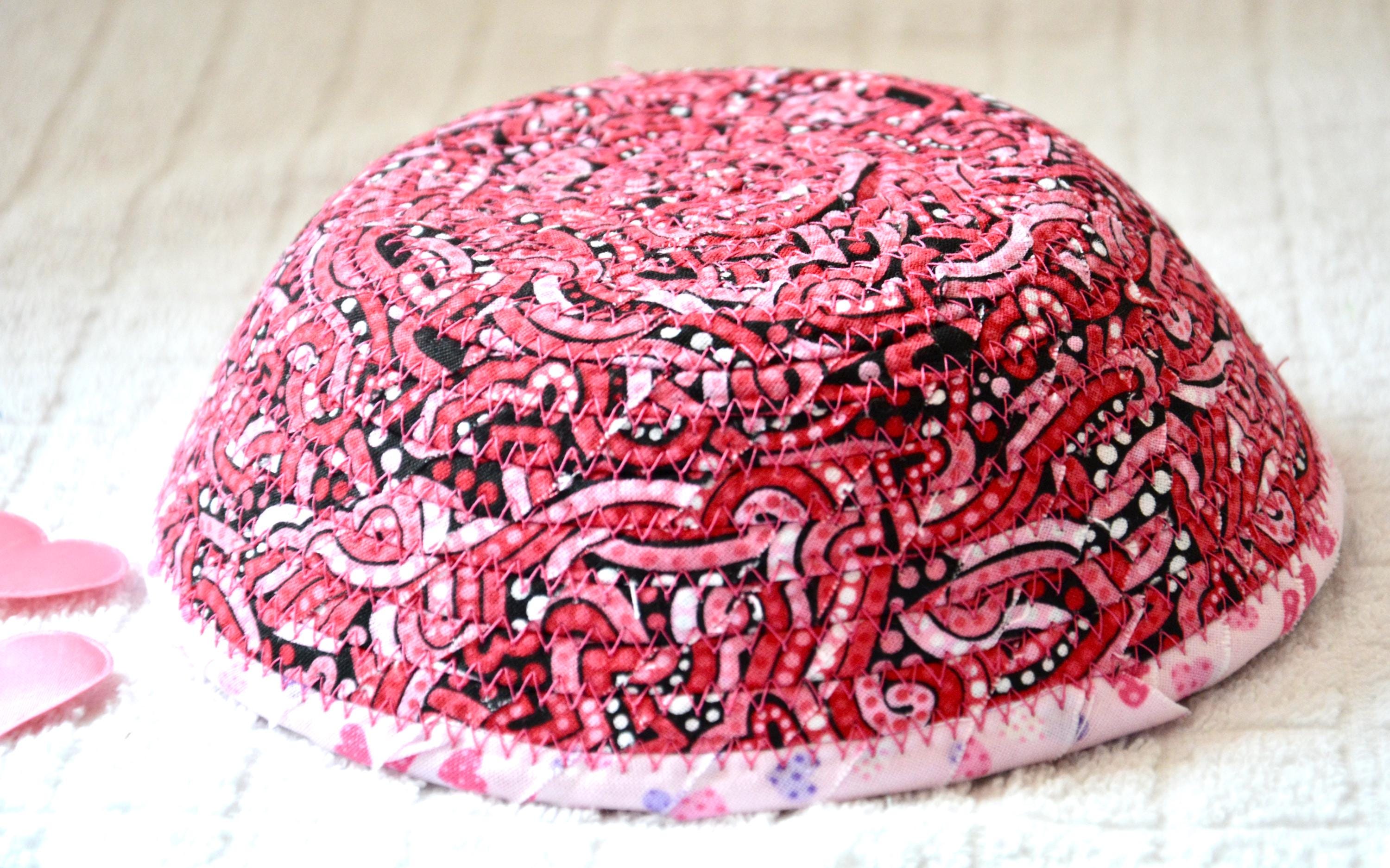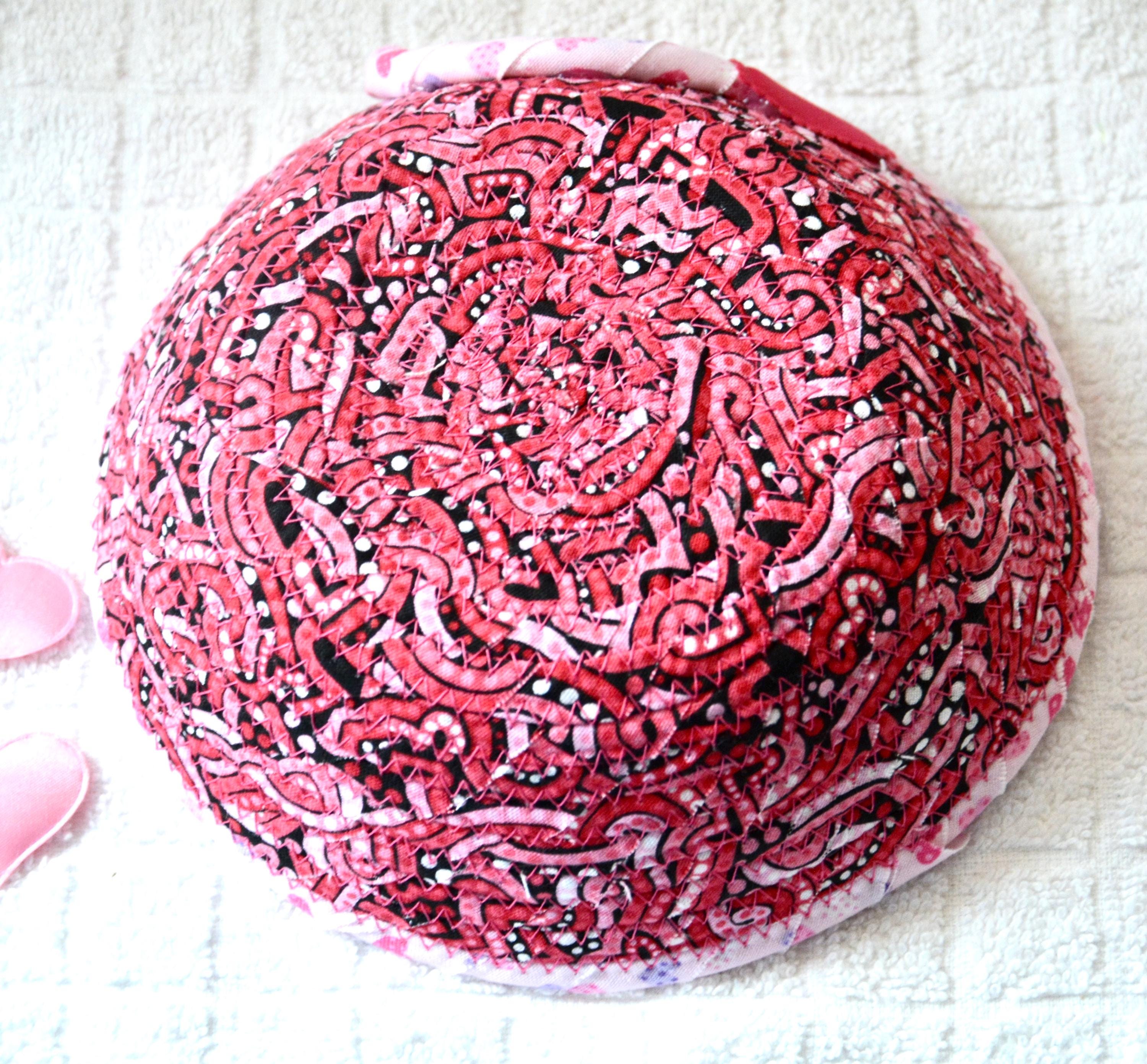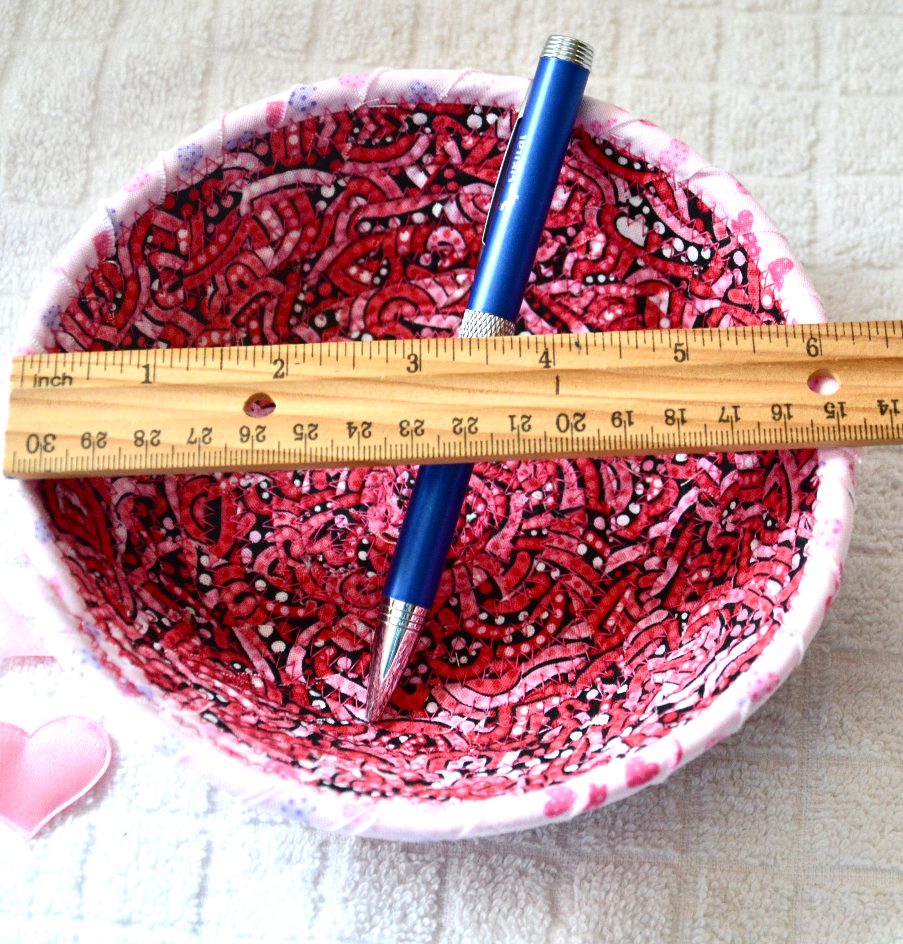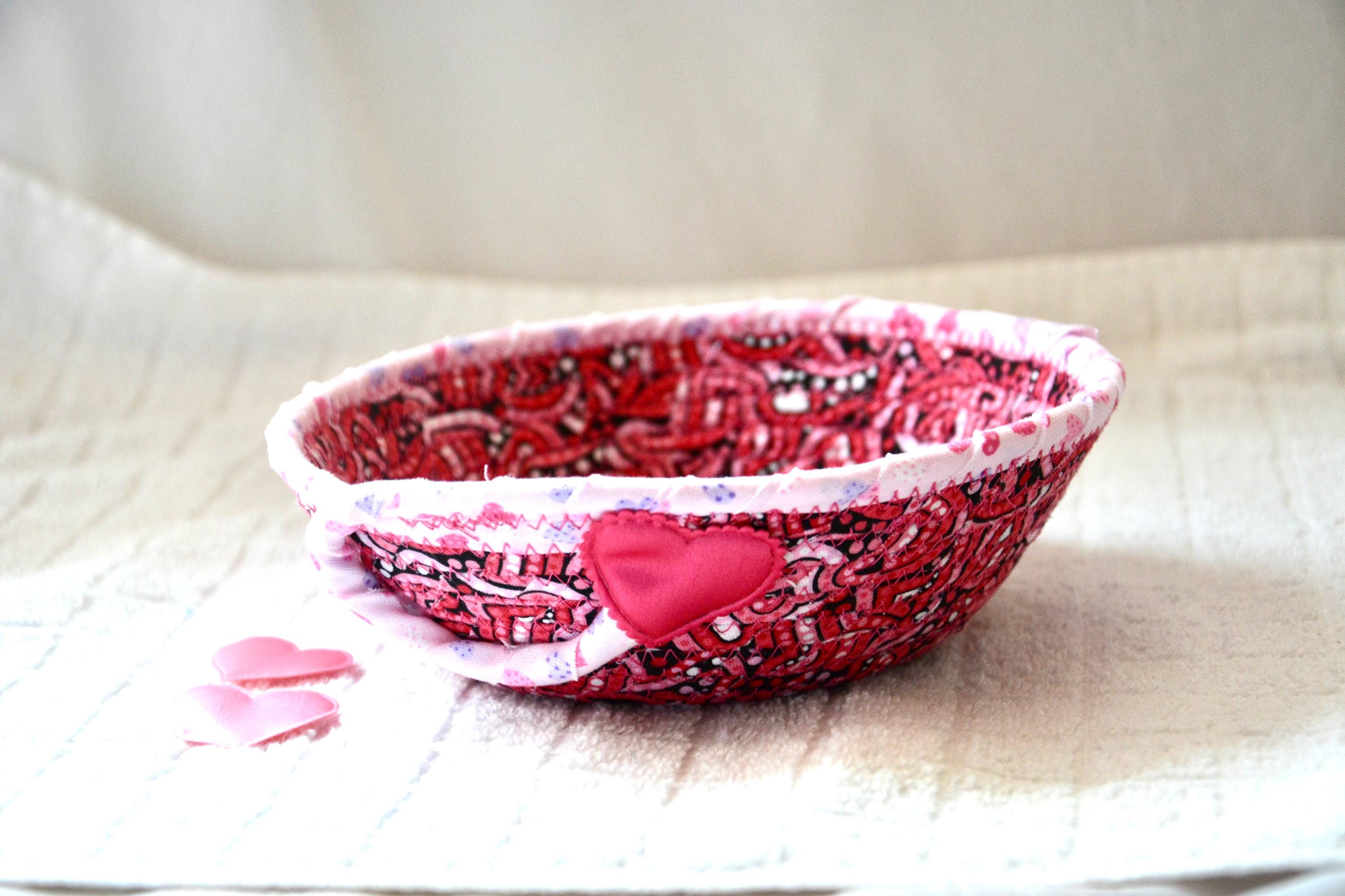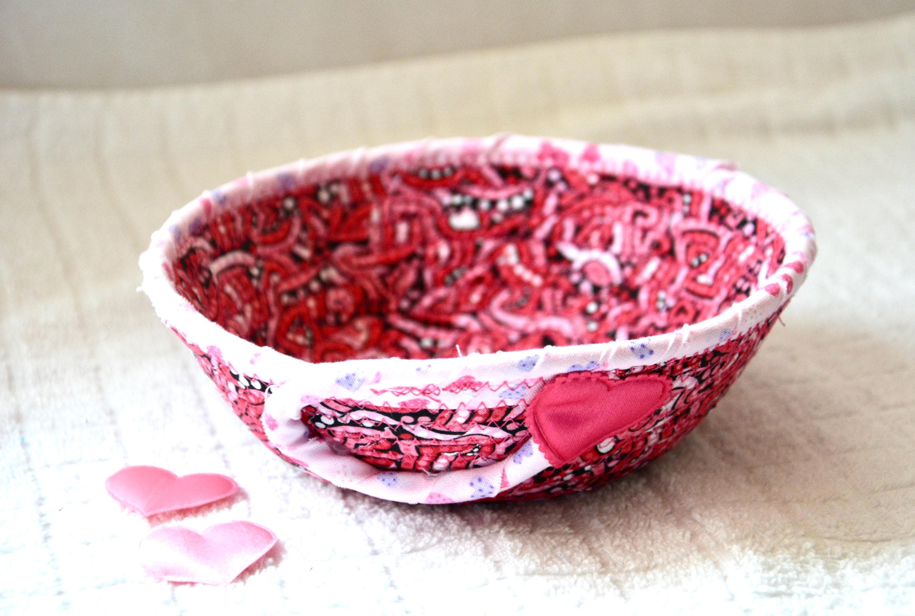 I hand wrapped these wonderful fabrics around cotton line, which I then hand coiled and machine quilted to make the basket sturdy. I used the raw edge technique with some fray to give it a lovely shabby chic texture. The cute heart on the basket is included for a nice accent.