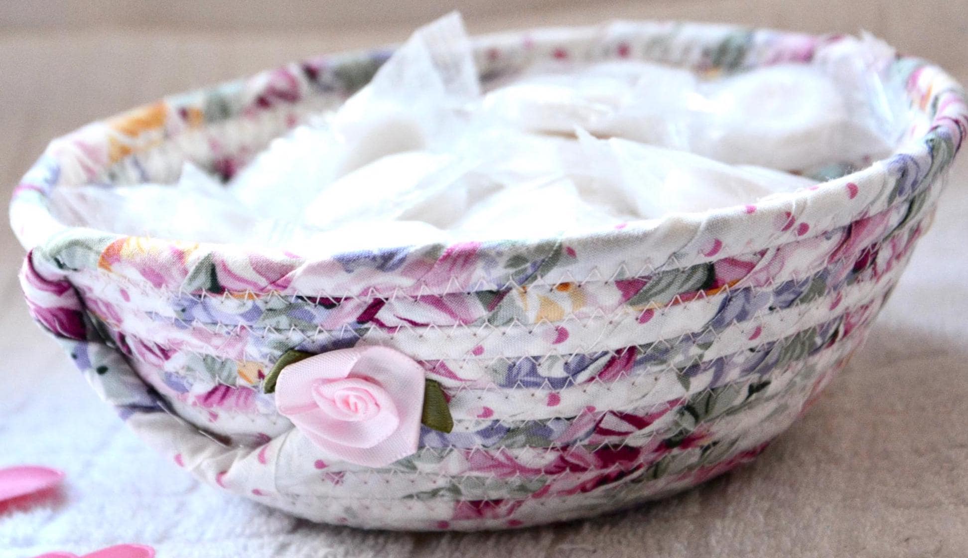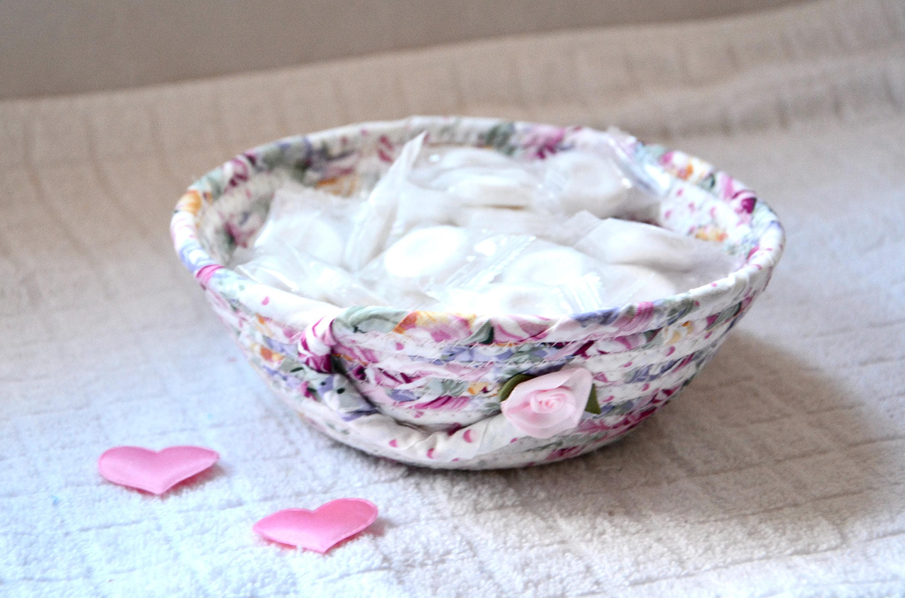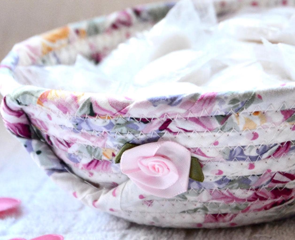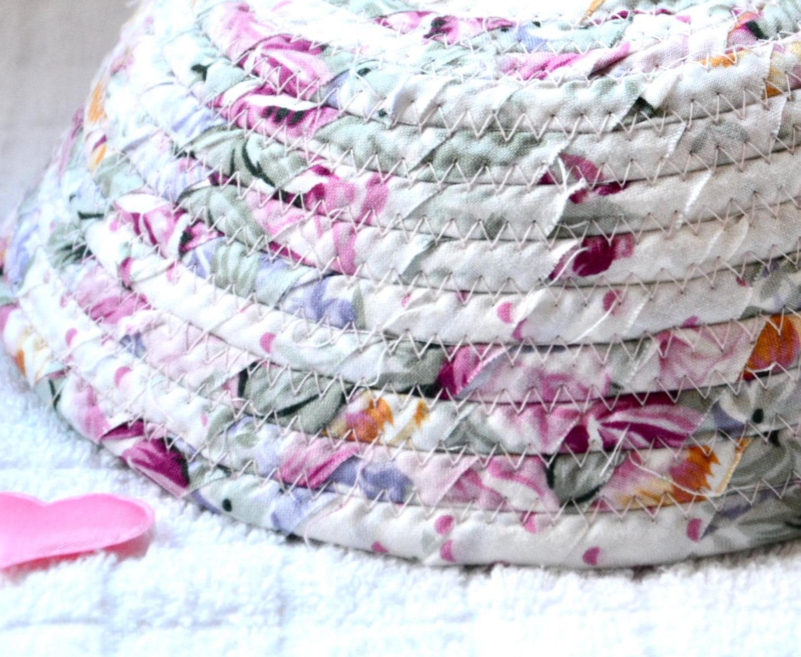 I hand wrapped this lovely floral fabric around cotton line, which I then hand coiled and machine quilted to make it sturdy. I used the raw edge technique with some fray for a great shabby chic texture. The pretty flower on the basket is included for a nice accent. 100% cotton fabric and shows on the inside of the basket too!