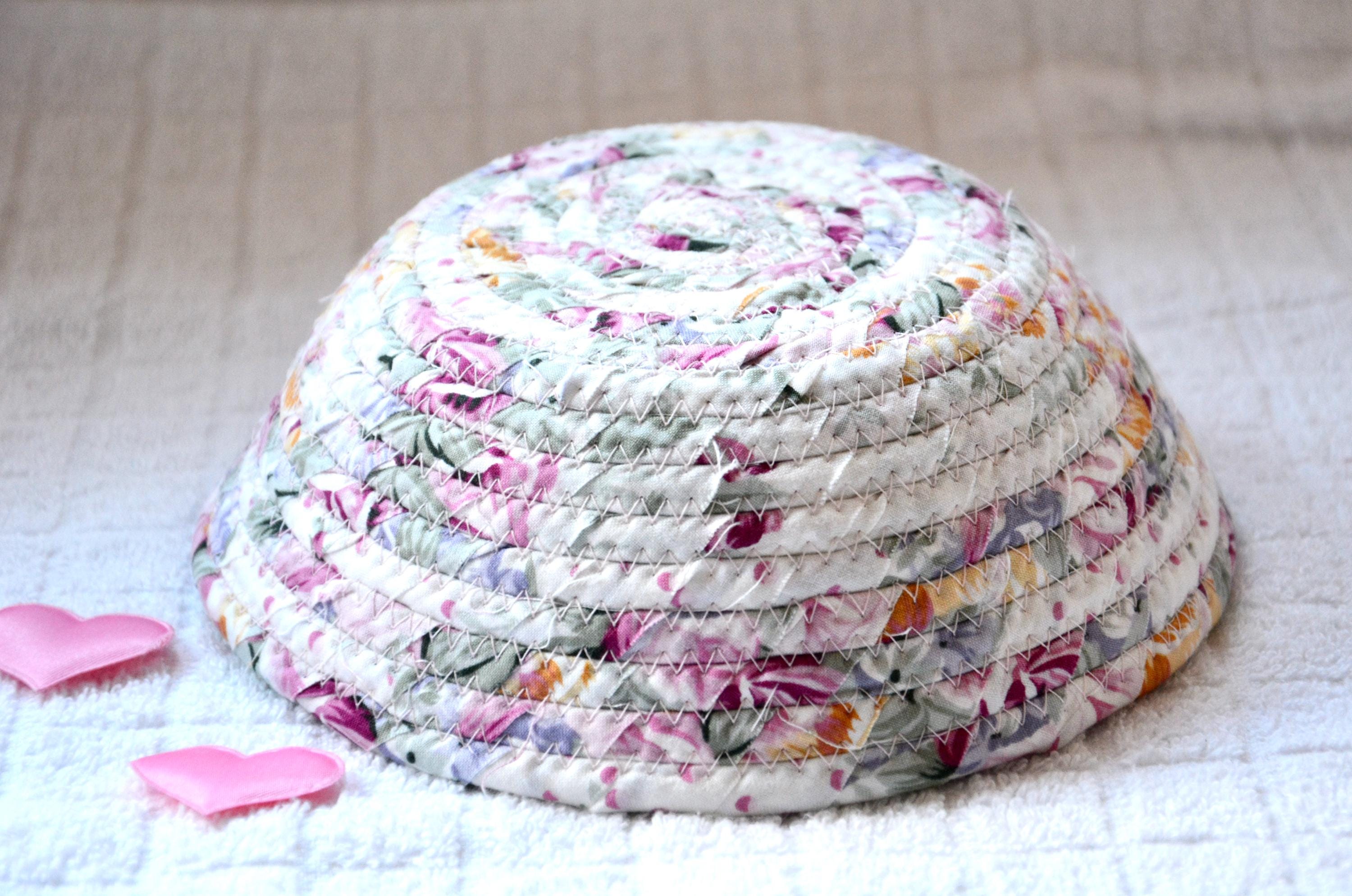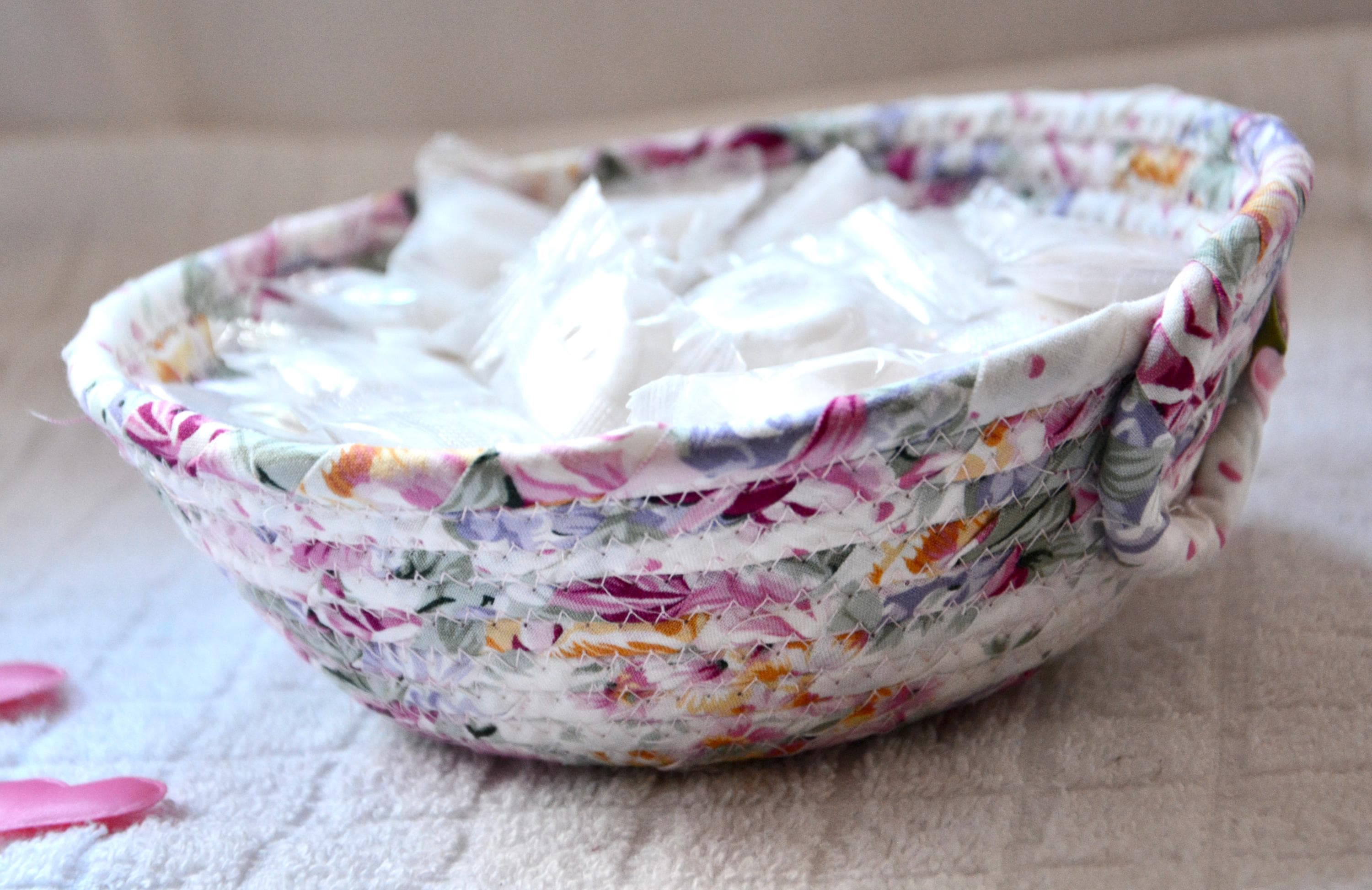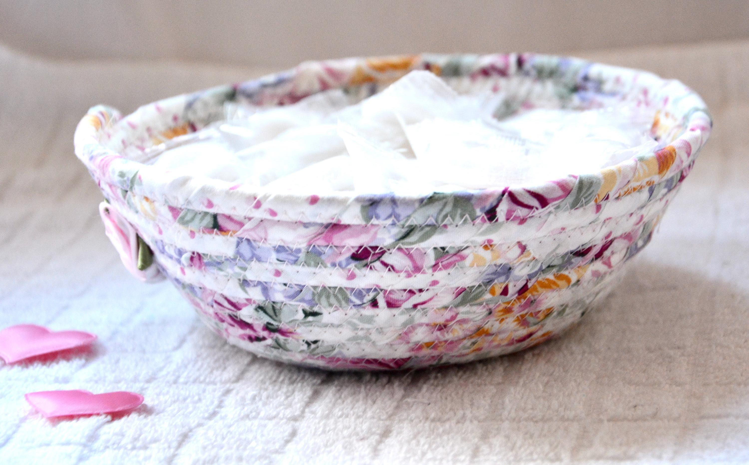 I hand wrapped this lovely floral fabric around cotton line, which I then hand coiled and machine quilted to make it sturdy. I used the raw edge technique with some fray for a great shabby chic texture. The pretty flower on the basket is included for a nice accent. 100% cotton fabric and shows on the inside of the basket too!