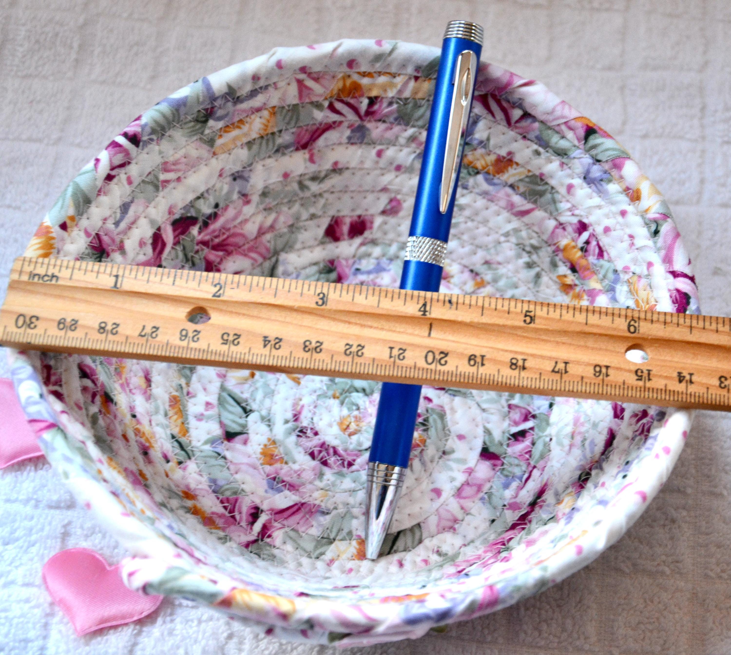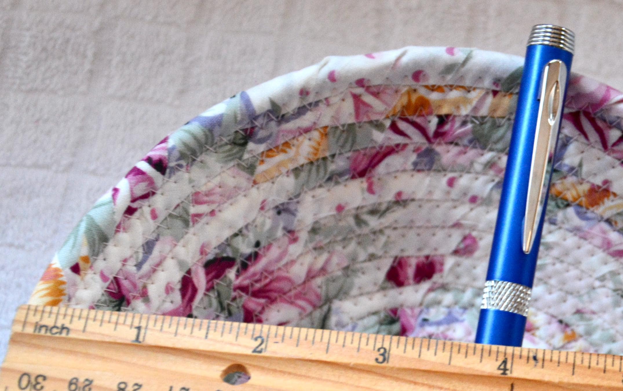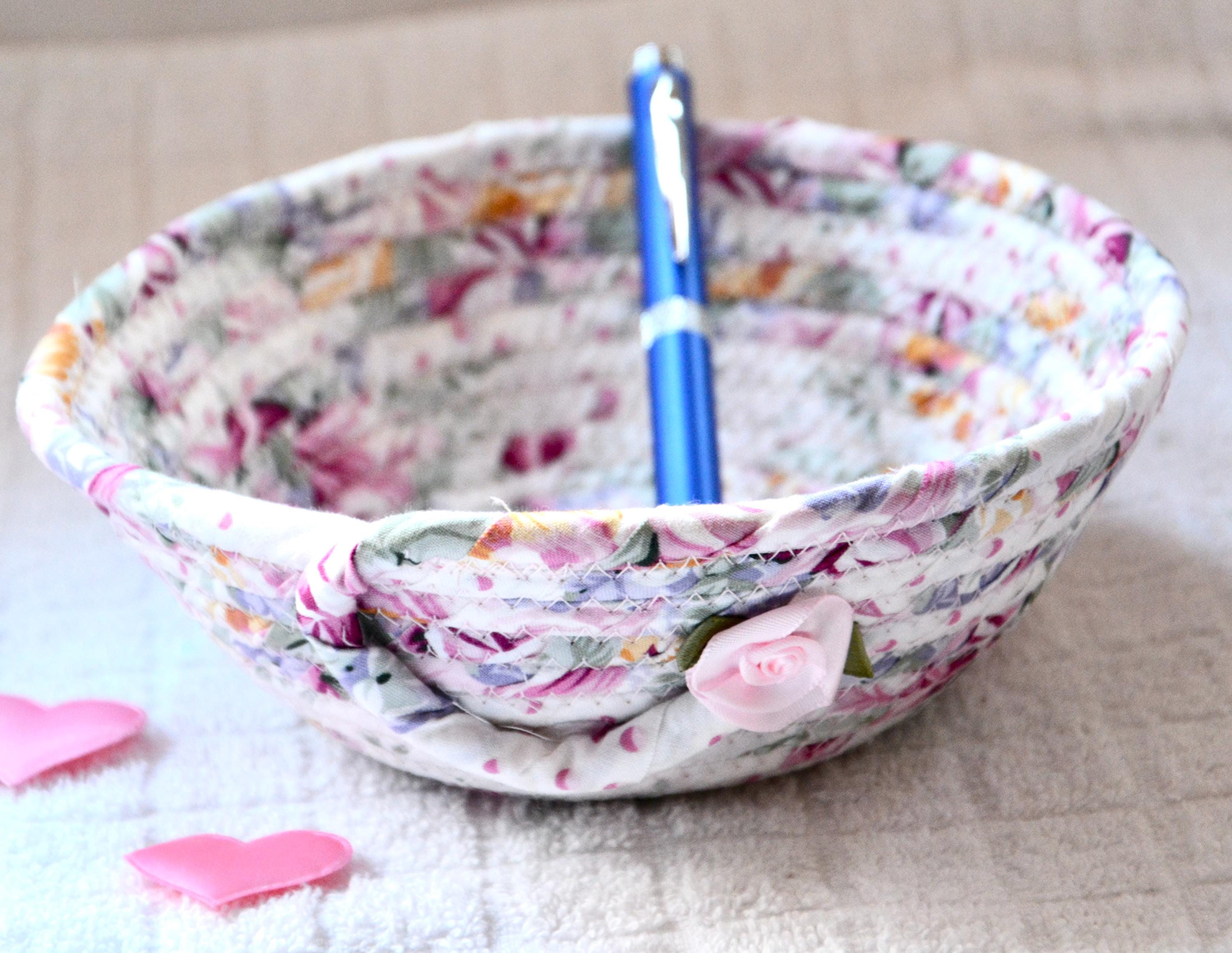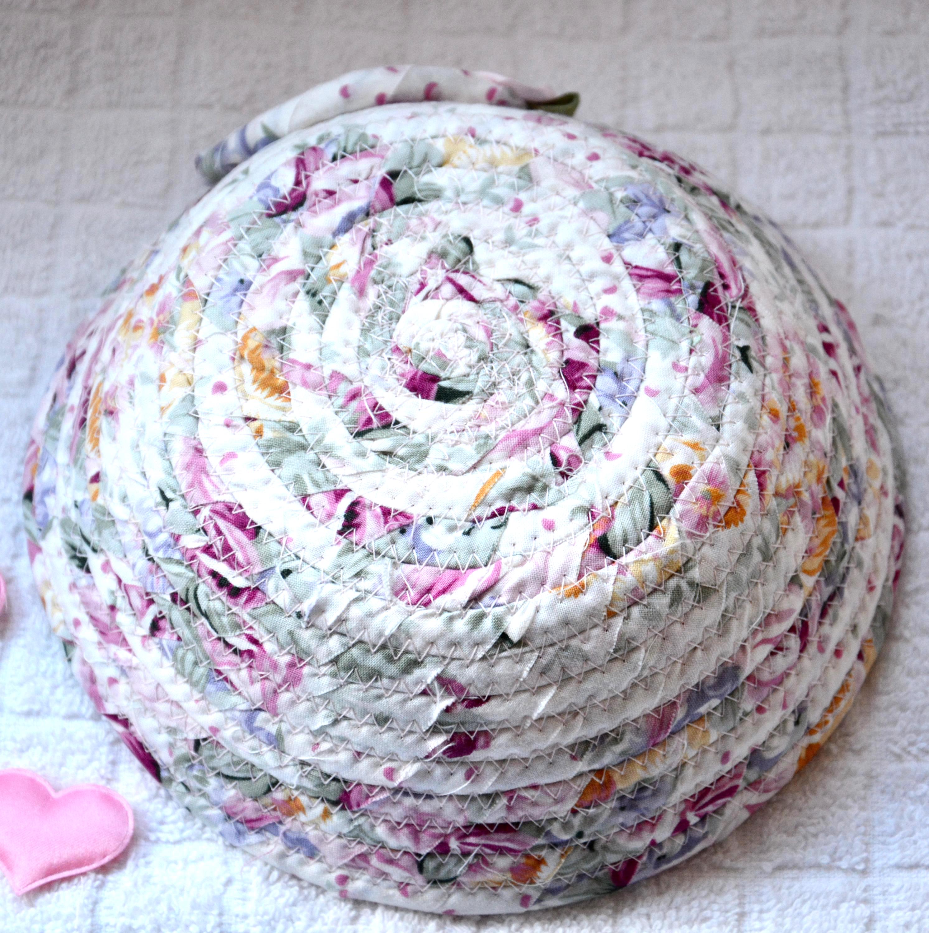 I hand wrapped this lovely floral fabric around cotton line, which I then hand coiled and machine quilted to make it sturdy. I used the raw edge technique with some fray for a great shabby chic texture. The pretty flower on the basket is included for a nice accent. 100% cotton fabric and shows on the inside of the basket too!