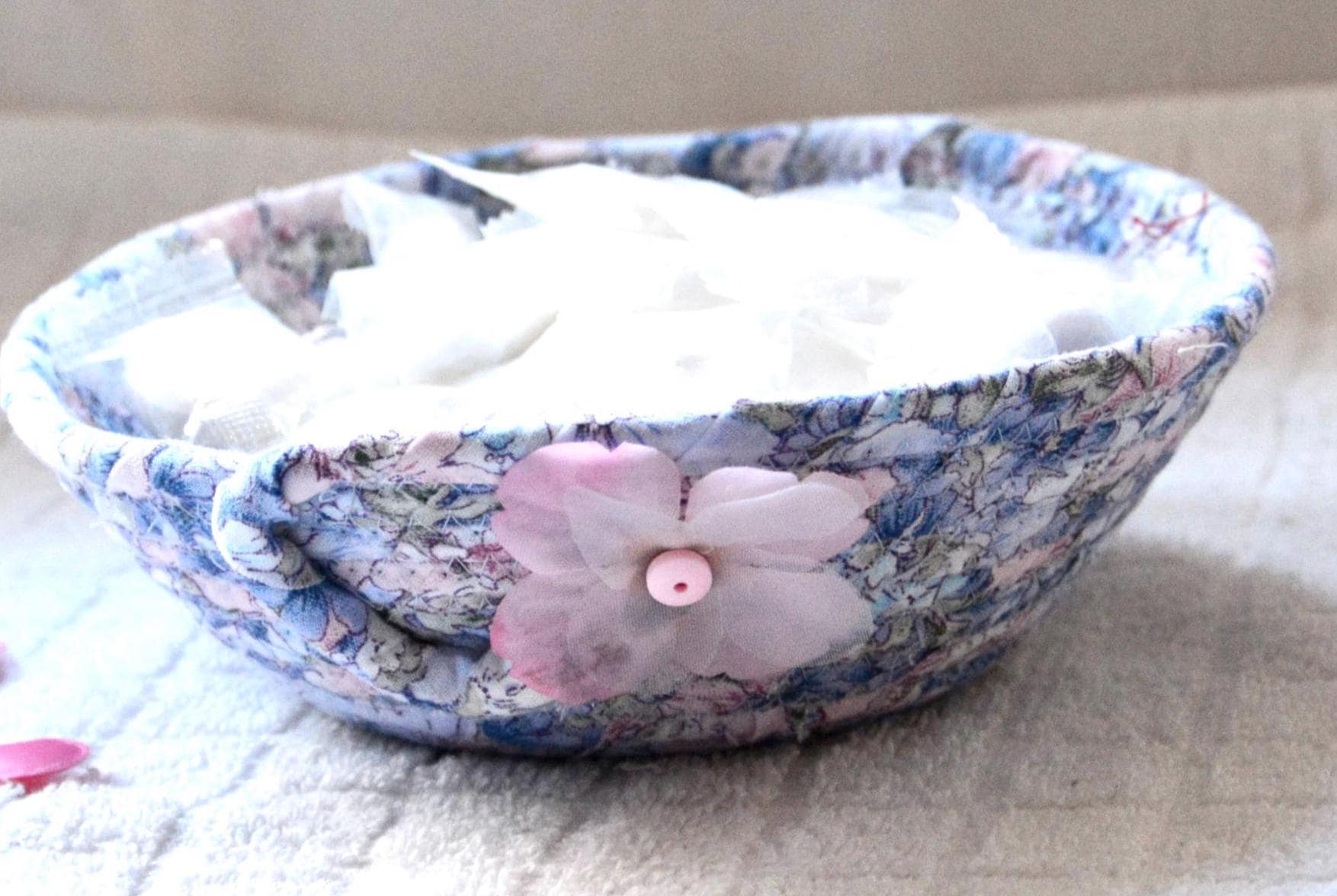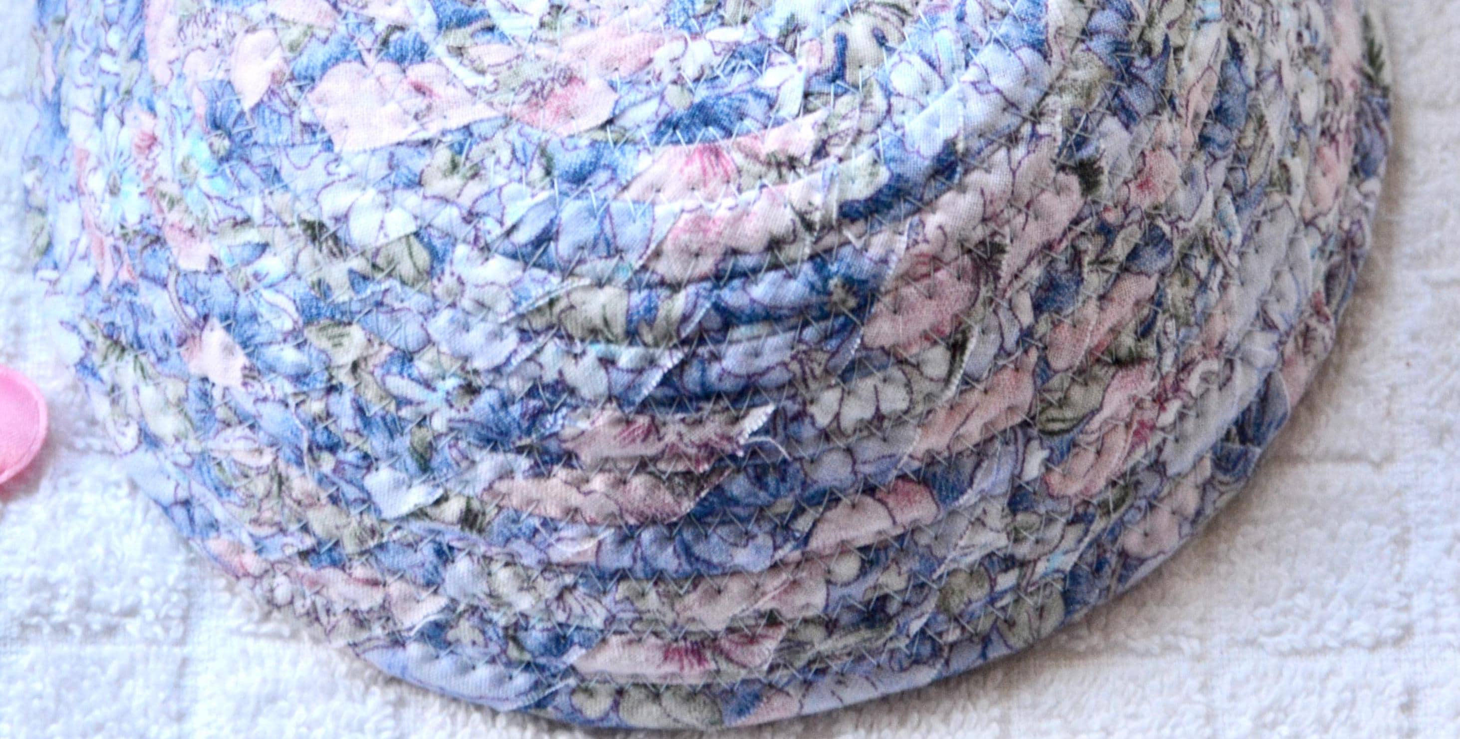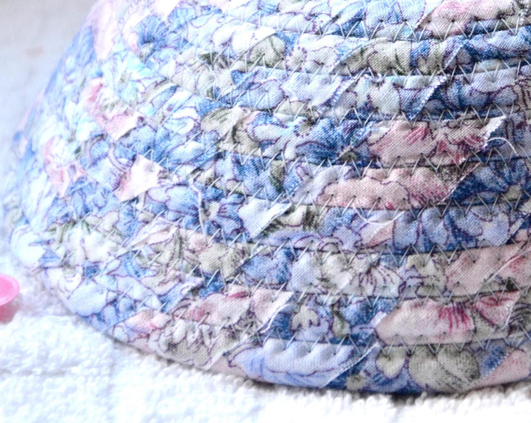 I hand wrapped this lovely blue floral fabric around cotton line, which I then hand coiled and machine quilted to make it sturdy. I used the raw edge technique with some fray adding a nice shabby chic texture.