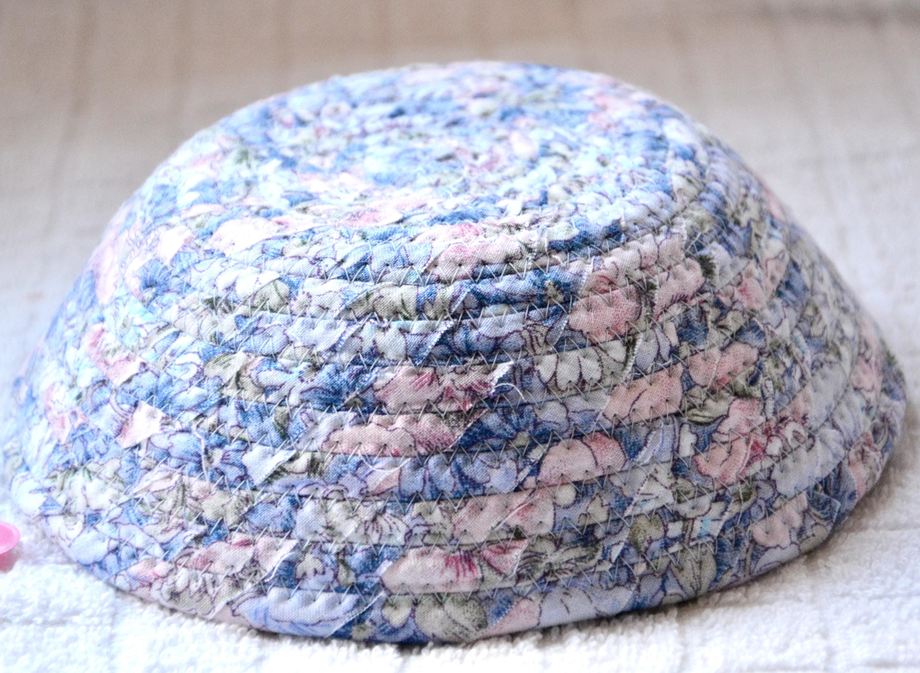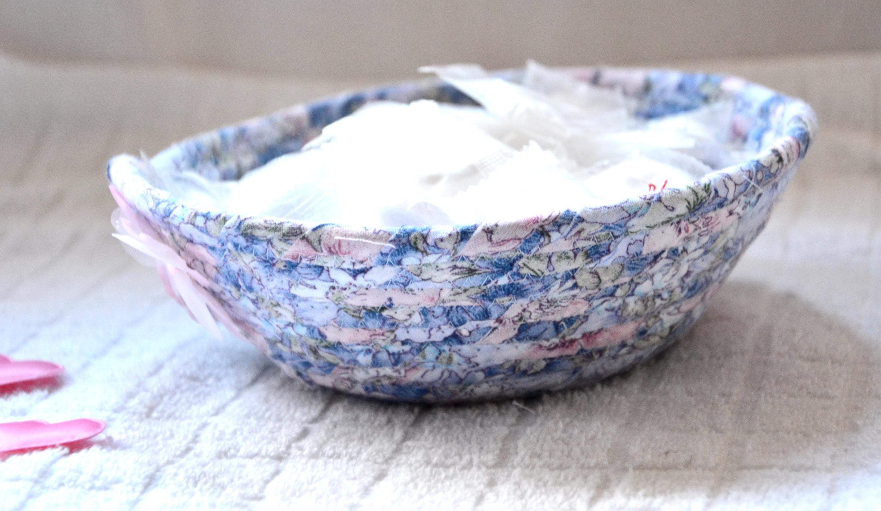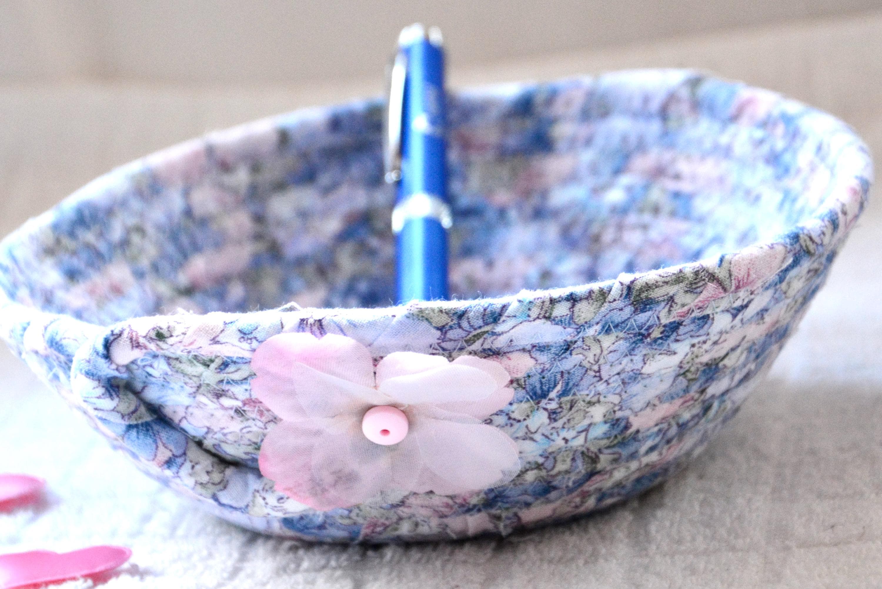 I hand wrapped this lovely blue floral fabric around cotton line, which I then hand coiled and machine quilted to make it sturdy. I used the raw edge technique with some fray adding a nice shabby chic texture.