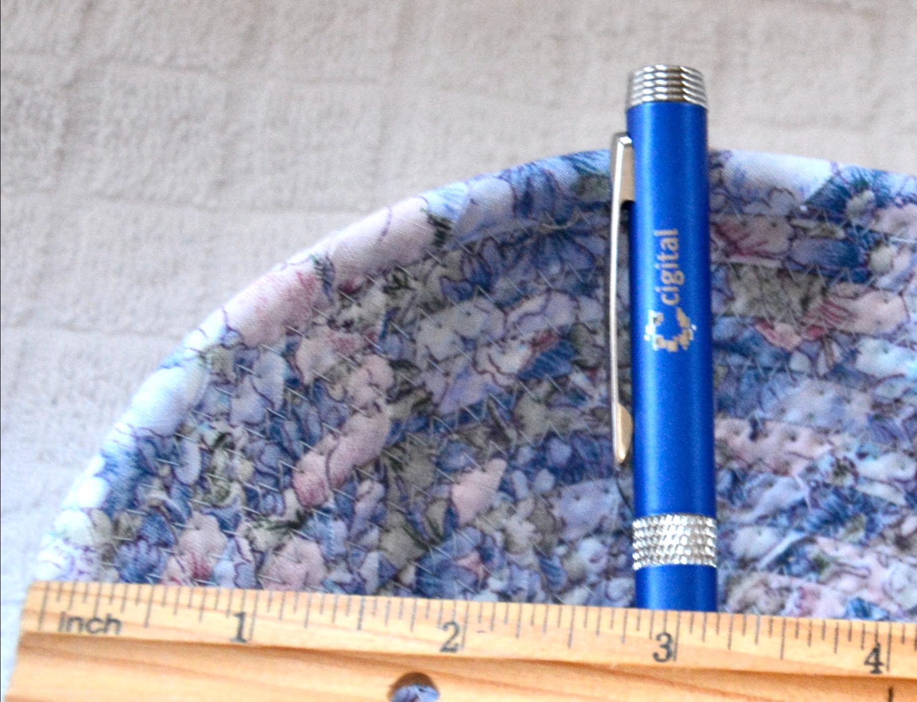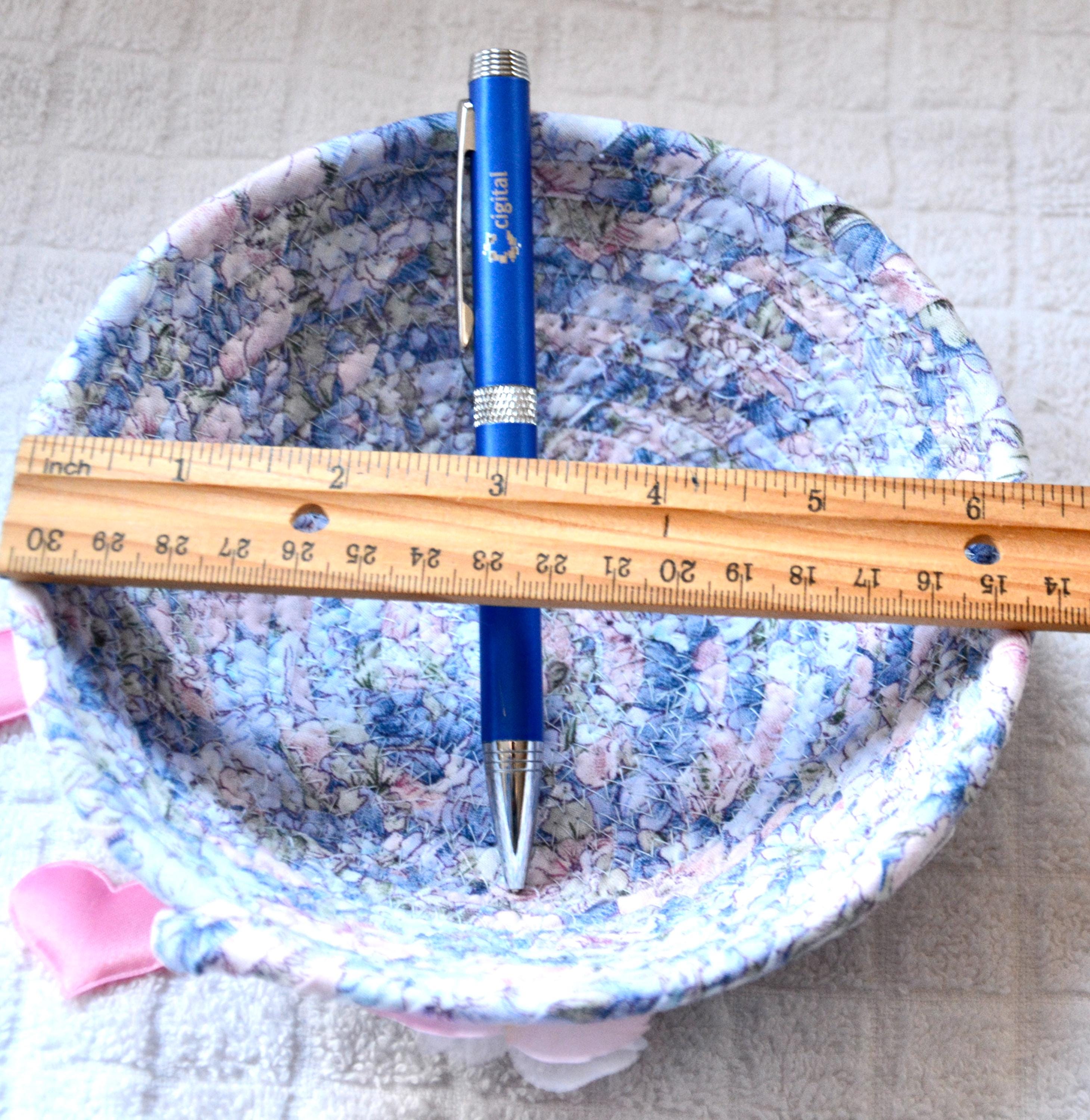 I just love this floral fabric, 100% cotton and it shows on the inside of the basket too! The cute flower on the basket is included for a nice accent. Flower, bead, ruler, pen props not included.