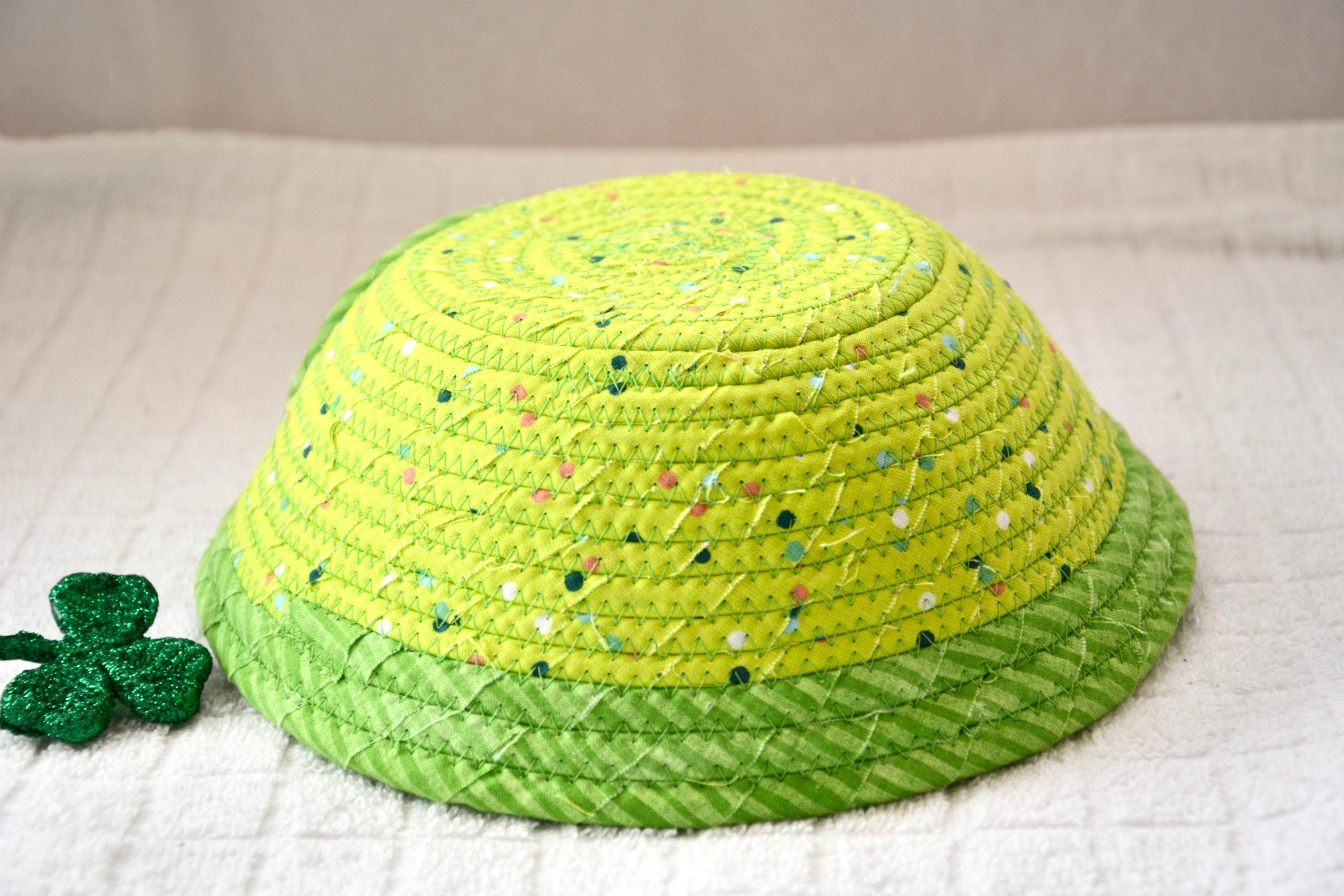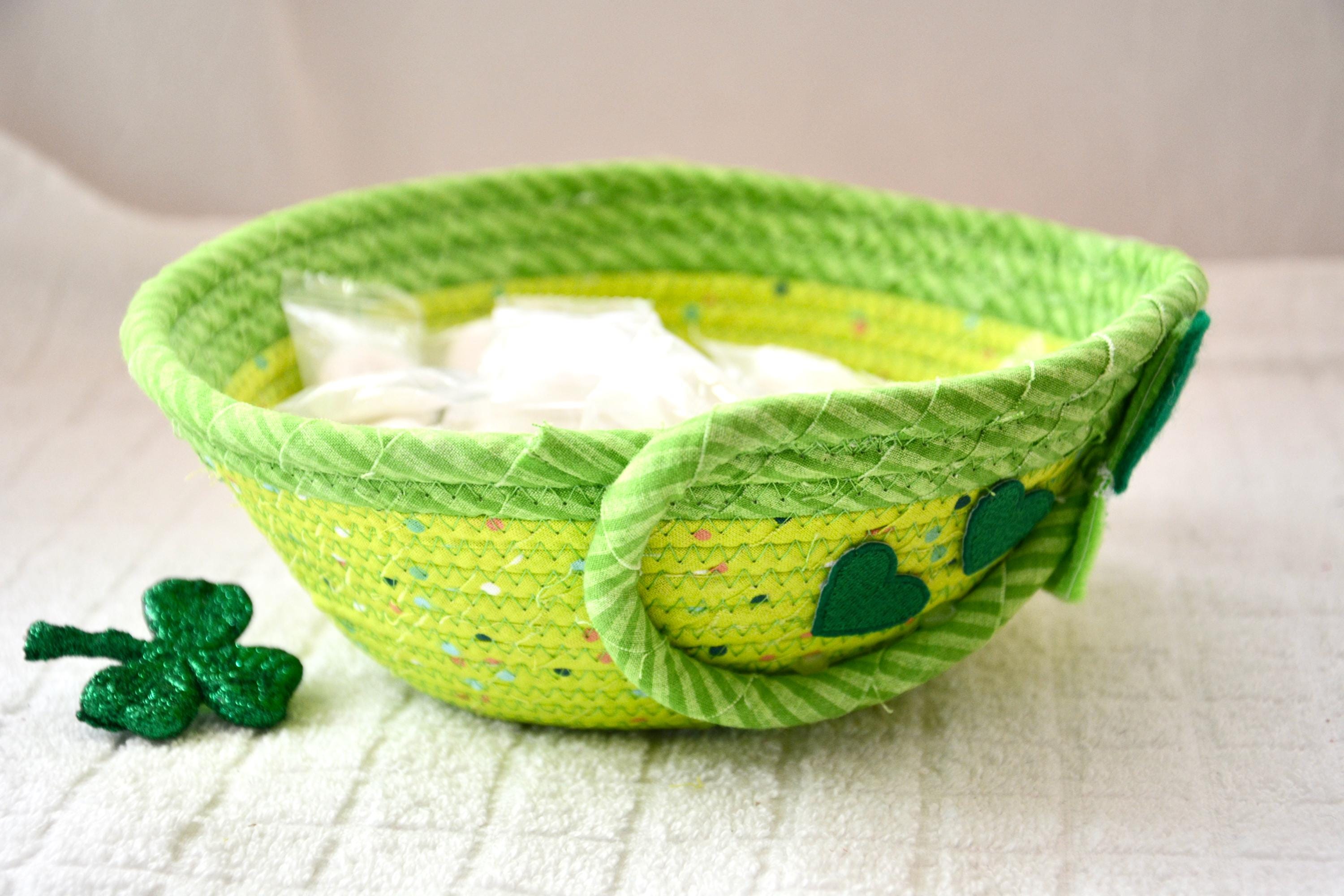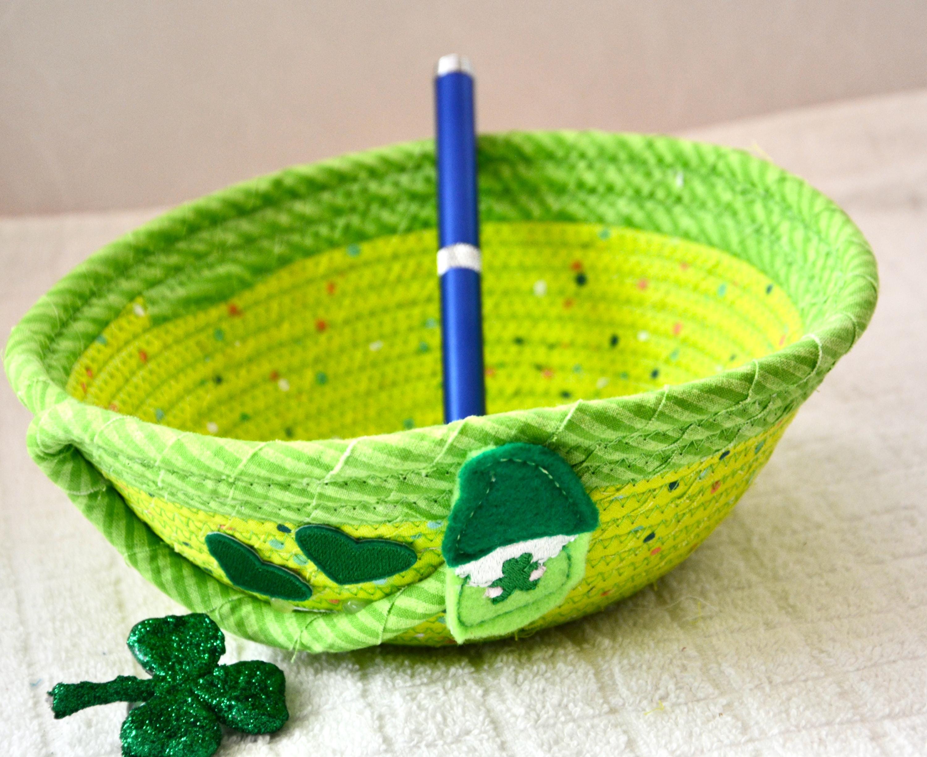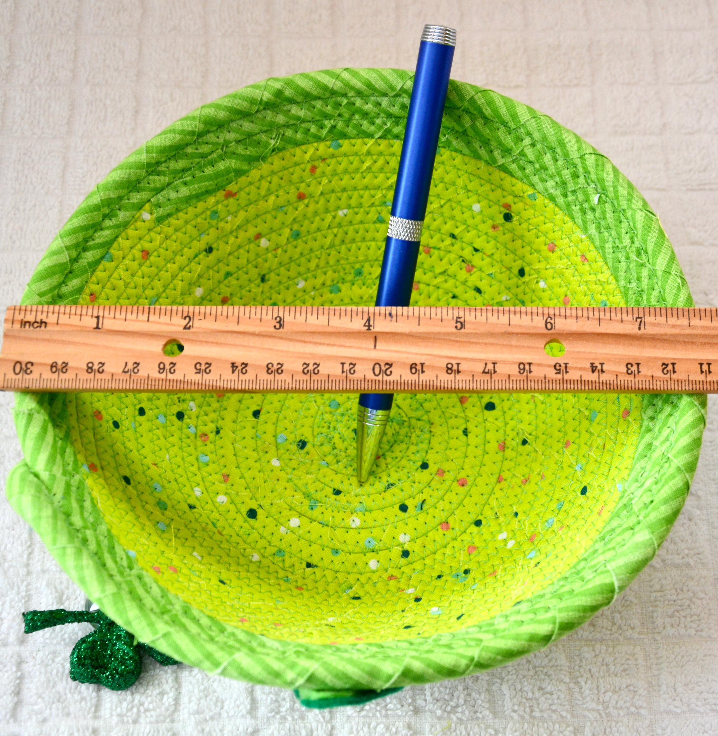 I hand wrapped these wonderful green fabrics around cotton line, which I then hand coiled and machine quilted to make the basket sturdy. I used the raw edge technique with some fray to give it a lovely shabby chic texture. The cute GNOME and green hearts on the basket are included for a nice accent. These fun fabrics are 100% cotton and show on the inside of the basket too! Please see the picture with the pen and ruler to help gauge the size of this lovely basket. Spot clean. Bead, shamrock, candy, pen, ruler props not included.