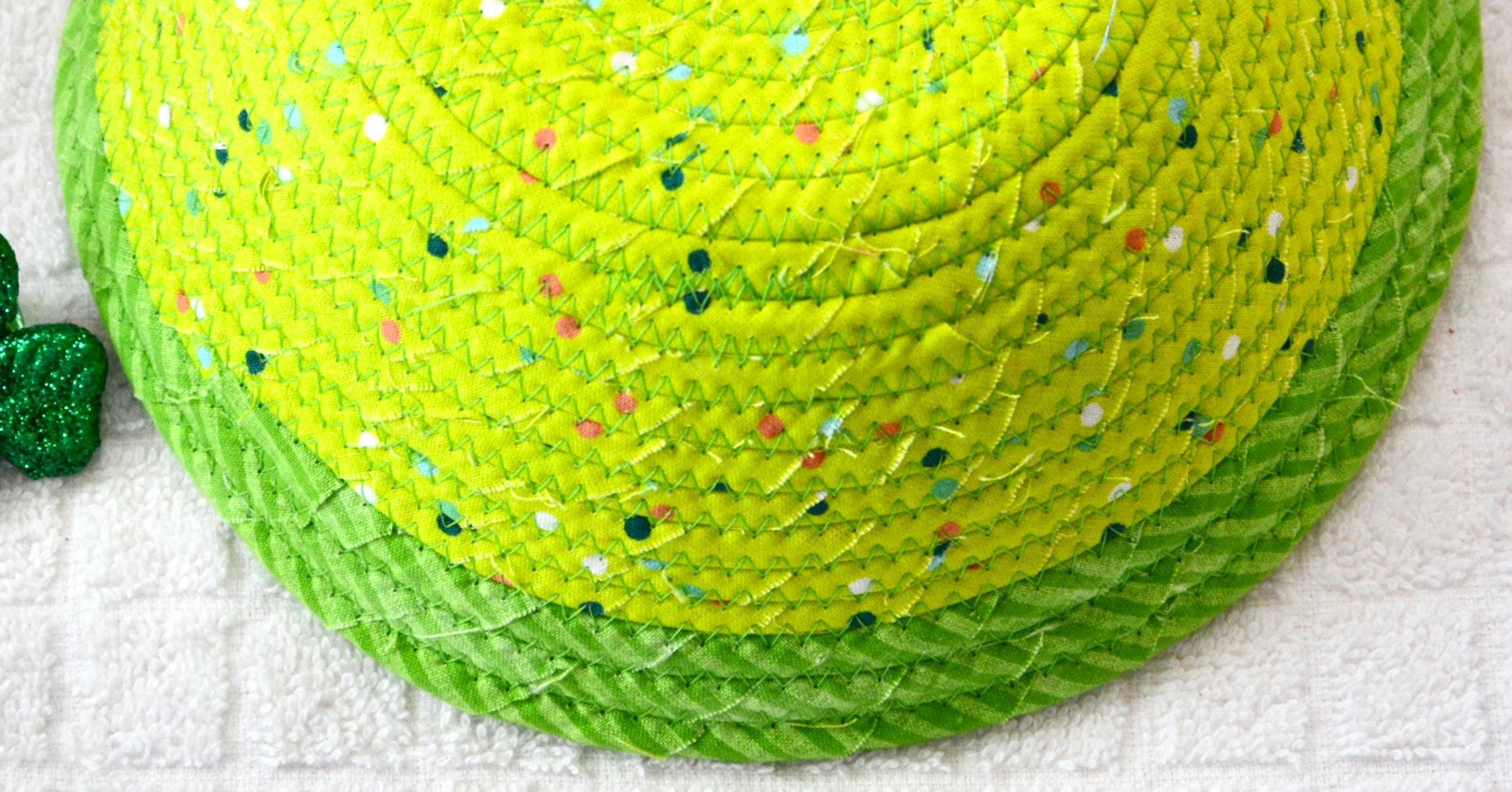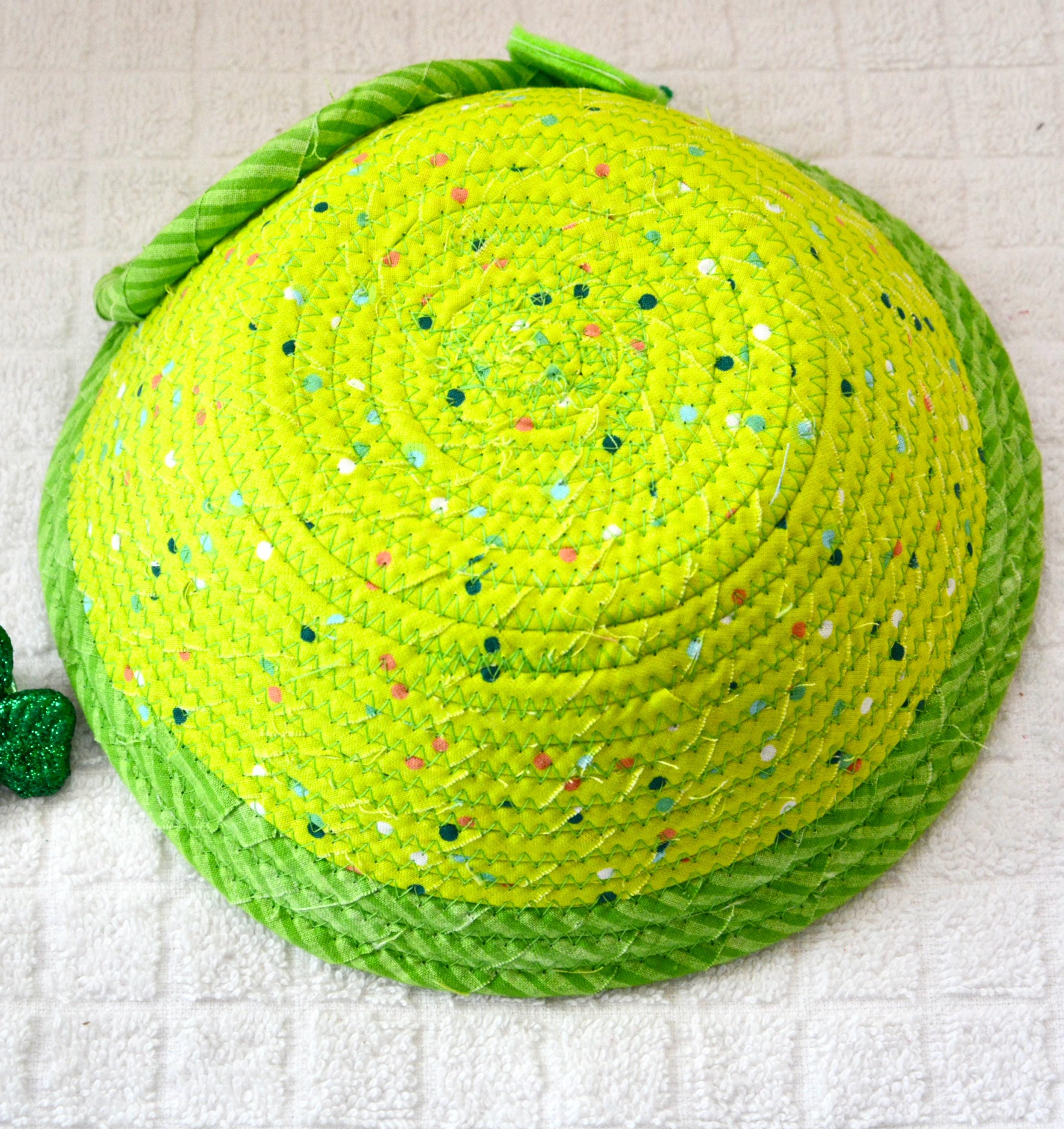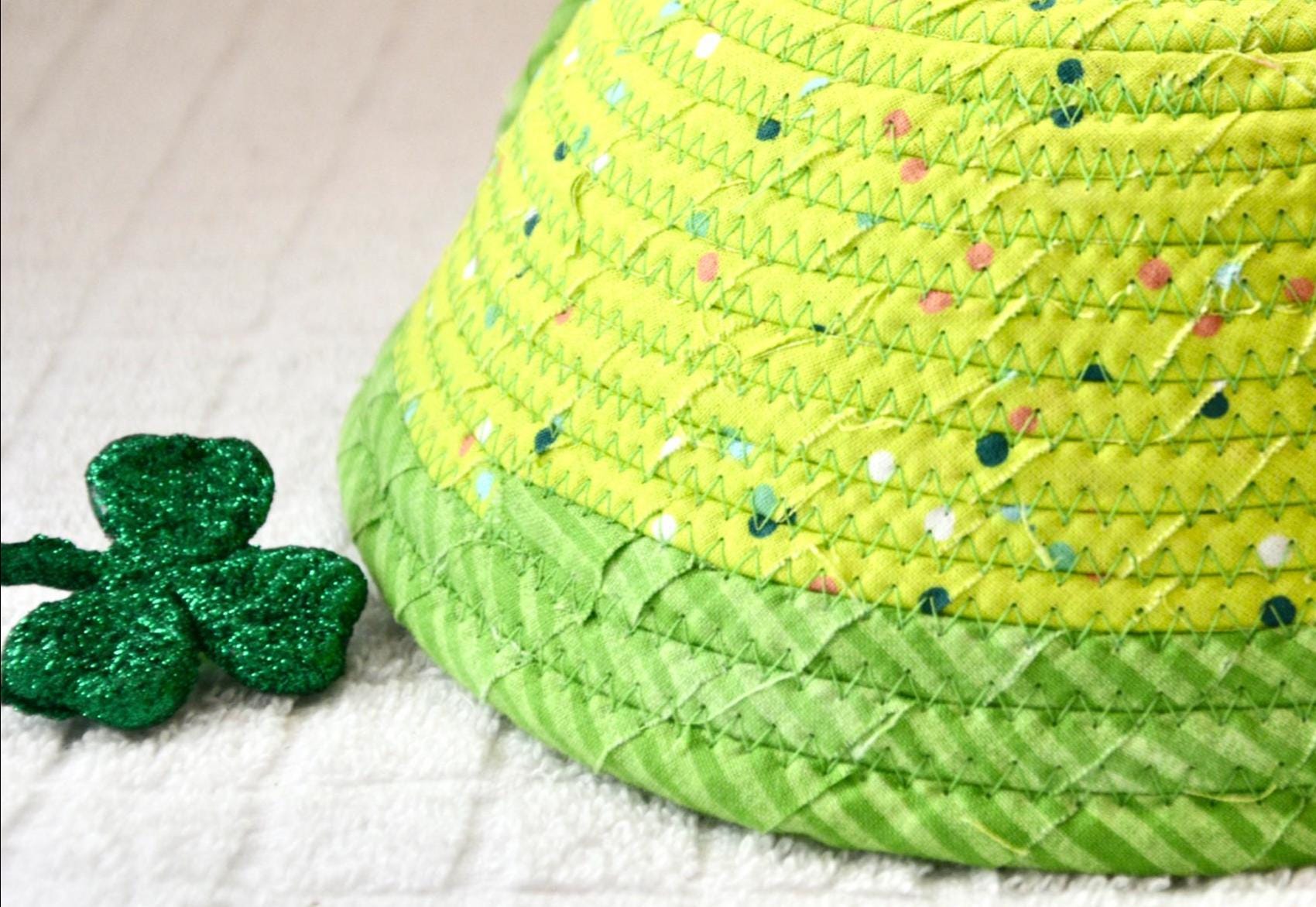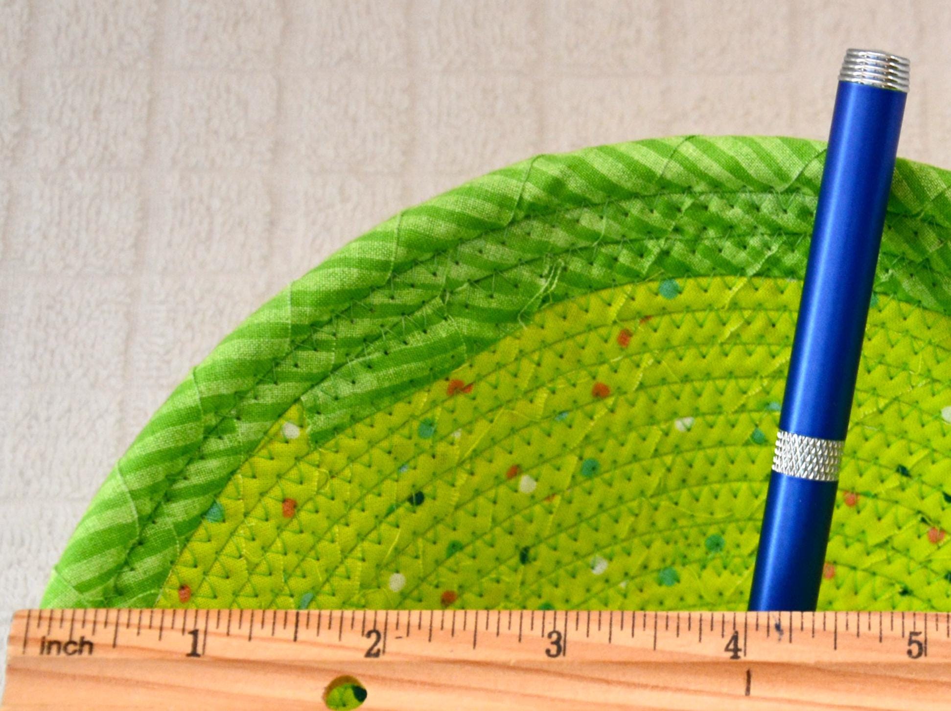 I hand wrapped these wonderful green fabrics around cotton line, which I then hand coiled and machine quilted to make the basket sturdy. I used the raw edge technique with some fray to give it a lovely shabby chic texture. The cute GNOME and green hearts on the basket are included for a nice accent. These fun fabrics are 100% cotton and show on the inside of the basket too! Please see the picture with the pen and ruler to help gauge the size of this lovely basket. Spot clean. Bead, shamrock, candy, pen, ruler props not included.