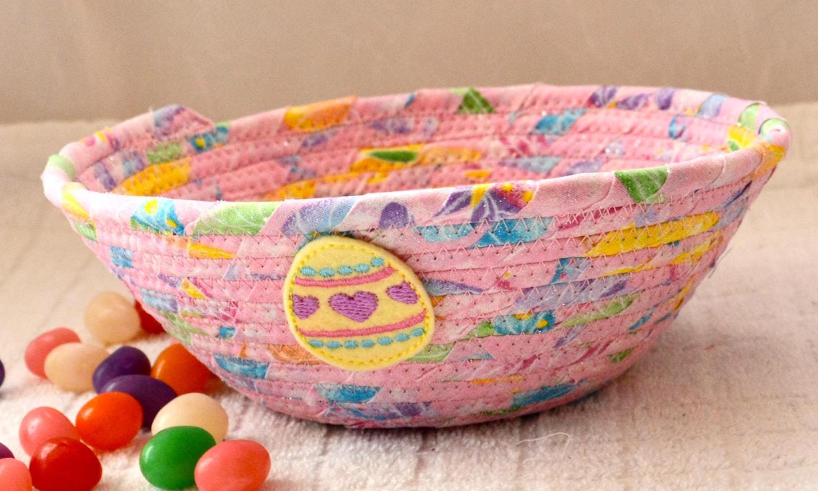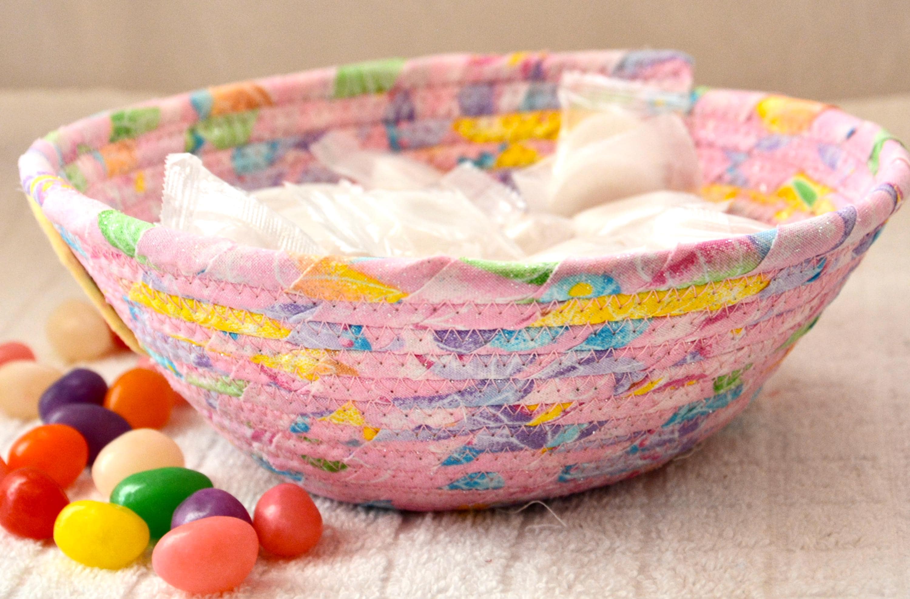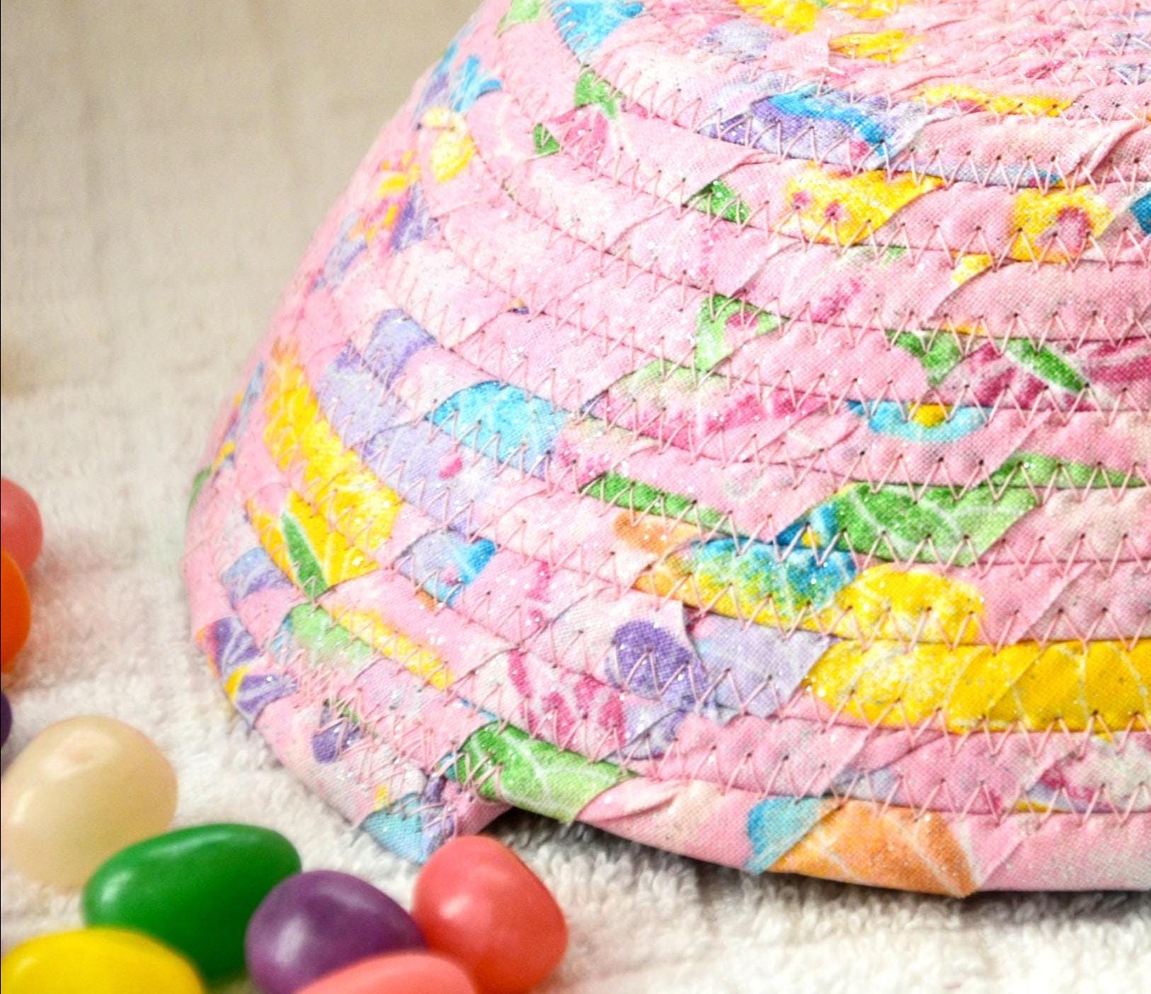 I hand wrapped this cute fabric around cotton line, which I then hand coiled and machine quilted to make it sturdy. I used the raw edge technique with some fray for a great shabby chic texture. The cute felted egg on the basket is included for a nice accent. 100% cotton fabric and shows on the inside of the basket too! Color placement will vary. The last picture is this pretty pink fabric on my cutting table.