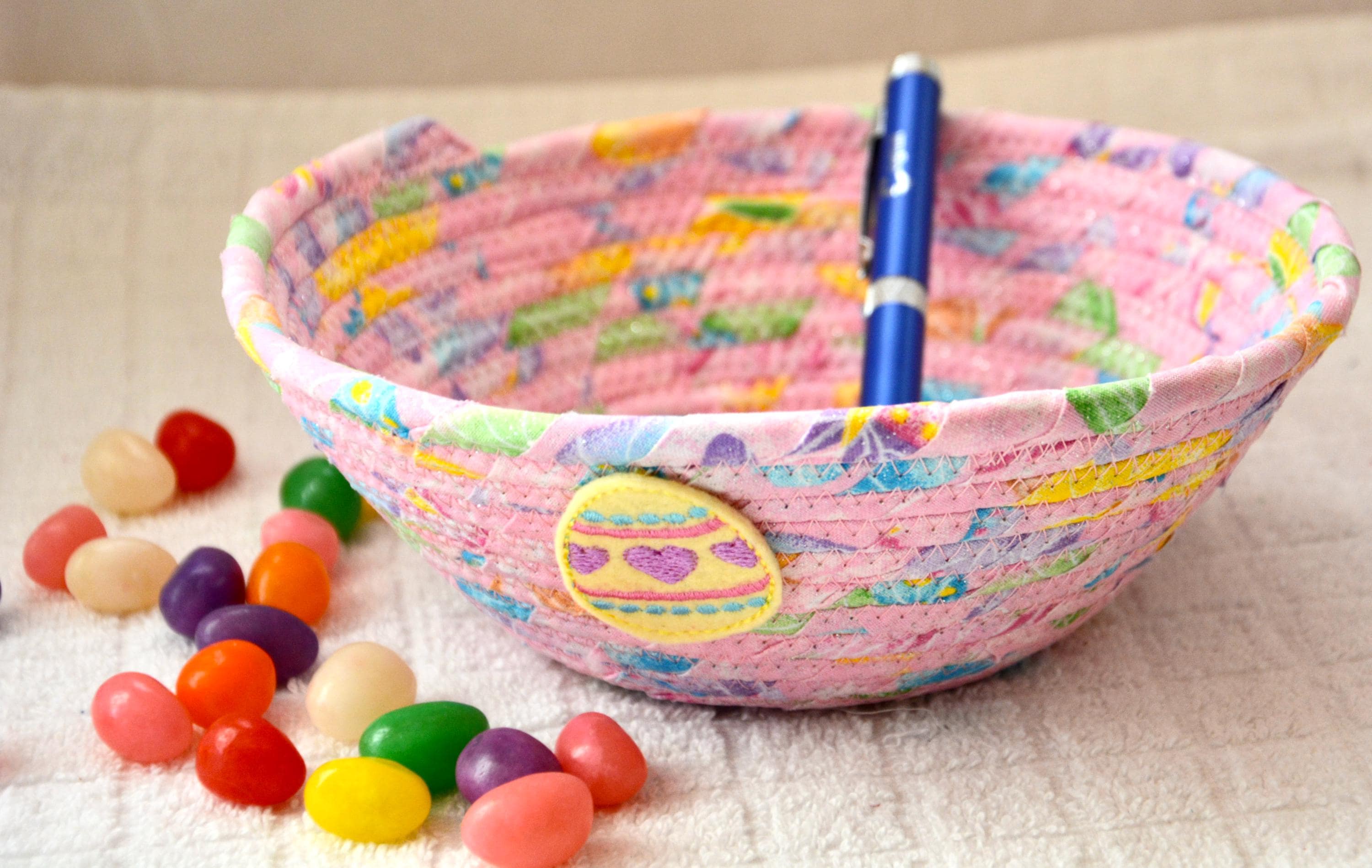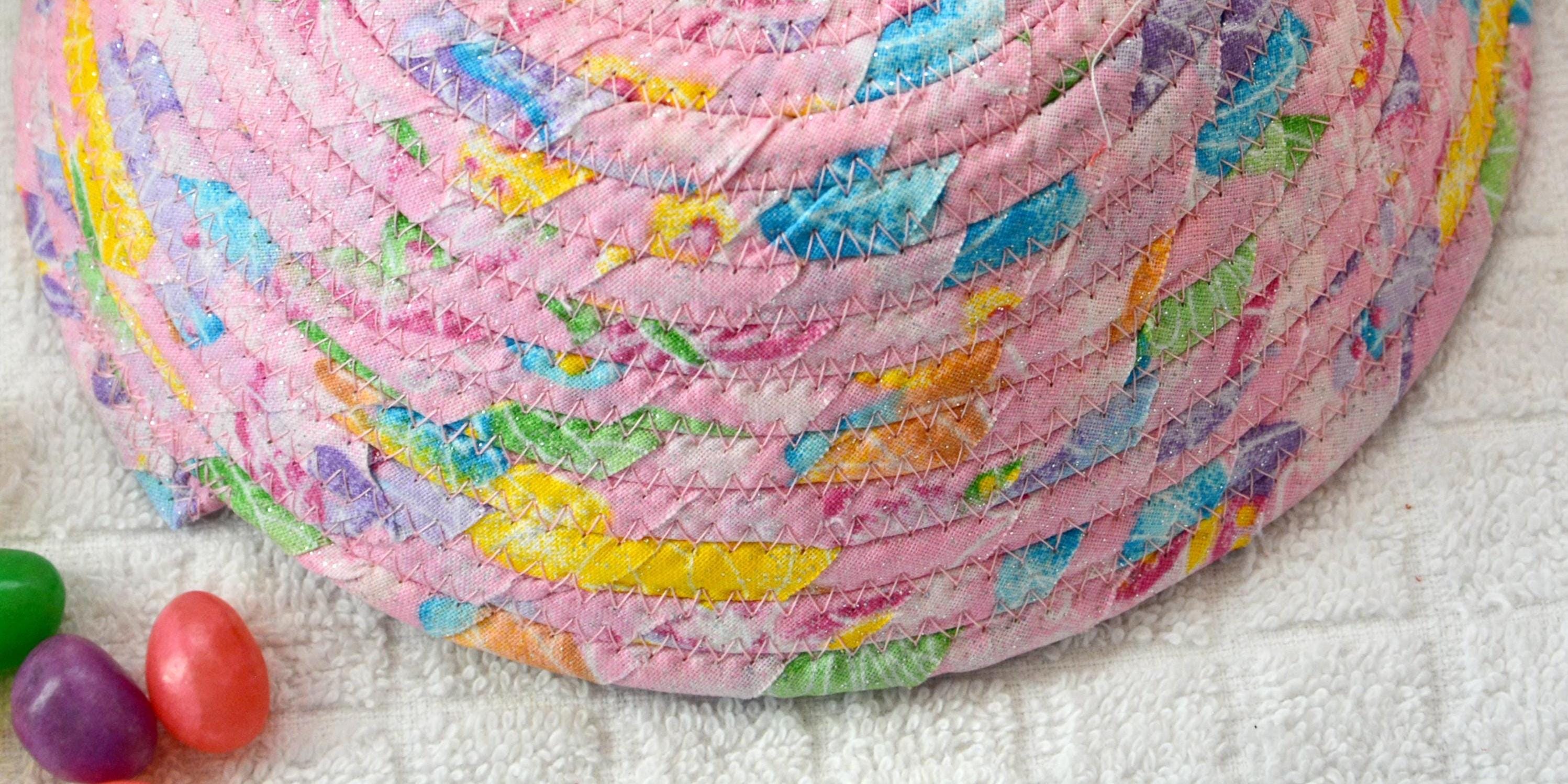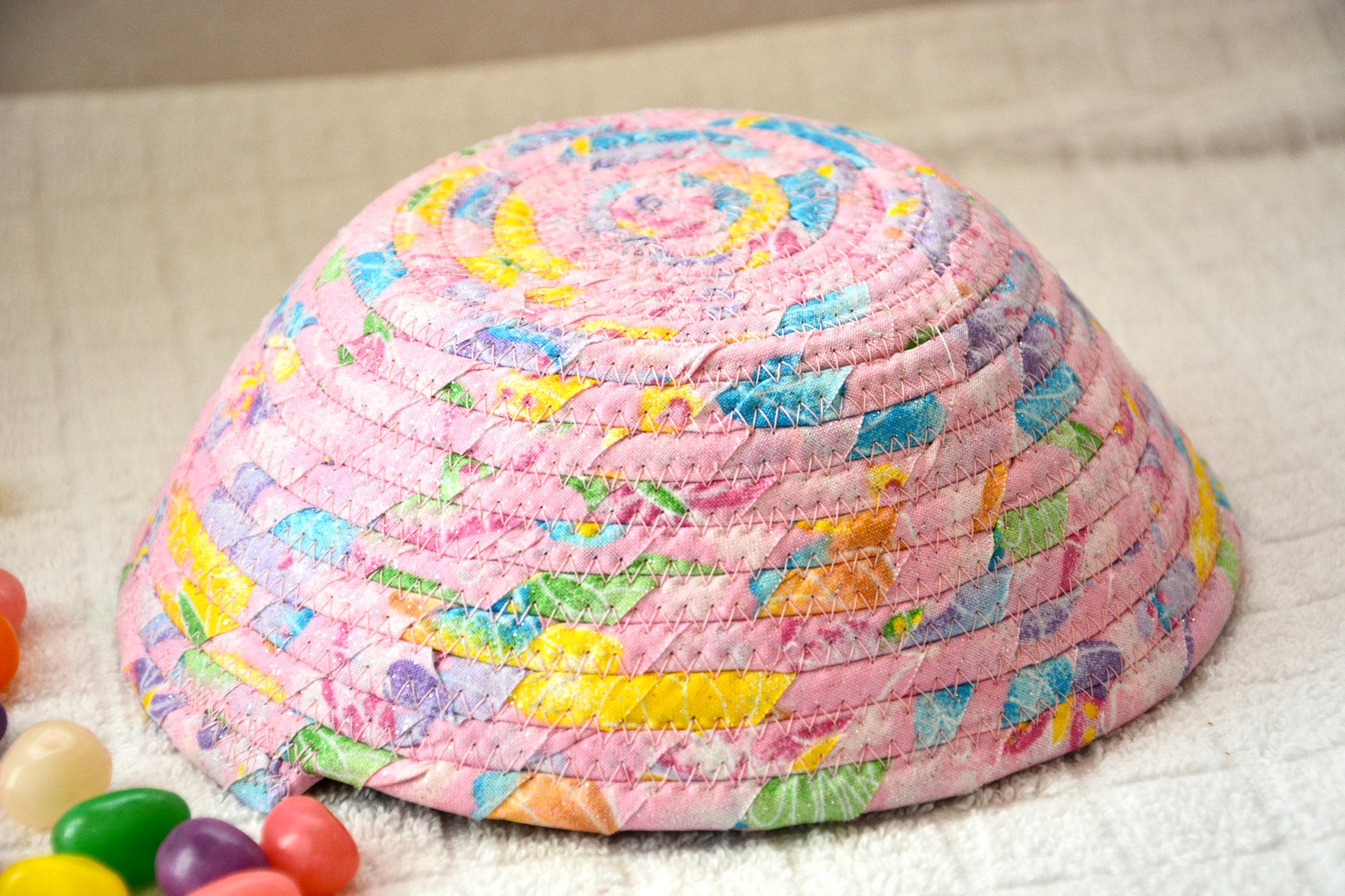 I hand wrapped this cute fabric around cotton line, which I then hand coiled and machine quilted to make it sturdy. I used the raw edge technique with some fray for a great shabby chic texture. The cute felted egg on the basket is included for a nice accent. 100% cotton fabric and shows on the inside of the basket too! Color placement will vary. The last picture is this pretty pink fabric on my cutting table.