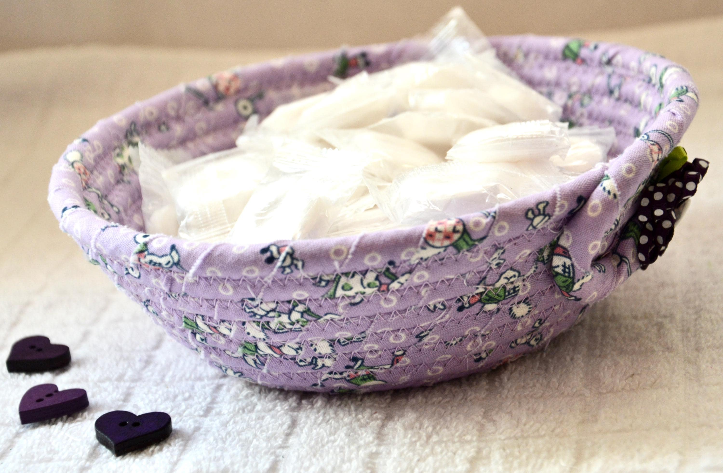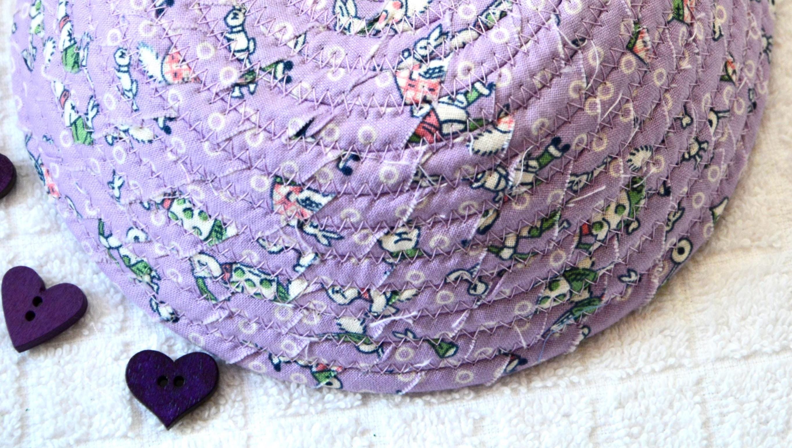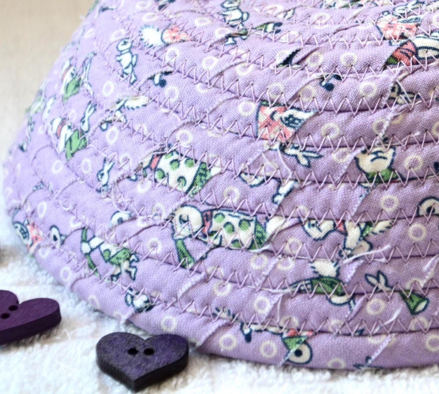 I hand wrapped this lovely lavender fabric around cotton line, which I then hand coiled and machine quilted to make it sturdy. I used the raw edge technique with some fray for a great shabby chic texture. This cute fabric is 100% cotton and shows on the inside of the basket too!