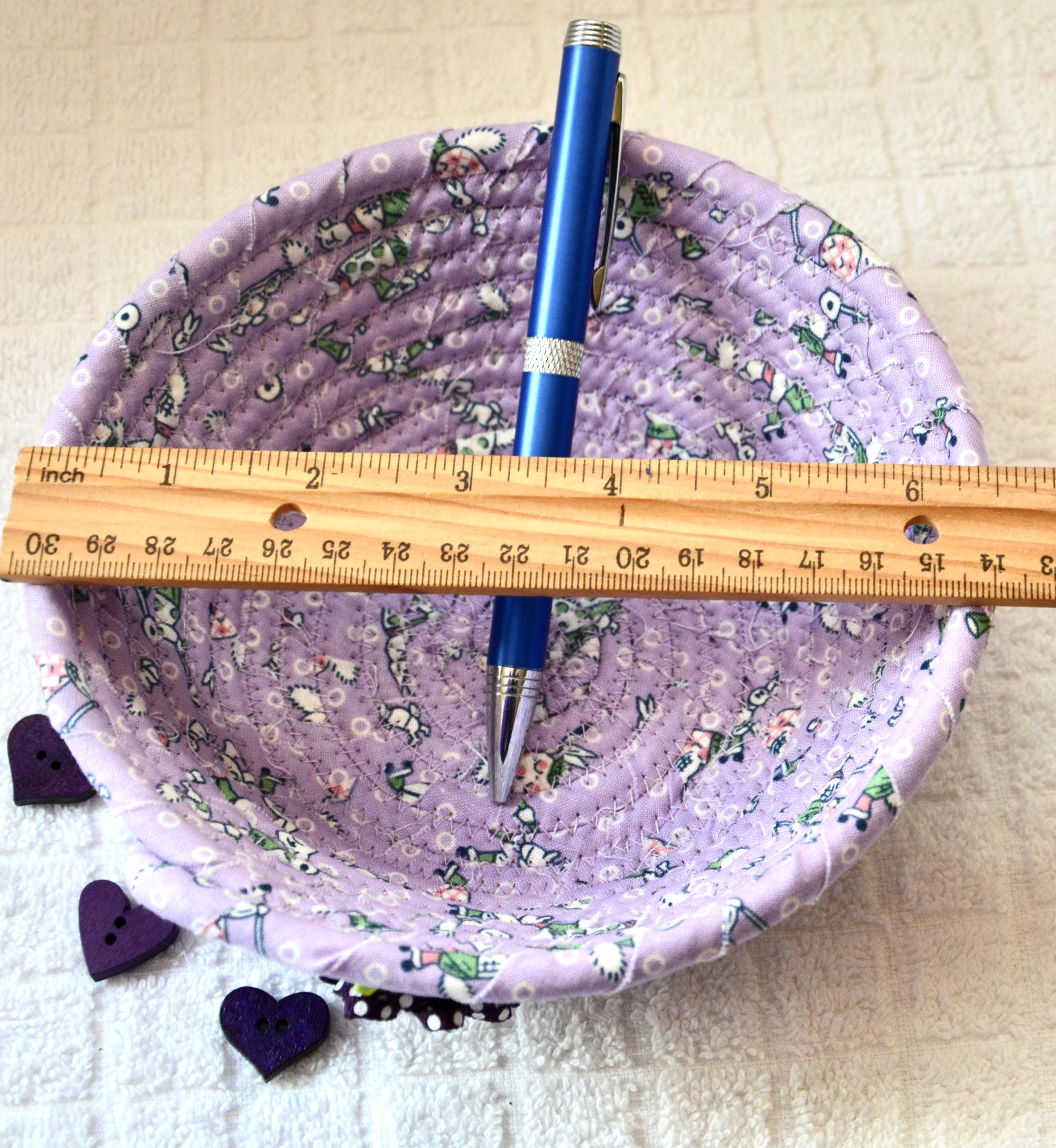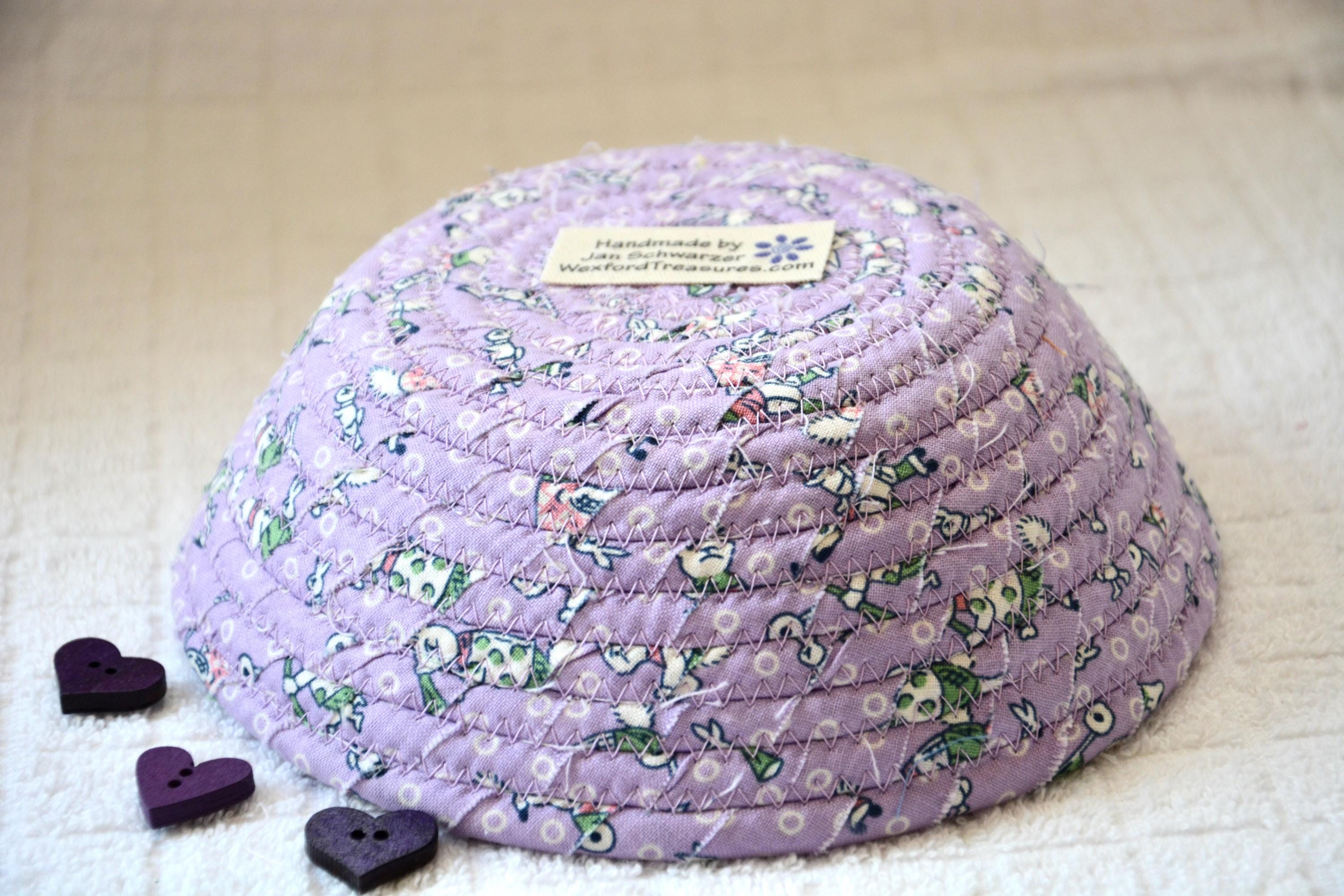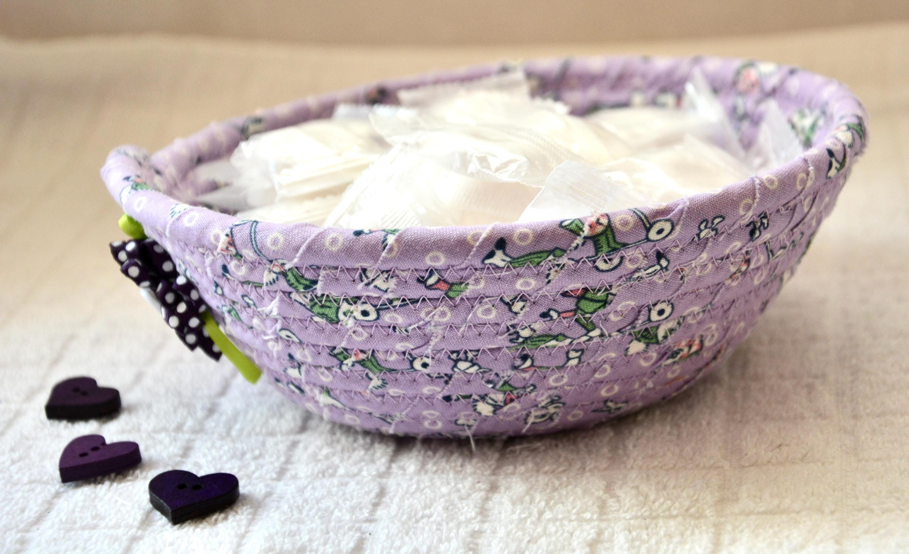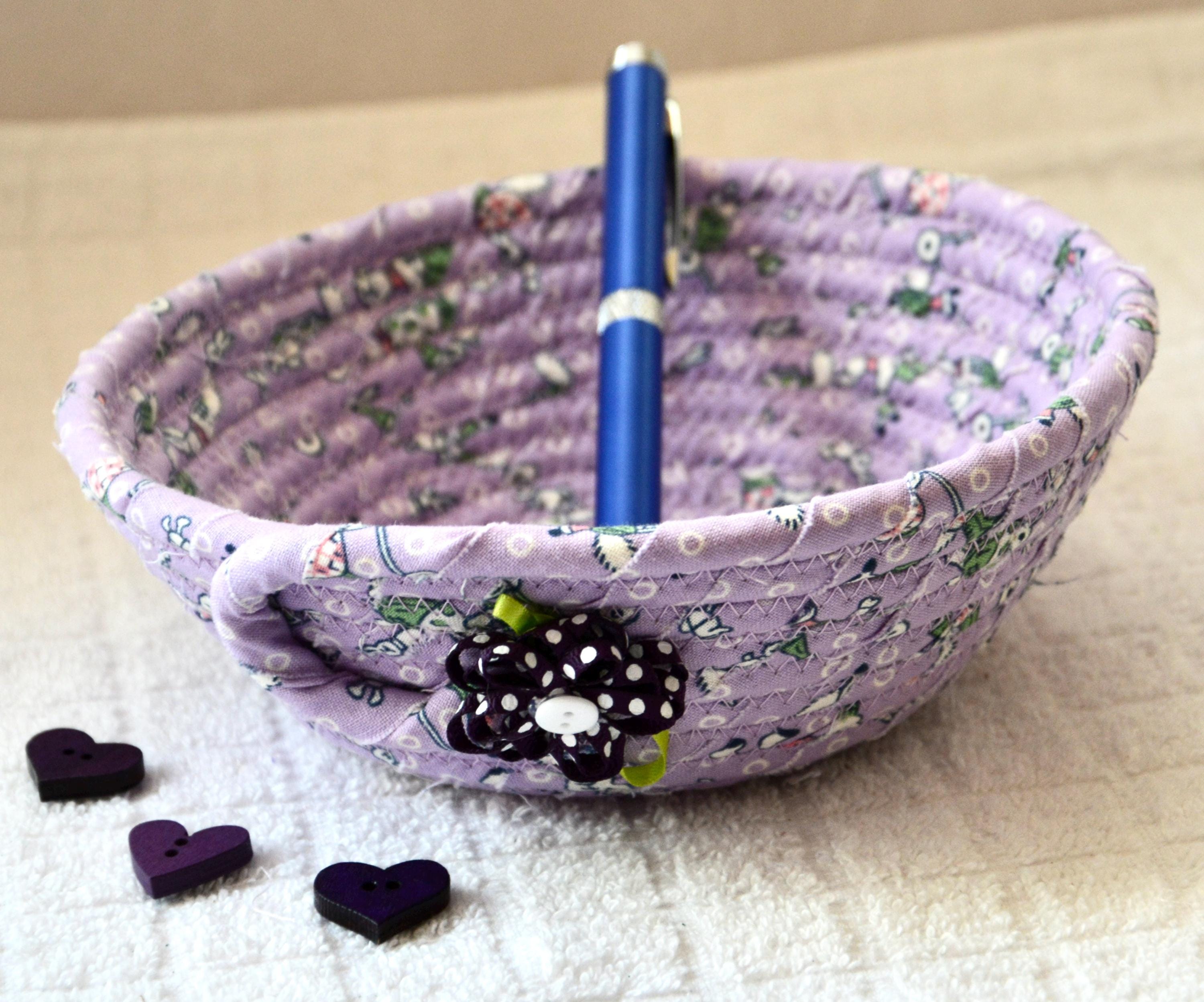 I hand wrapped this lovely lavender fabric around cotton line, which I then hand coiled and machine quilted to make it sturdy. I used the raw edge technique with some fray for a great shabby chic texture. This cute fabric is 100% cotton and shows on the inside of the basket too!