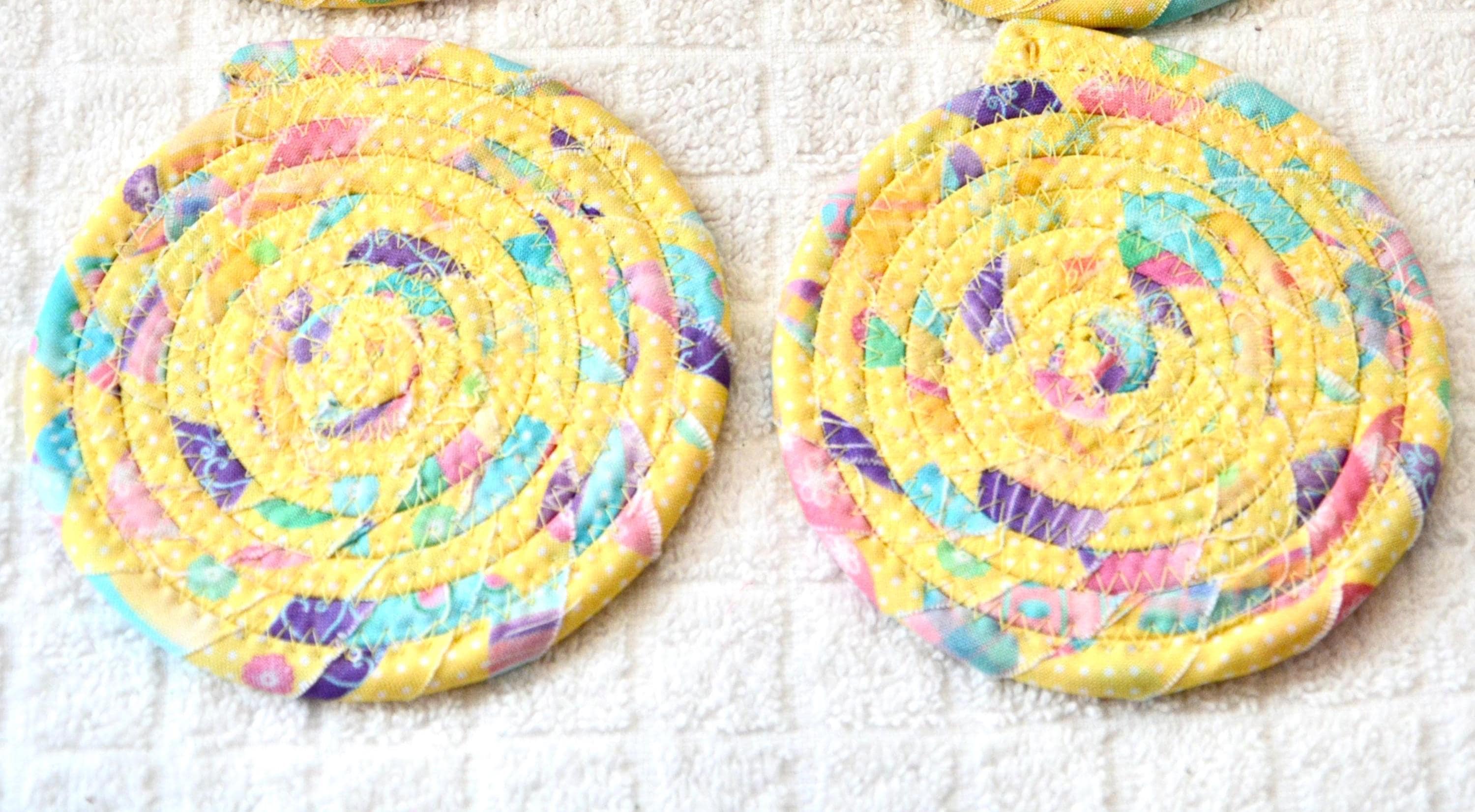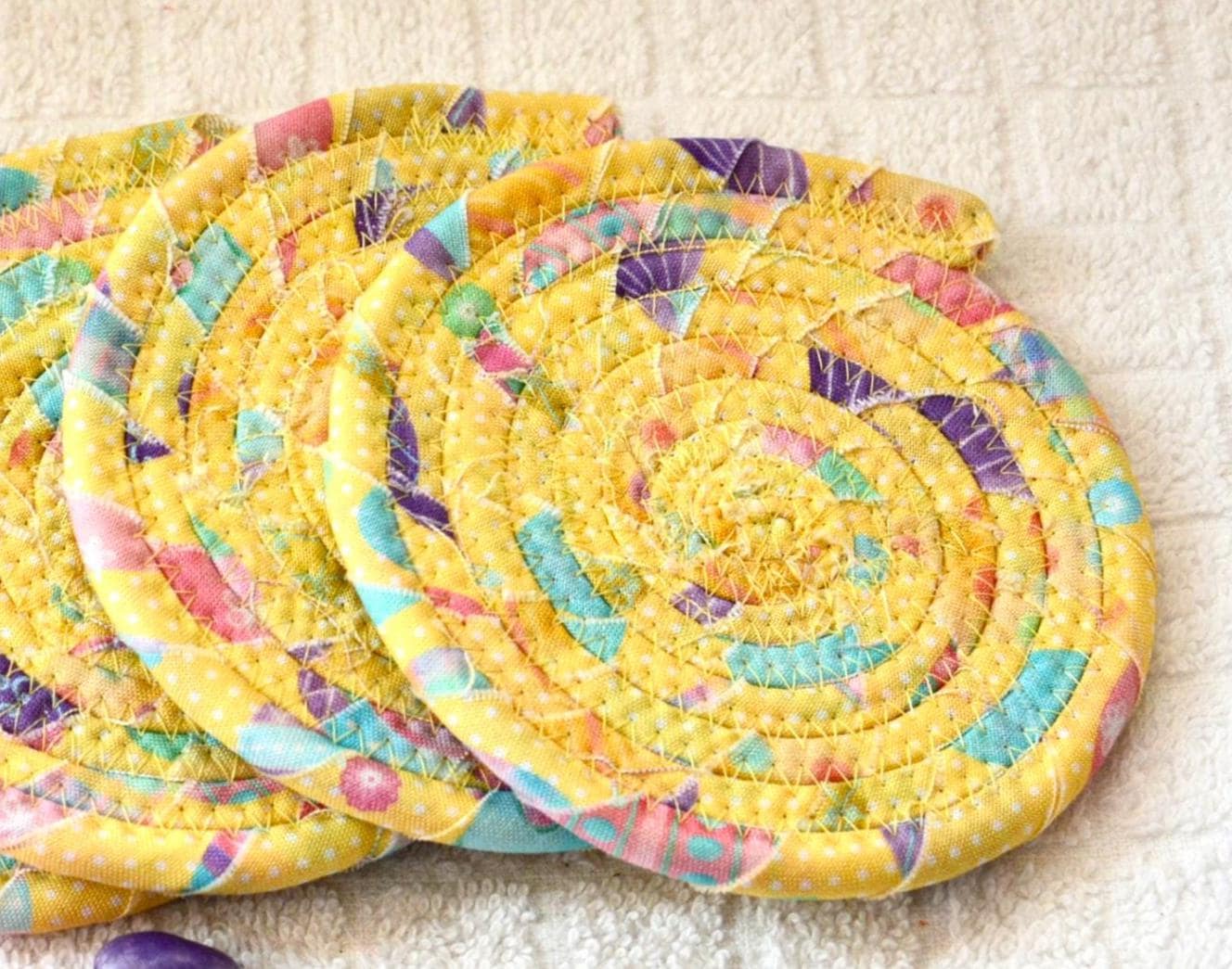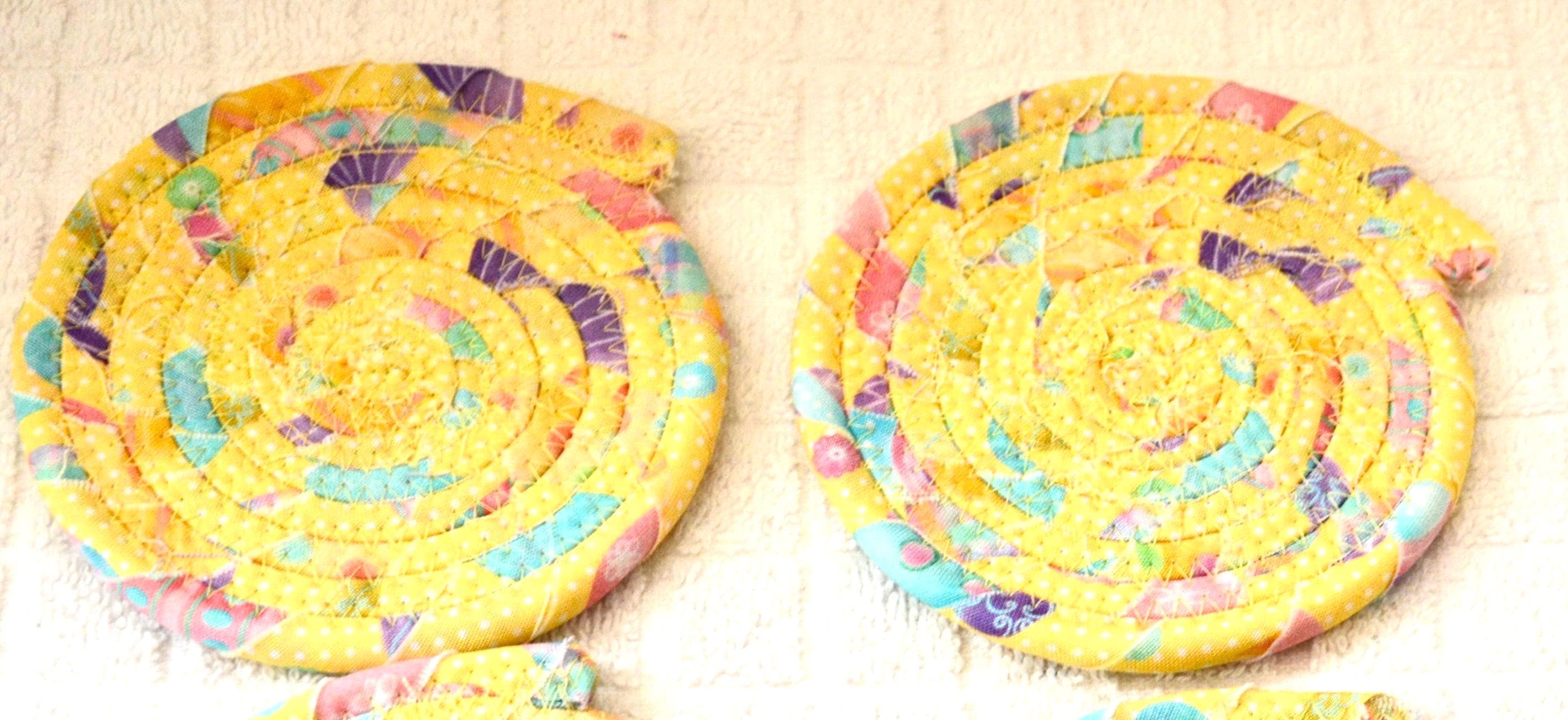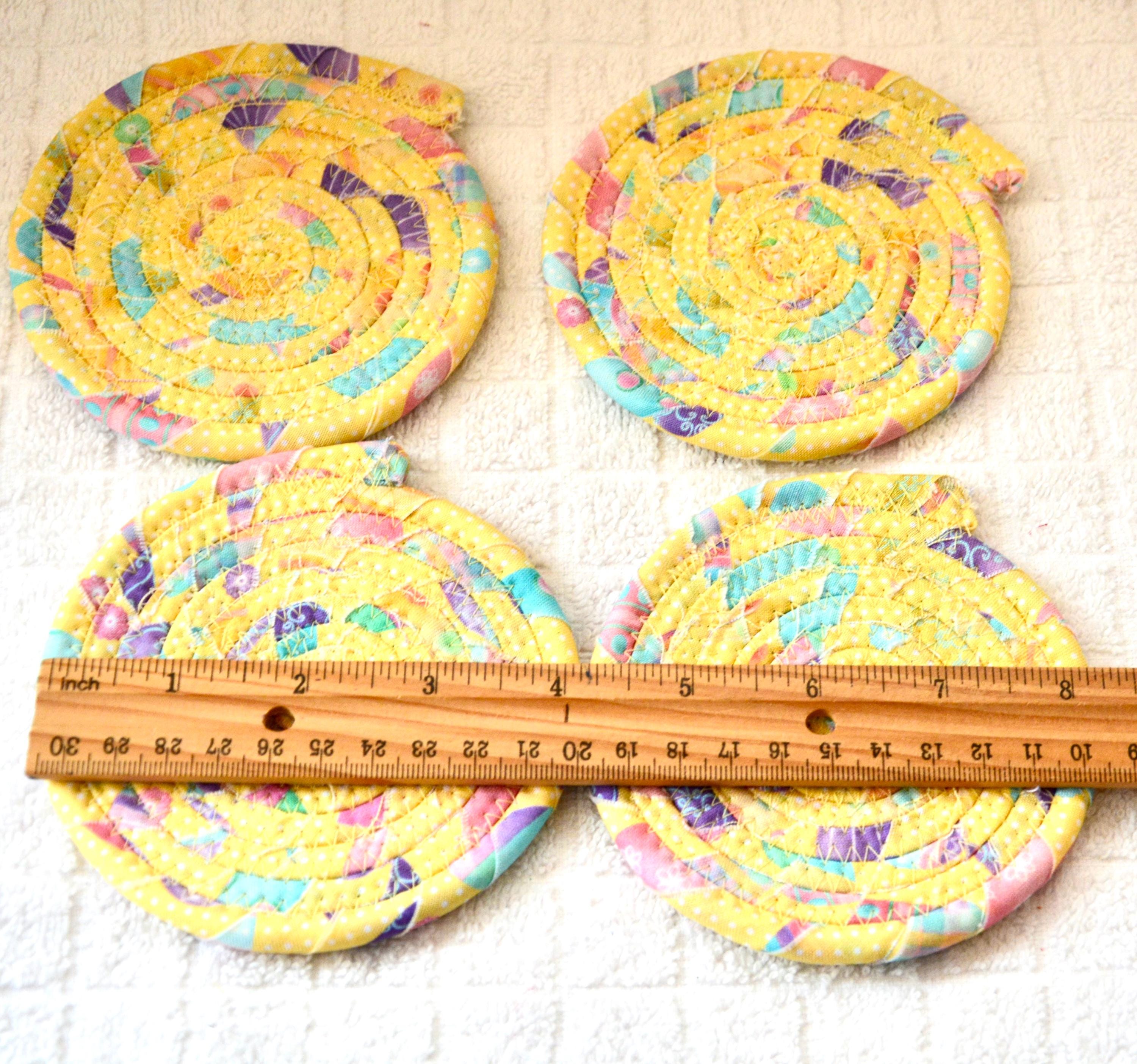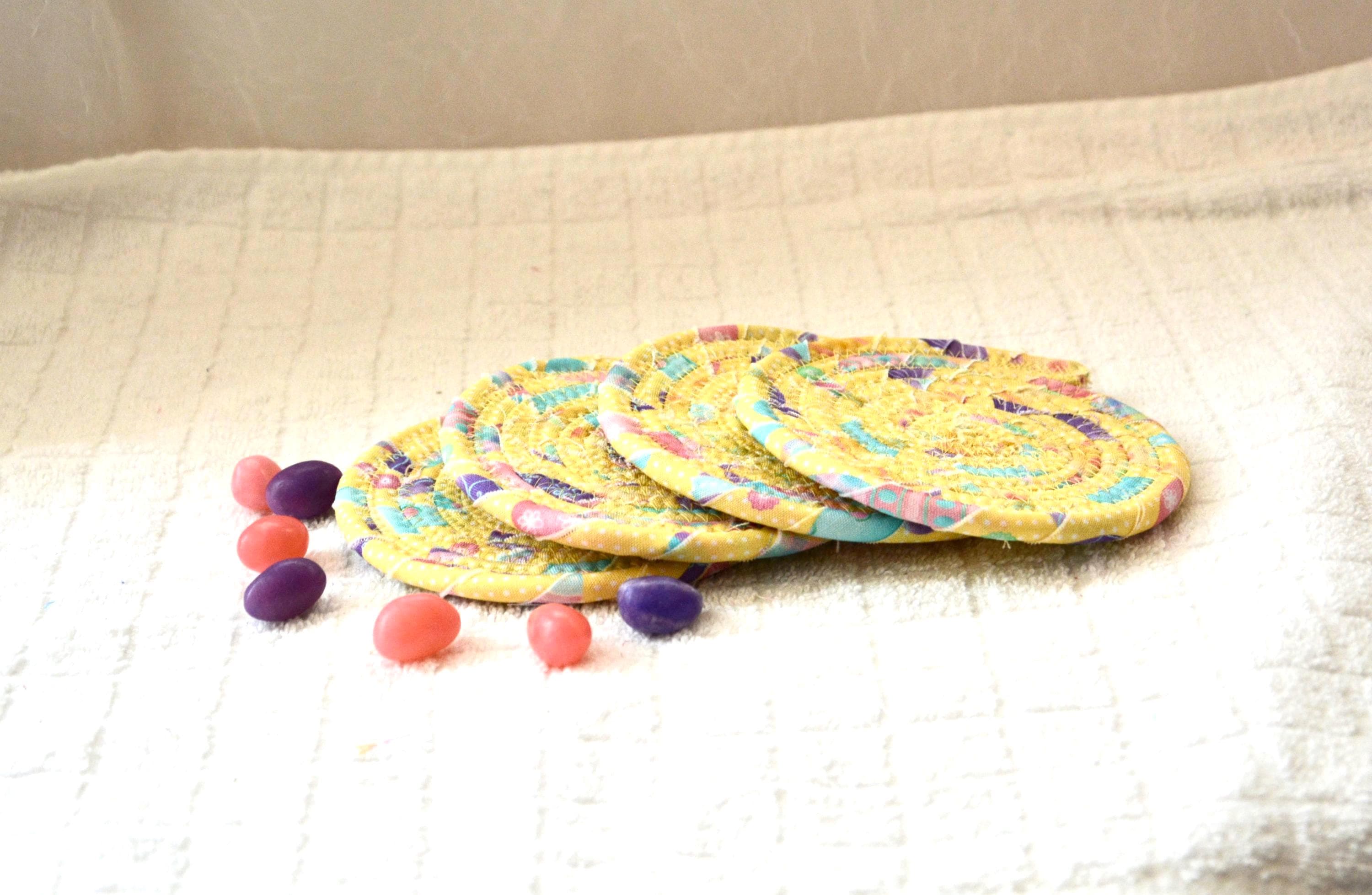 I hand wrapped this wonderful pastel yellow Easter fabric around cotton line, which I then hand coiled and machine quilted to make it sturdy. I used the raw edge technique with some fray to add a shabby chic texture. I created this cute mug rug set in my smoke-free home studio. Flower, candy, bead, ruler, mug props not included. Spot clean. Color placement will vary.
