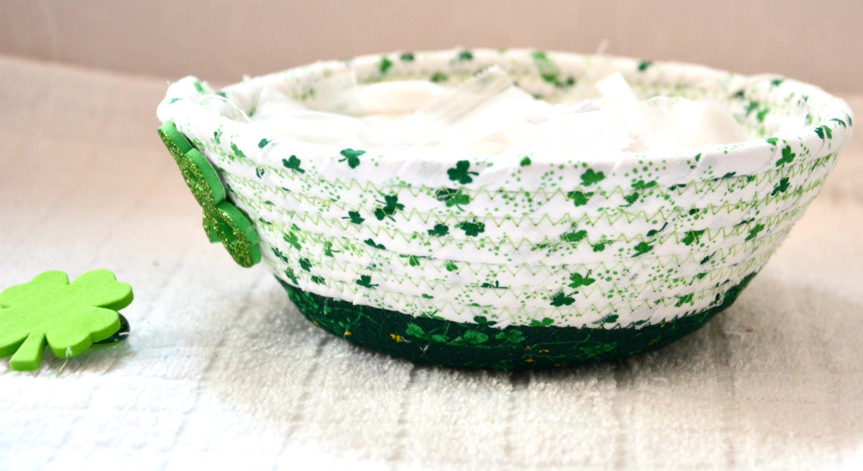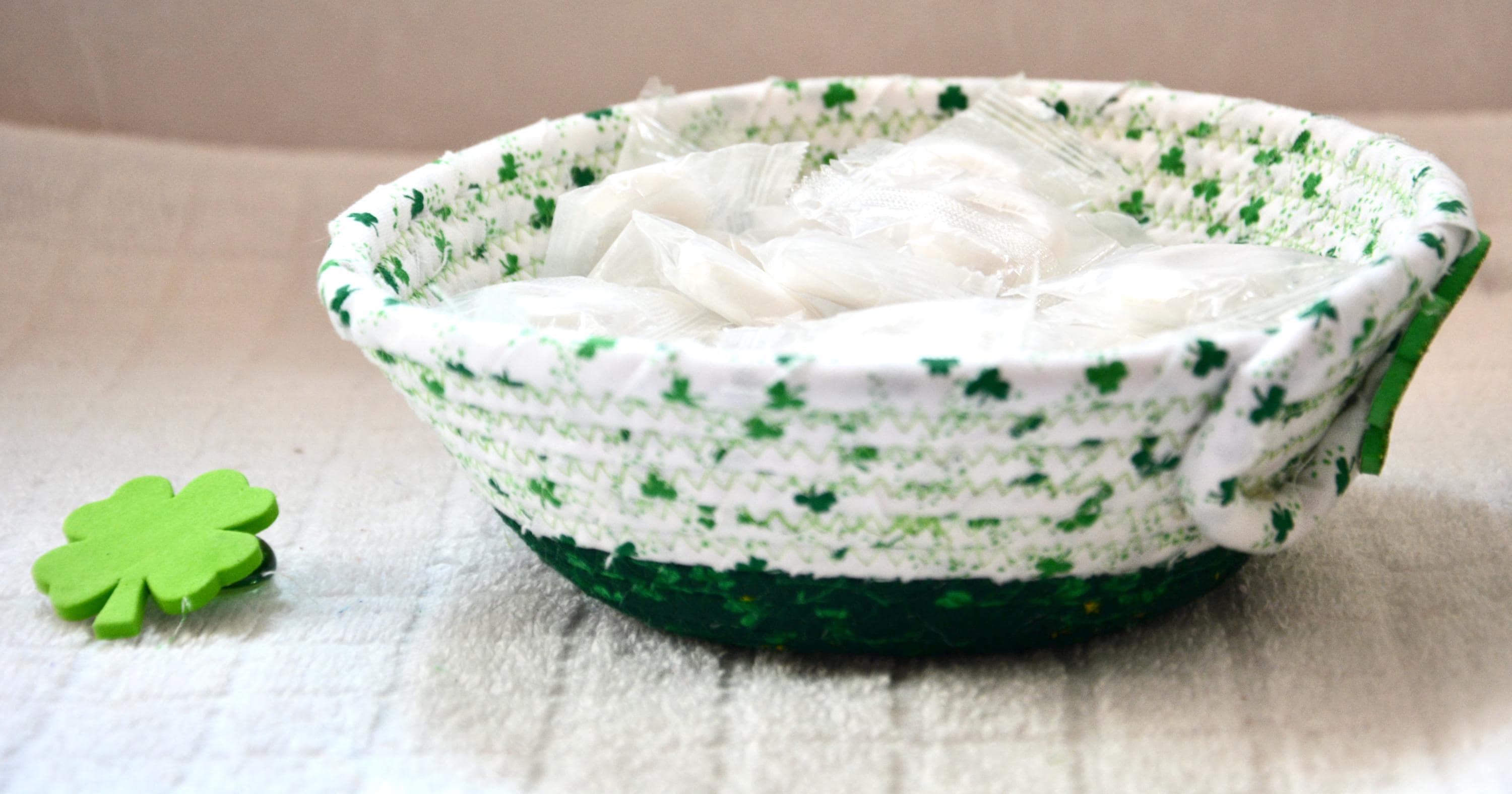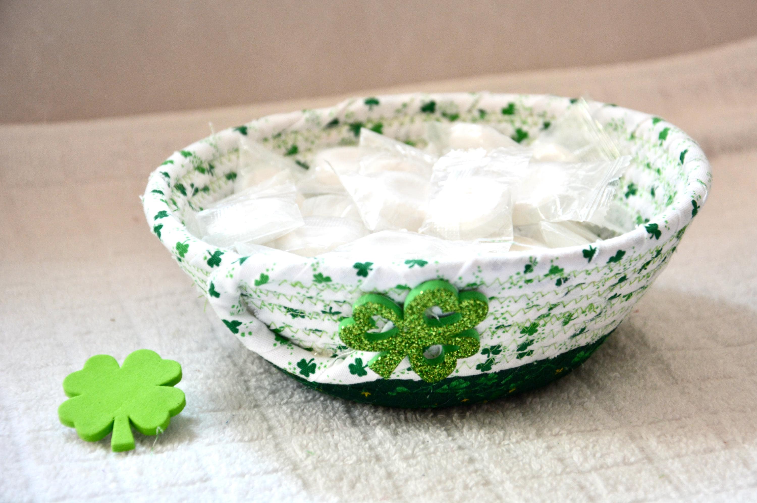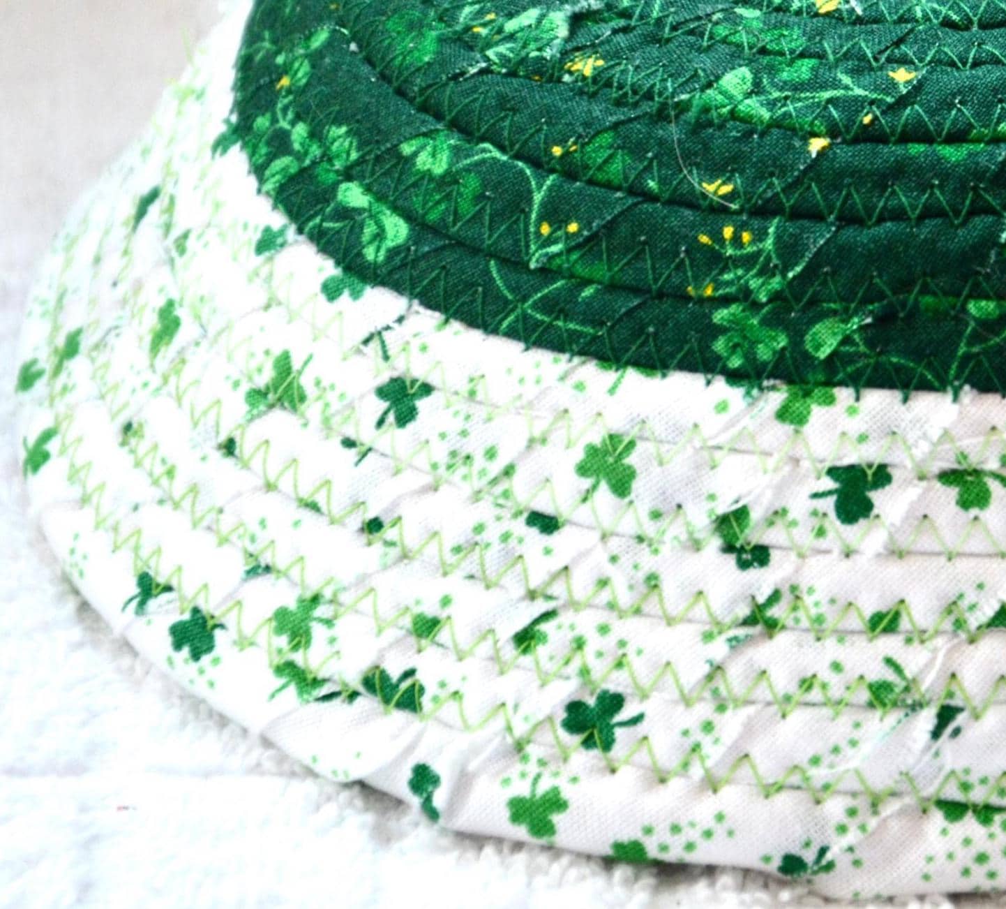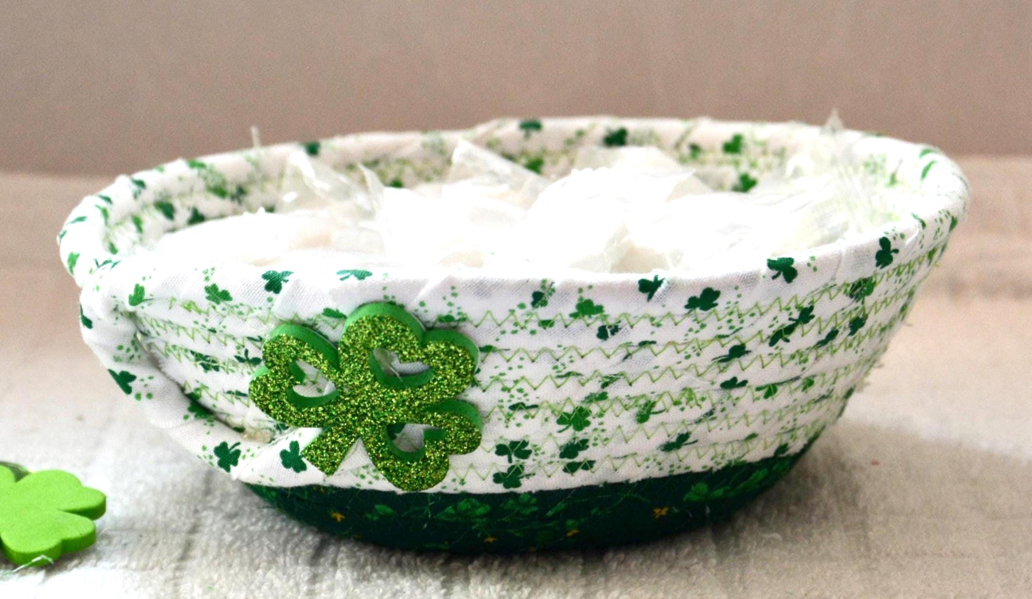 I hand wrapped high quality fabrics around cotton line, which I then hand coiled and machine quilted to make it sturdy. I used the raw edge technique with some fray. These fun fabrics show on the inside too!. The cute shamrock on the basket is included for a cute accent.