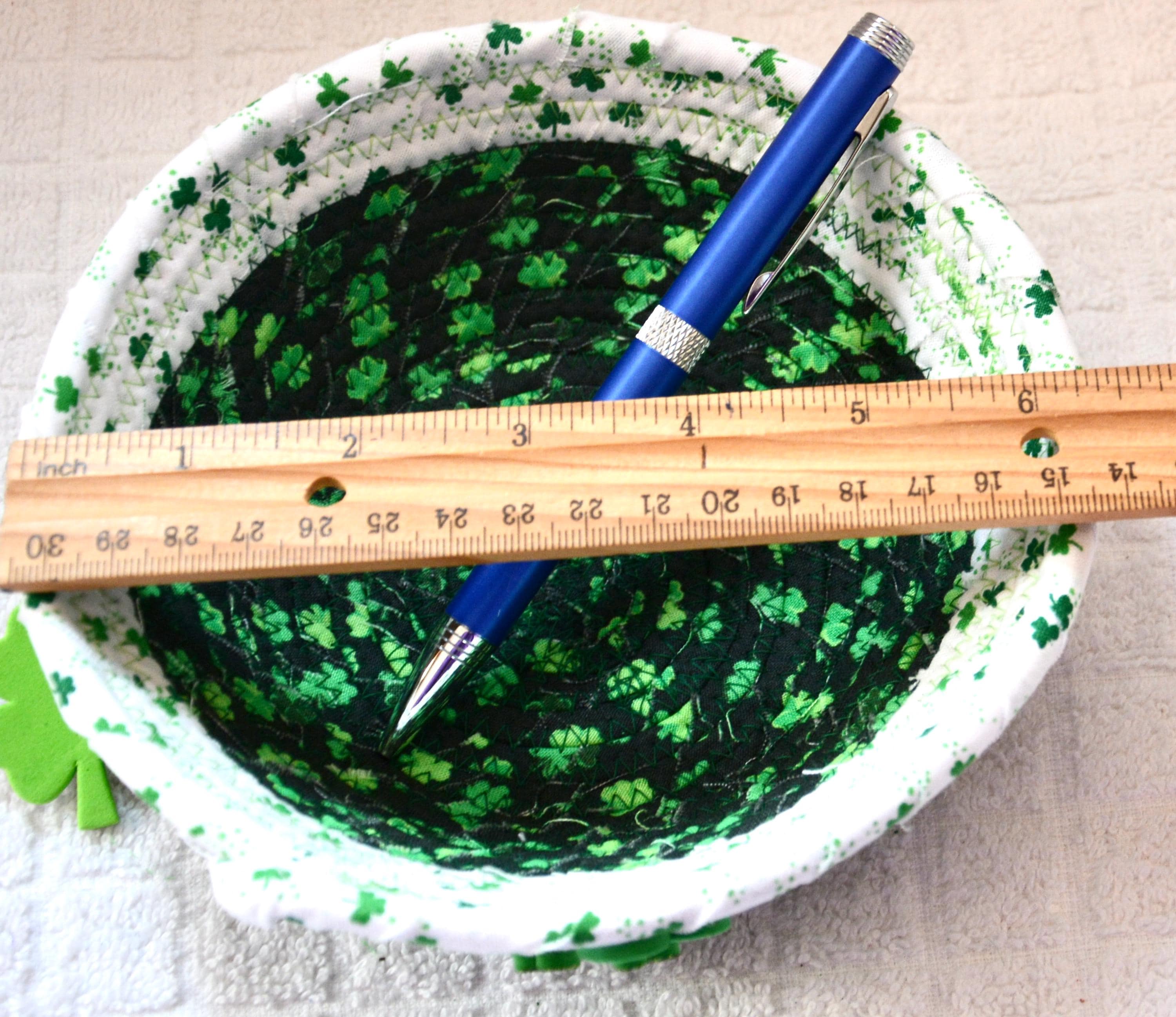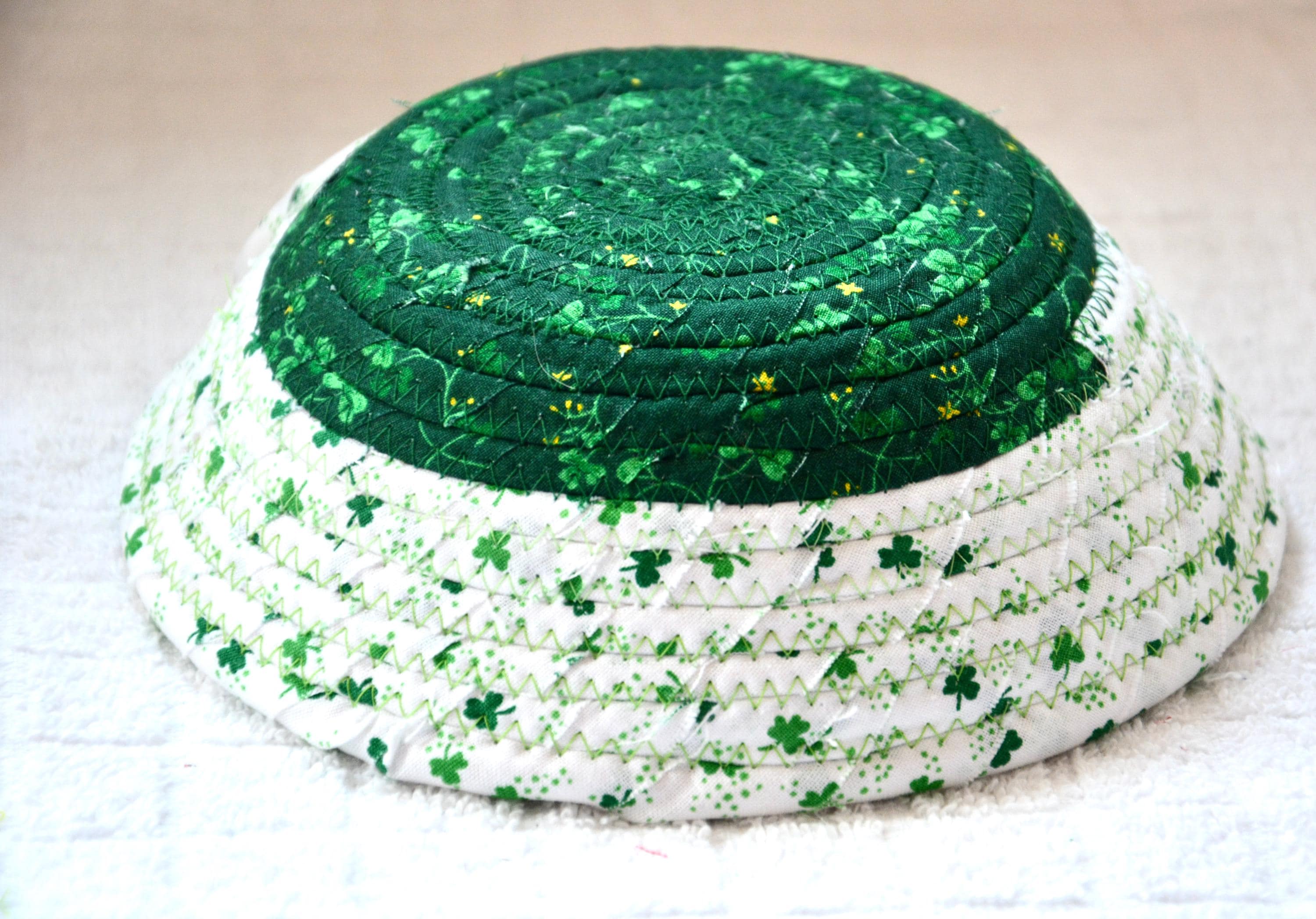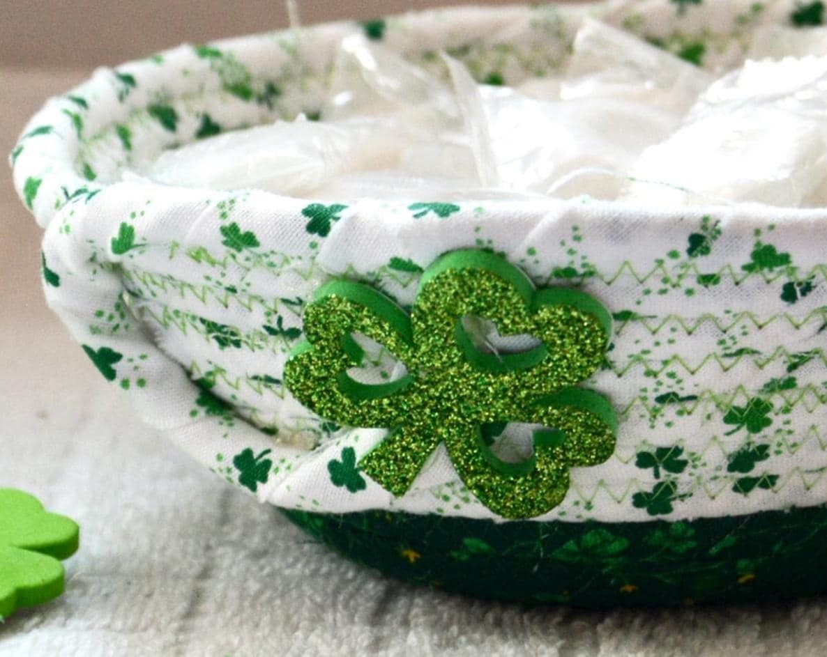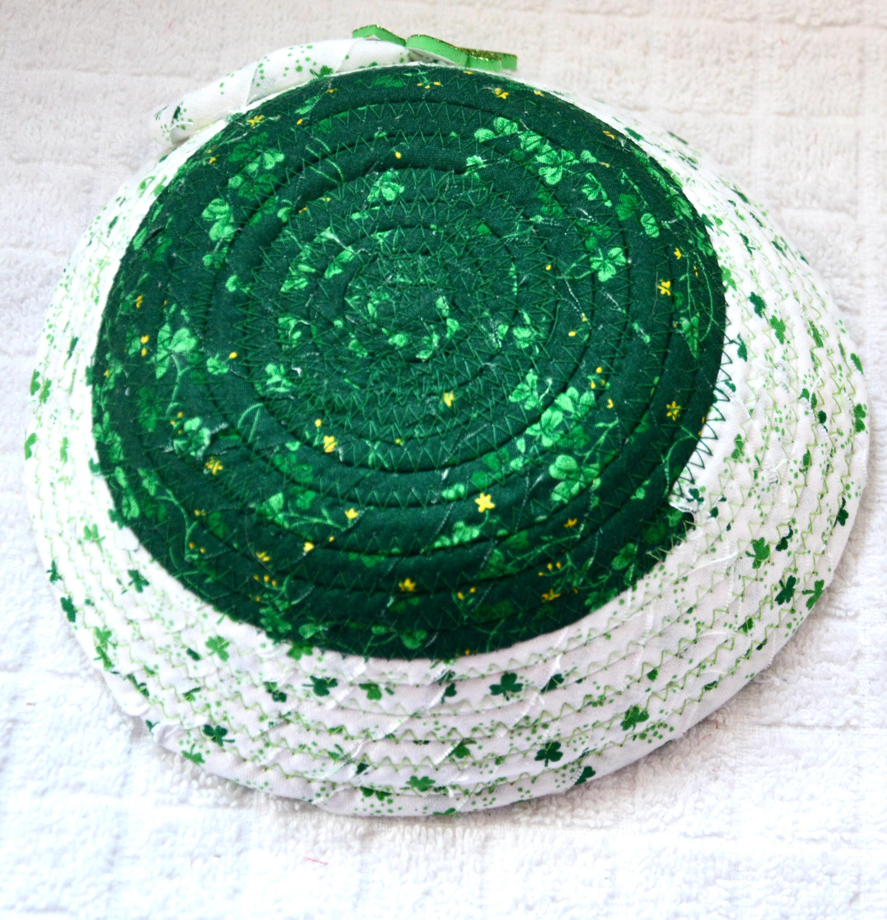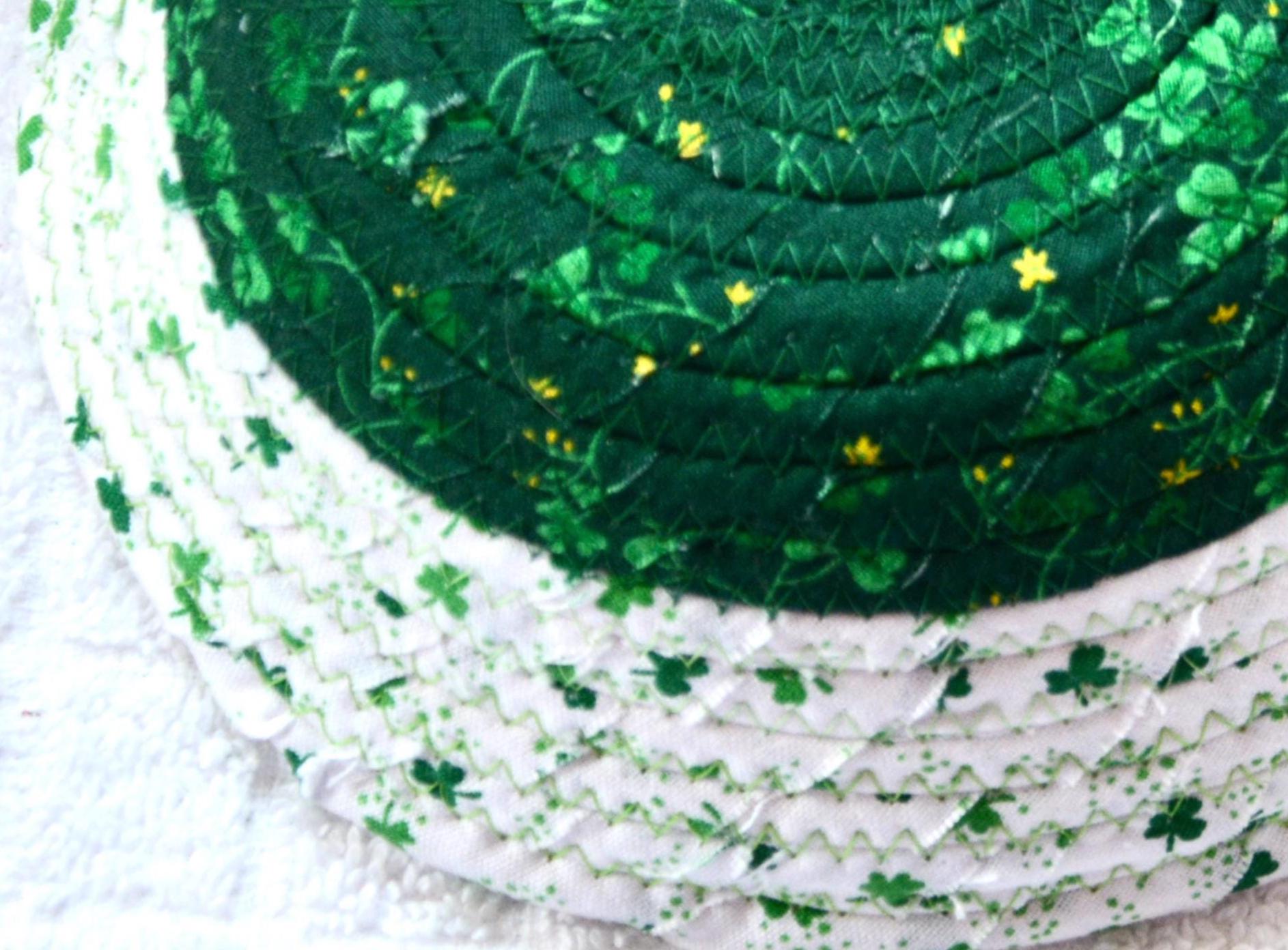 I hand wrapped high quality fabrics around cotton line, which I then hand coiled and machine quilted to make it sturdy. I used the raw edge technique with some fray. These fun fabrics show on the inside too!. The cute shamrock on the basket is included for a cute accent.