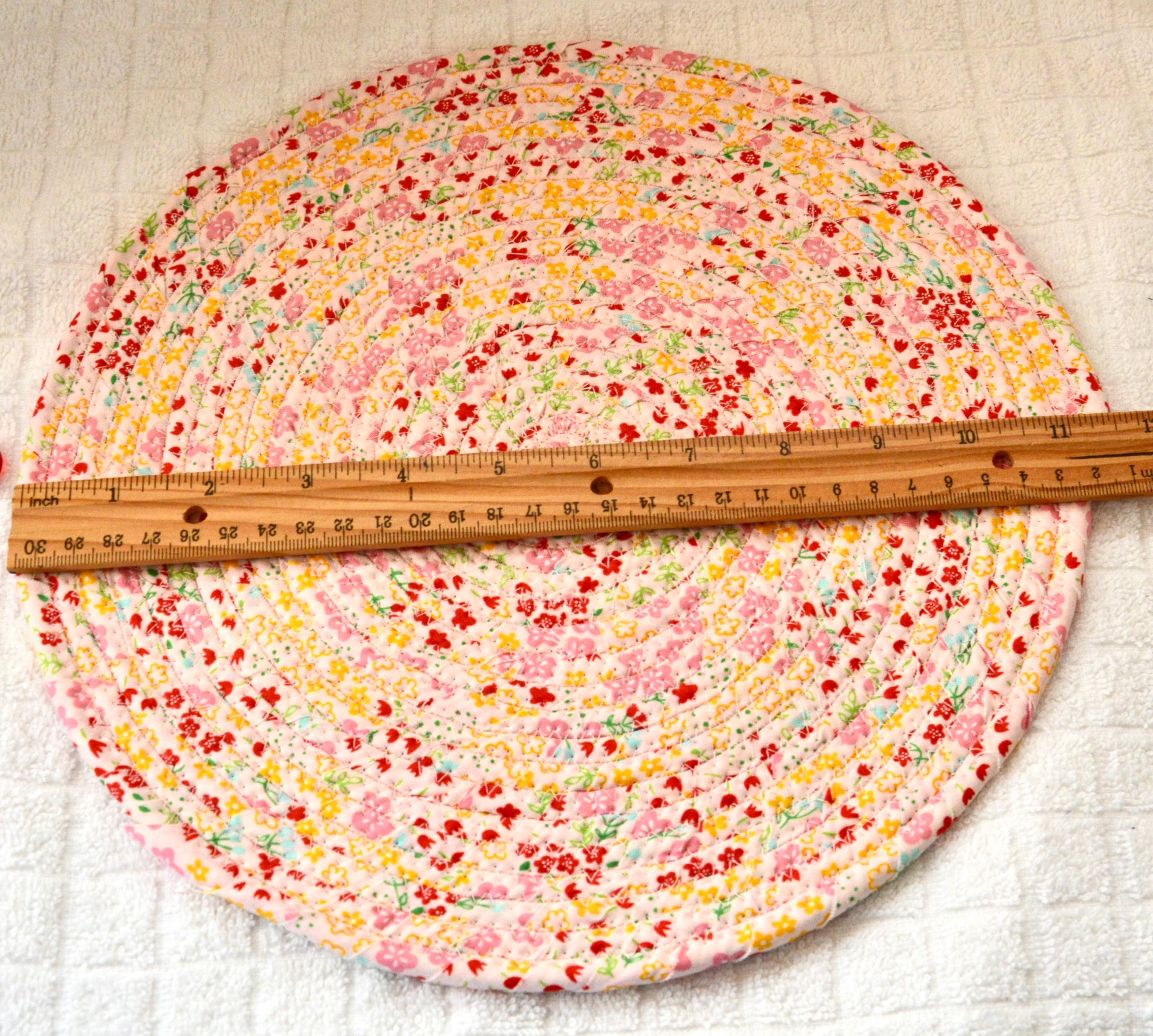 I hand wrapped this wonderful pastel yellow Easter fabric around cotton line, which I then hand coiled and machine quilted to make it sturdy. I used the raw edge technique with some fray to add a shabby chic texture. I created this cute mug rug set in my smoke-free home studio. Flower, candy, bead, ruler, mug props not included. Spot clean. Color placement will vary.