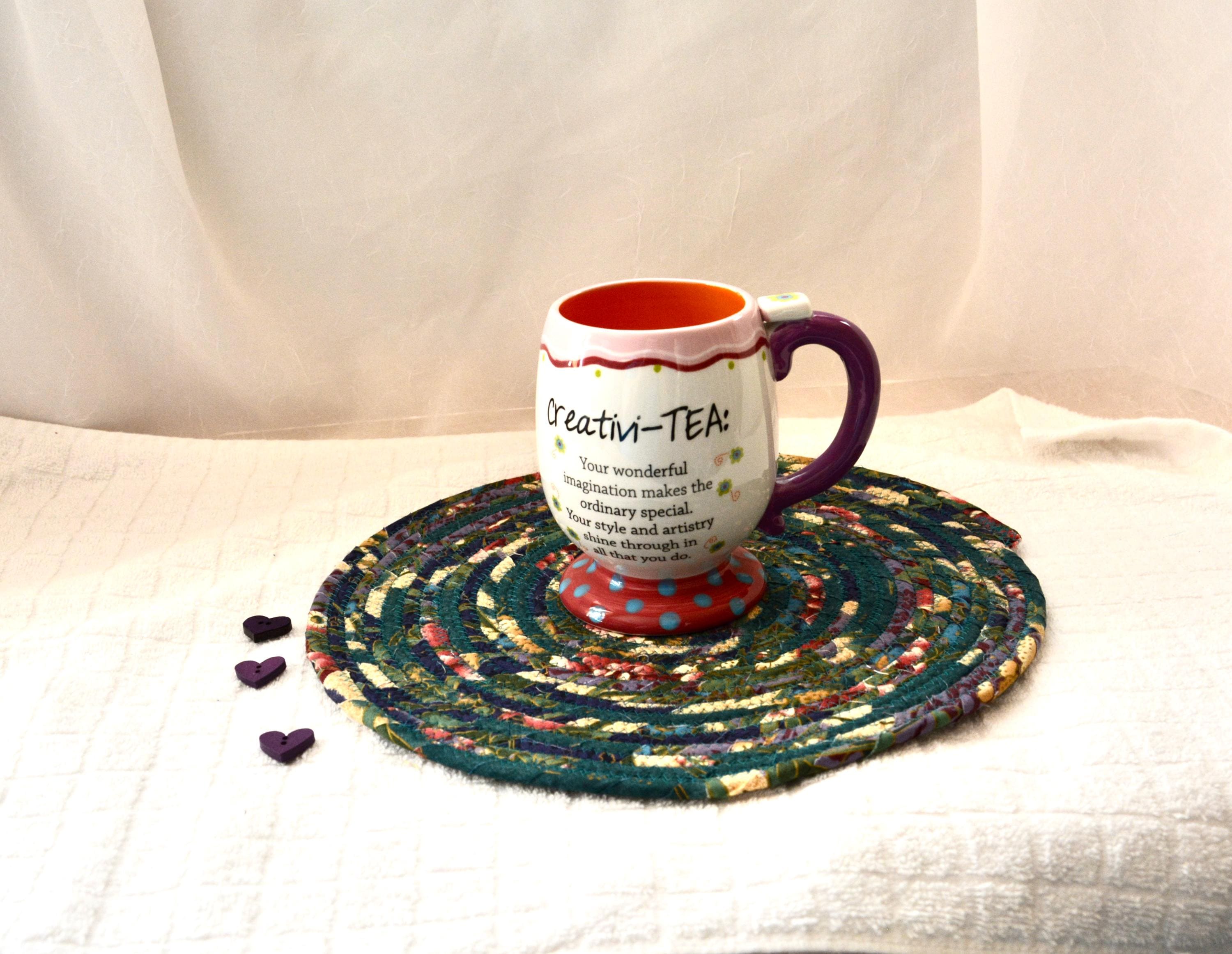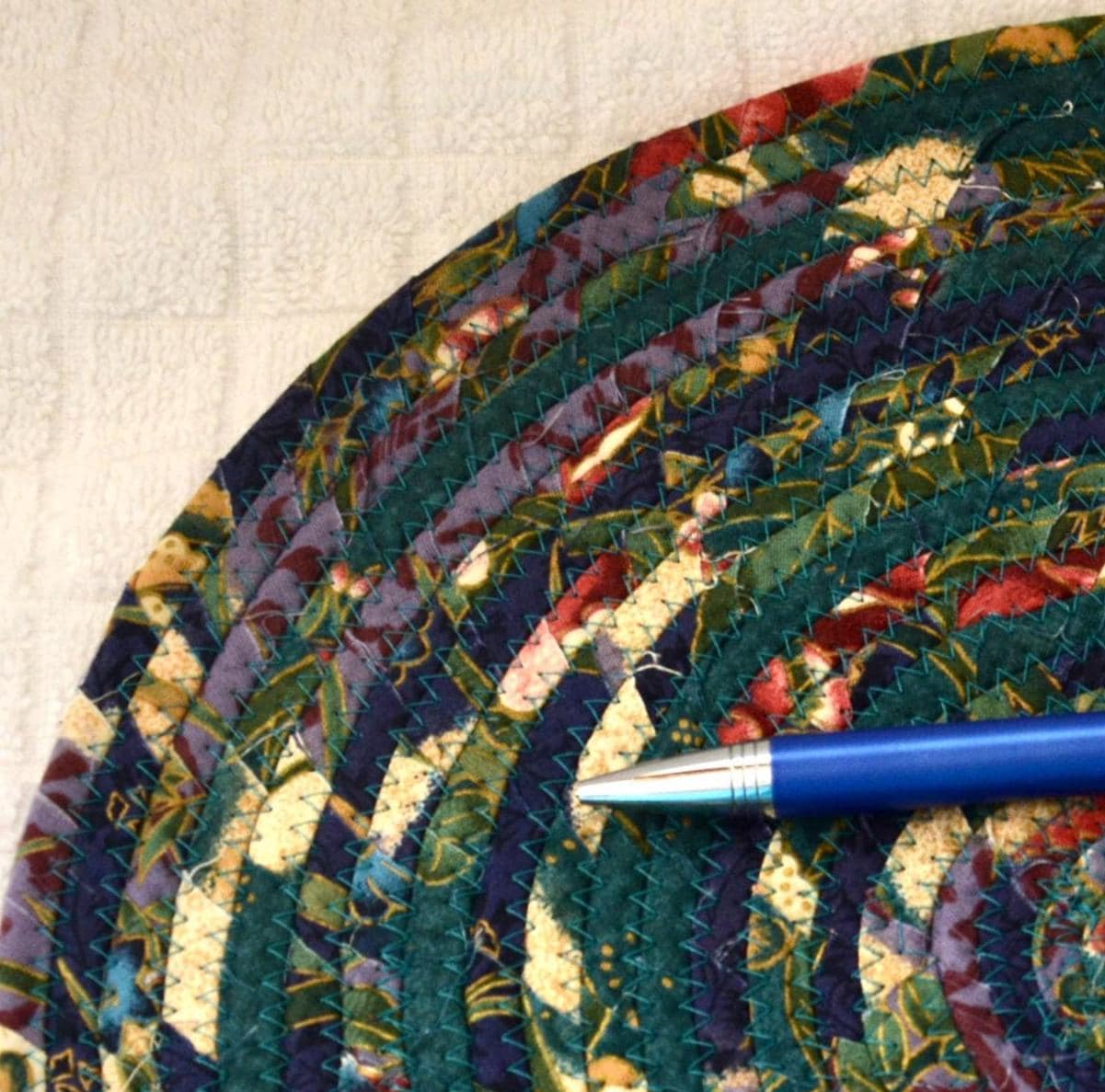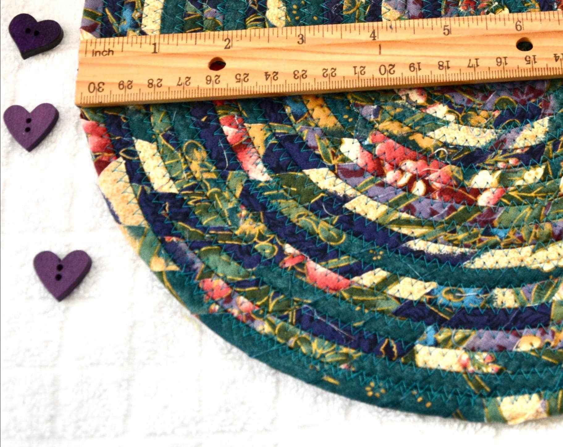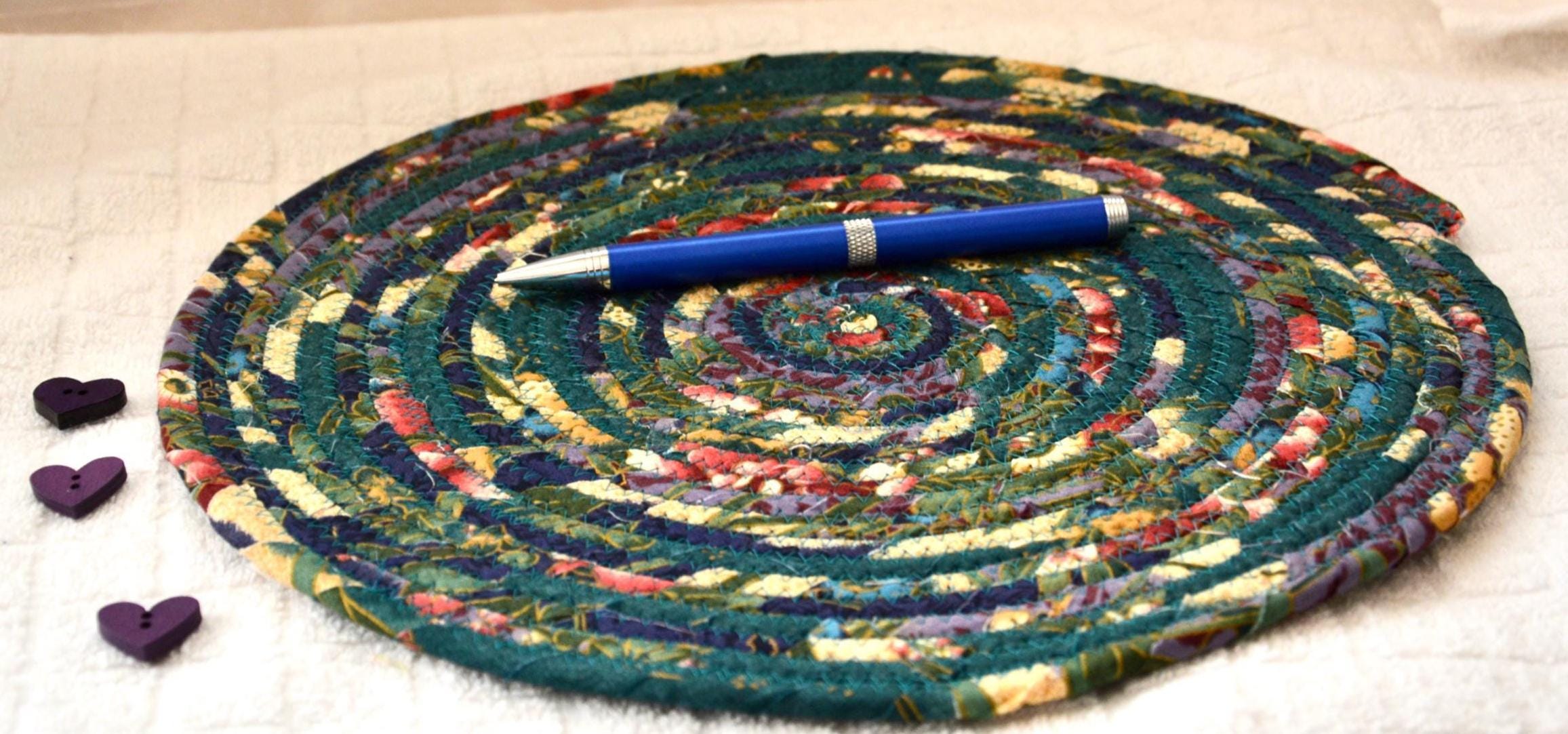 I hand wrapped this wonderful multi colored blue fabric around cotton line, which I then hand coiled and machine quilted to make it sturdy. I used the raw edge technique with some fray to add a shabby chic texture. I just love the gold metallic highlights. I created this pretty place mat in my smoke-free home studio. Spot clean. Pen, bead, ruler, mug props not included.