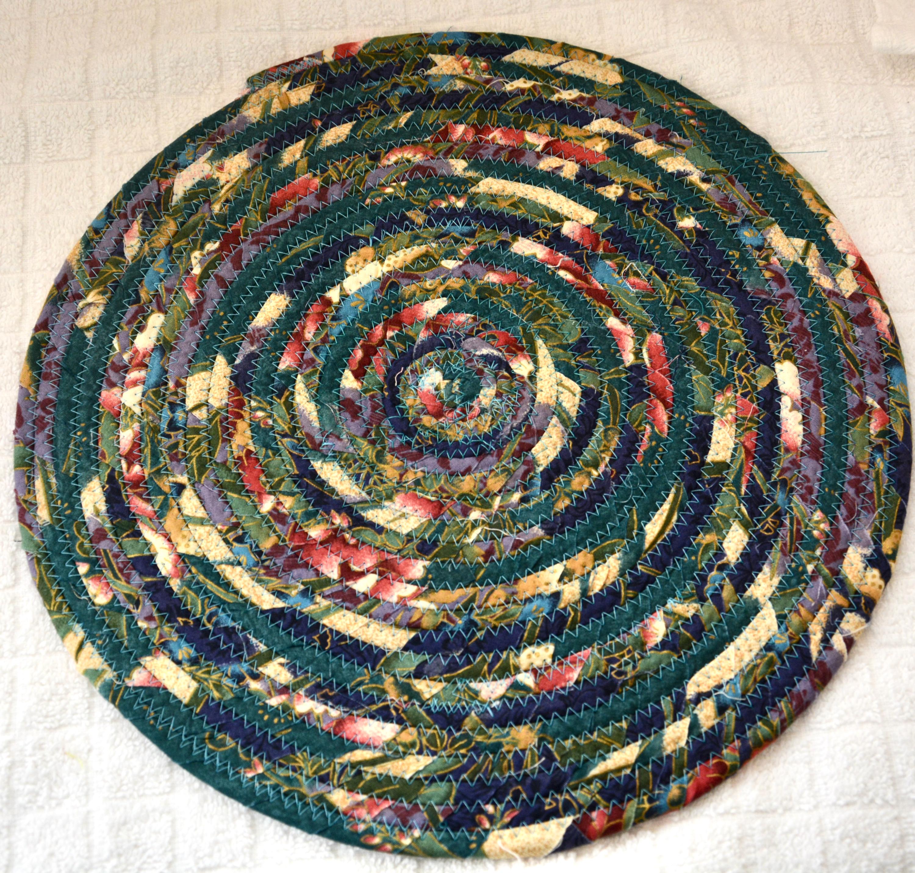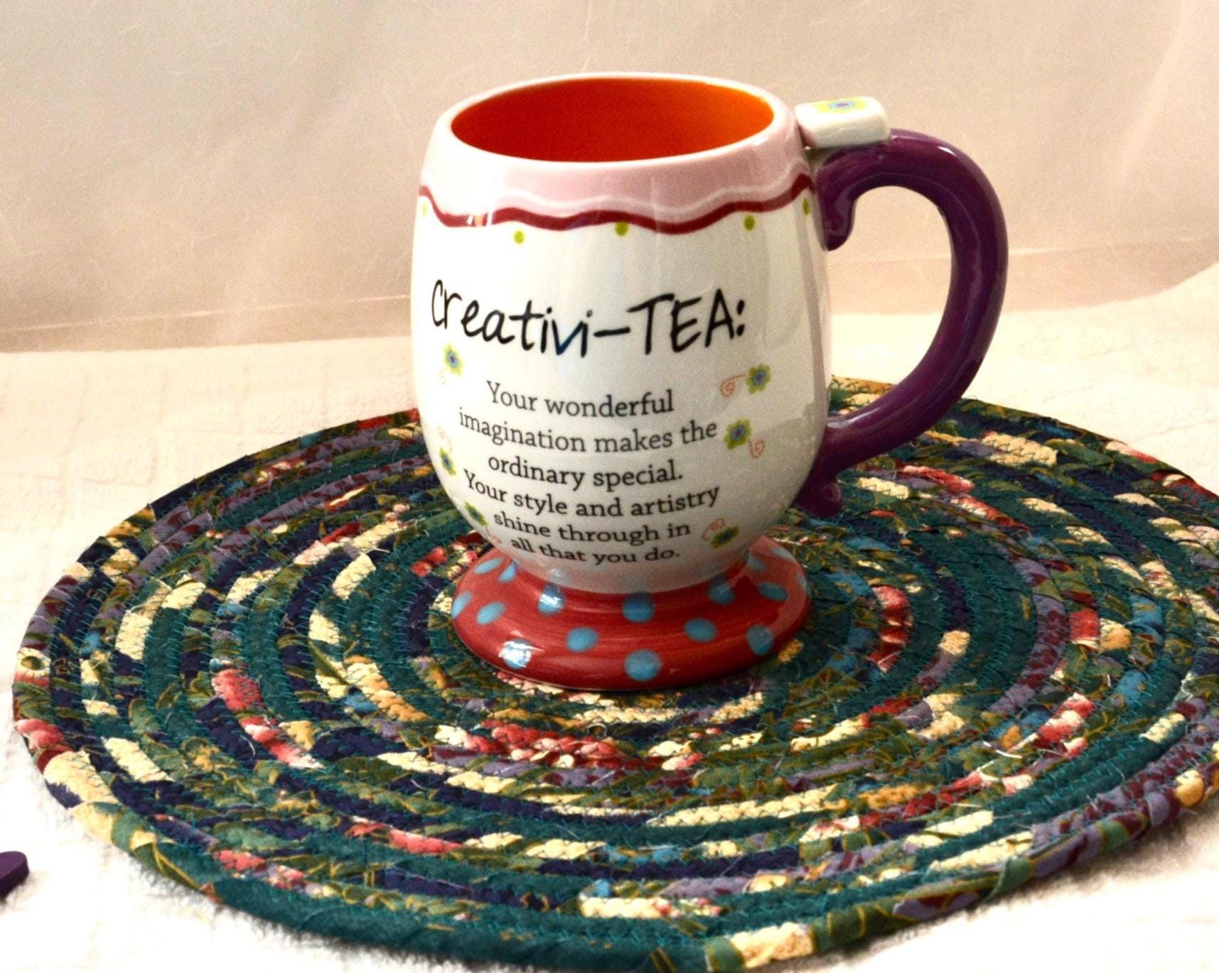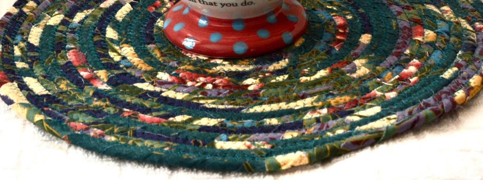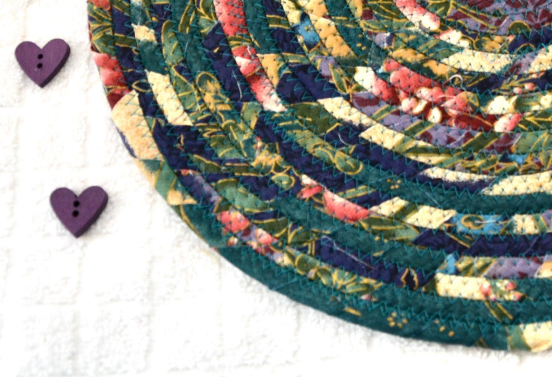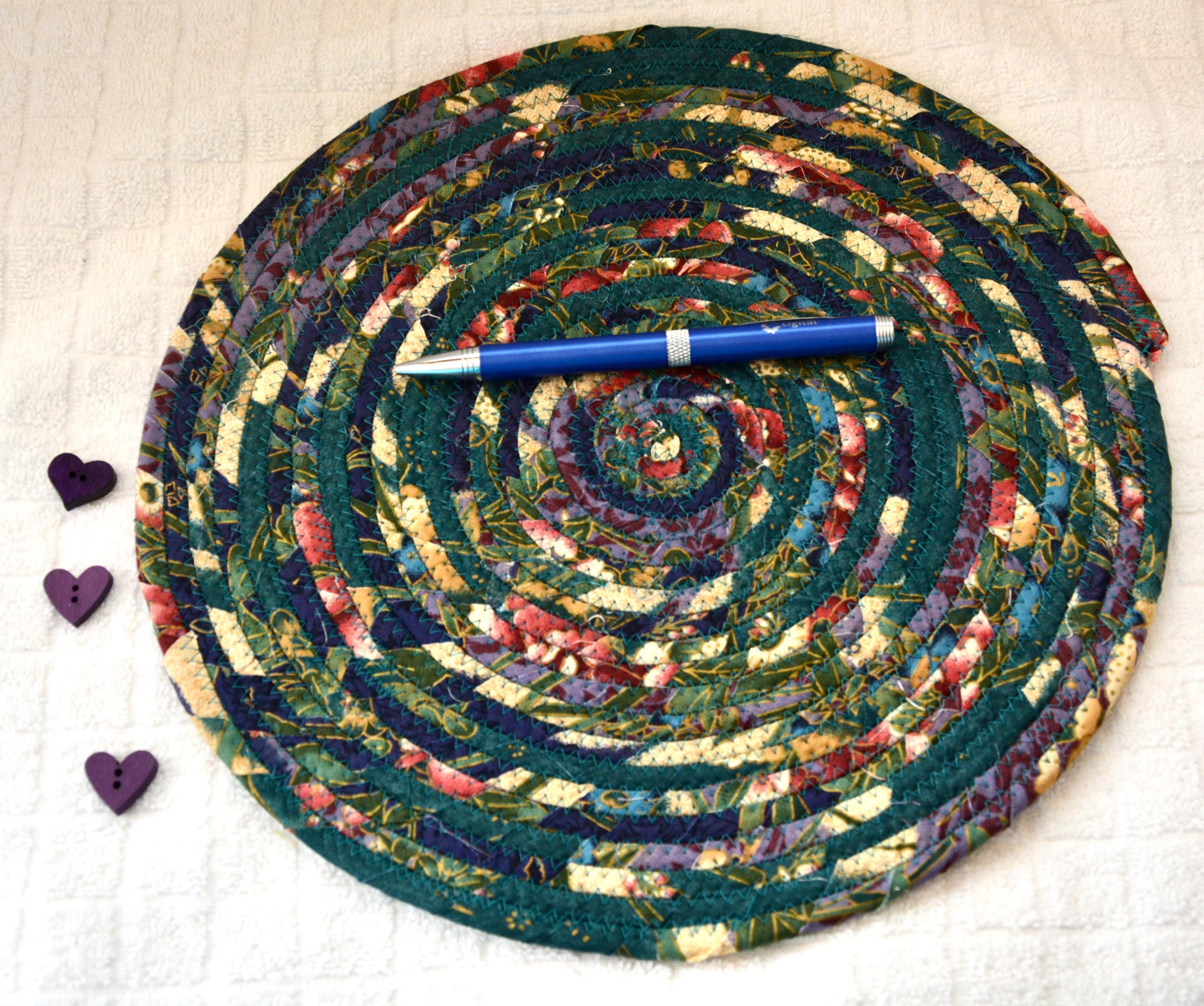 I hand wrapped this wonderful multi colored blue fabric around cotton line, which I then hand coiled and machine quilted to make it sturdy. I used the raw edge technique with some fray to add a shabby chic texture. I just love the gold metallic highlights. I created this pretty place mat in my smoke-free home studio. Spot clean. Pen, bead, ruler, mug props not included.