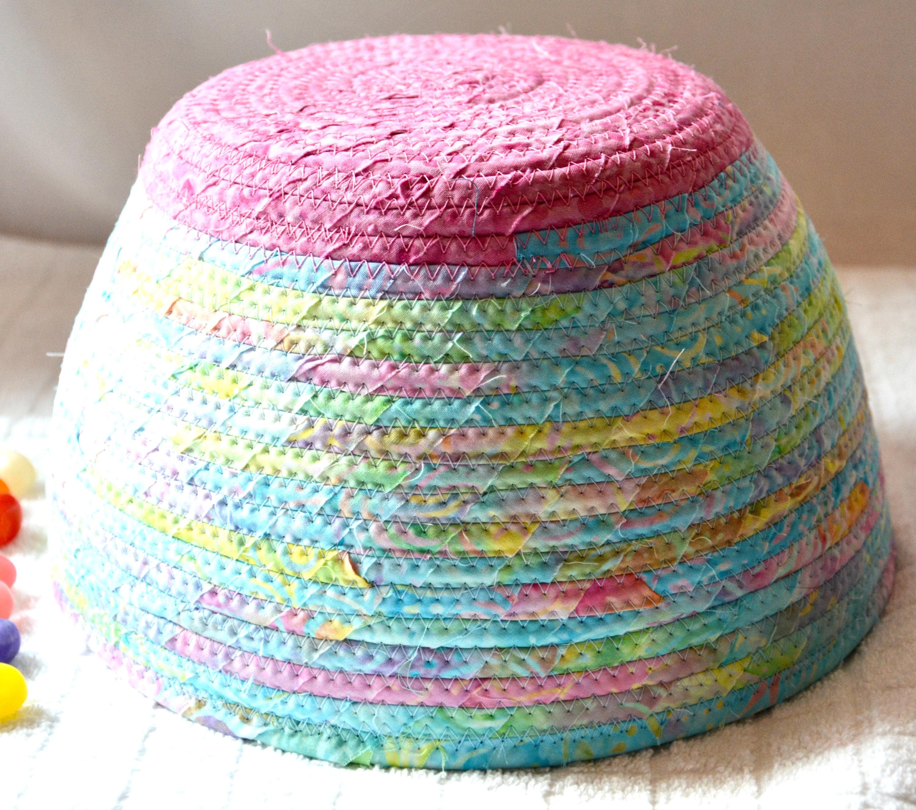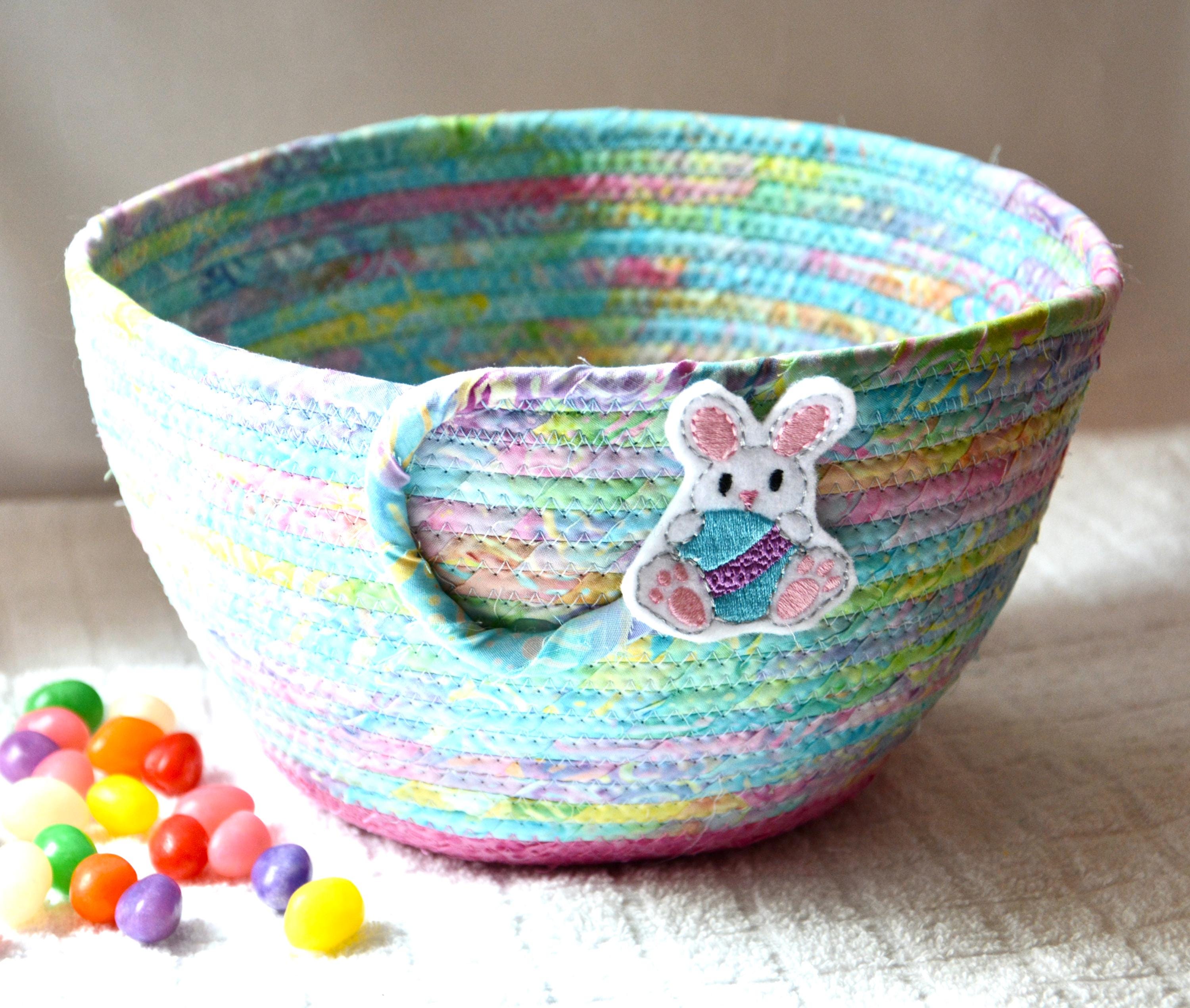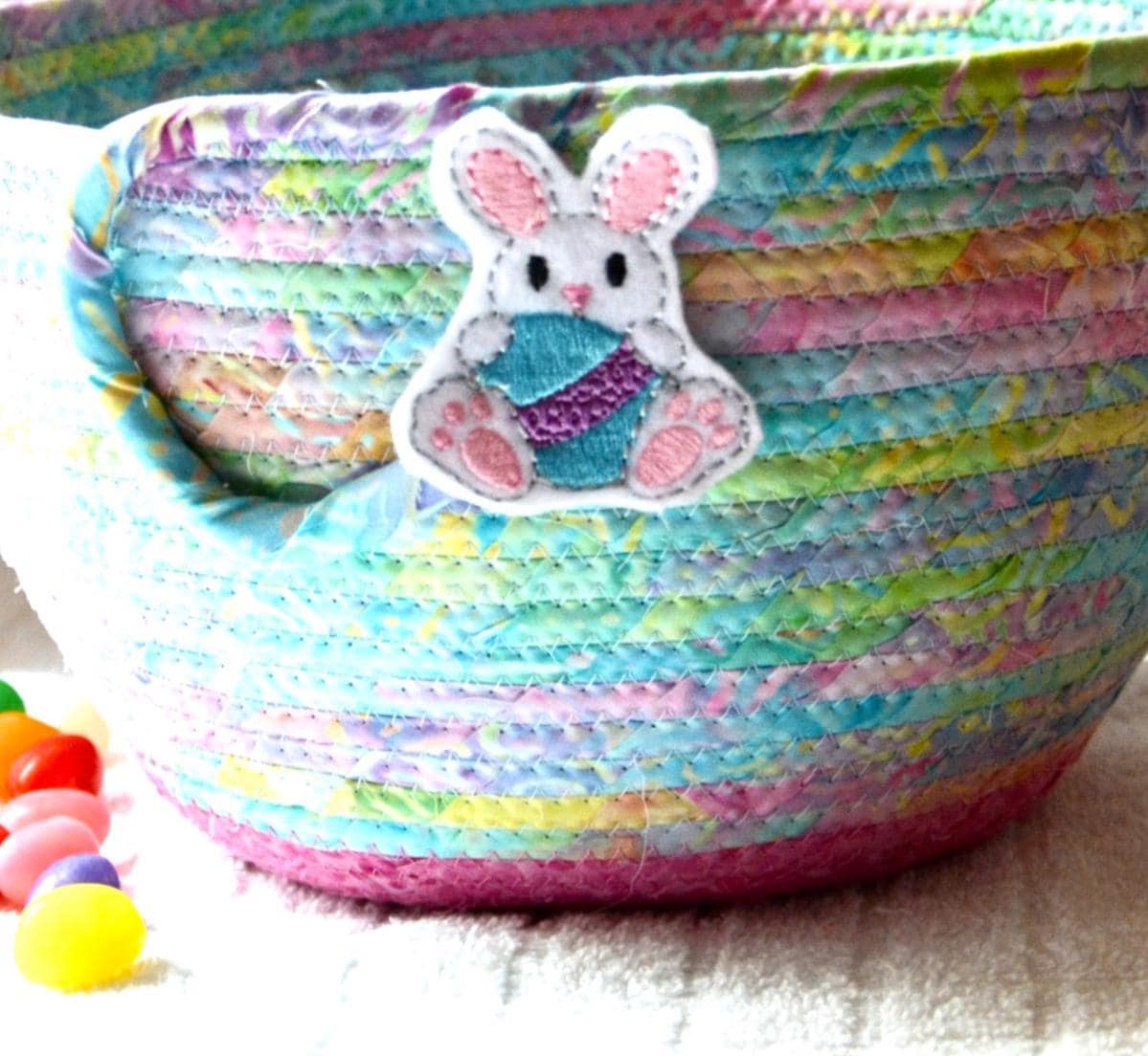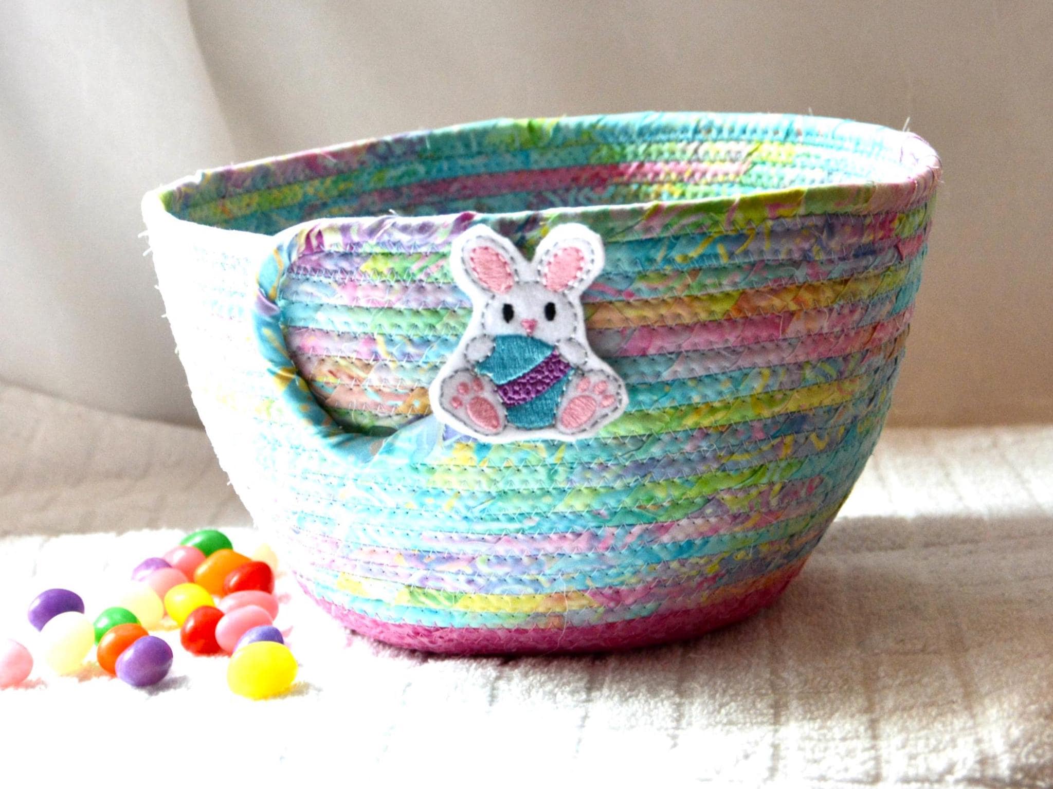 I hand wrapped these lovely high quality batik fabrics around cotton line, which I then hand coiled and machine sewed to make the basket sturdy. I used the raw edge technique with some fray to give it texture. I used 2 different beautiful batik fabrics and both are 100% cotton and show on the inside too! The cute bunny on the basket is included for a nice accent.