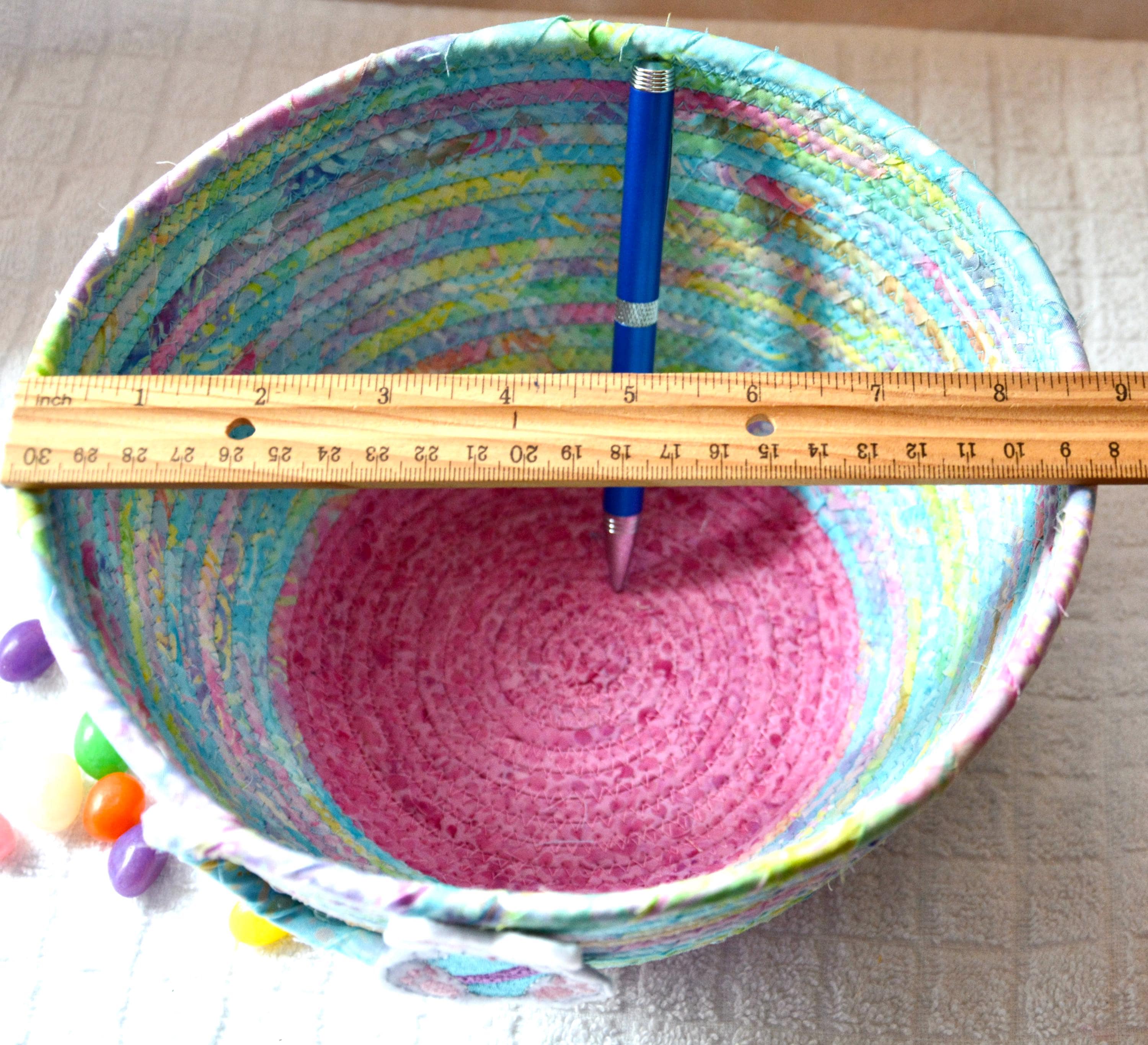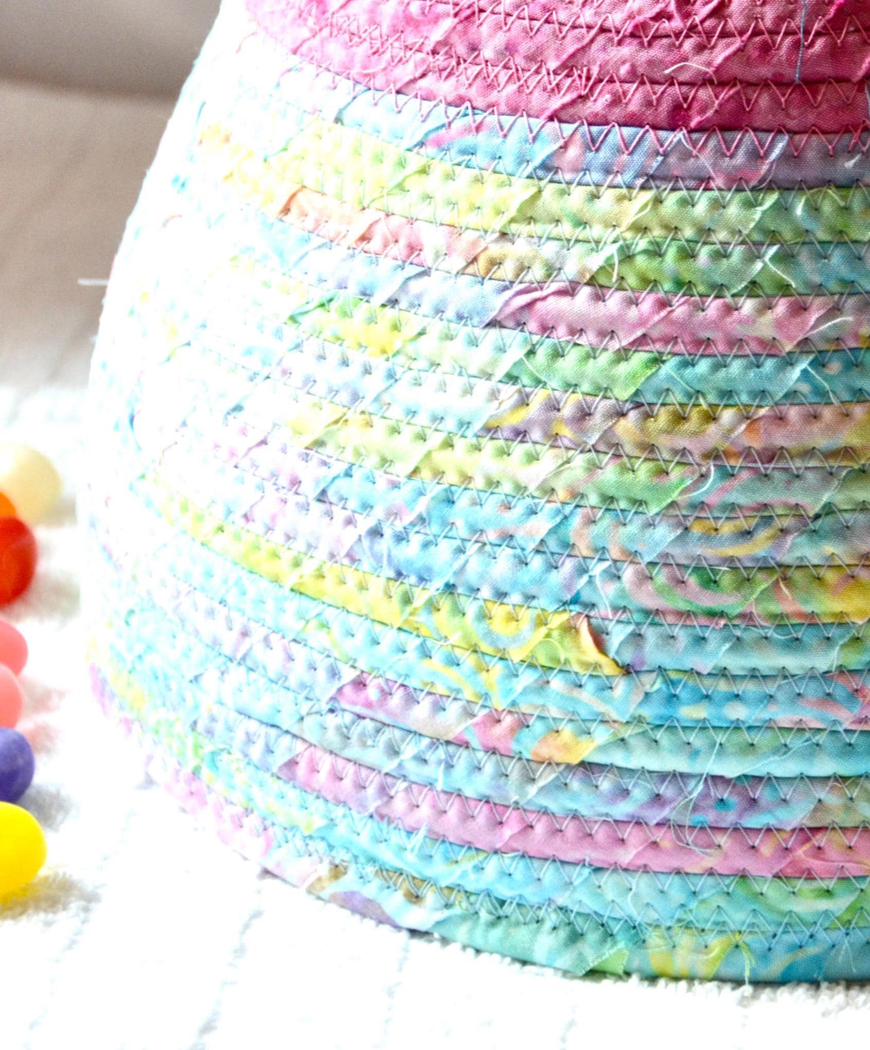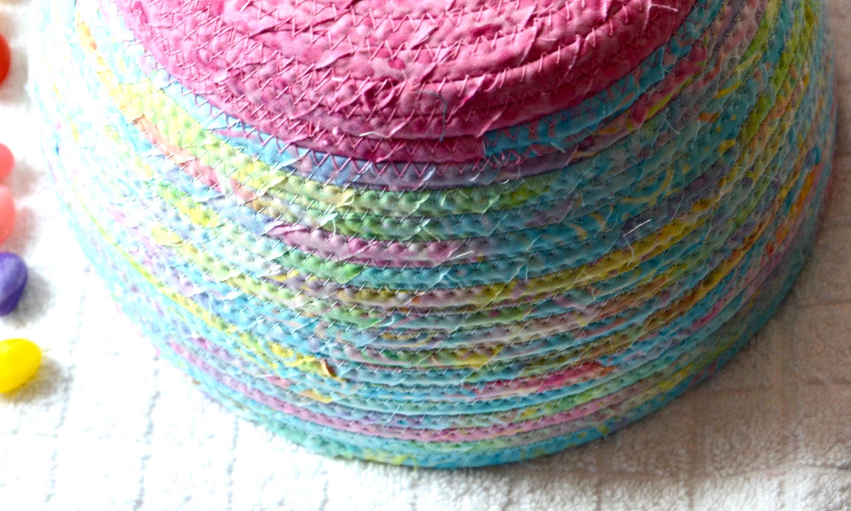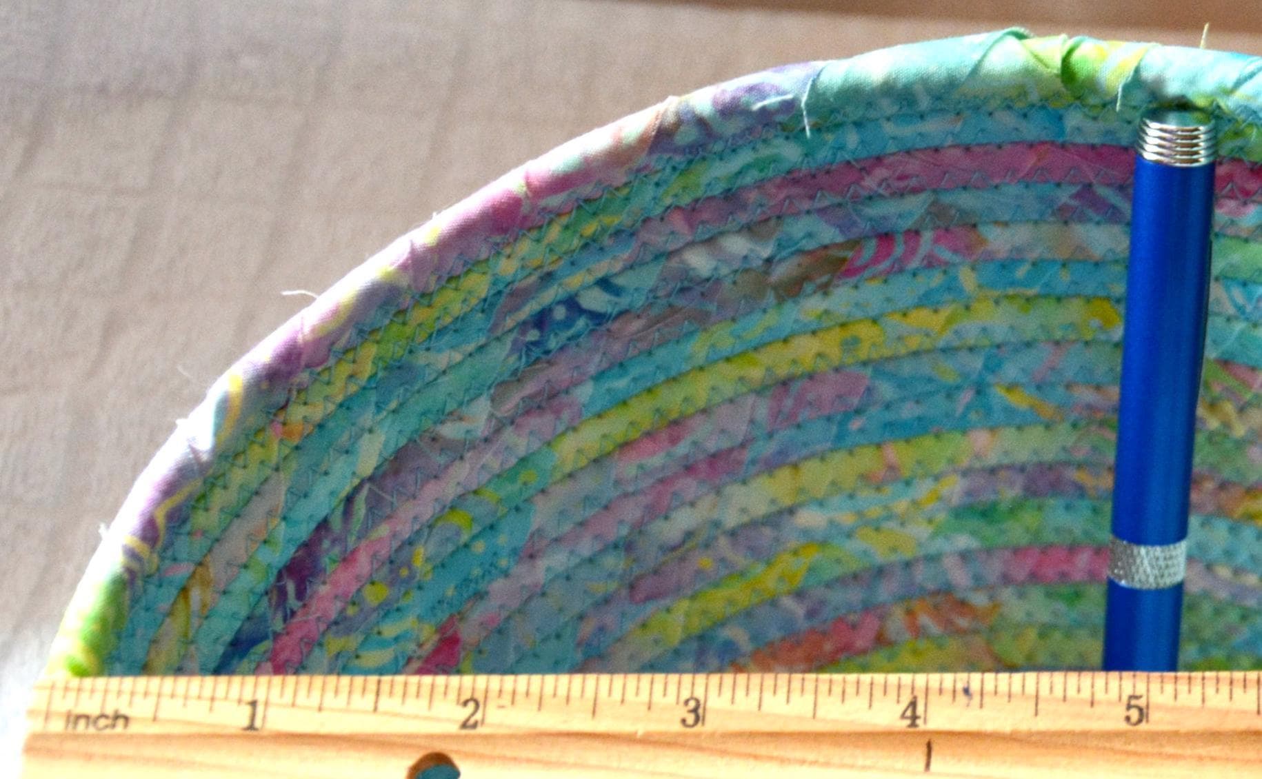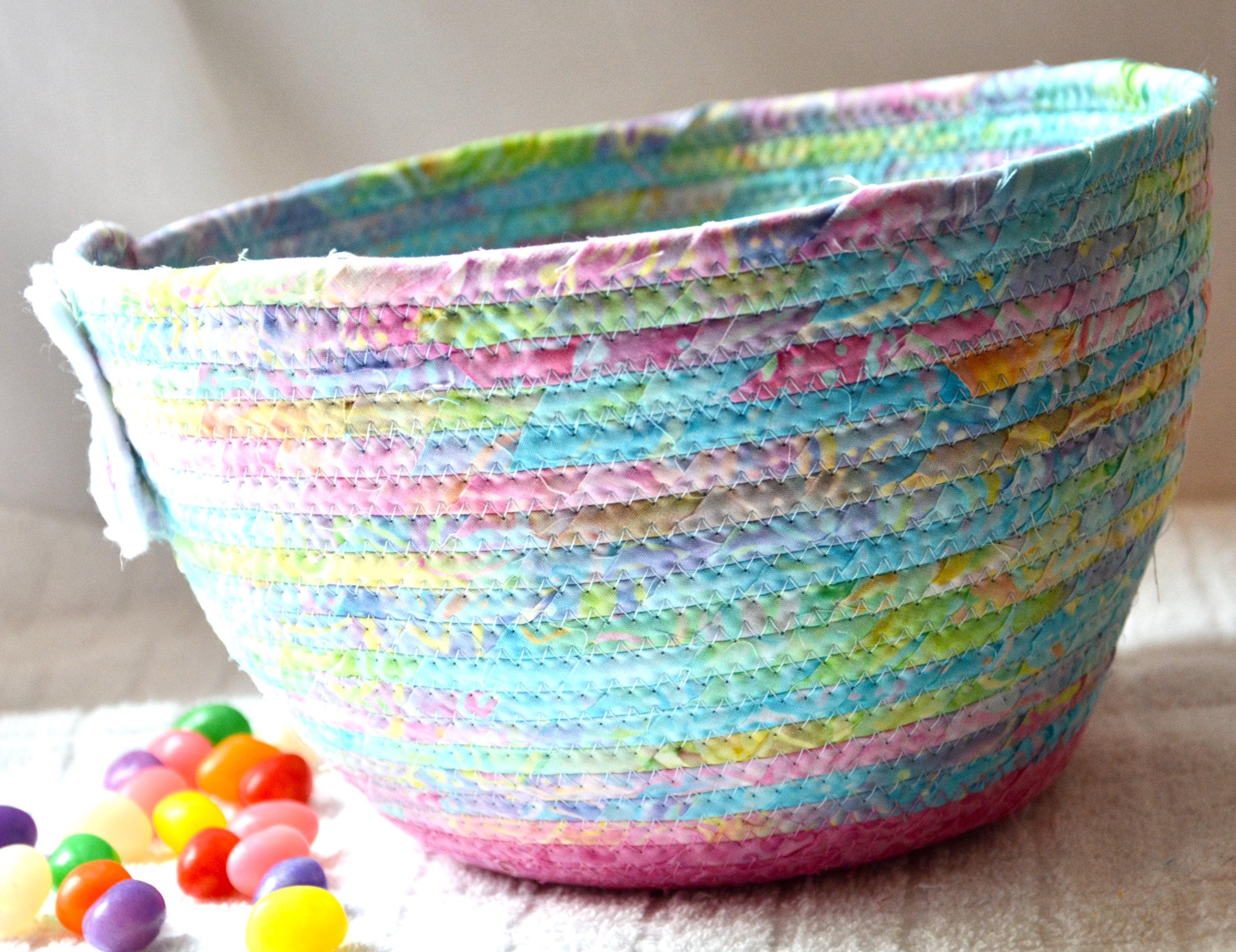 I hand wrapped these lovely high quality batik fabrics around cotton line, which I then hand coiled and machine sewed to make the basket sturdy. I used the raw edge technique with some fray to give it texture. I used 2 different beautiful batik fabrics and both are 100% cotton and show on the inside too! The cute bunny on the basket is included for a nice accent.