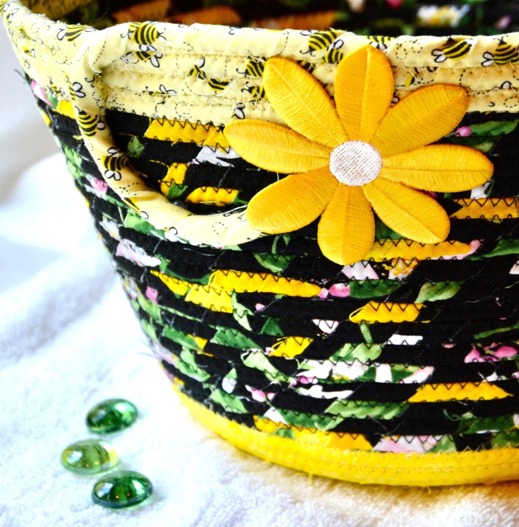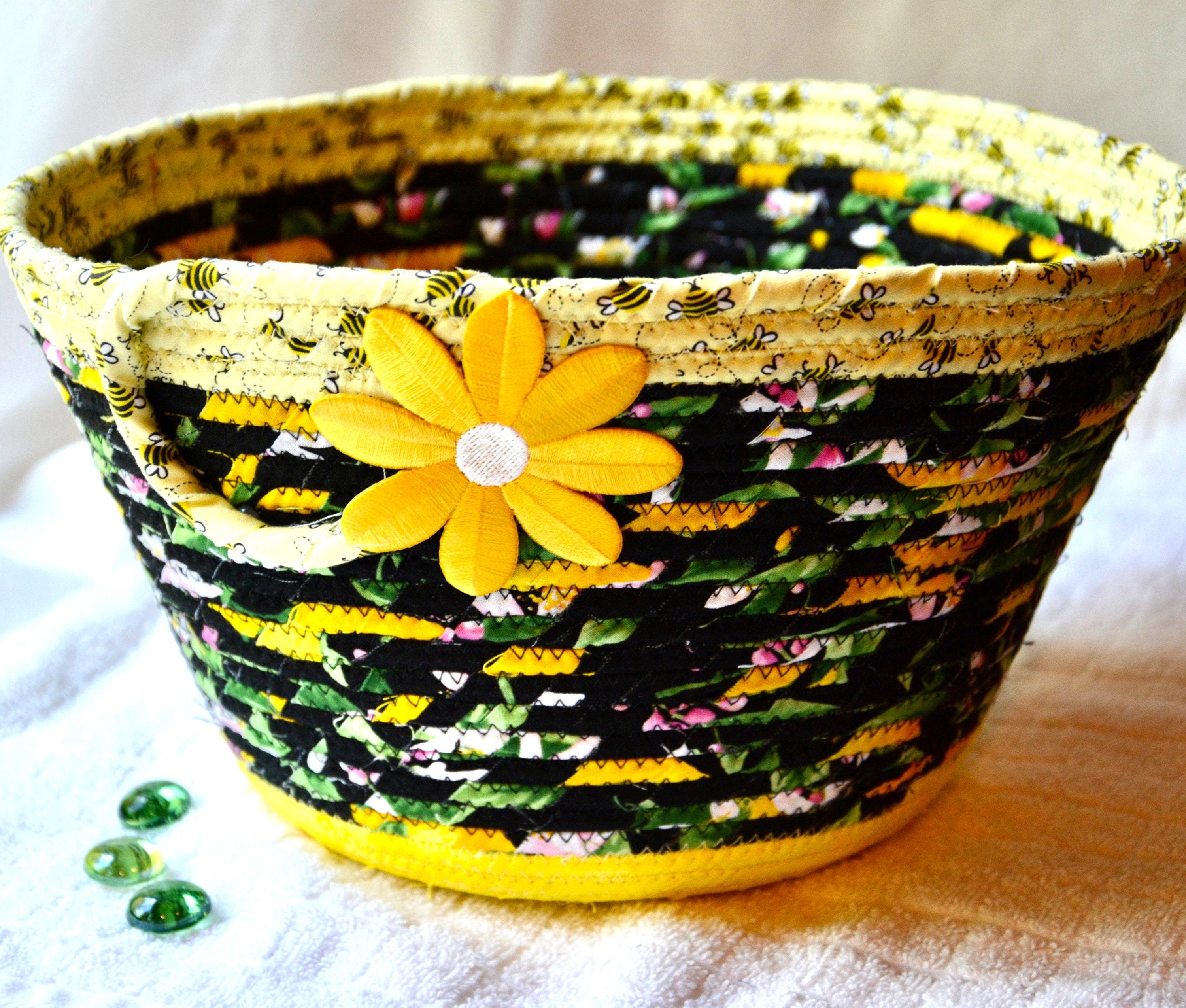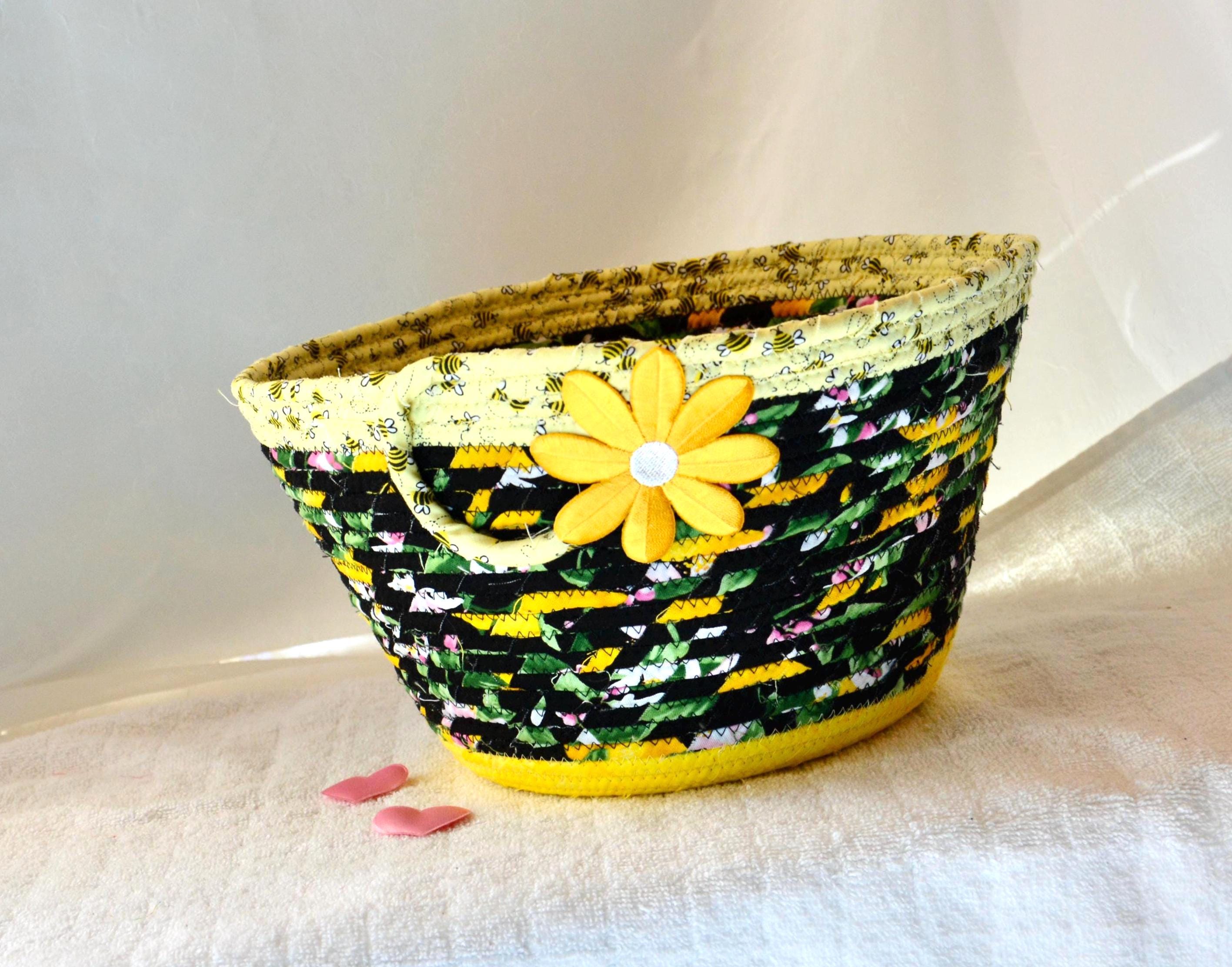 I hand wrapped these fun black and yellow fabrics around cotton line, which I then hand coiled and machine quilted to make it sturdy. I used the raw edge technique with some fray to give it a lovely shabby chic texture. All fabrics are 100% cotton! The pretty flower on the basket is also included for a nice accent.