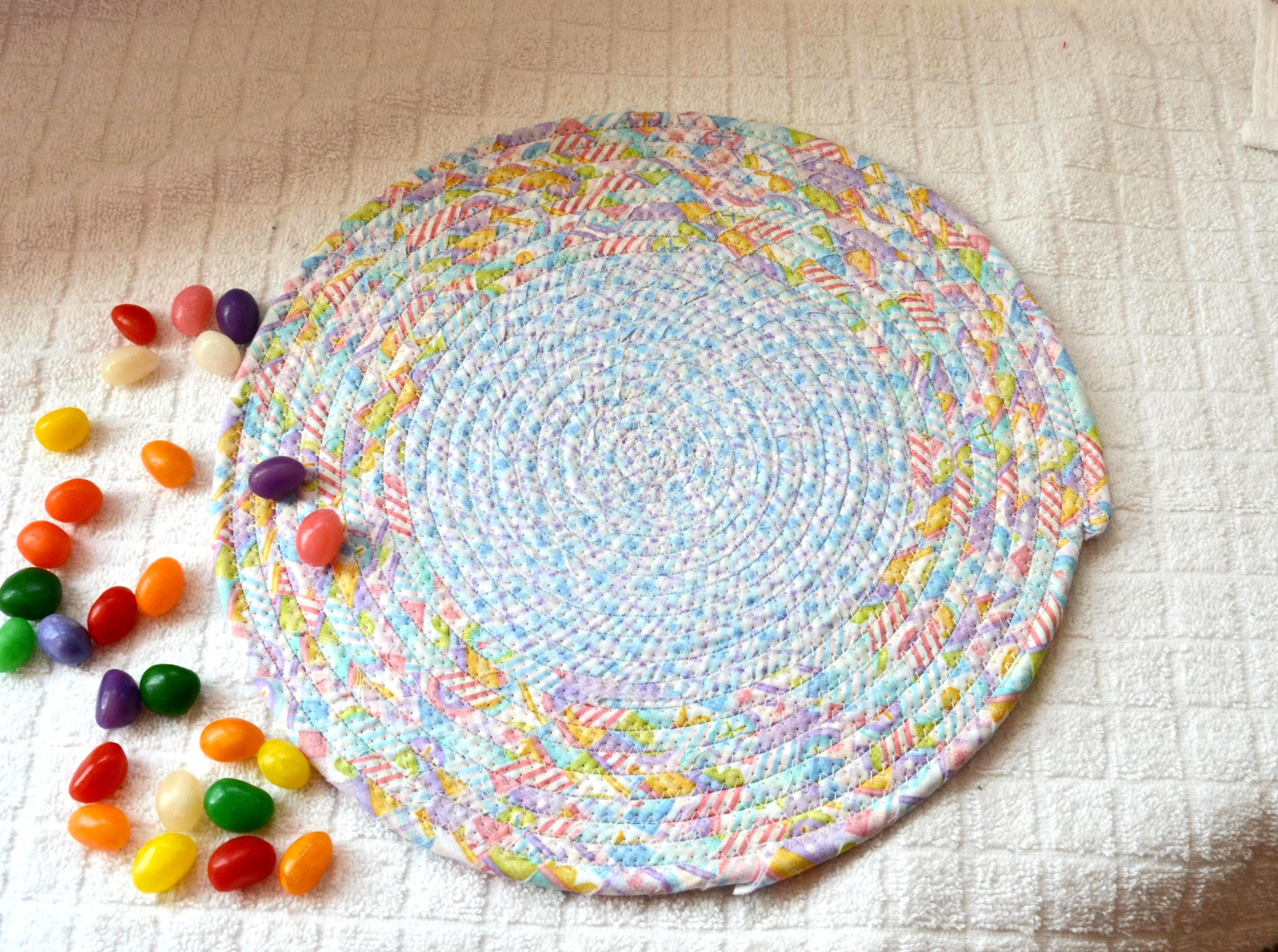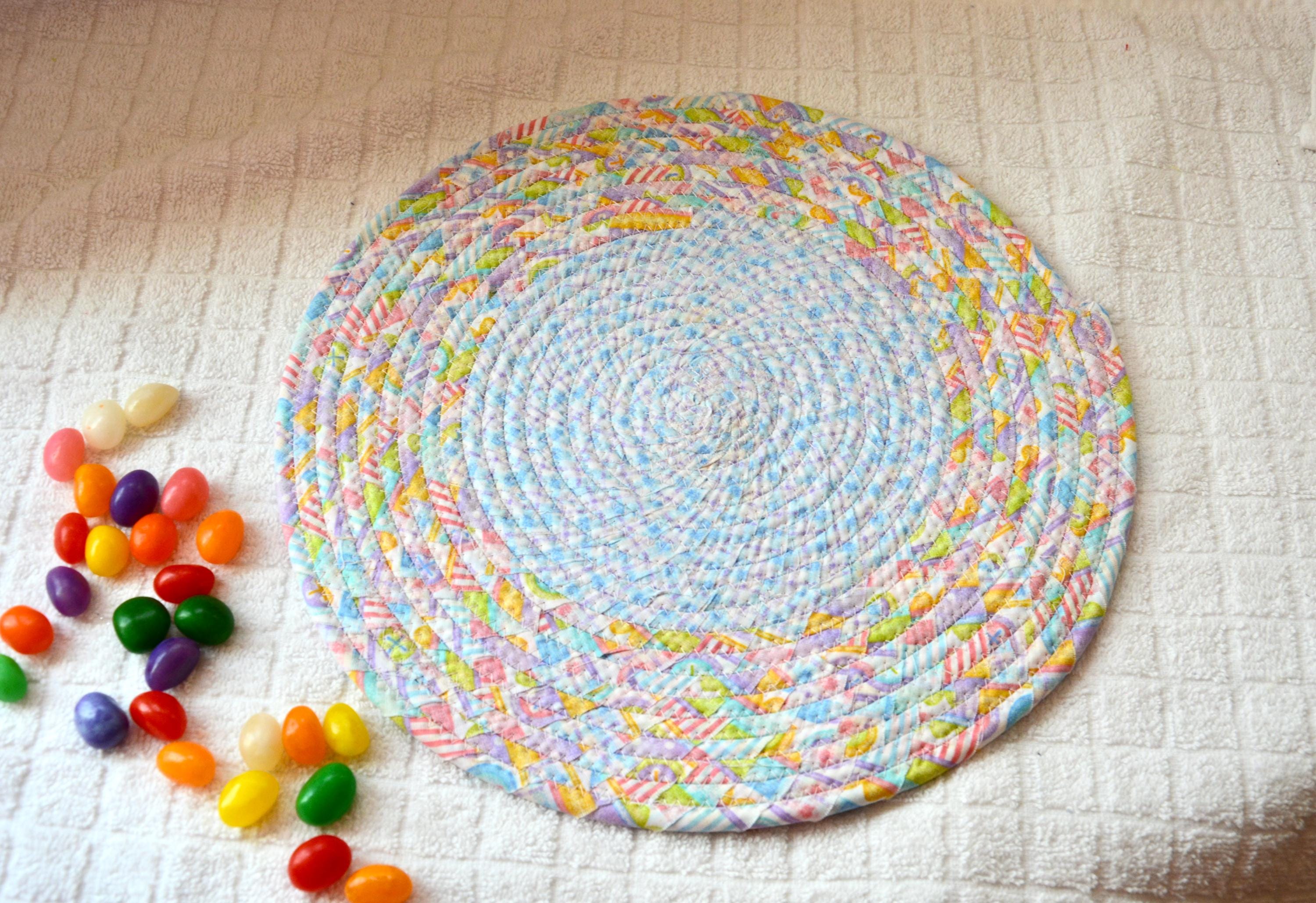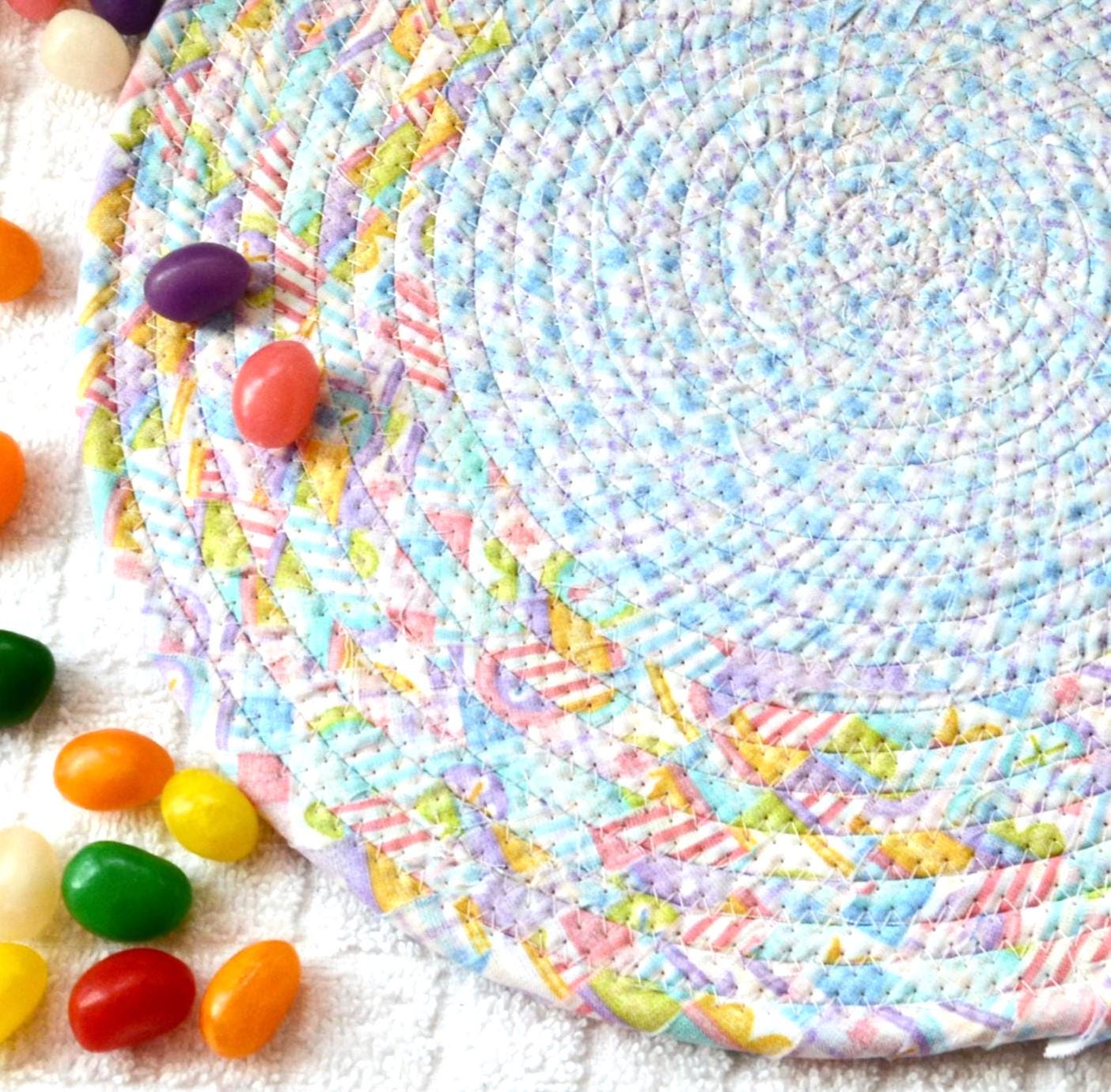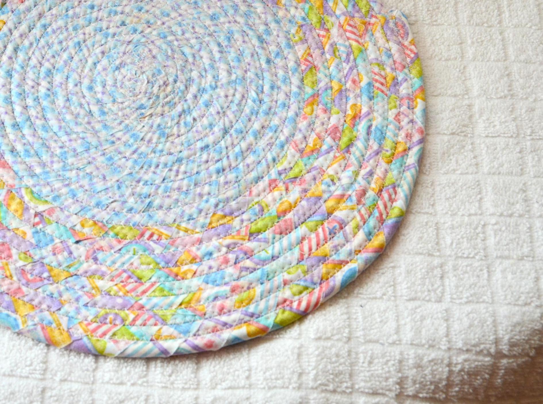 I hand wrapped these pretty fabrics around cotton line, which I then hand coiled and machine quilted to make it sturdy. I used the raw edge technique with some fray adding a nice shabby chic texture. All are 100% cotton fabrics and show on both sides of the trivet too! The pattern created is so unique! OOAK!