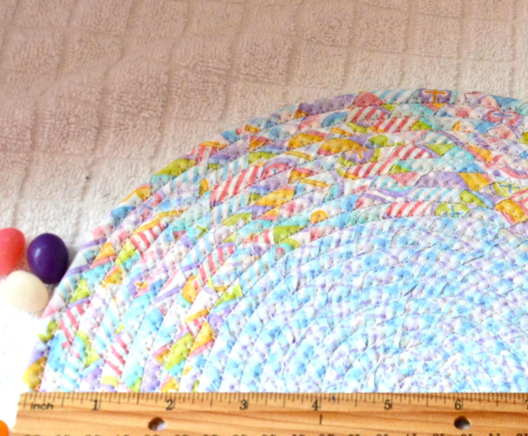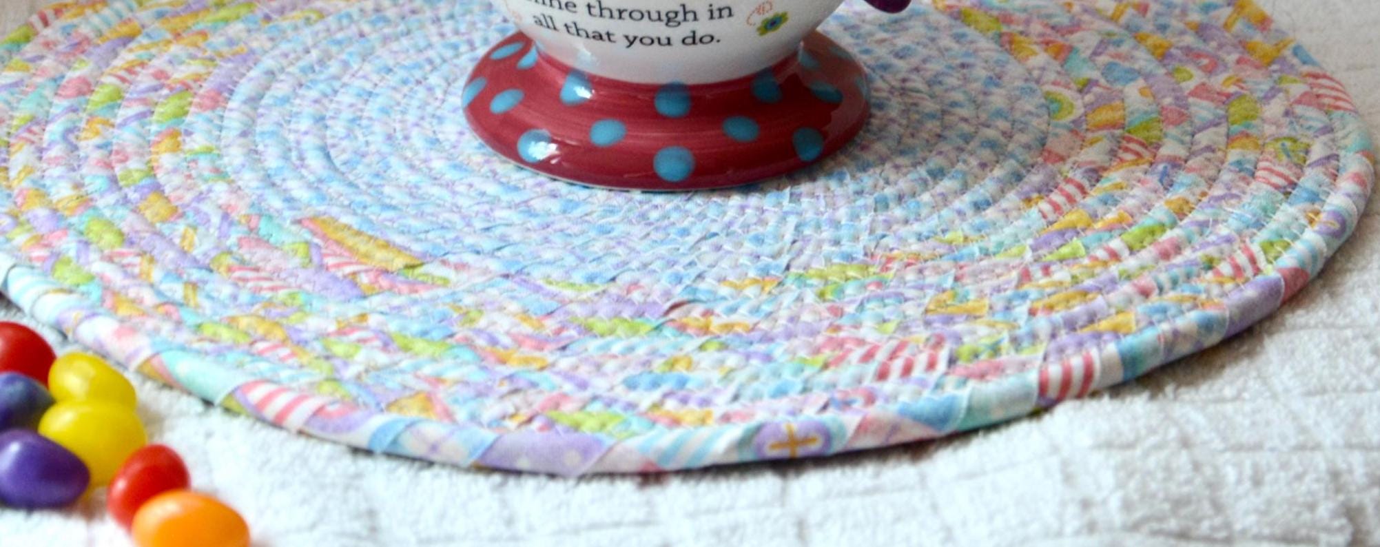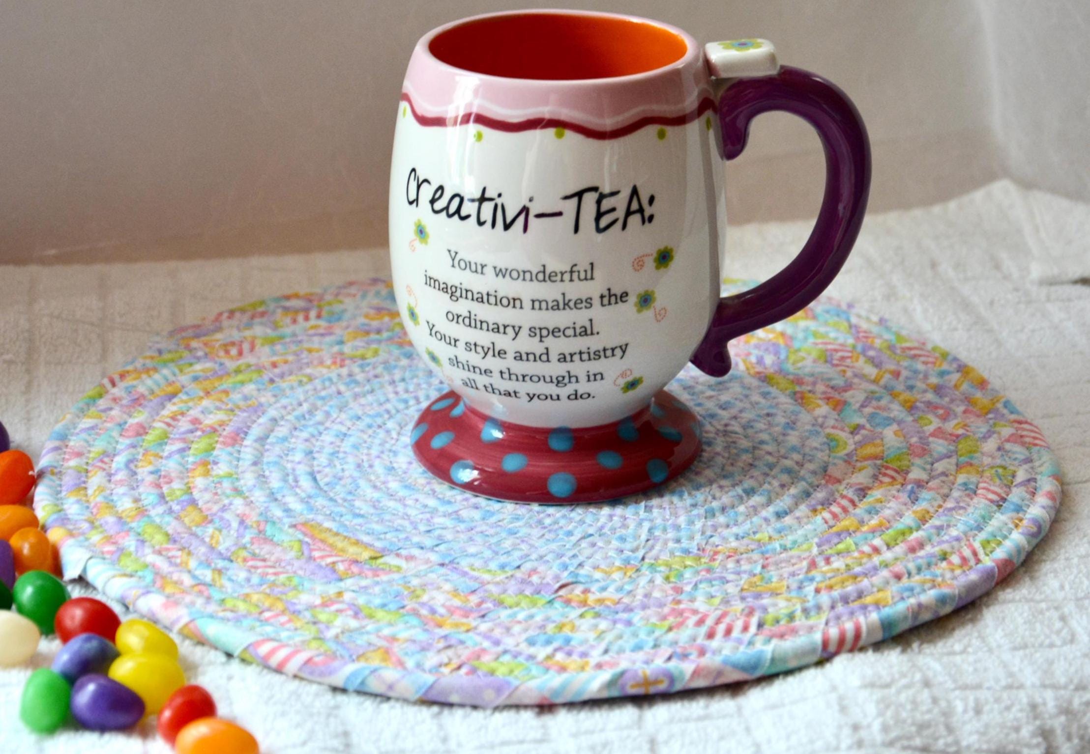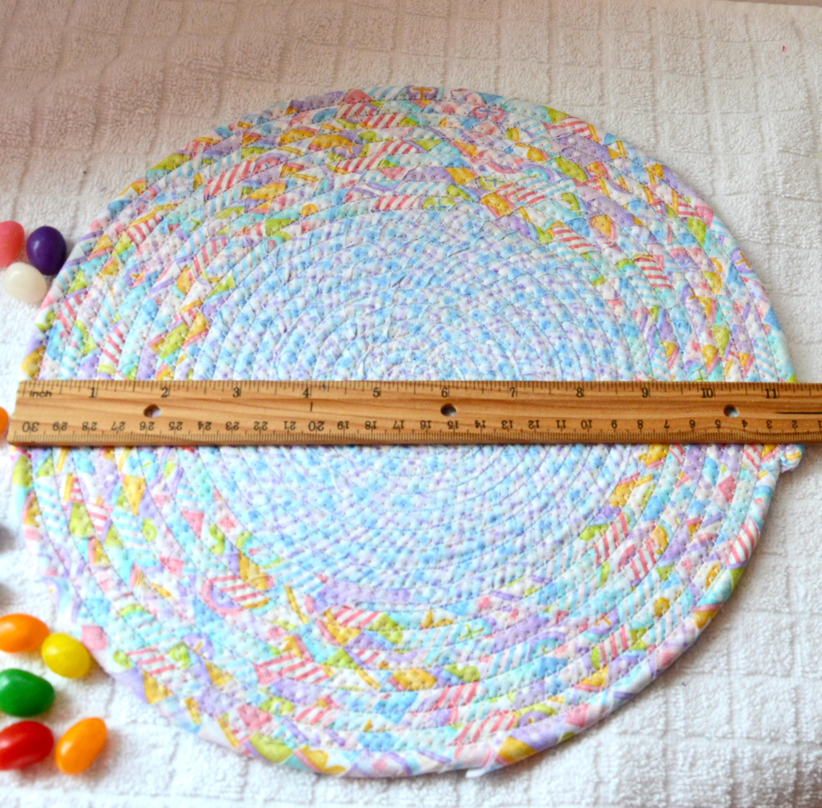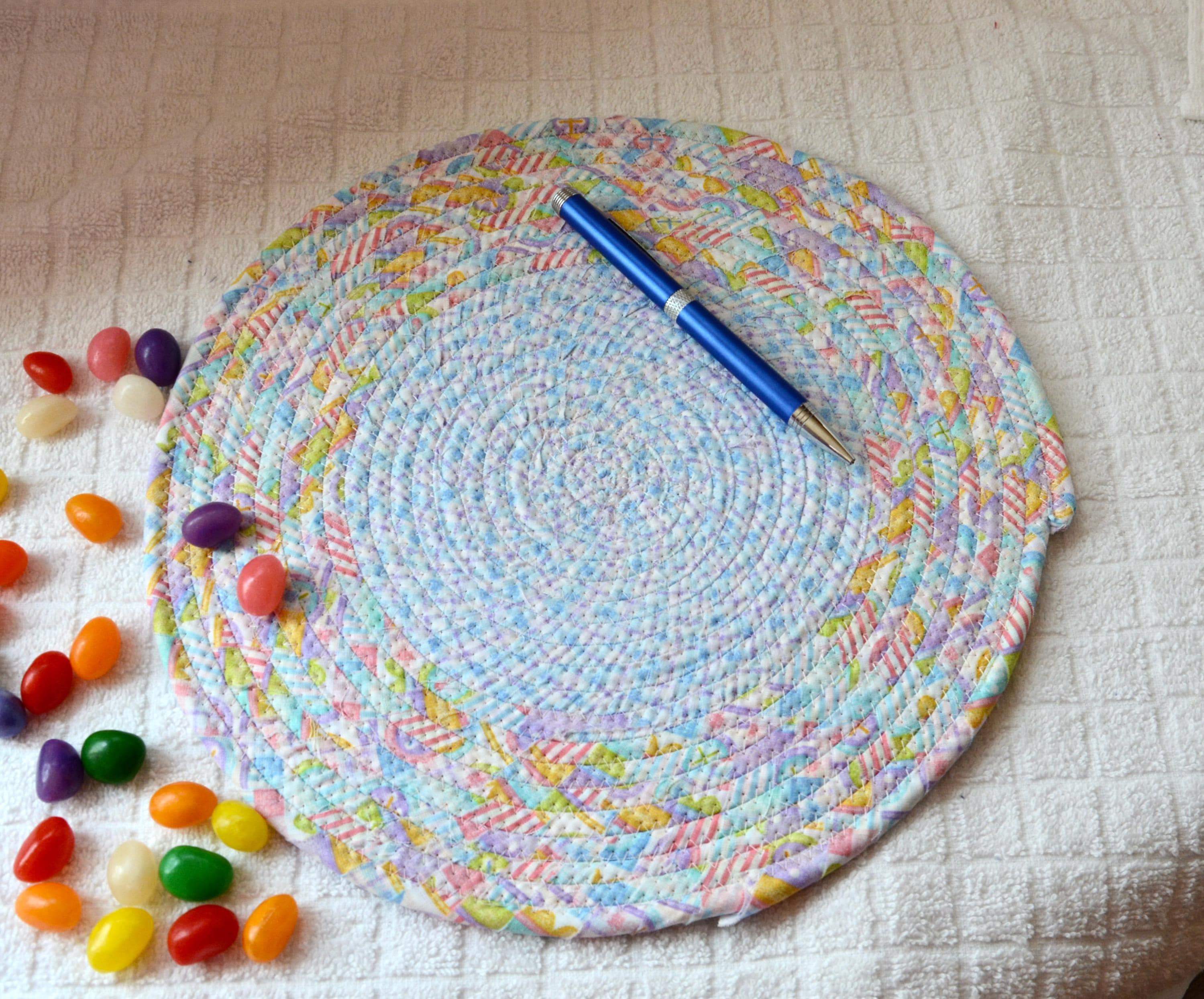 I hand wrapped these pretty fabrics around cotton line, which I then hand coiled and machine quilted to make it sturdy. I used the raw edge technique with some fray adding a nice shabby chic texture. All are 100% cotton fabrics and show on both sides of the trivet too! The pattern created is so unique! OOAK!