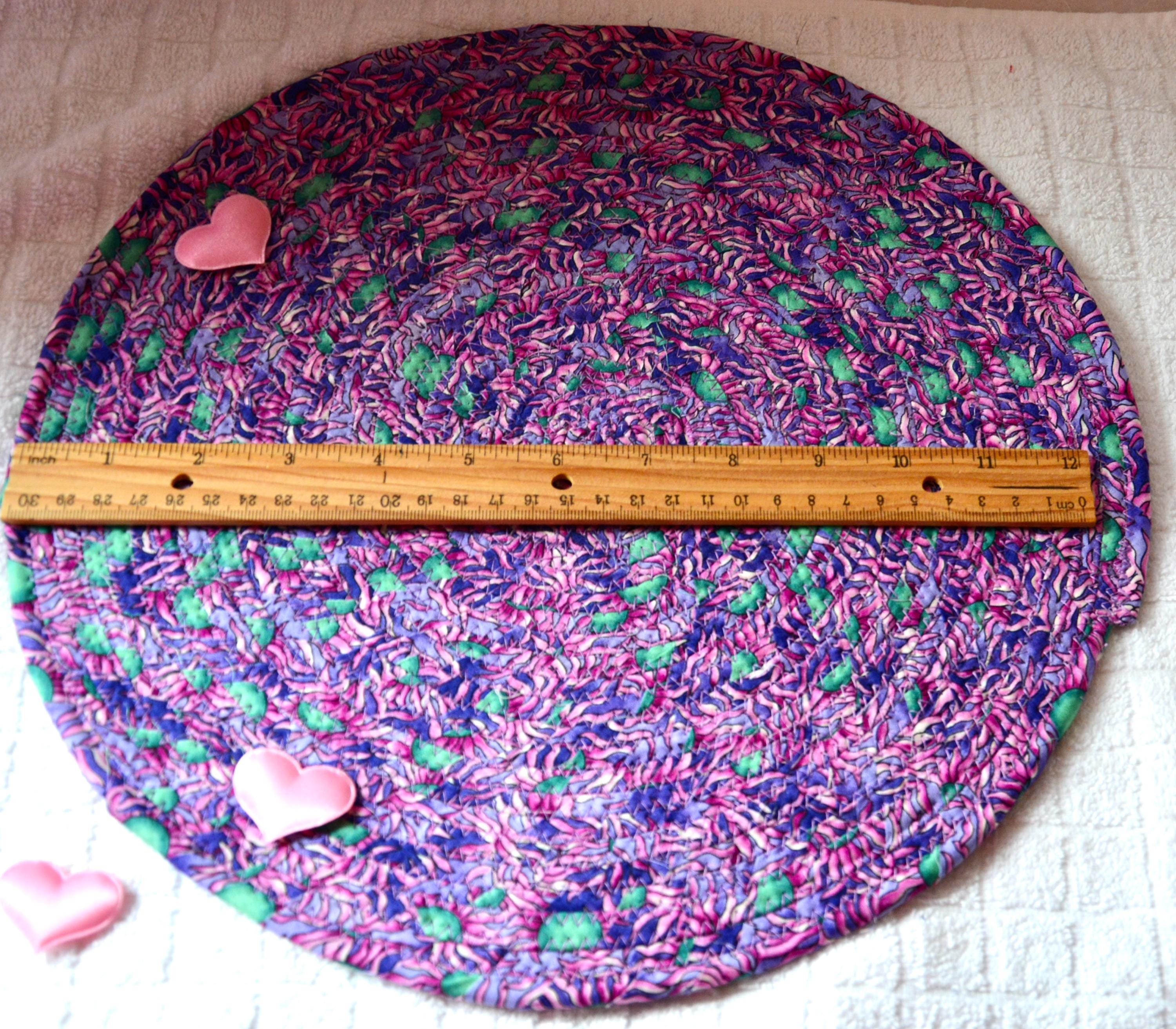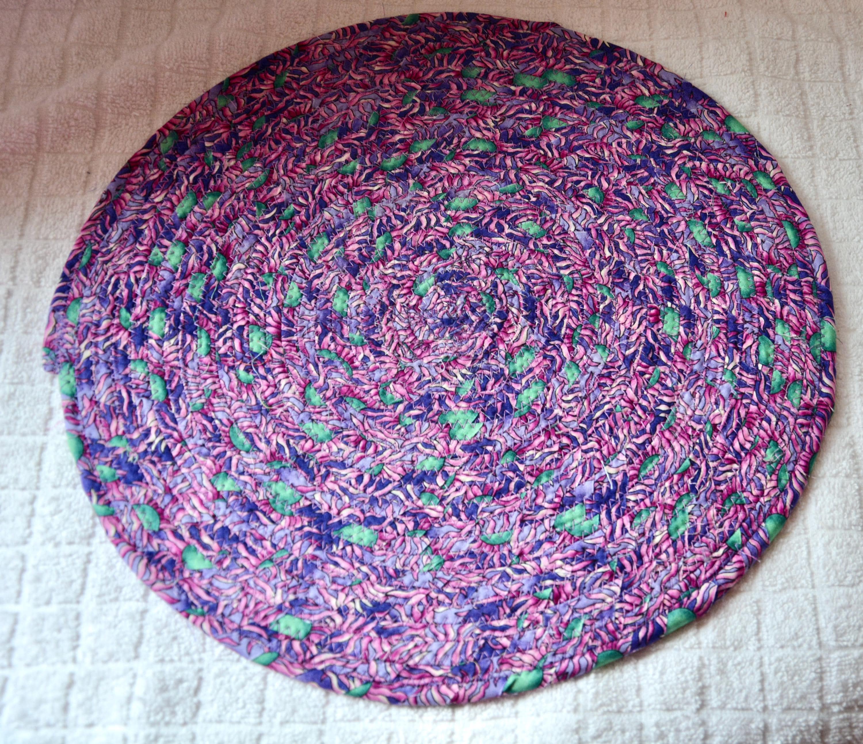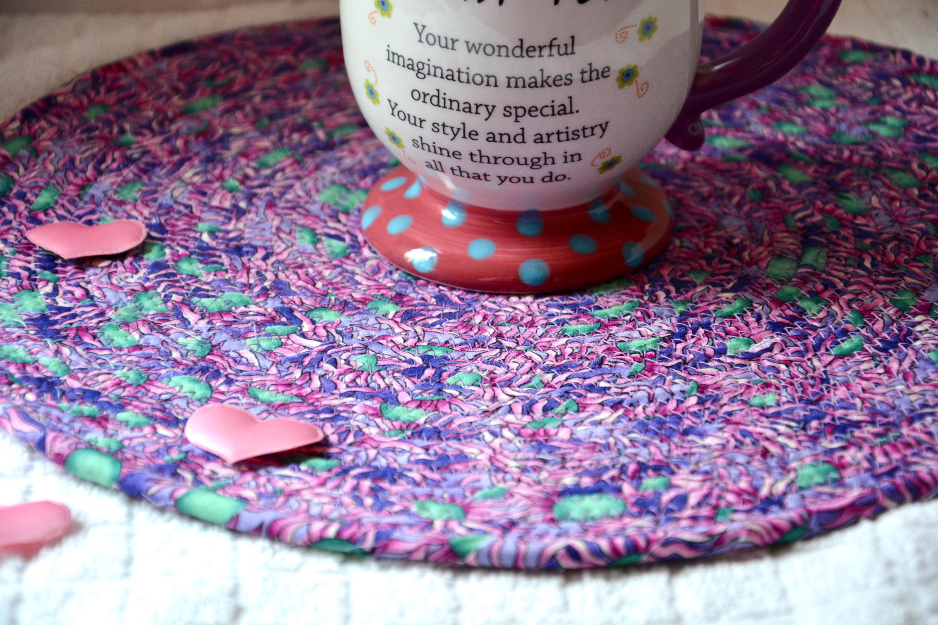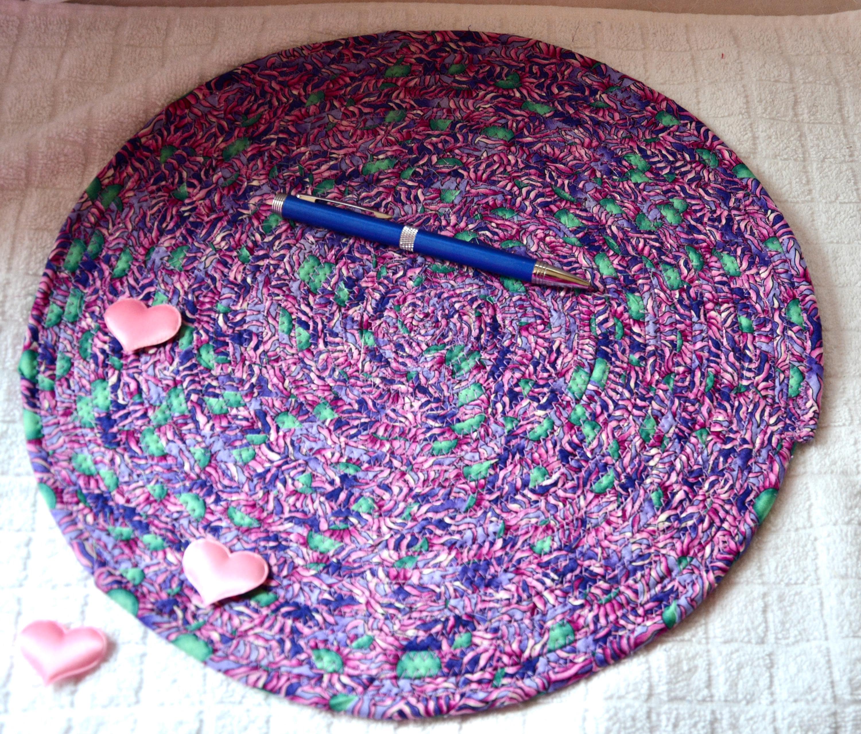 I hand wrapped this wonderful multi colored fabric around cotton line, which I then hand coiled and machine quilted to make it sturdy. I used the raw edge technique with some fray to add a shabby chic texture. I just love the green highlights. I created this pretty place mat in my smoke-free home studio. Spot clean. Pen, bead, ruler, mug props not included.