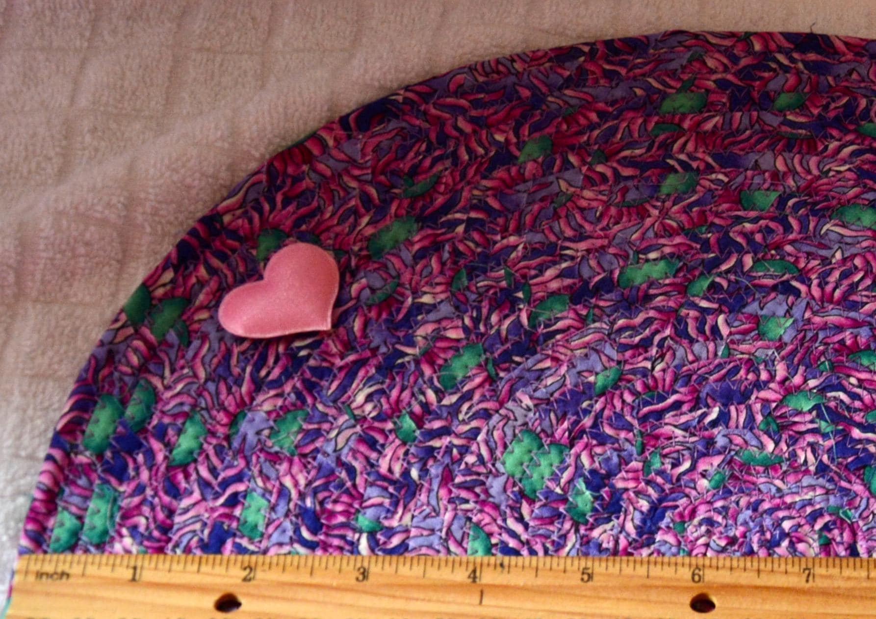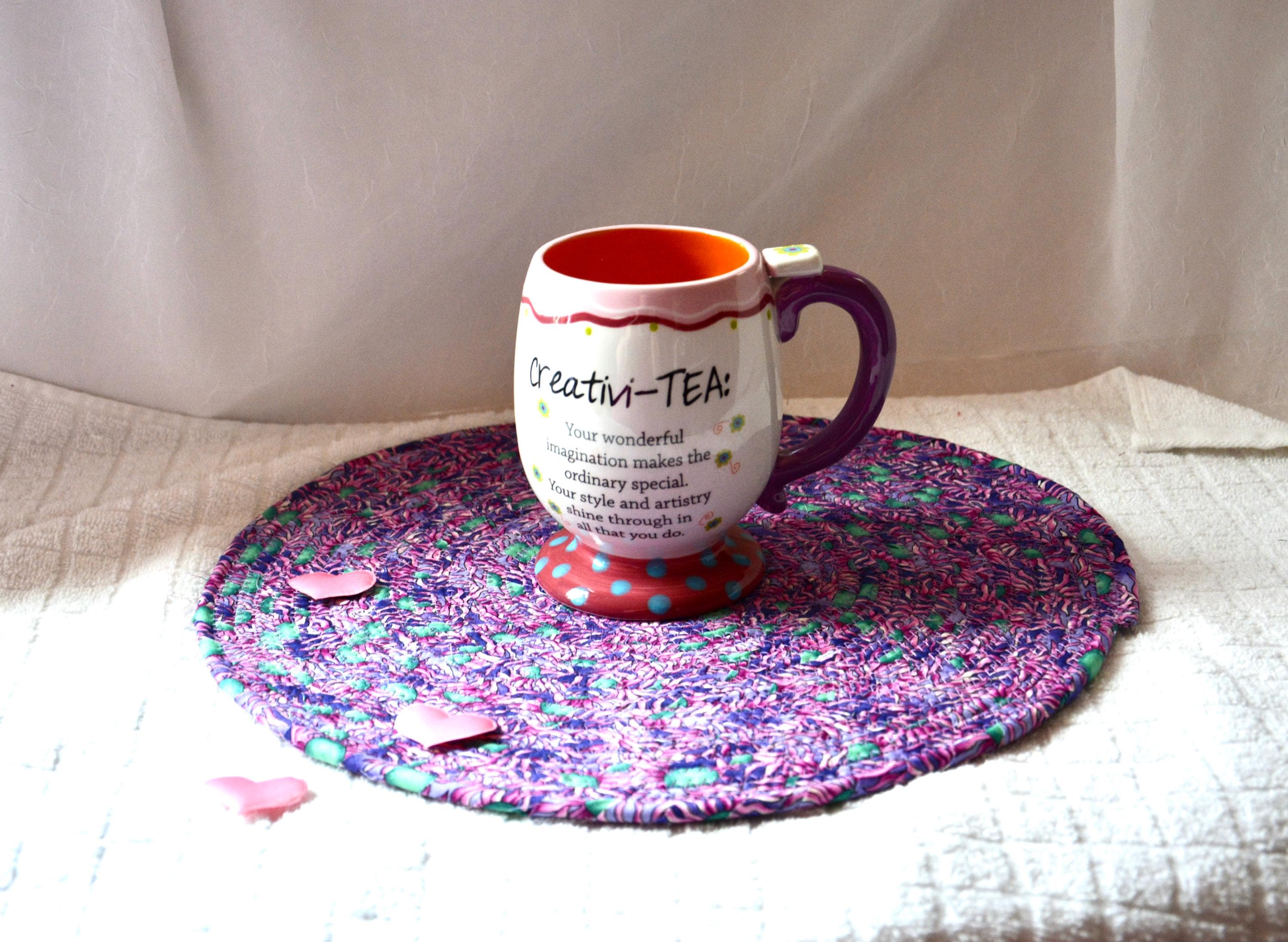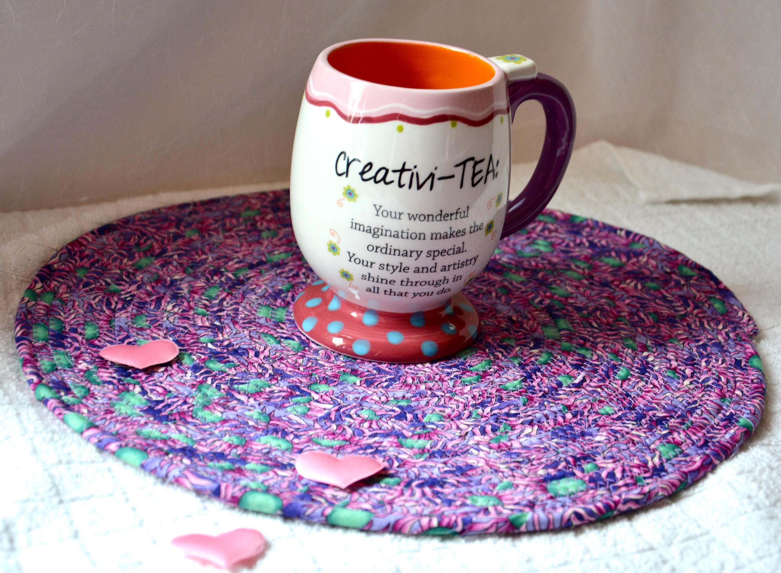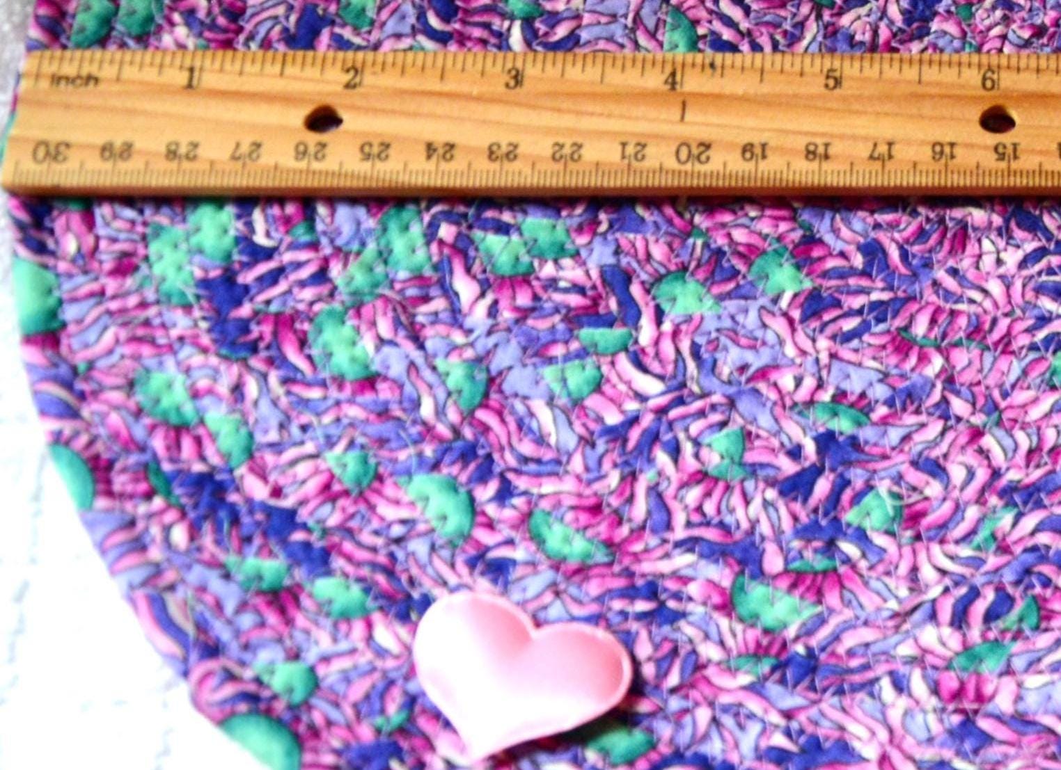 I hand wrapped this wonderful multi colored fabric around cotton line, which I then hand coiled and machine quilted to make it sturdy. I used the raw edge technique with some fray to add a shabby chic texture. I just love the green highlights. I created this pretty place mat in my smoke-free home studio. Spot clean. Pen, bead, ruler, mug props not included.