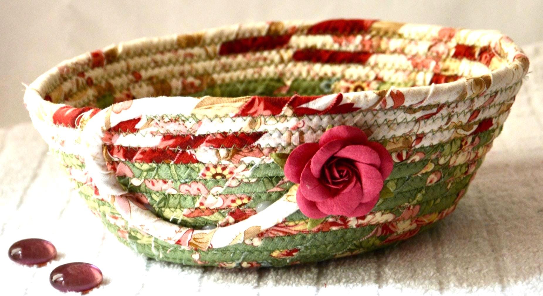 I hand wrapped this pretty floral fabric around cotton line, which I then hand coiled and machine quilted to make it sturdy. I used the raw edge technique with some fray for a great shabby chic texture. I added a lovely green fabric to the base for a lovely contrast. The pretty flower on the basket is included for a nice accent. Both of these lovely fabrics are 100% cotton and show on the inside of the basket too!