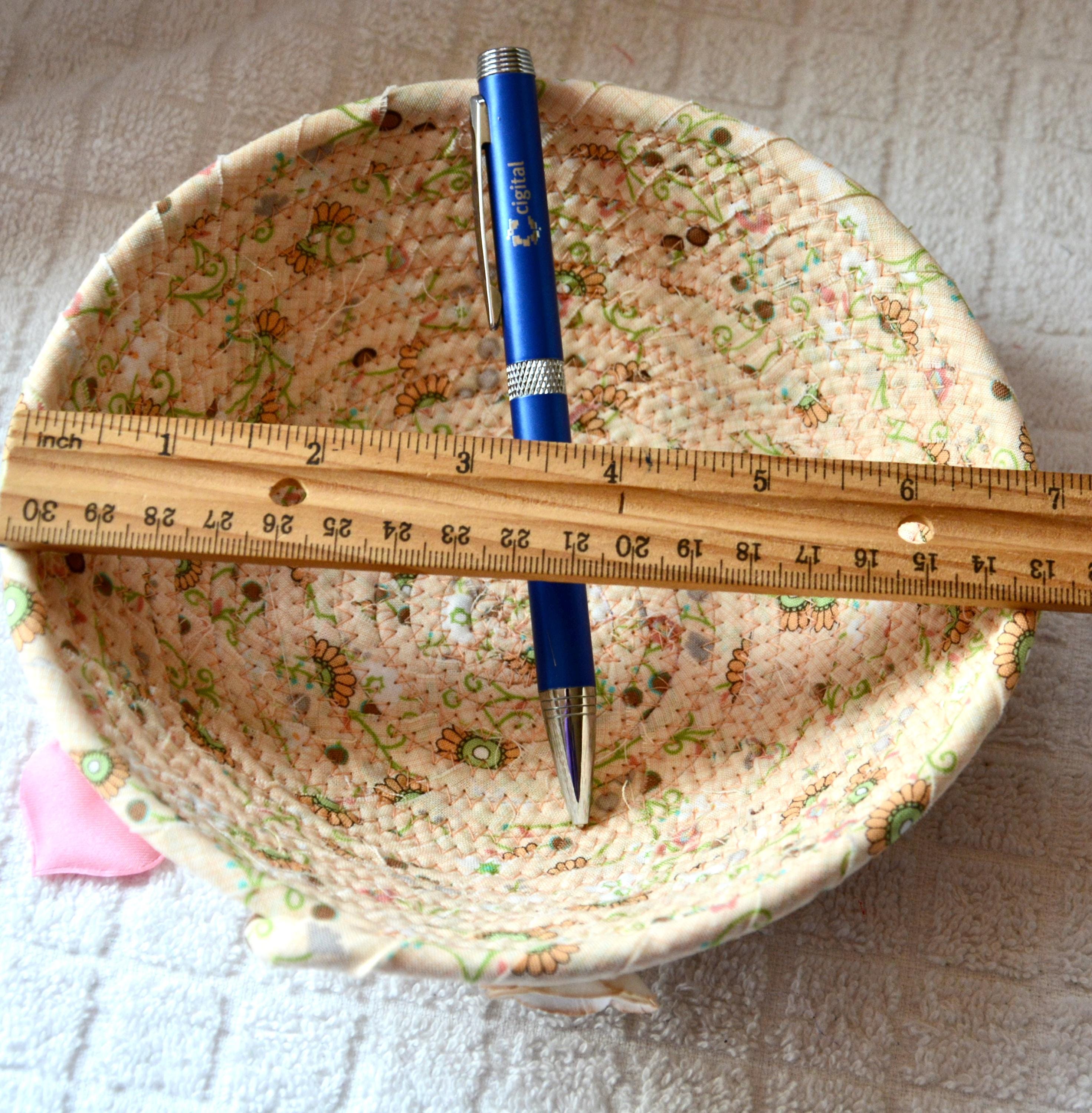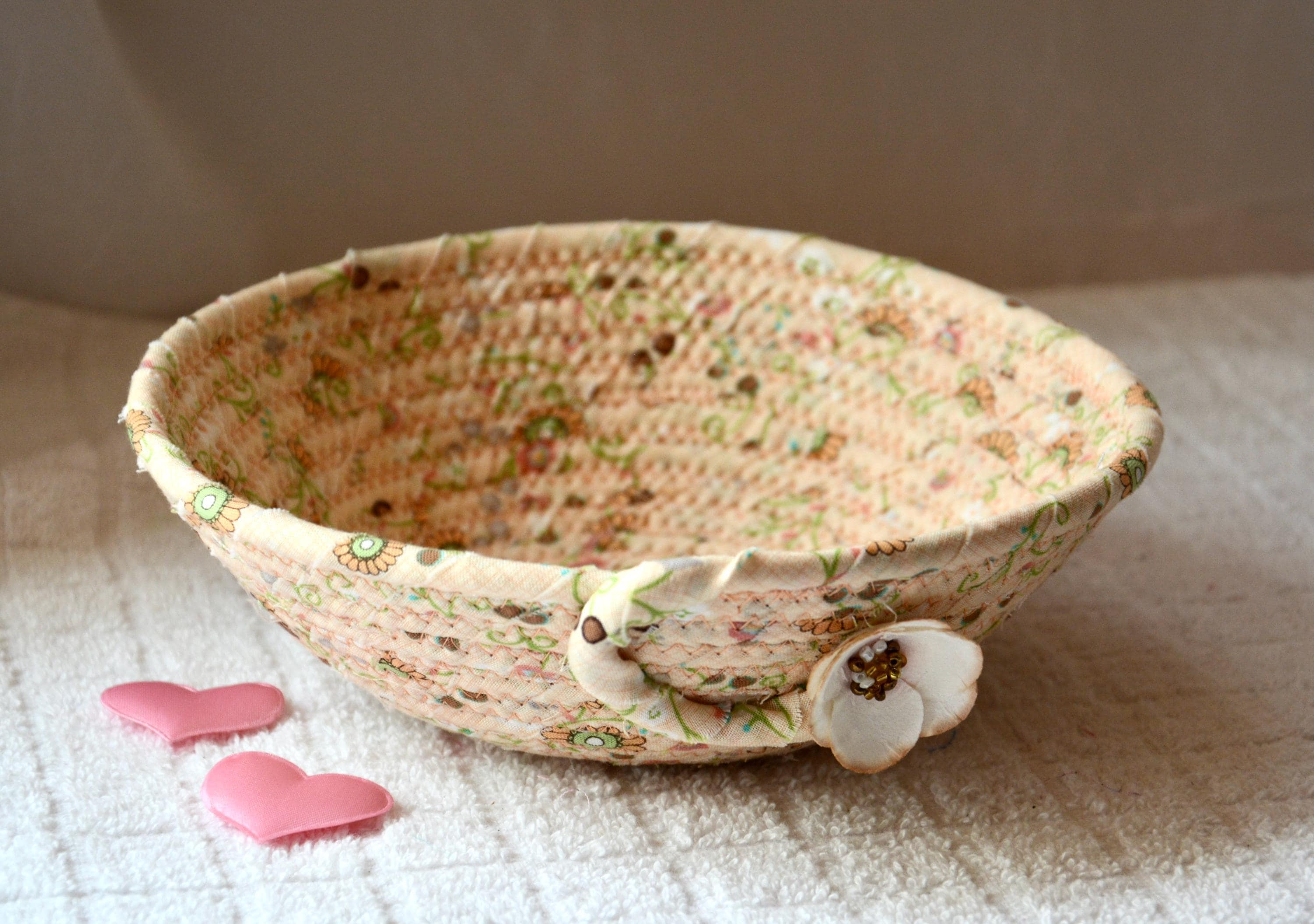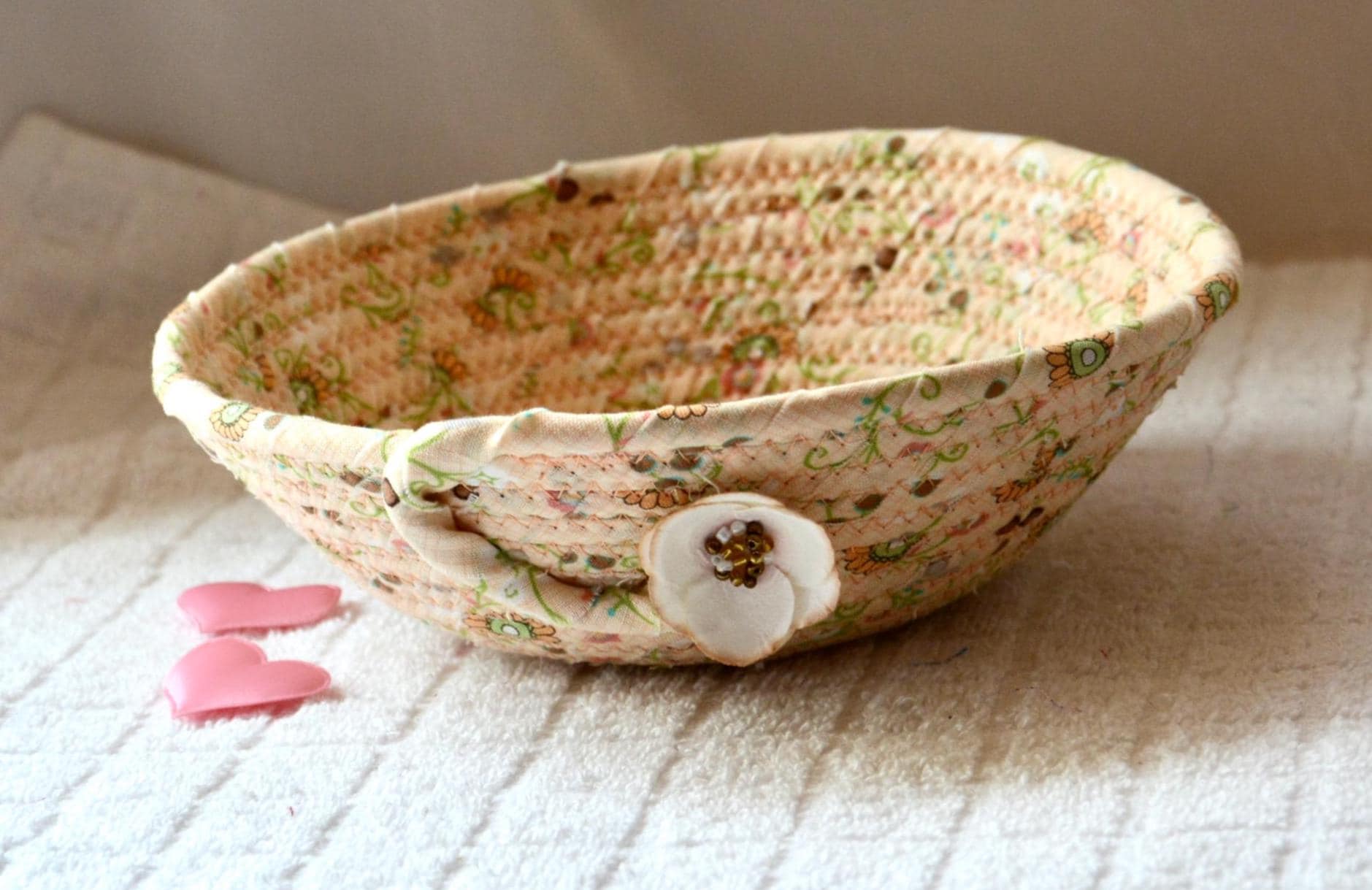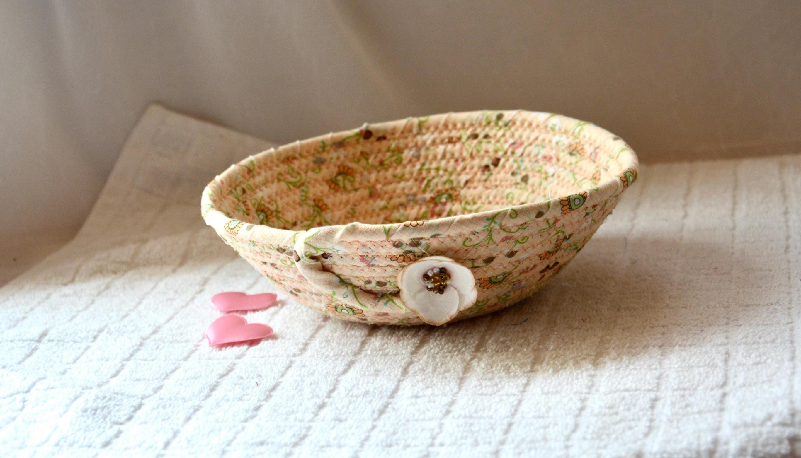 I hand wrapped this lovely cotton fabric around cotton line, which I then hand coiled and machine quilted to make it sturdy. I used the raw edge technique with a little fray for a great shabby chic texture. The pretty flower on the basket is included for a nice accent. 100% cotton fabric and shows on the inside of the basket too! The last picture is the fabric on my cutting table.