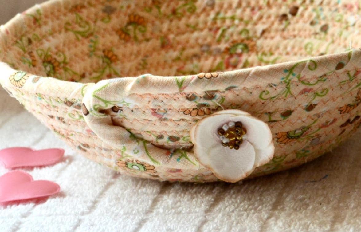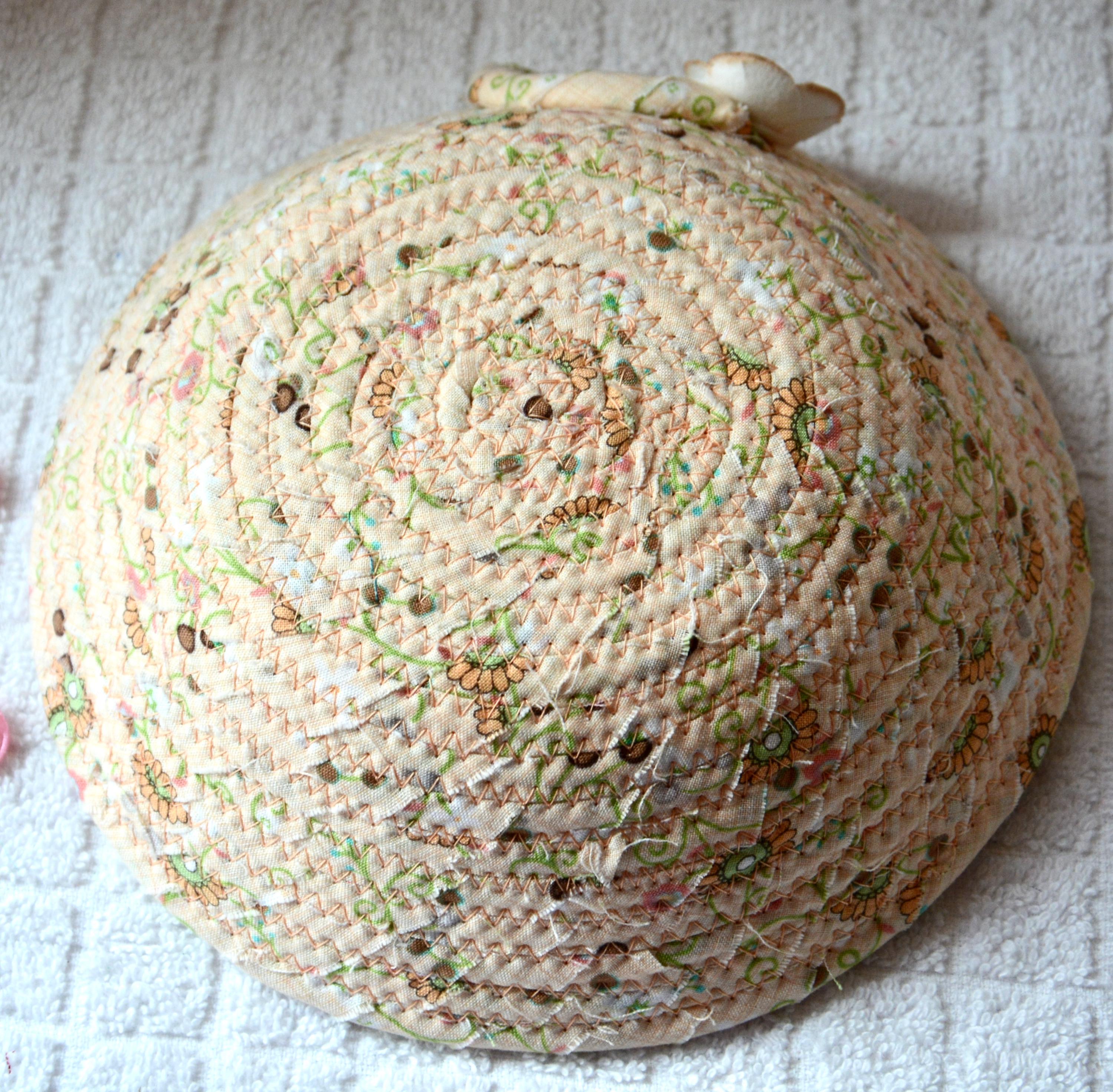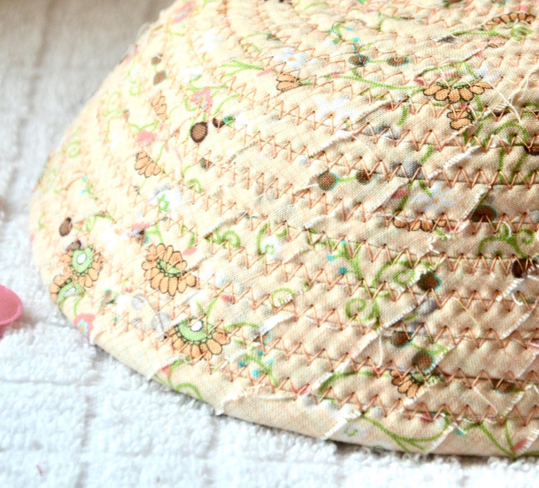 I hand wrapped this lovely cotton fabric around cotton line, which I then hand coiled and machine quilted to make it sturdy. I used the raw edge technique with a little fray for a great shabby chic texture. The pretty flower on the basket is included for a nice accent. 100% cotton fabric and shows on the inside of the basket too! The last picture is the fabric on my cutting table.