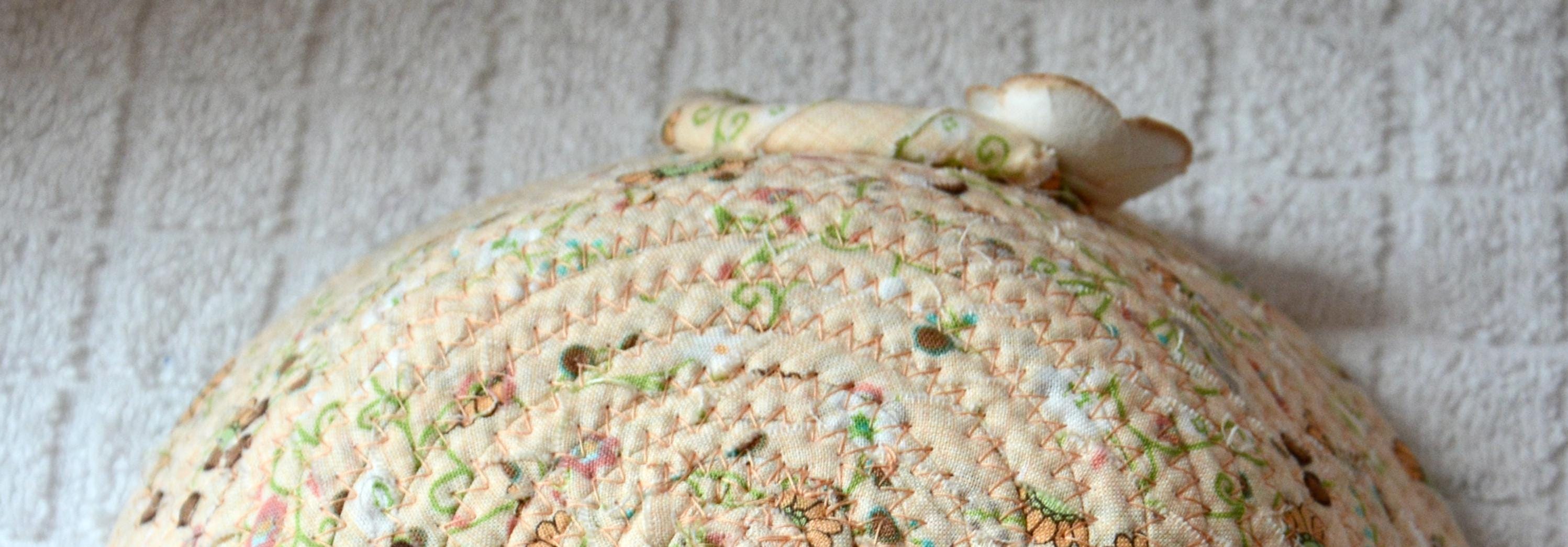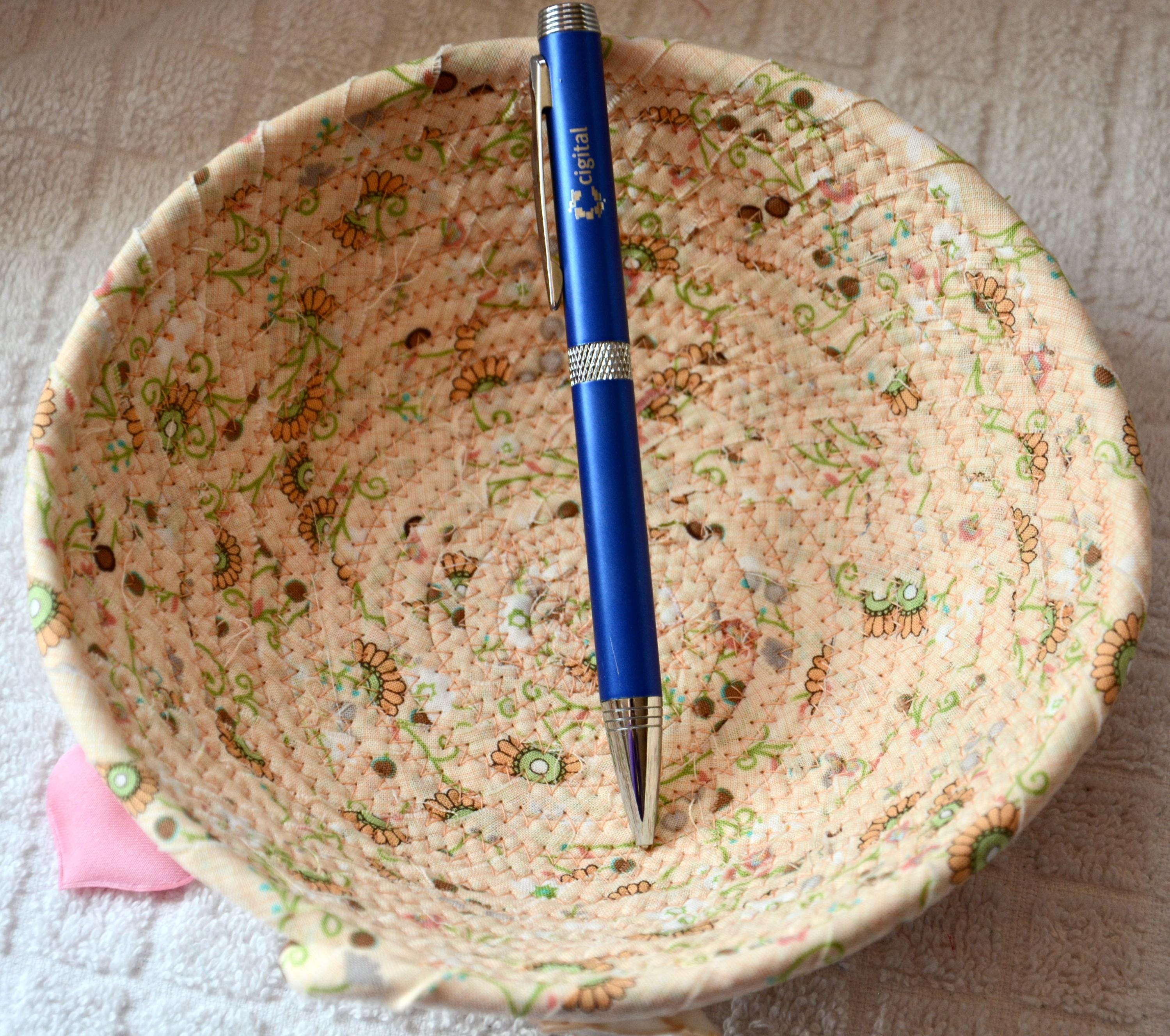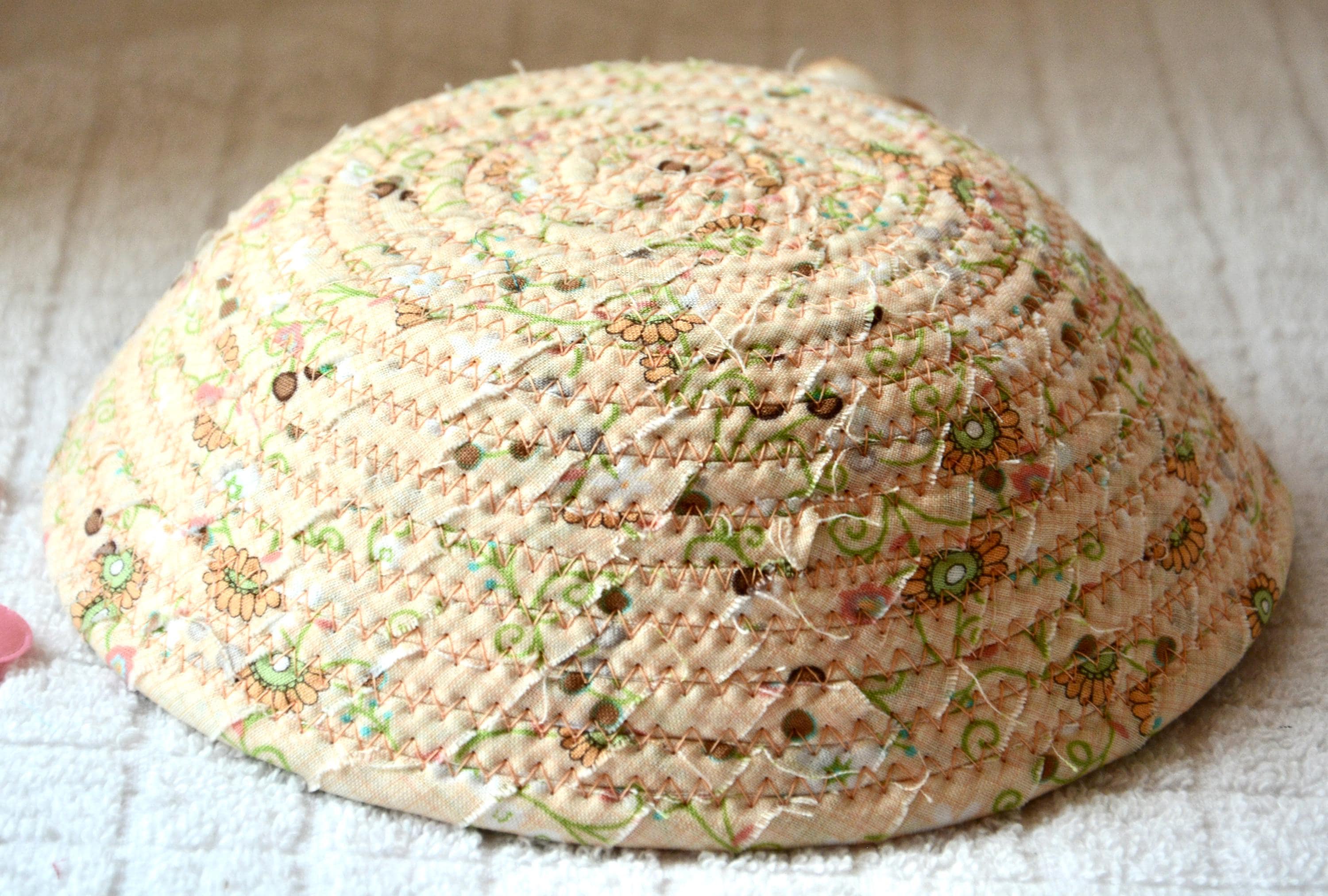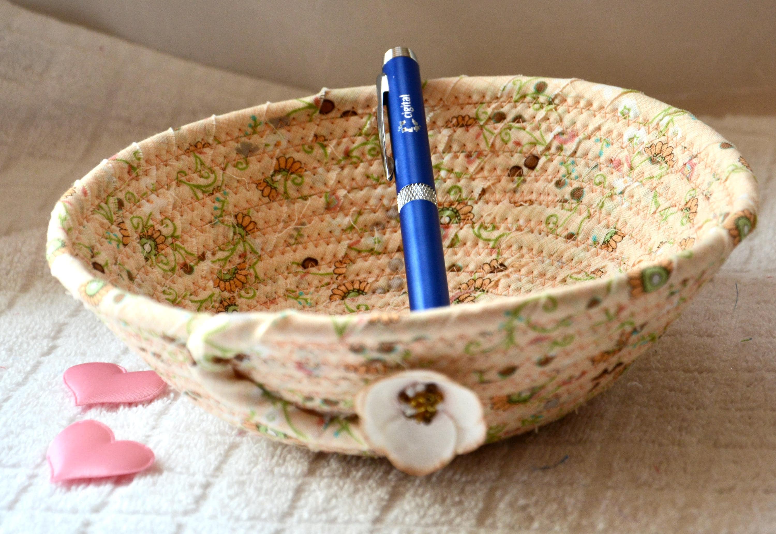 I hand wrapped this lovely cotton fabric around cotton line, which I then hand coiled and machine quilted to make it sturdy. I used the raw edge technique with a little fray for a great shabby chic texture. The pretty flower on the basket is included for a nice accent. 100% cotton fabric and shows on the inside of the basket too! The last picture is the fabric on my cutting table.