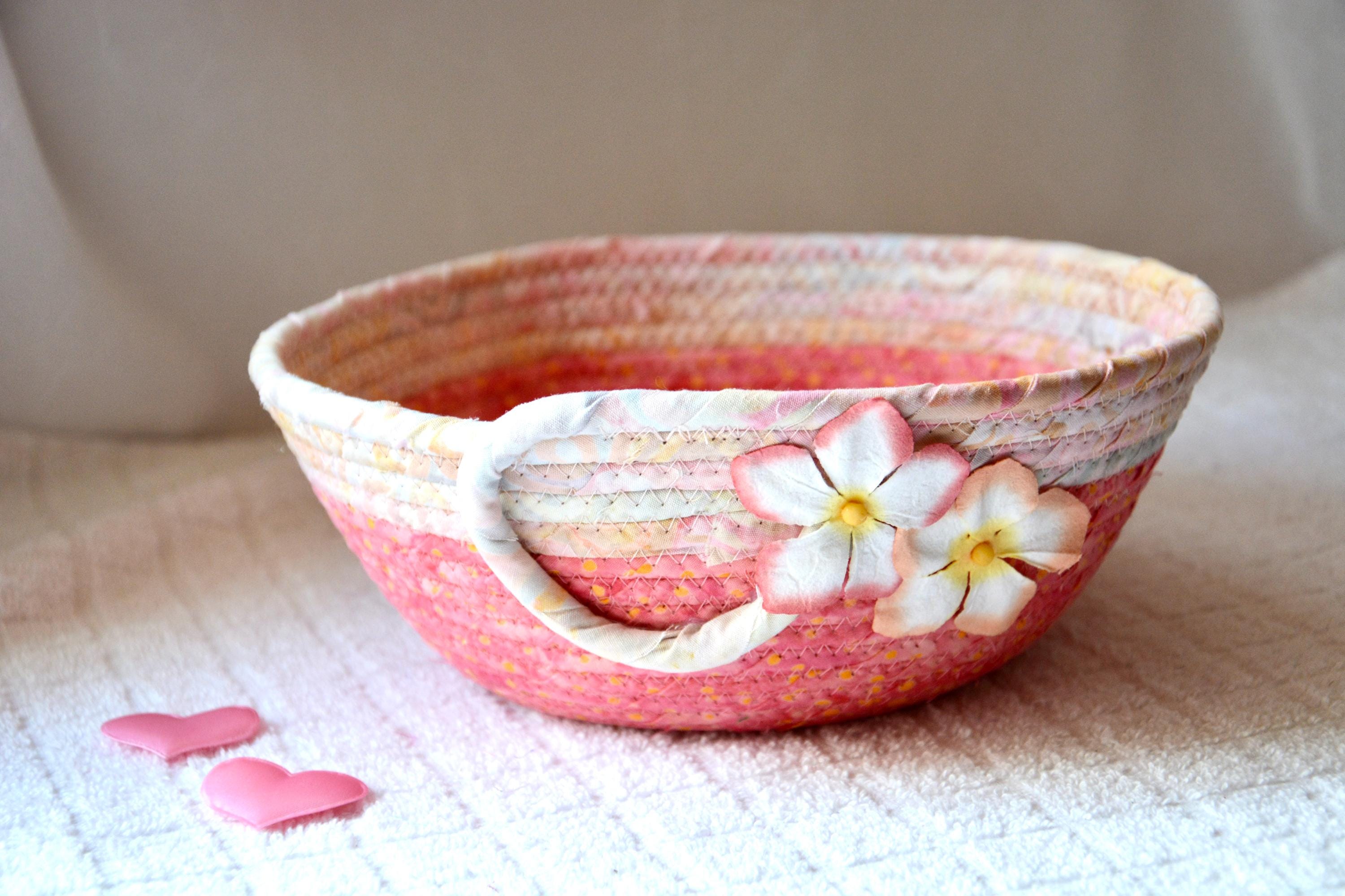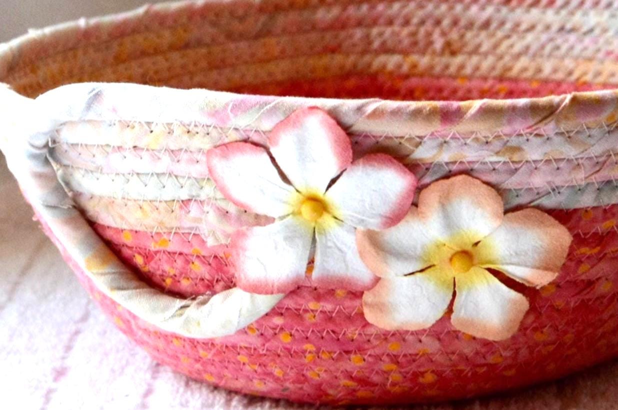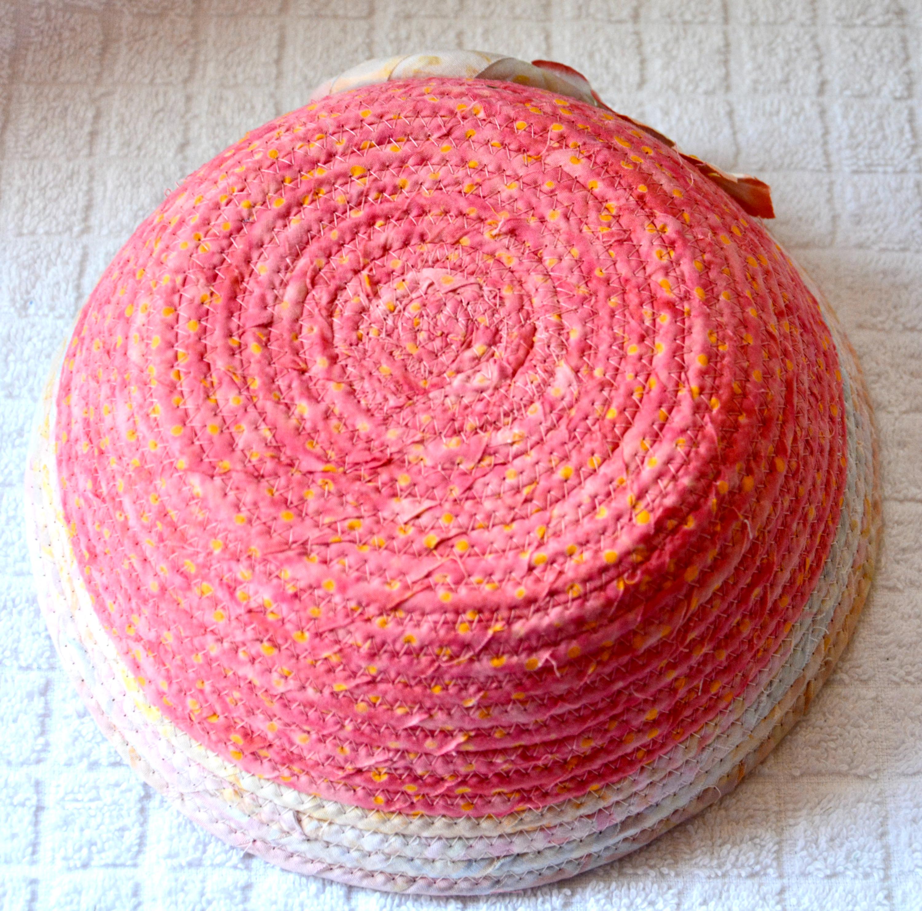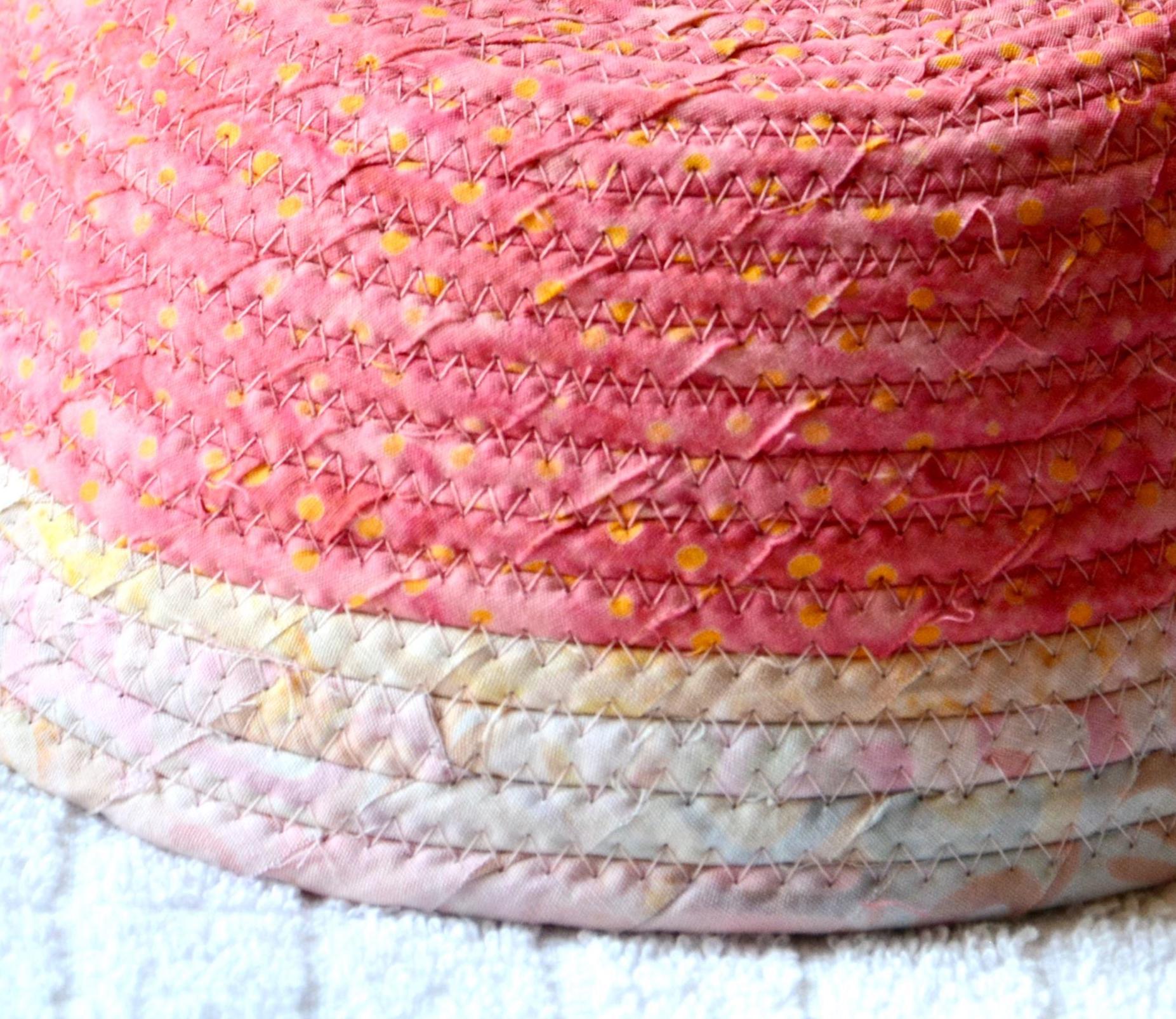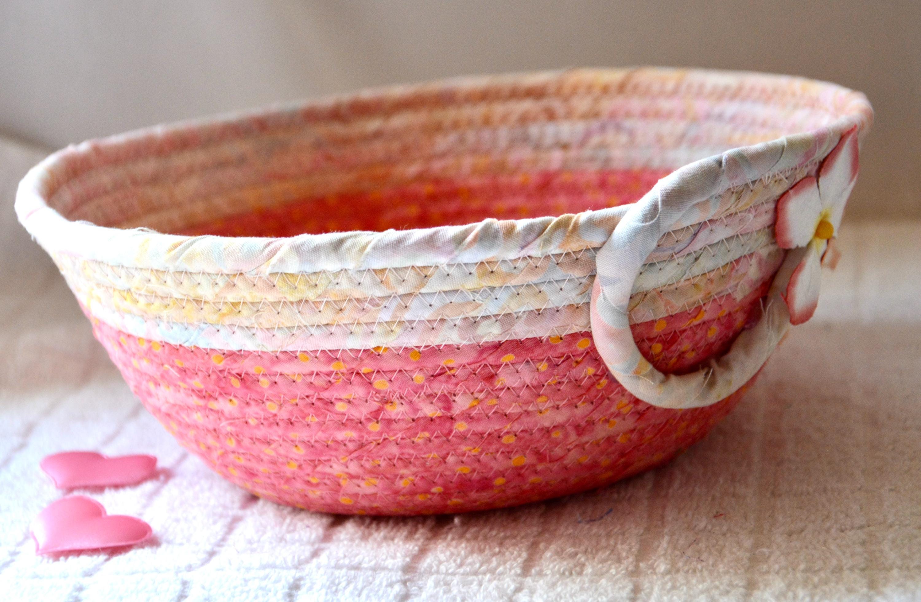 I hand wrapped this wonderful pink batik fabric around cotton line, which I then hand coiled and machine quilted to make it sturdy. I used the raw edge technique with some fray to add a great shabby chic texture. This is a high quality 100% cotton fabric and it shows on the inside too! I added a pretty pink batik to the base for a nice contrast. Color placement will vary. Spot clean.