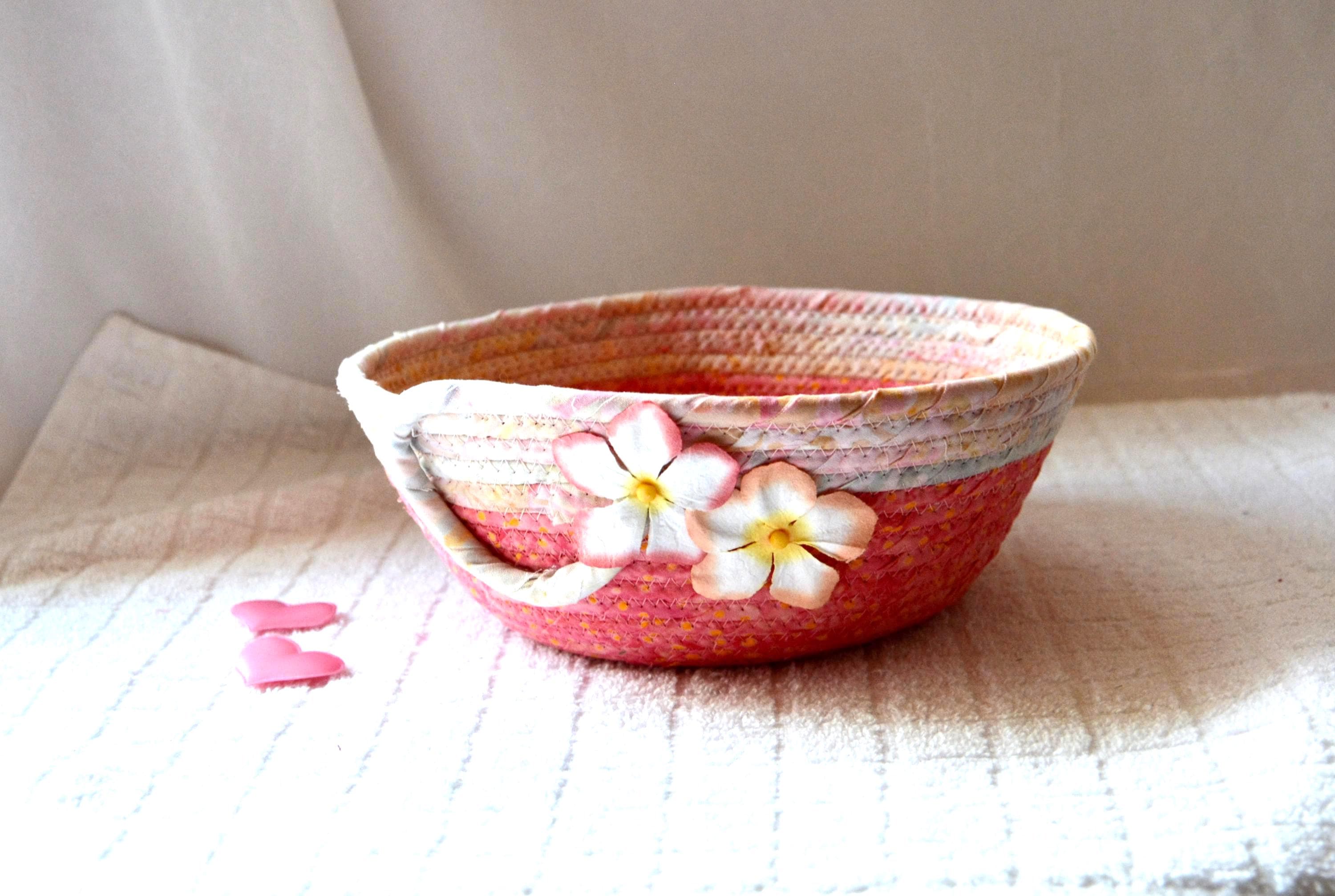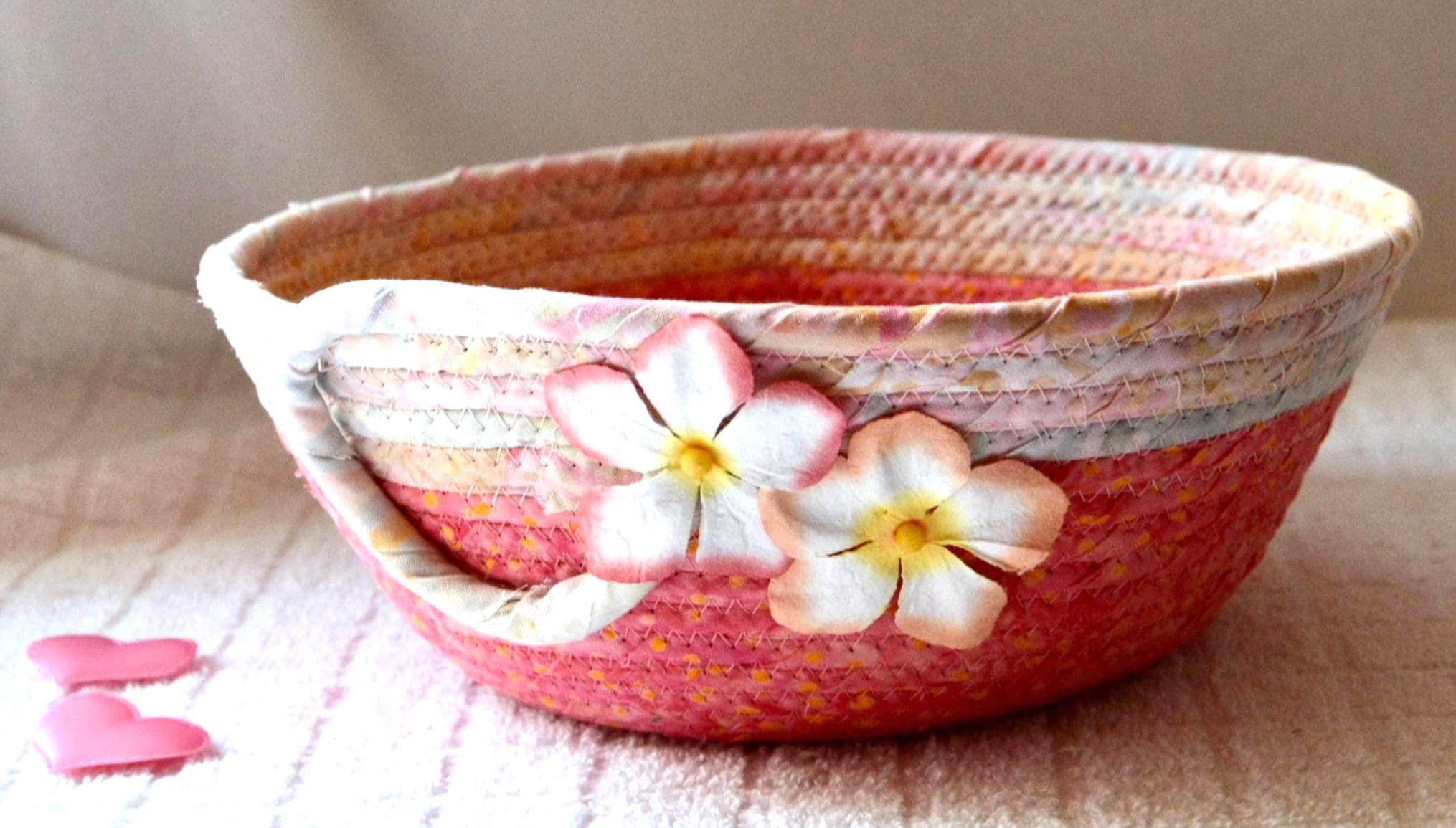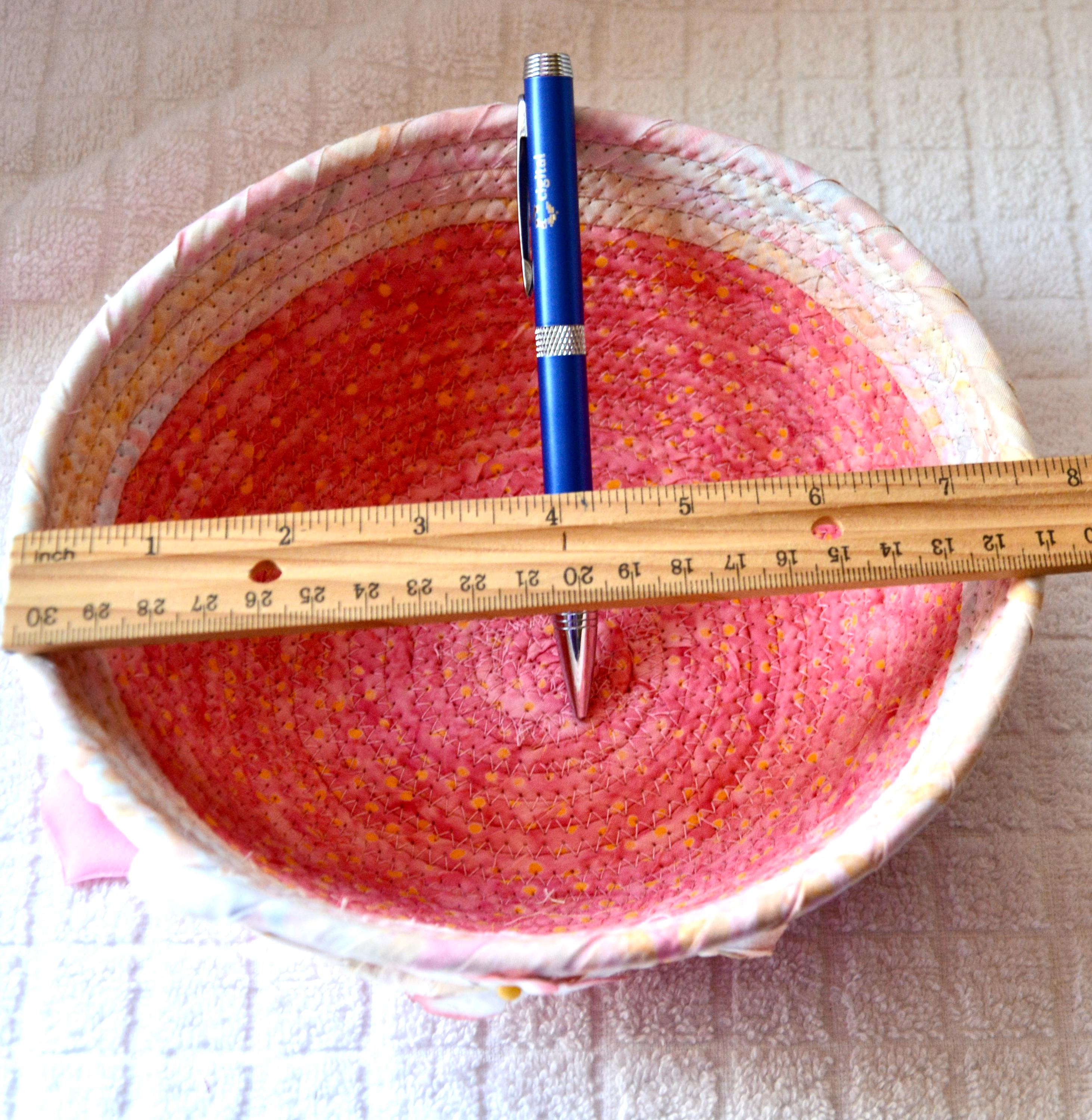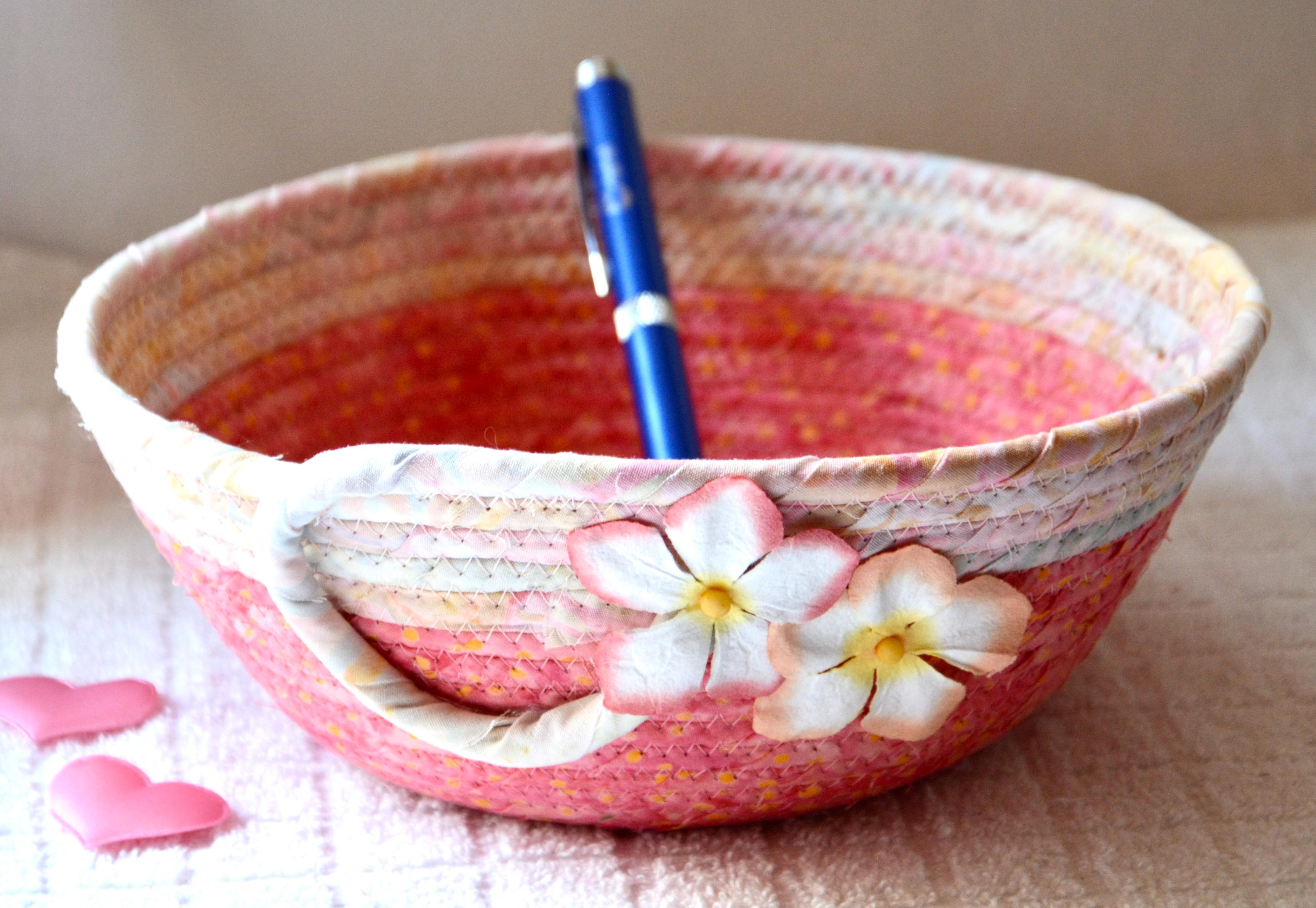 I hand wrapped this wonderful pink batik fabric around cotton line, which I then hand coiled and machine quilted to make it sturdy. I used the raw edge technique with some fray to add a great shabby chic texture. This is a high quality 100% cotton fabric and it shows on the inside too! I added a pretty pink batik to the base for a nice contrast. Color placement will vary. Spot clean.