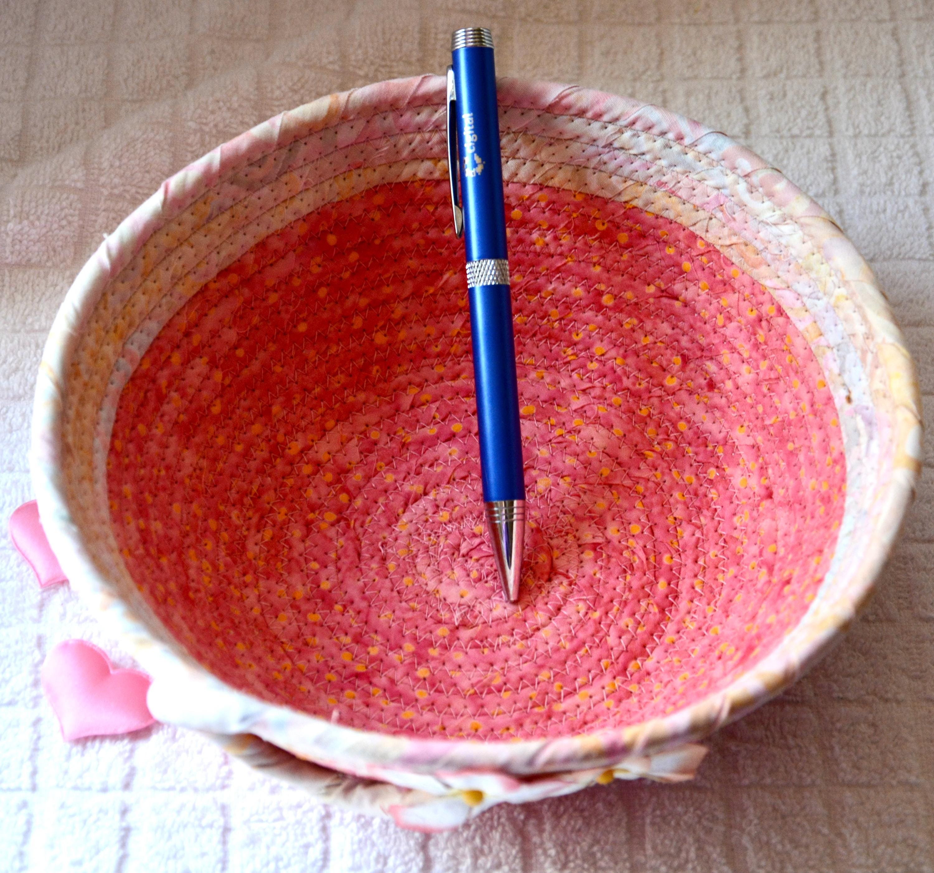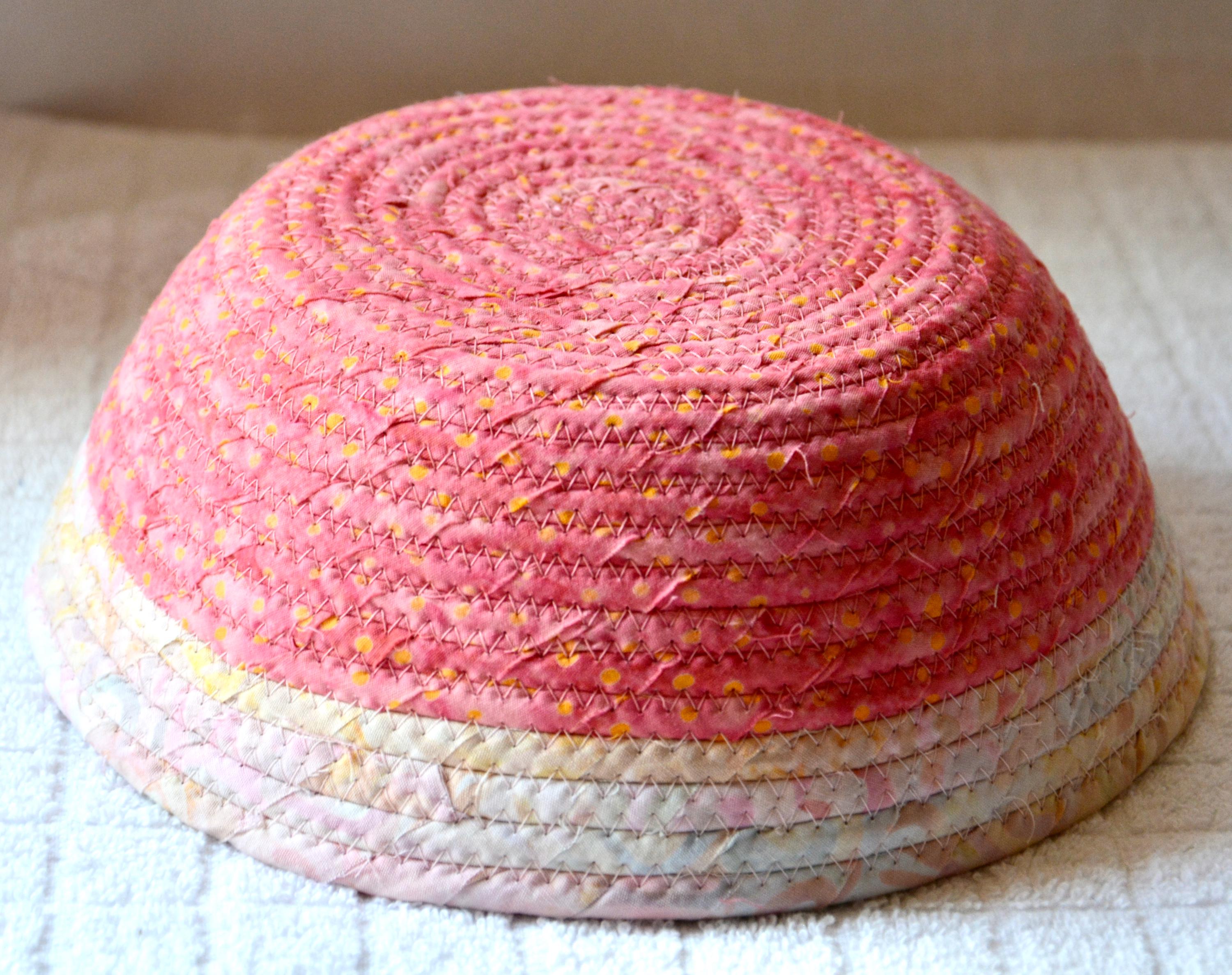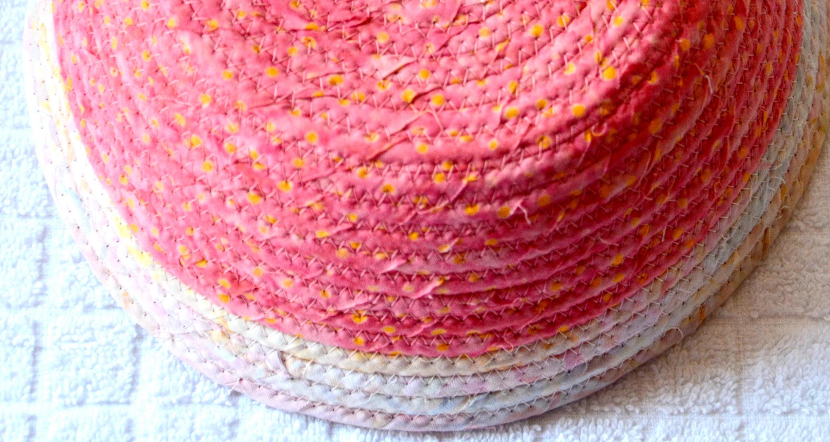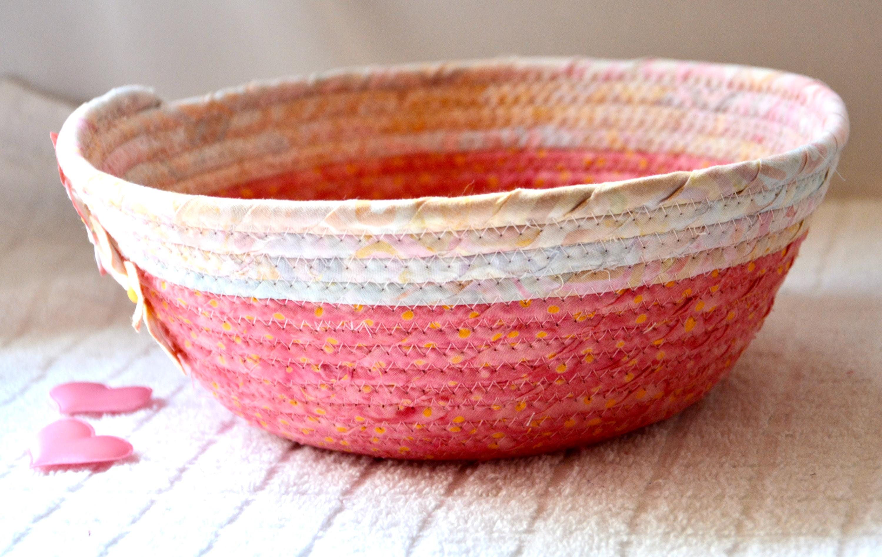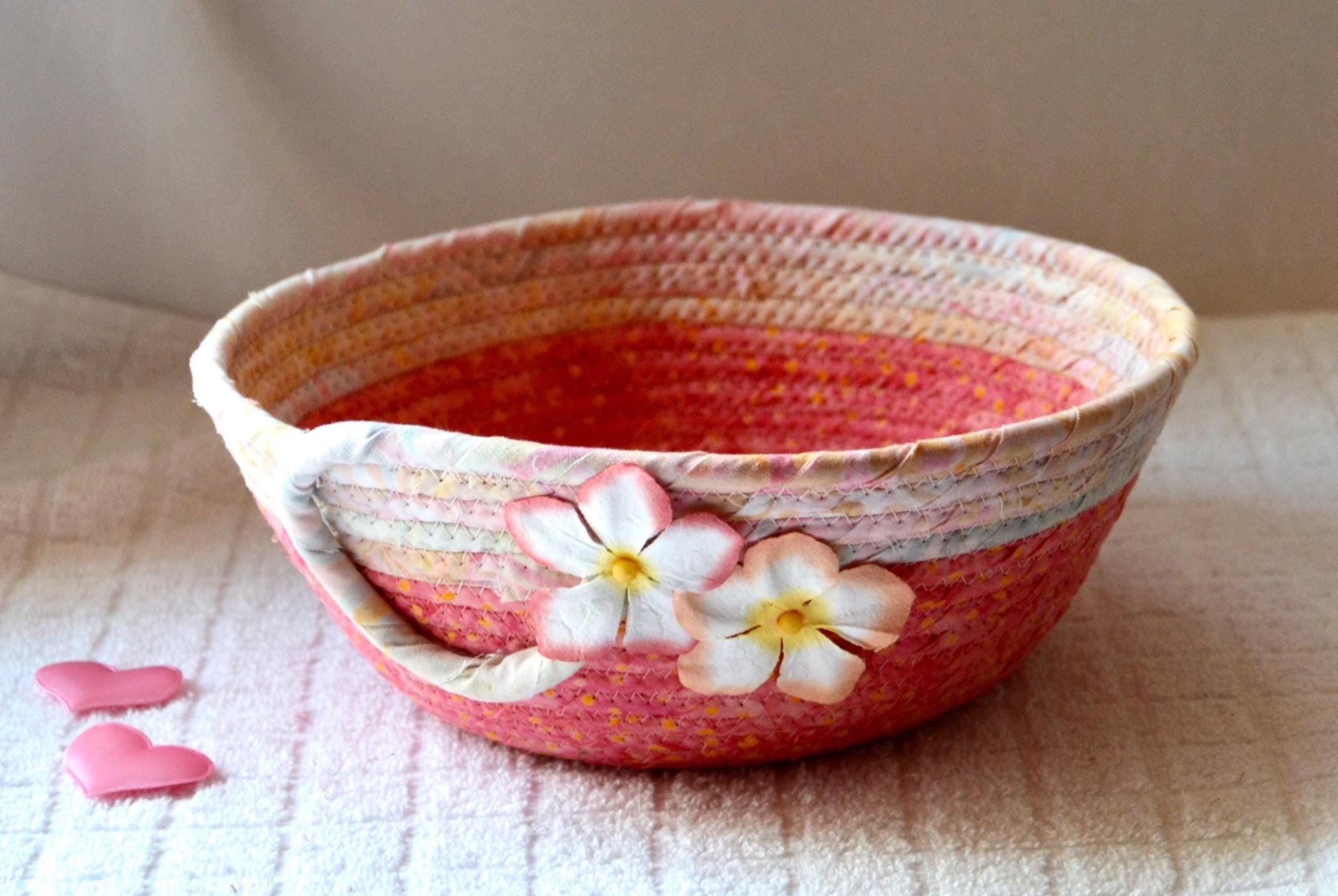I hand wrapped this wonderful pink batik fabric around cotton line, which I then hand coiled and machine quilted to make it sturdy. I used the raw edge technique with some fray to add a great shabby chic texture. This is a high quality 100% cotton fabric and it shows on the inside too! I added a pretty pink batik to the base for a nice contrast. Color placement will vary. Spot clean.