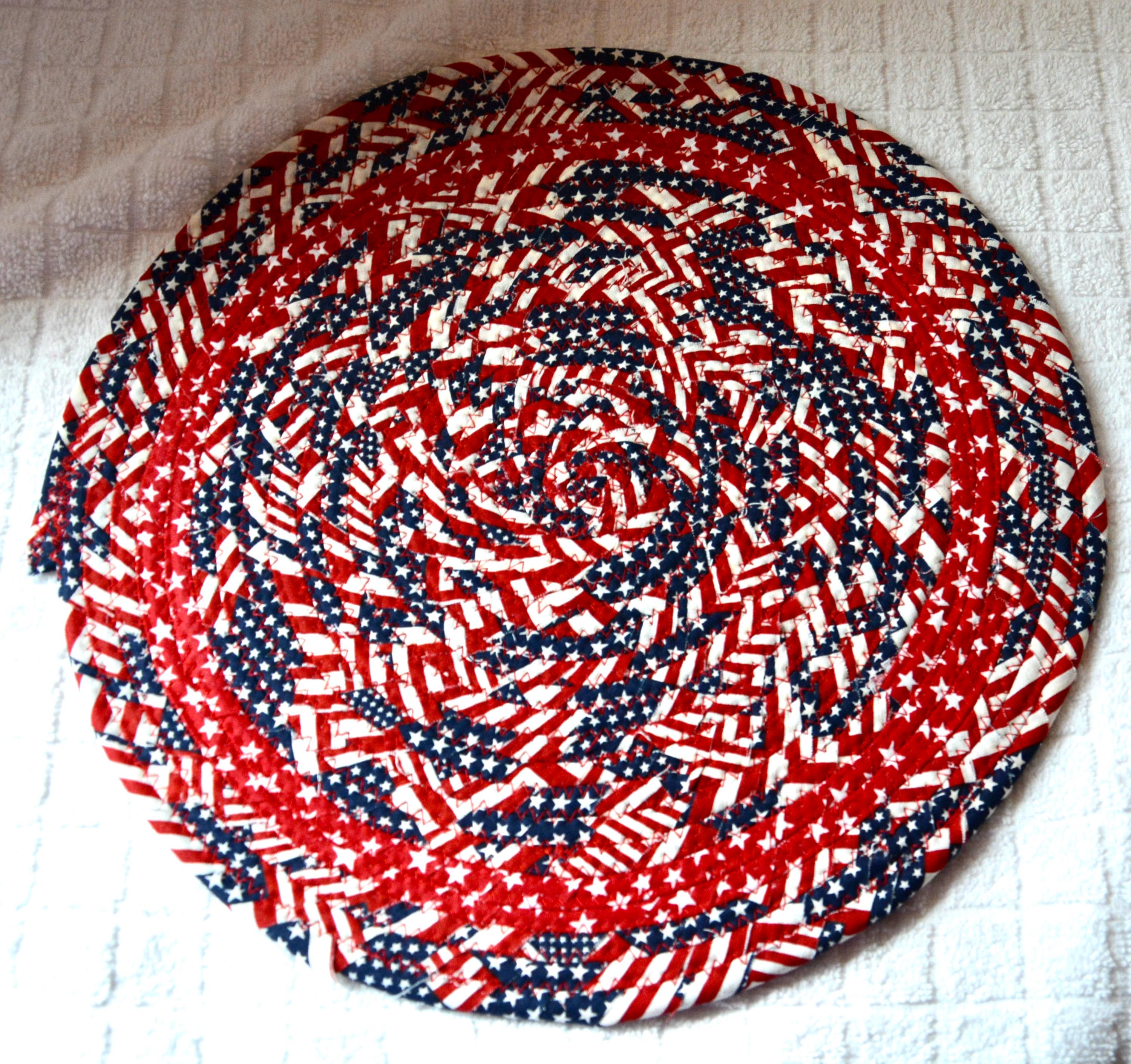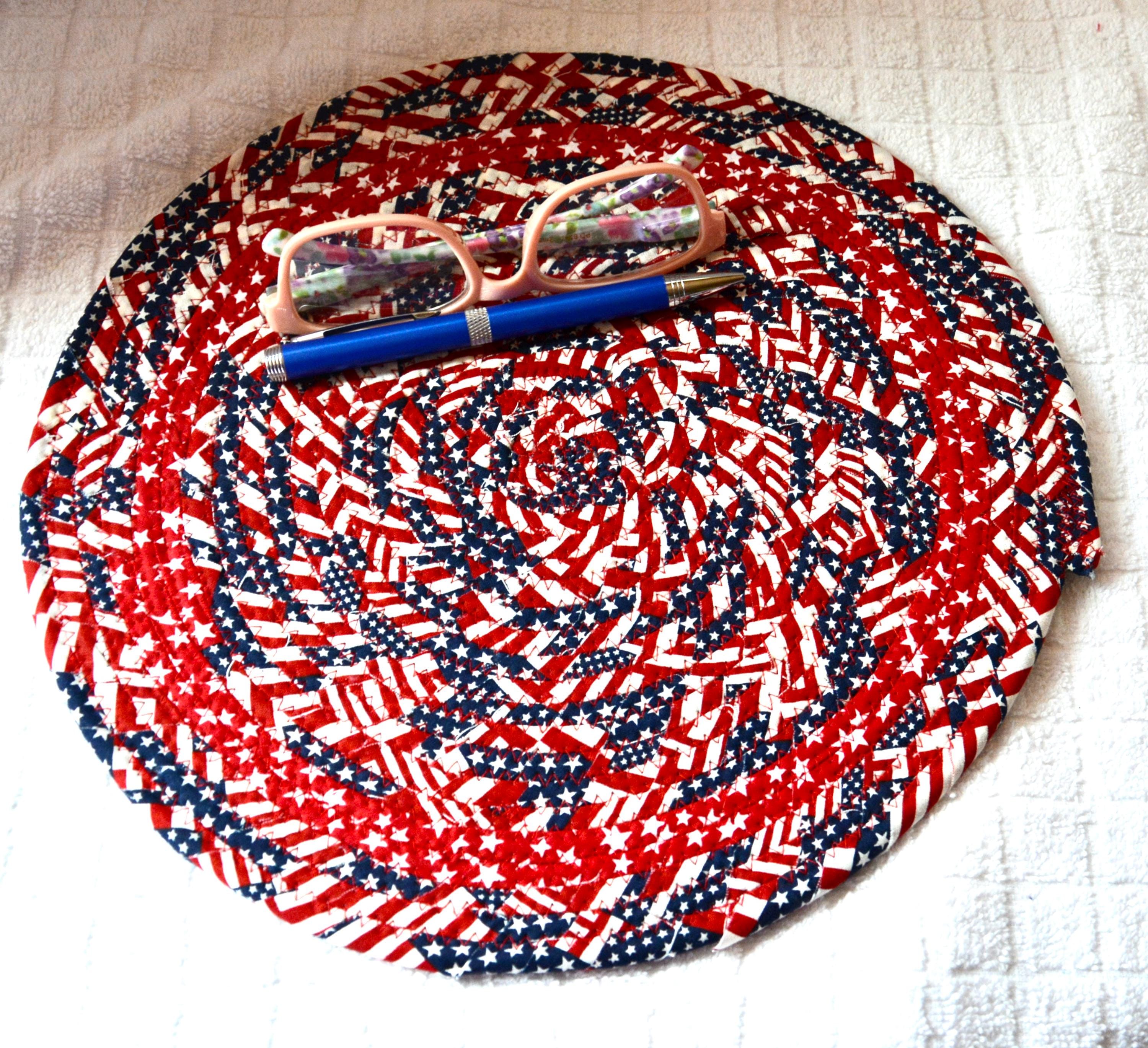I hand wrapped these wonderful red white and blue fabrics around cotton line, which I then hand coiled and machine quilted to make it sturdy. I used the raw edge technique with some fray to add a lovely shabby chic texture. These are high quality 100% cotton fabrics which show on both sides too! So Cheery!