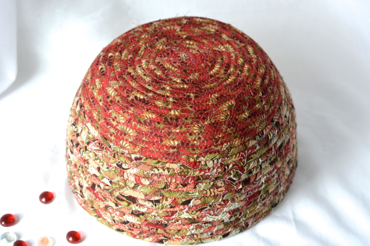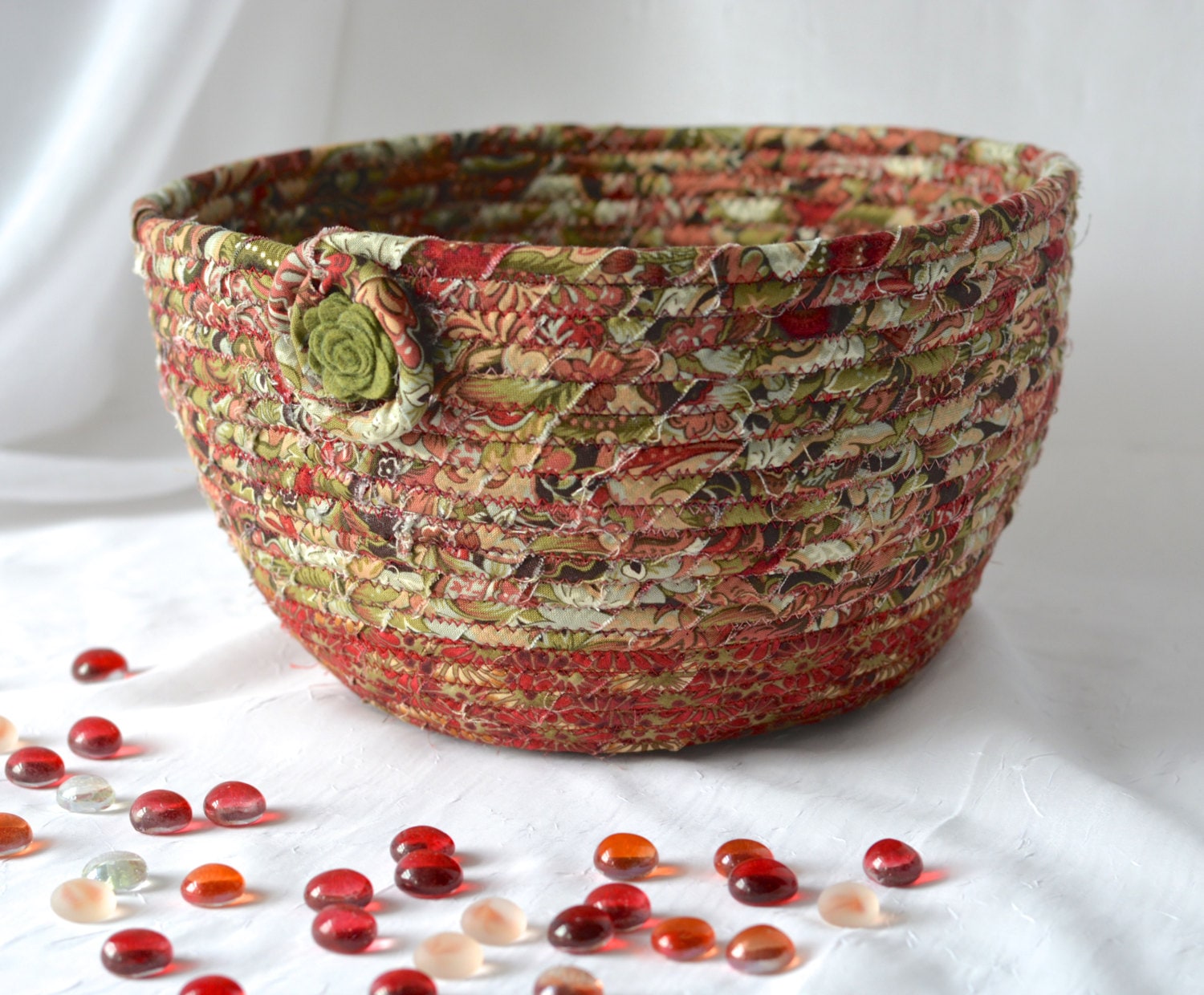 I hand wrapped this lovely floral fabric around cotton line, which I then hand coiled and machine quilted to make it sturdy. I used the raw edge technique with a little fray to give it a lovely shabby chic texture. I added a pretty red maroon fabric to the base for a wonderful accent. The cute green flower on the basket is included.