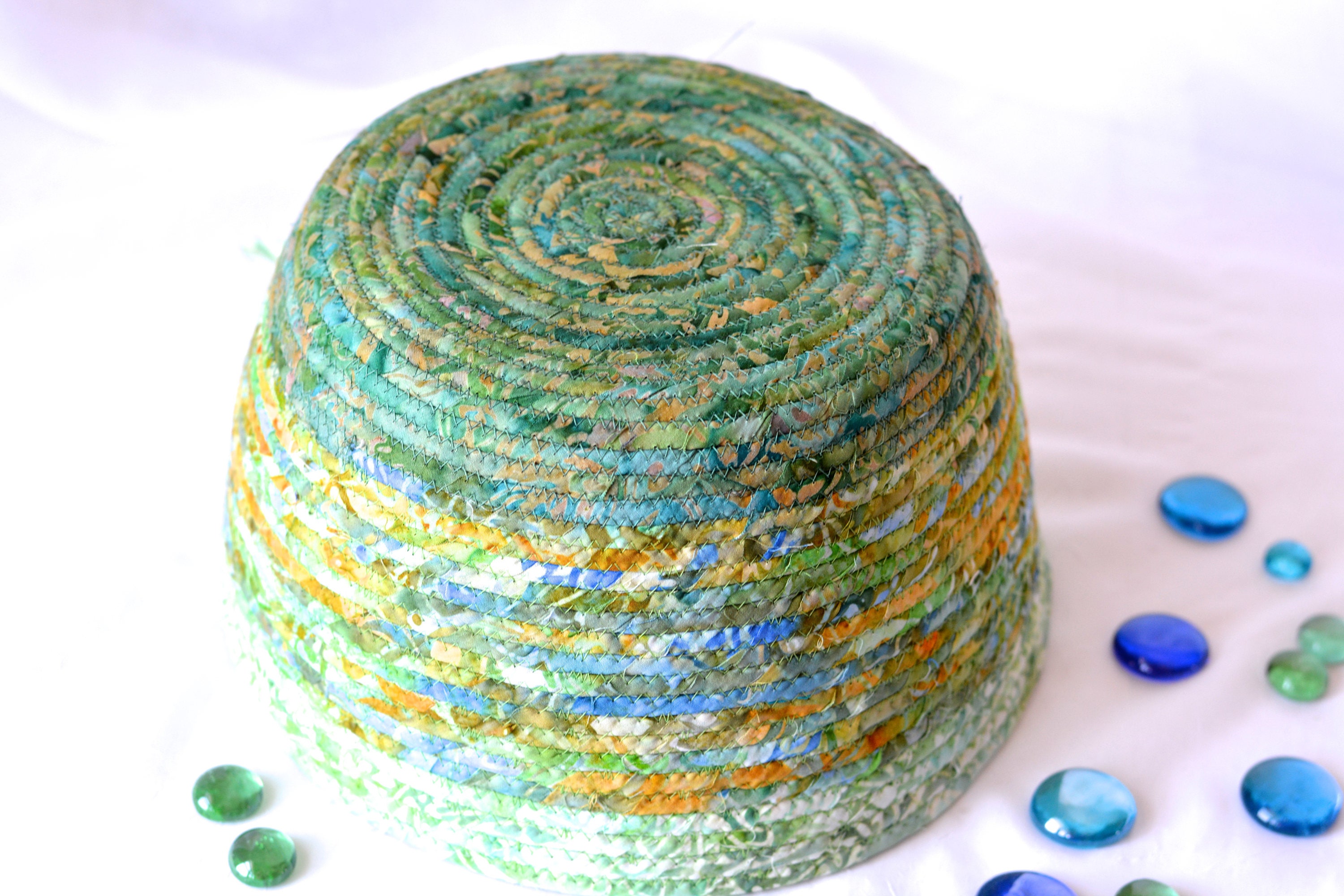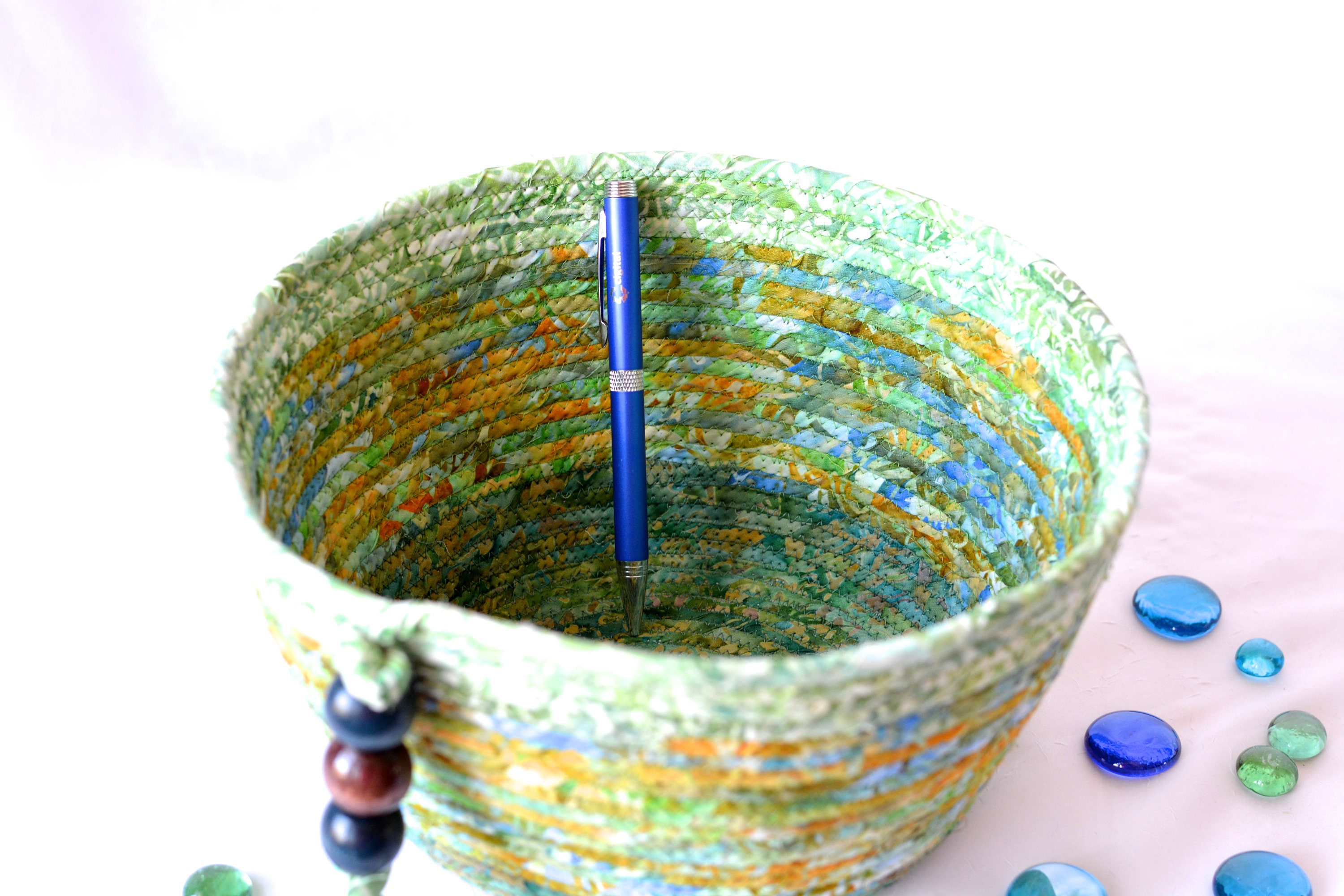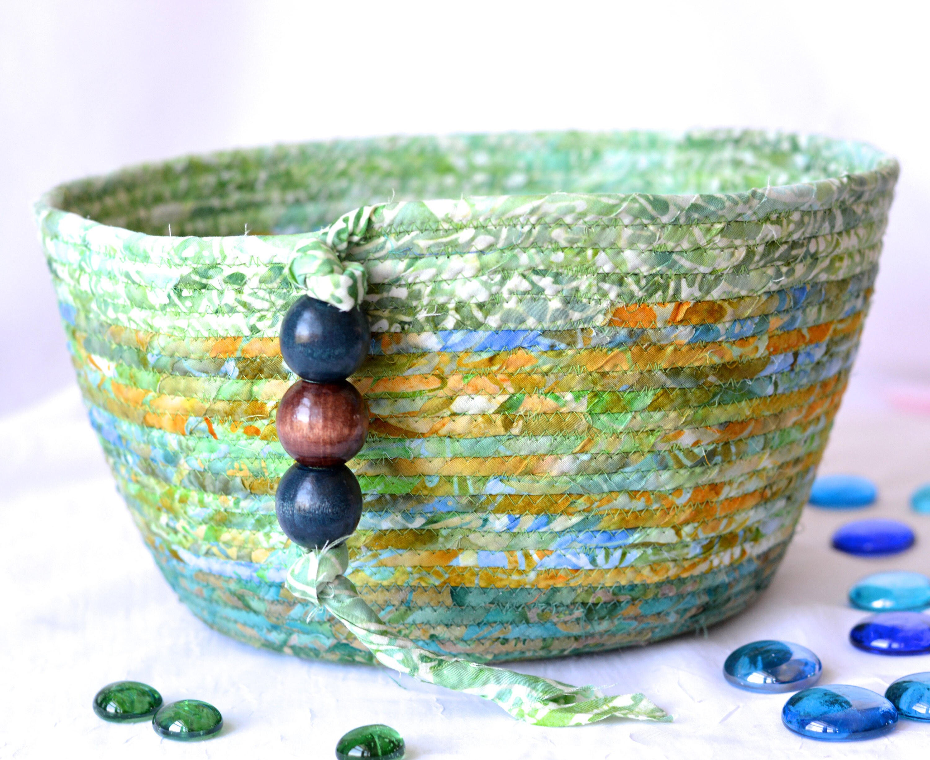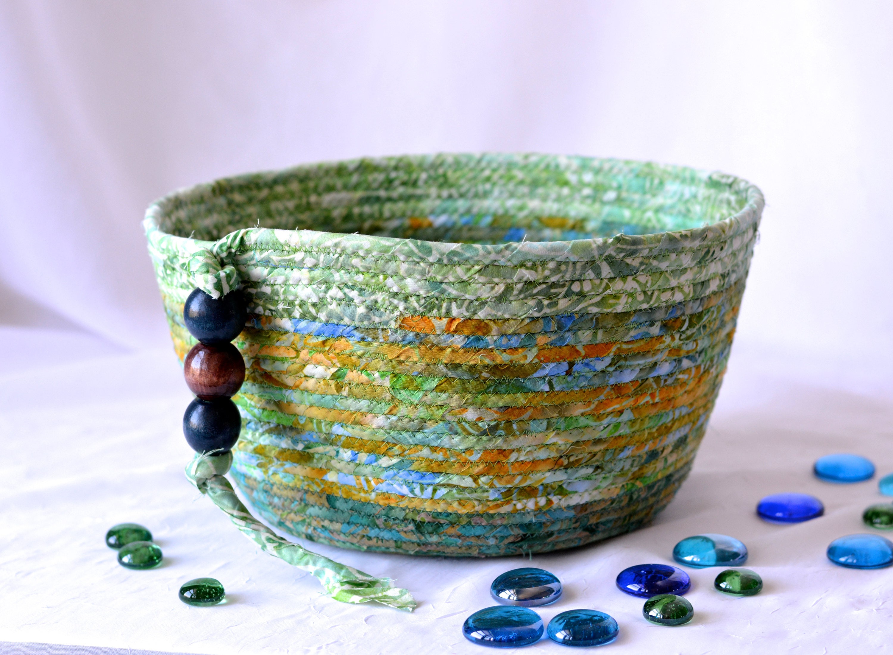 I hand wrapped these lovely green batik fabrics around cotton line, which I then hand coiled and machine quilted to make it sturdy. I used the raw edge technique with a little fray. These rich green fabrics show on the inside of this lovely basket too! All 3 batik fabrics are 100% cotton! The wood beads on the basket are included for a nice accent. These lovely batik fabrics were hand made in Indonesia, using wax resist patterns, which is very labor intensive. The results are gorgeous and unique.