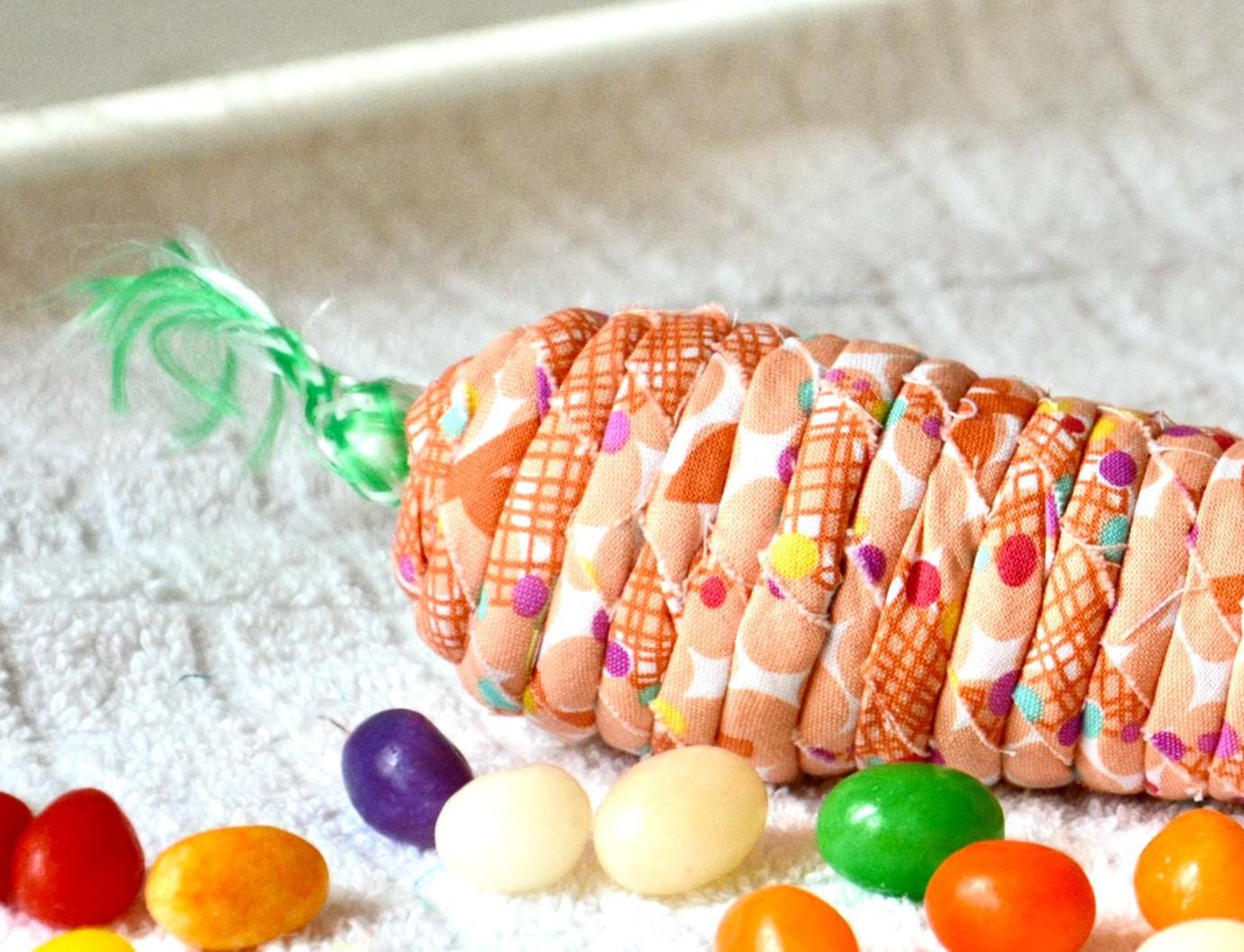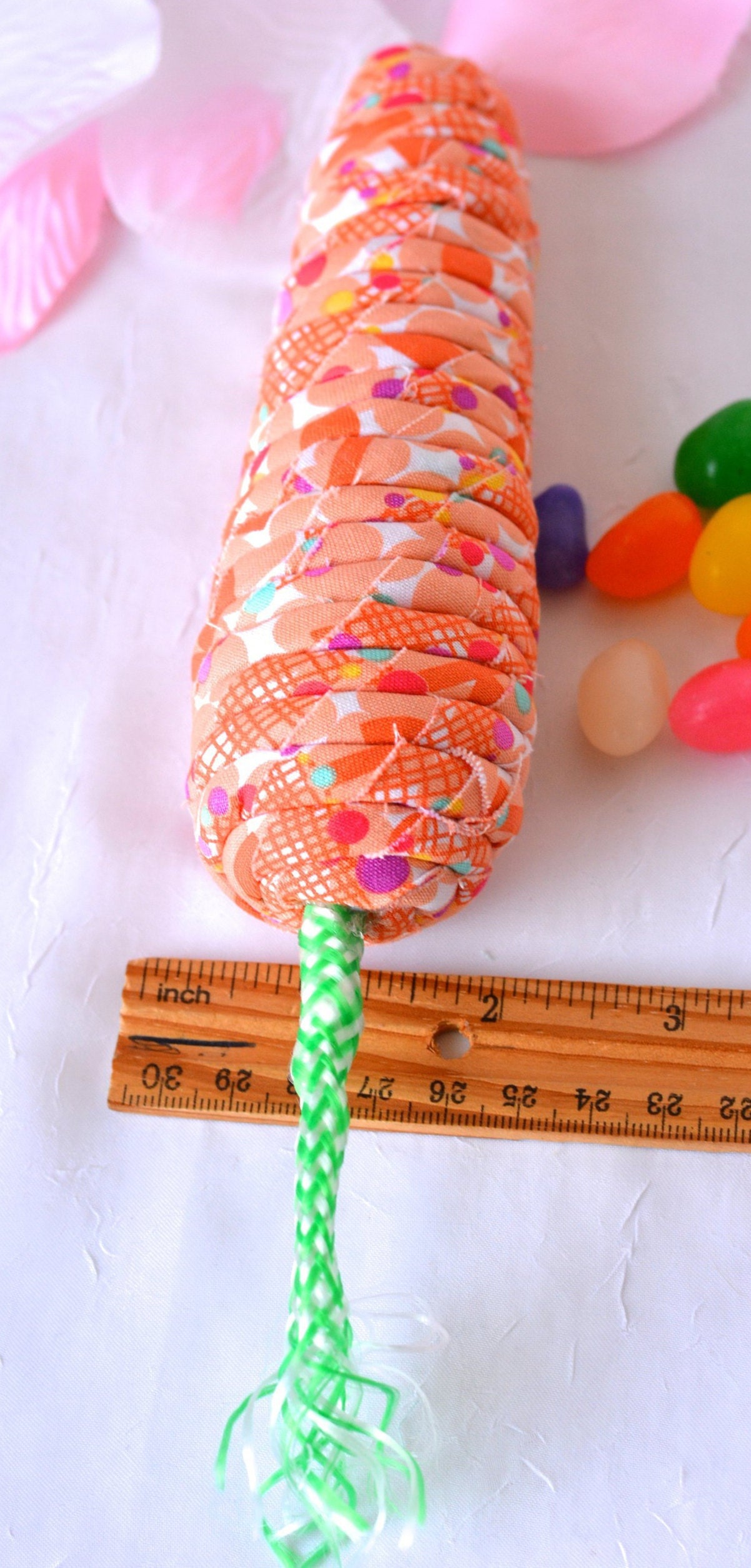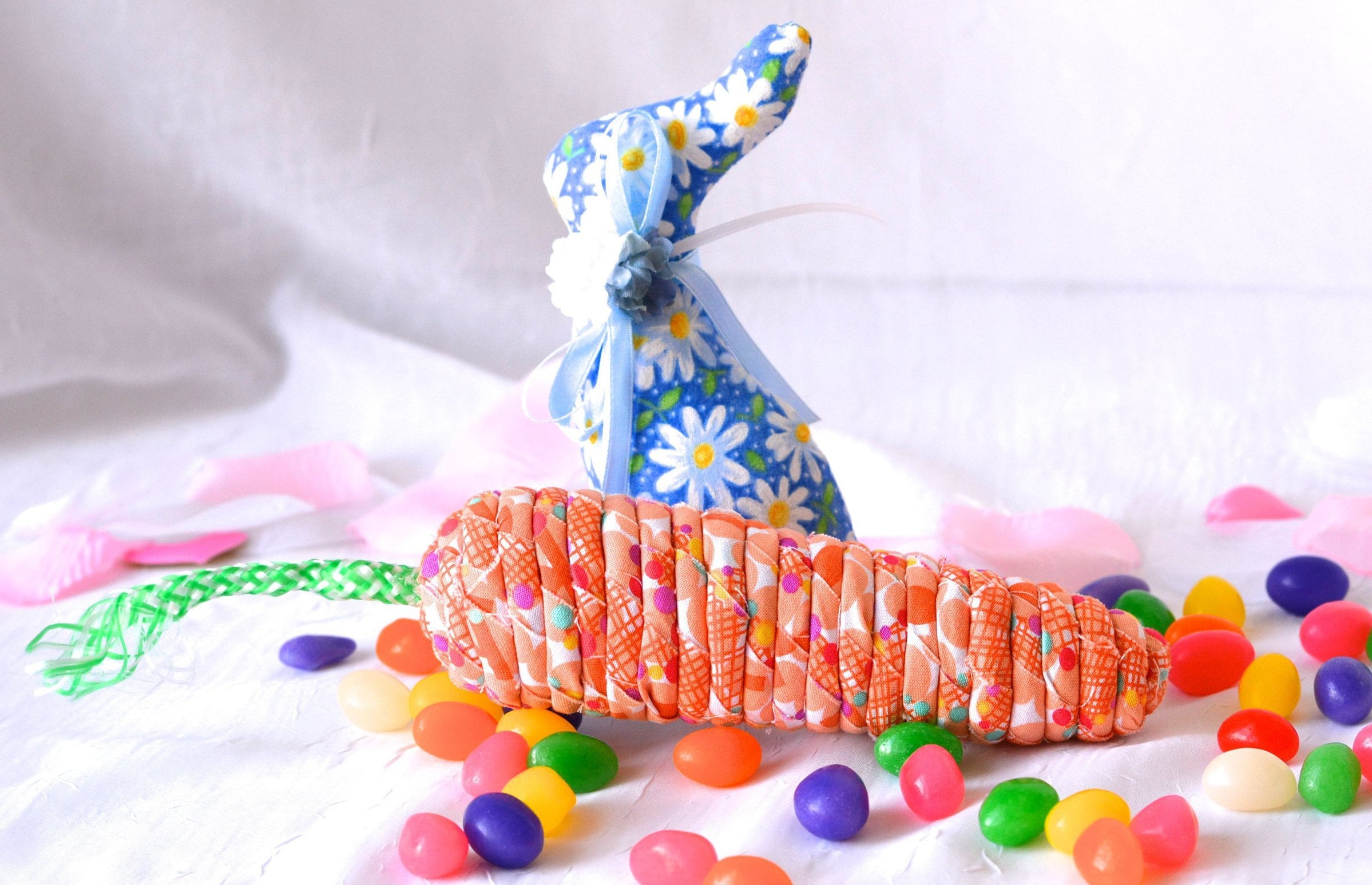 I hand wrapped this cute orange dot fabric around cotton line which I than hand coiled into a fun carrot shape. The fabric edge is unfinished for a lovely shabby chic fray texture. Color placement will vary. Carrot does not open. Great for Easter Egg Hunt Toy! Whimsical Easter decor!